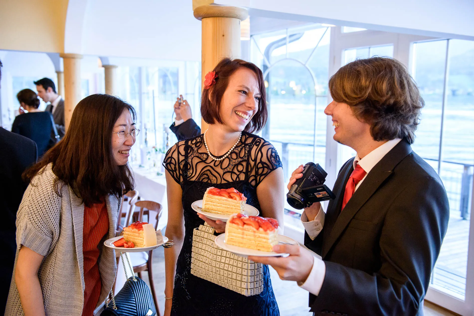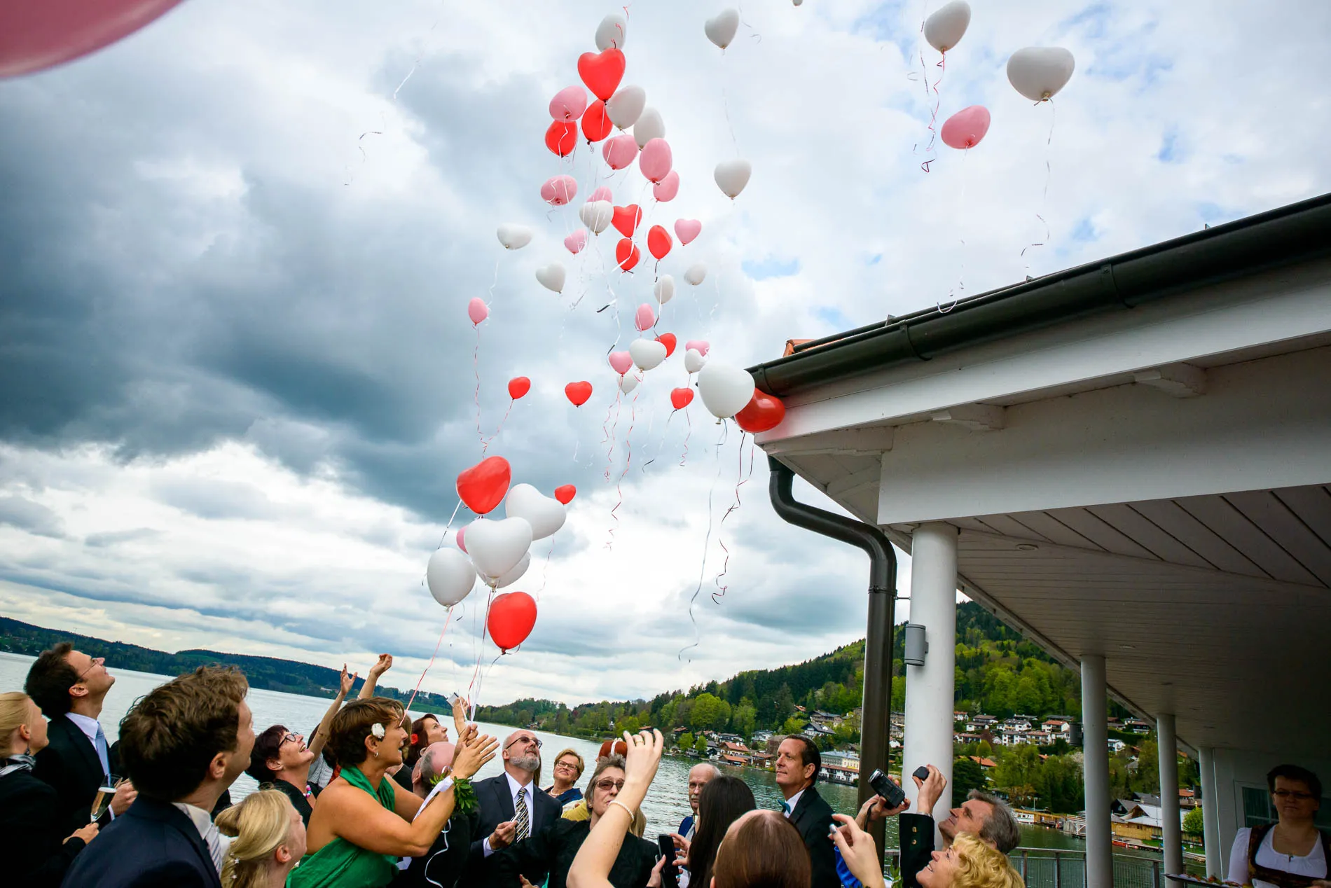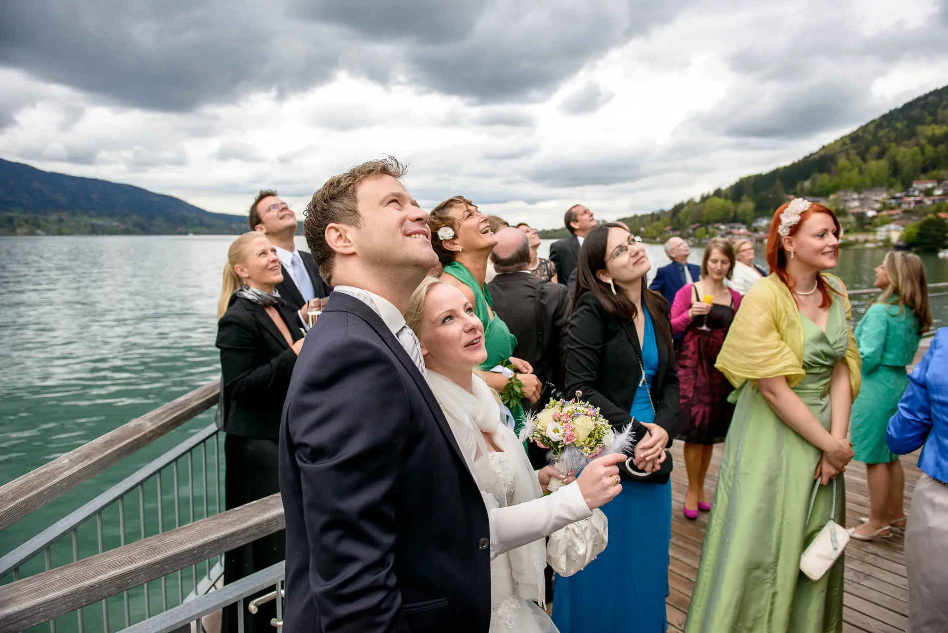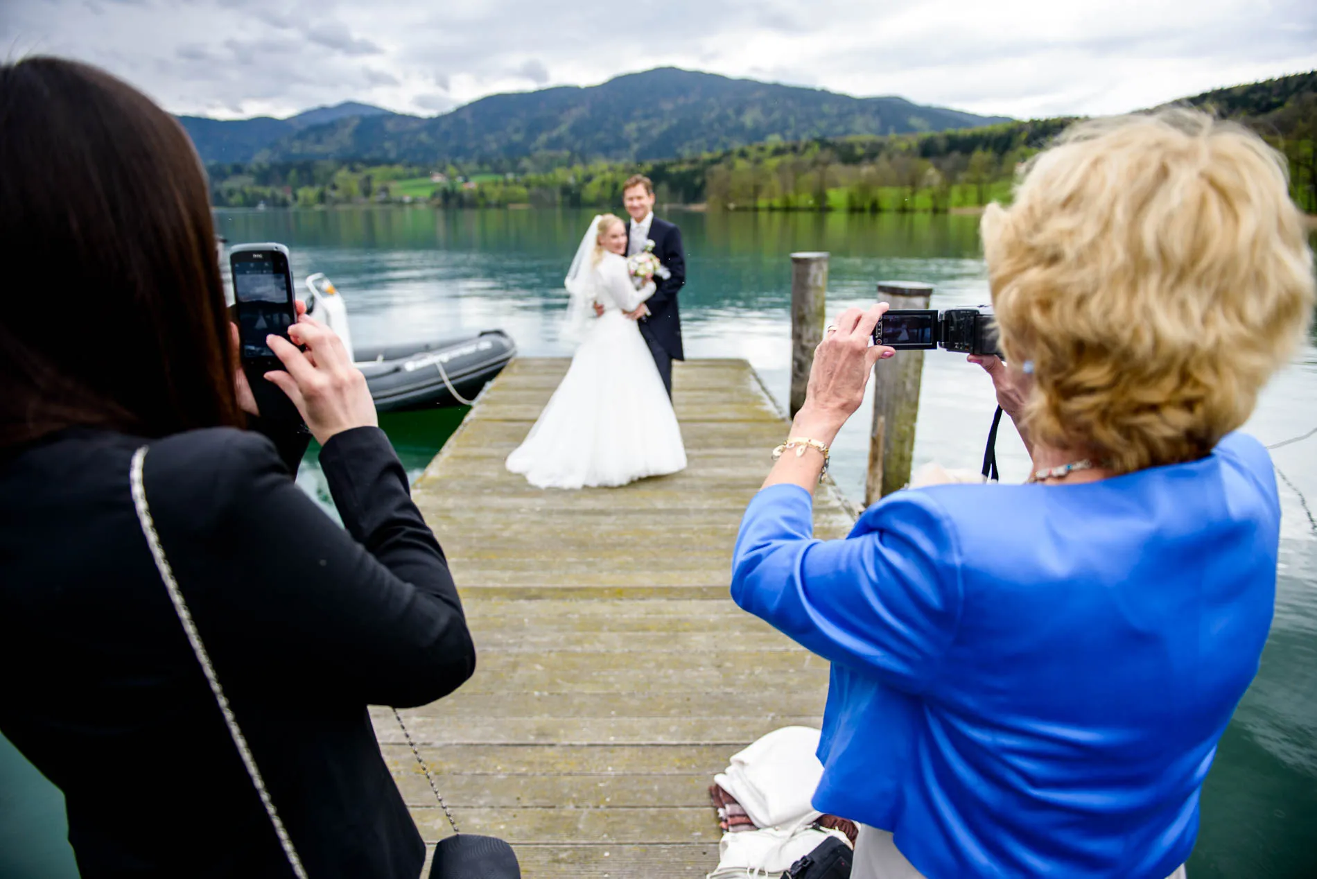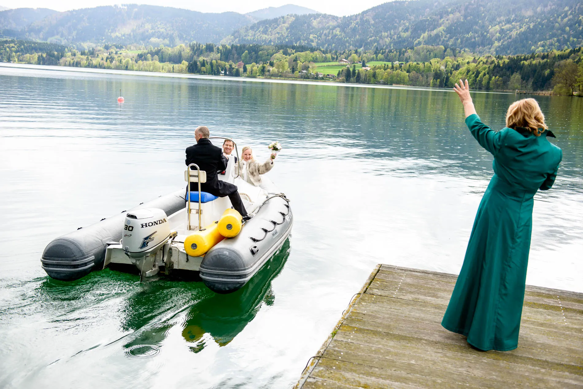 Eigentlich war eine romantische Kutschfahrt nach Gmund vorgesehen. Doch das Wetter hatte andere Pläne, und so wurde die Pferdekutsche kurzerhand gegen ein Auto eingetauscht. Praktisch, trocken und mit funktionierender Heizung – was will man mehr. In Gmund angekommen, konnten wir dann trotz leichten Regens wie geplant in das motorisierte Schlauchboot steigen. Zugegeben, nicht ganz so klassisch wie eine Gondel in Venedig, aber dafür mit einer Portion Abenteuer. Während die Gäste bereits am Café Kreutzkamm mit Luftballons warteten, näherte sich das Brautpaar vom Wasser aus – ein Auftritt, der in Sachen Originalität schwer zu überbieten ist.