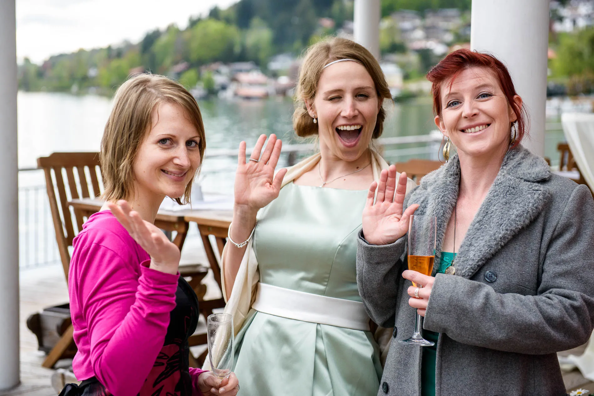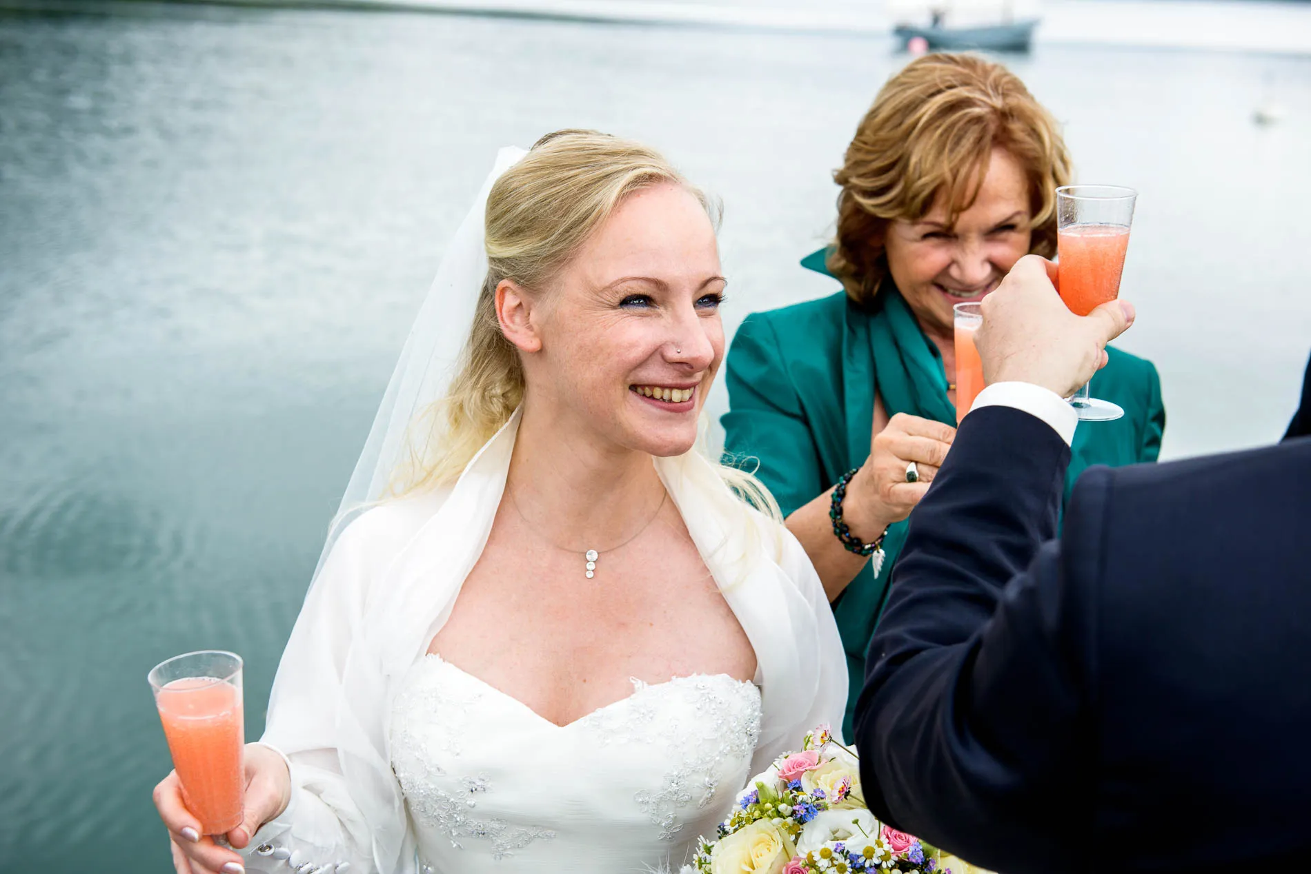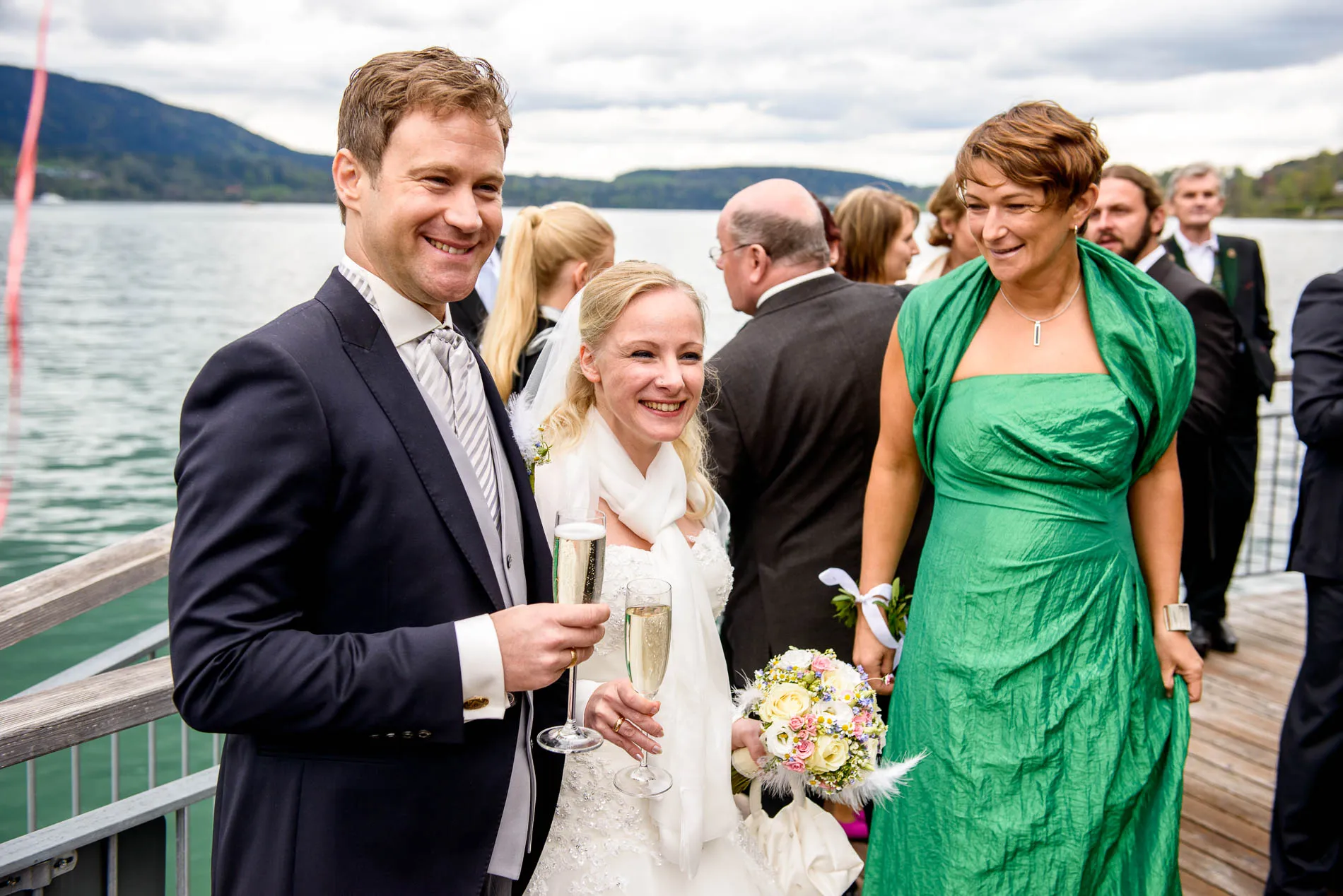 Am Steg in Gmund gab es ein kurzes Familienfoto und ein Glas rosa Schaumgetränk, das verdächtig nach Bellini aussah. Als Hochzeitsfotograf halte ich mich mit Alkohol selbstverständlich zurück – nicht aus Prinzip, sondern aus rein praktischen Gründen: Mit verlängerter Reaktionszeit verpasst man schnell den entscheidenden Kuss oder das überraschende Lachen.