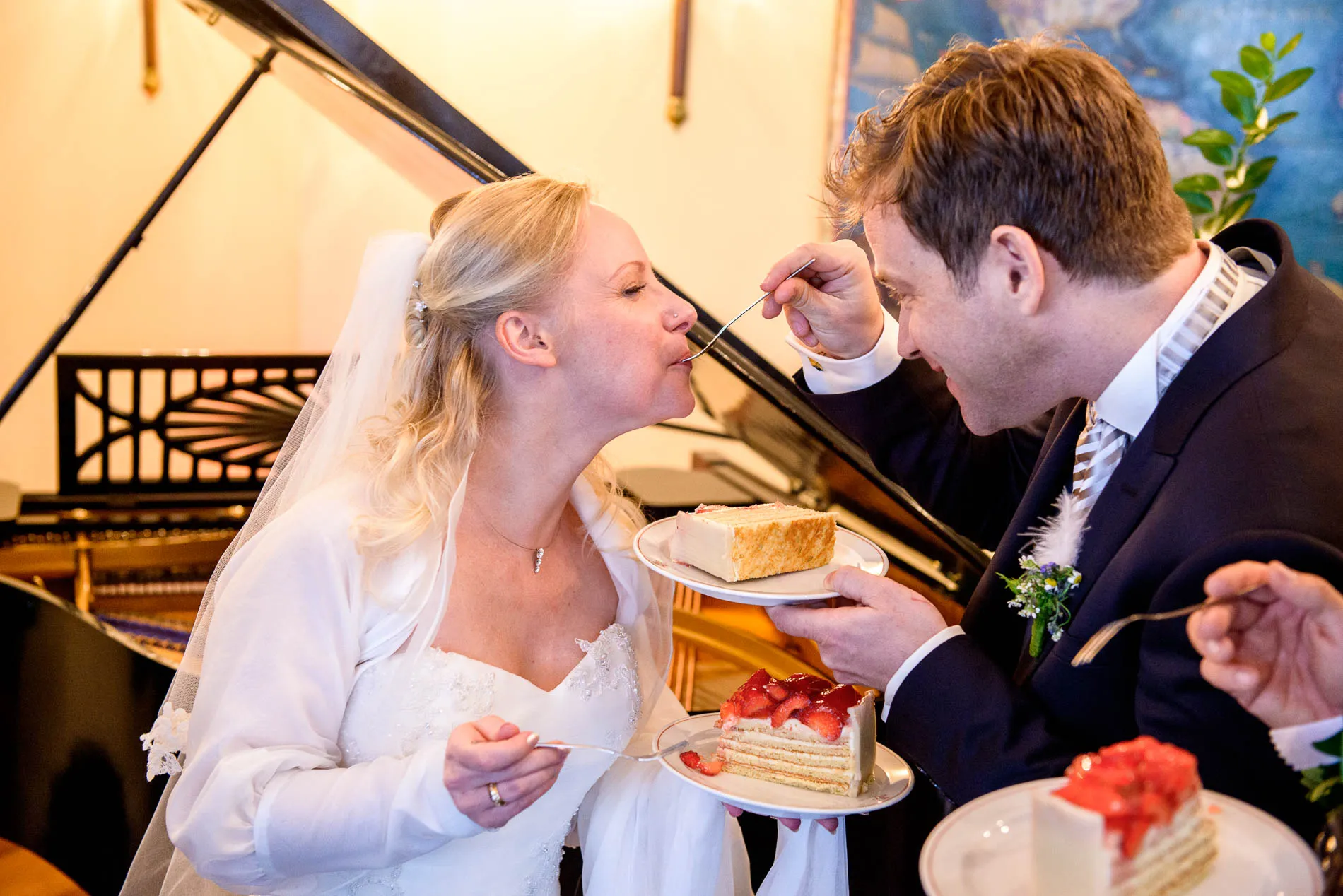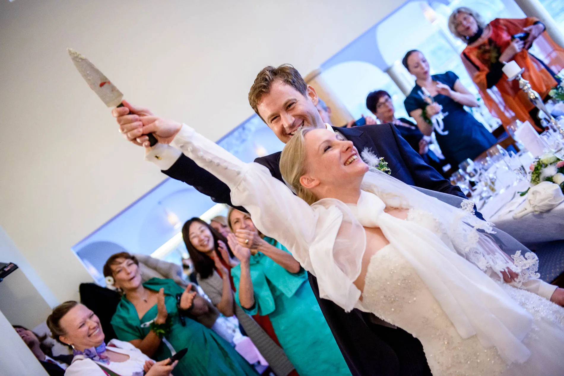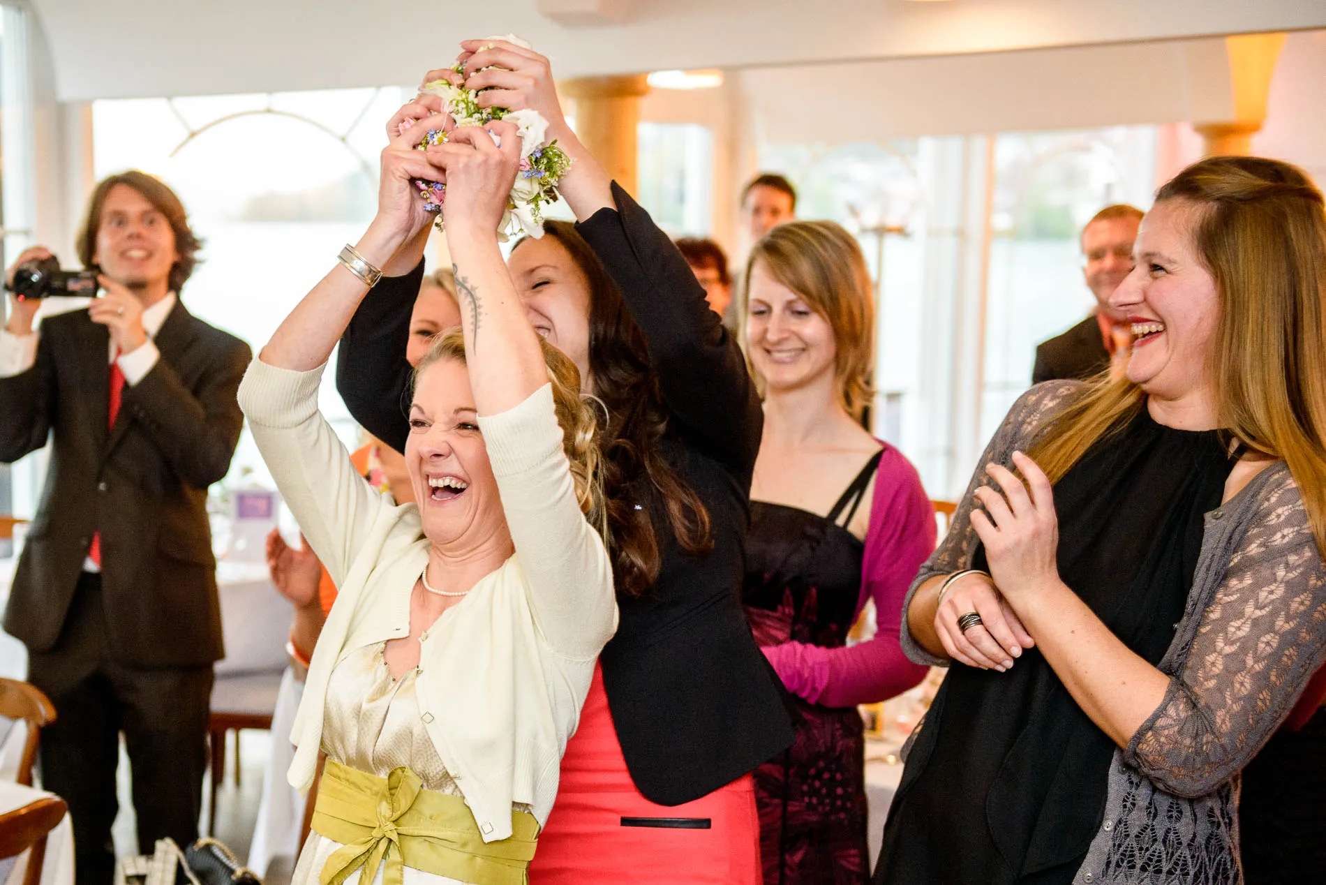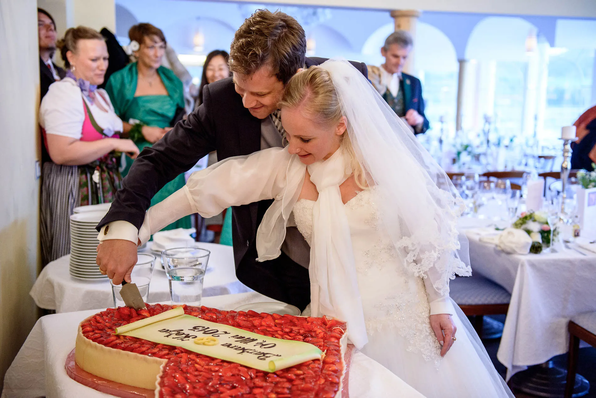 Im Café selbst folgte der Anschnitt einer riesigen Erdbeerherztorte. Wer die Hand oben hatte, war Nebensache – die beiden nahmen es sportlich und posierten danach wie frischgebackene Champions. Auch der Brautstraußwurf am frühen Nachmittag sorgte für Heiterkeit: Viele Hände griffen gleichzeitig nach dem Strauß, eine eindeutige Siegerin ließ sich nicht ausmachen. Man könnte sagen: ein Unentschieden mit Happy End.
