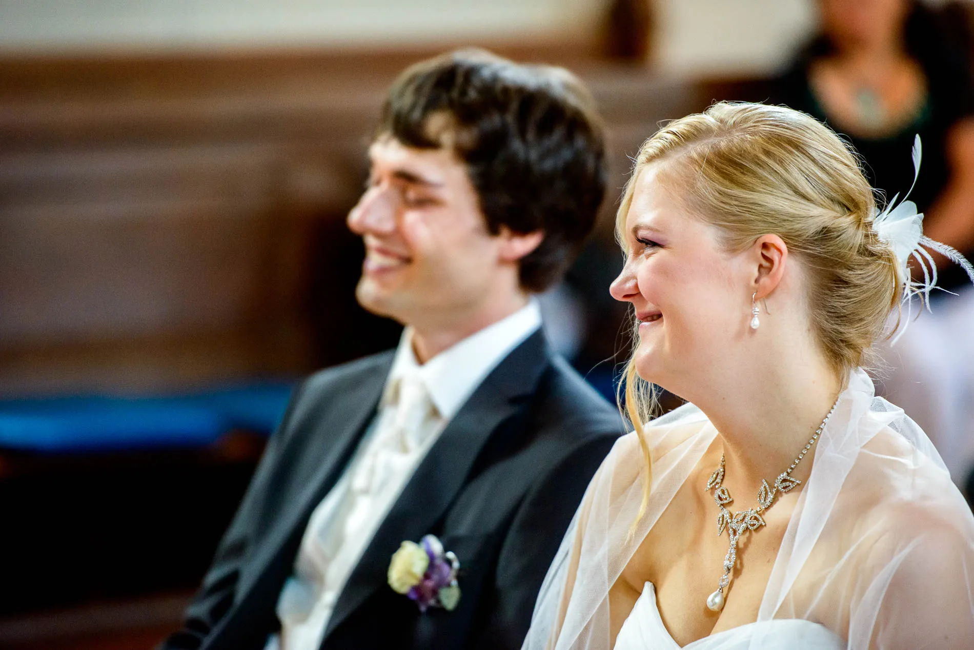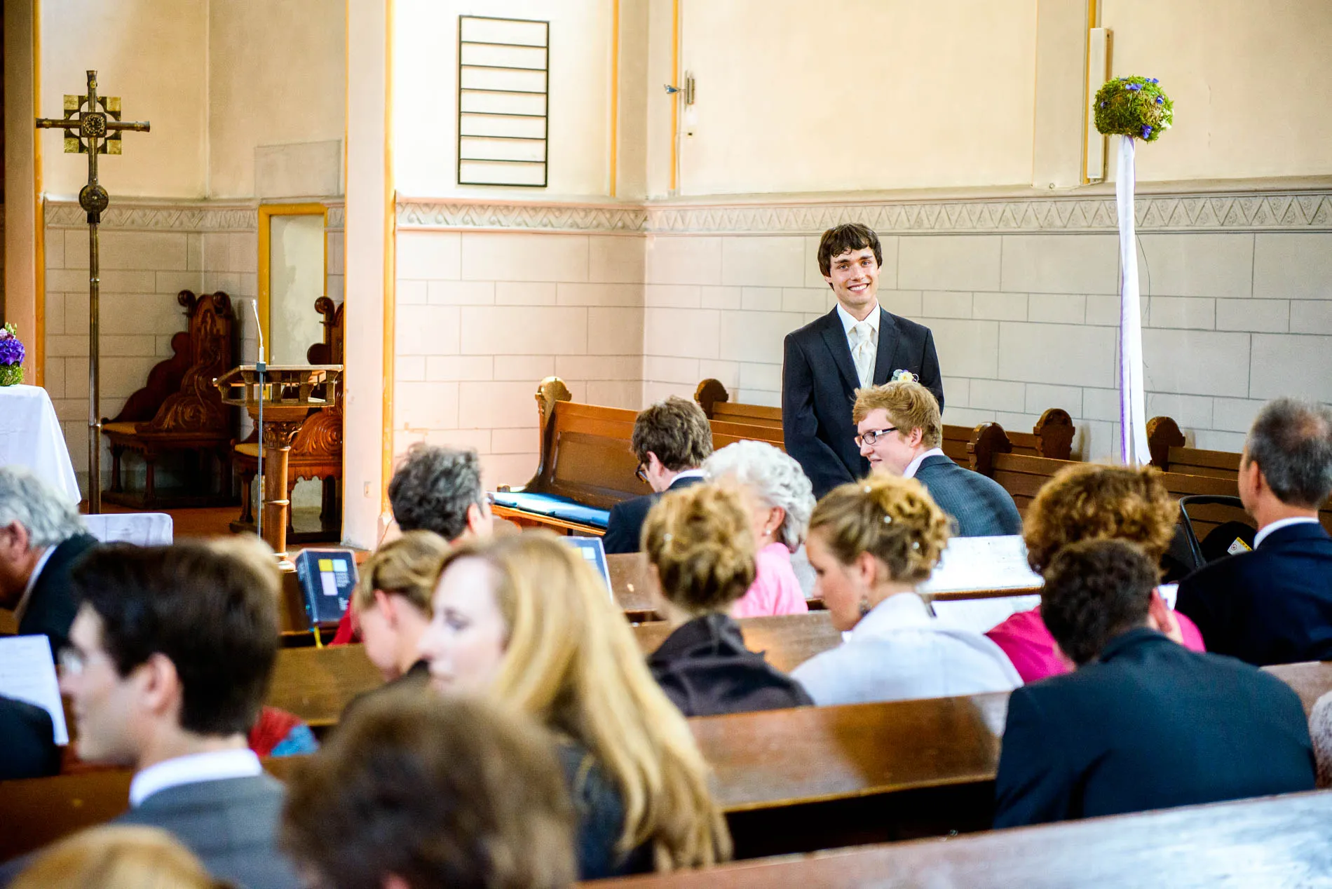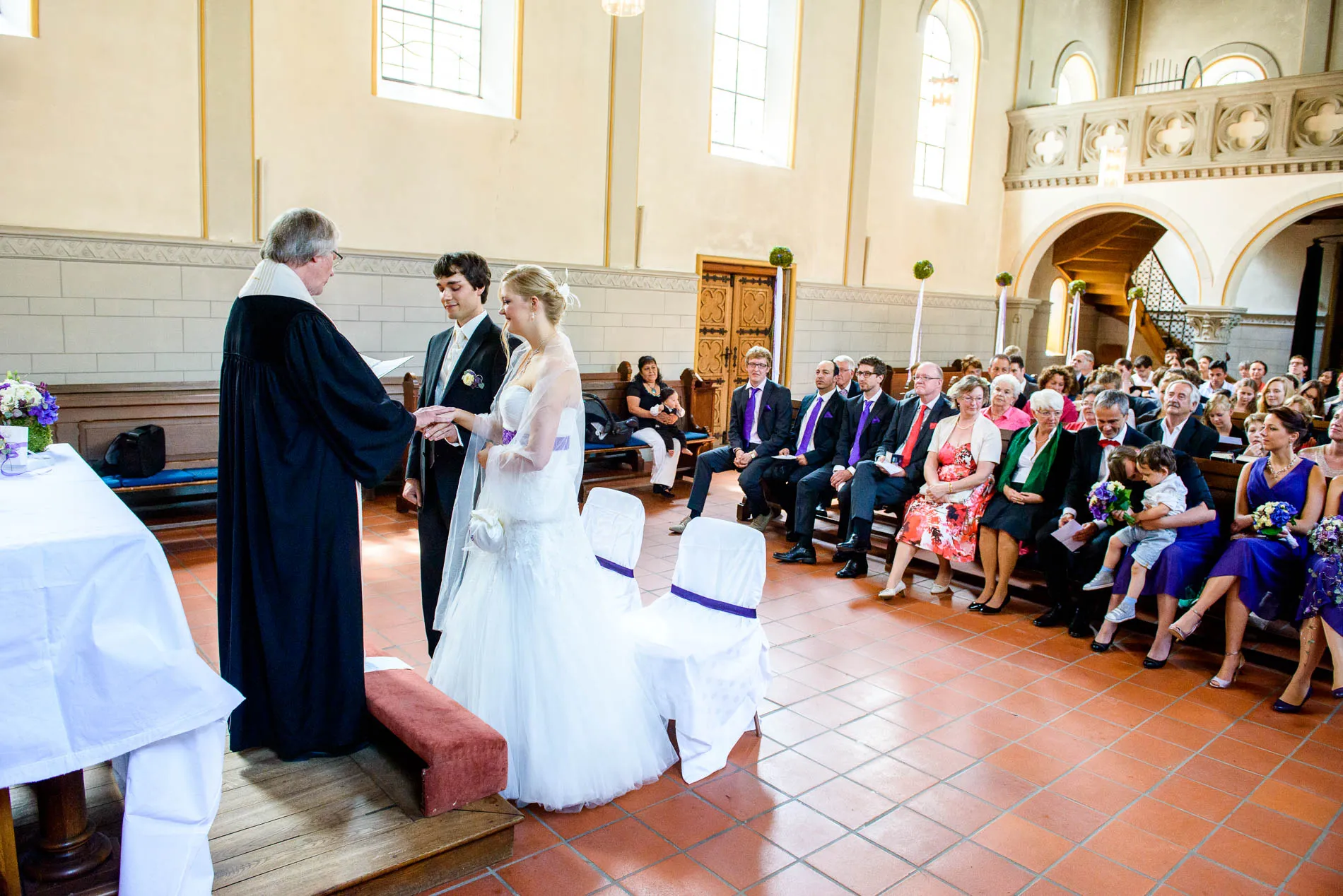 Die Hochzeit begann am frühen Nachmittag in der evangelischen Friedenskirche Starnberg. Ein Ort, der nicht nur durch seine Architektur beeindruckt, sondern auch durch seine helle, freundliche Atmosphäre. Die Braut wurde traditionell vom Vater hereingeführt, während der Bräutigam am Altar wartete – ein Moment, der selbst nach hunderten Hochzeiten noch immer eine gewisse Magie versprüht.