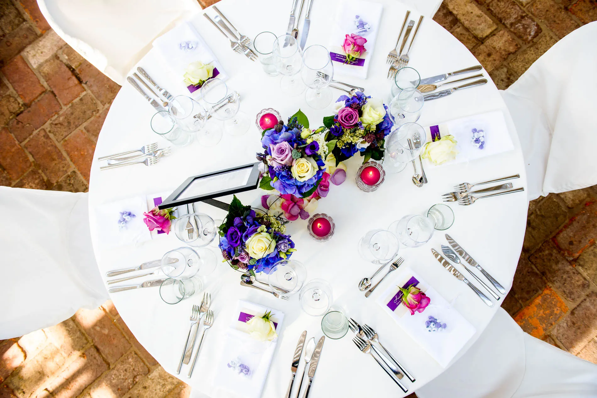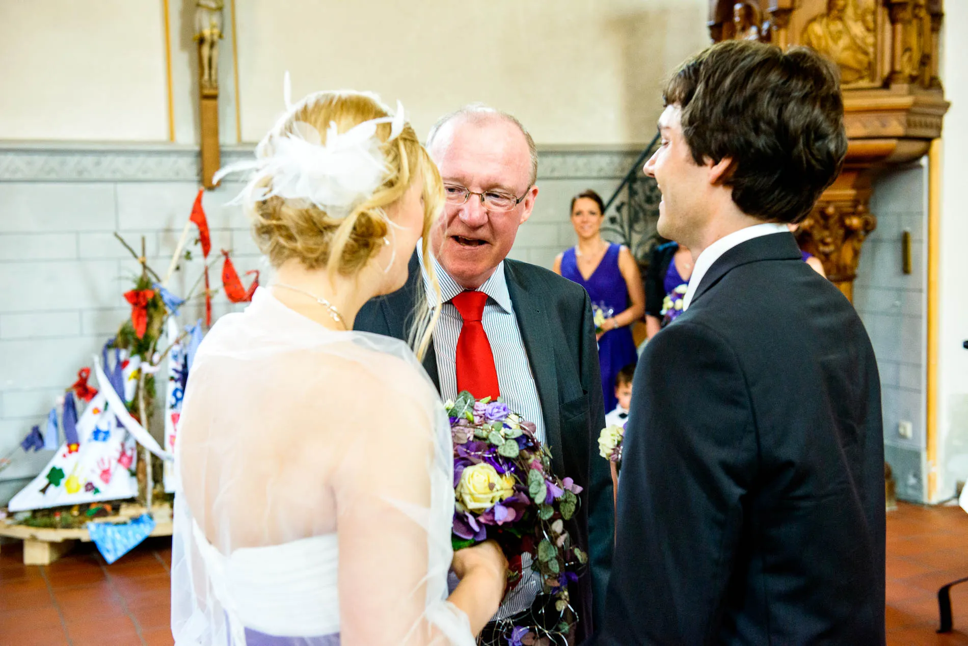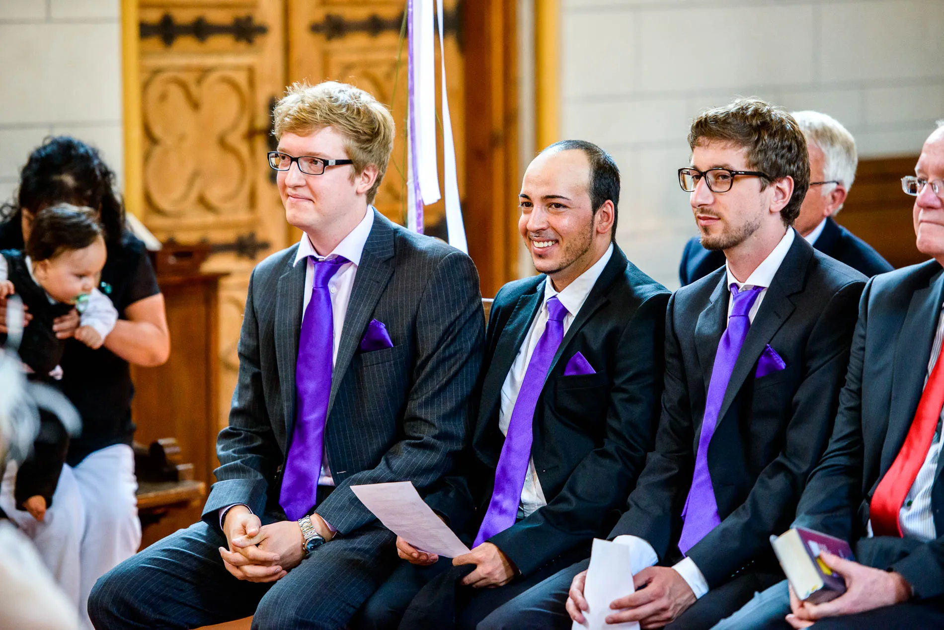 Besonders charmant war die farbliche Abstimmung der Hochzeitsgesellschaft: drei Brautjungfern in lila‑blauen Kleidern und die drei Best Men mit passenden Krawatten. Solche Koordination sieht man selten – fast wie ein modisches Statement mit Augenzwinkern.