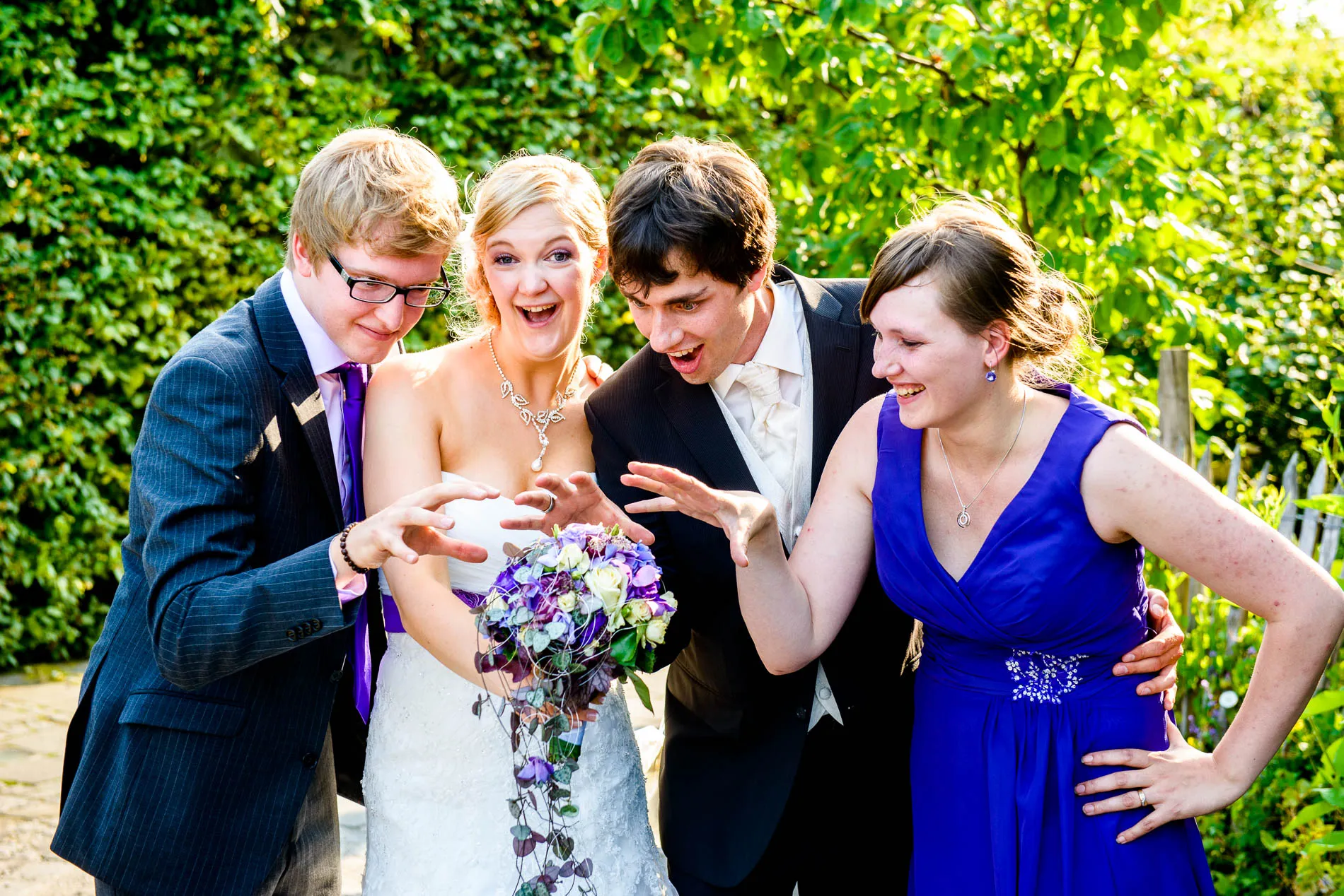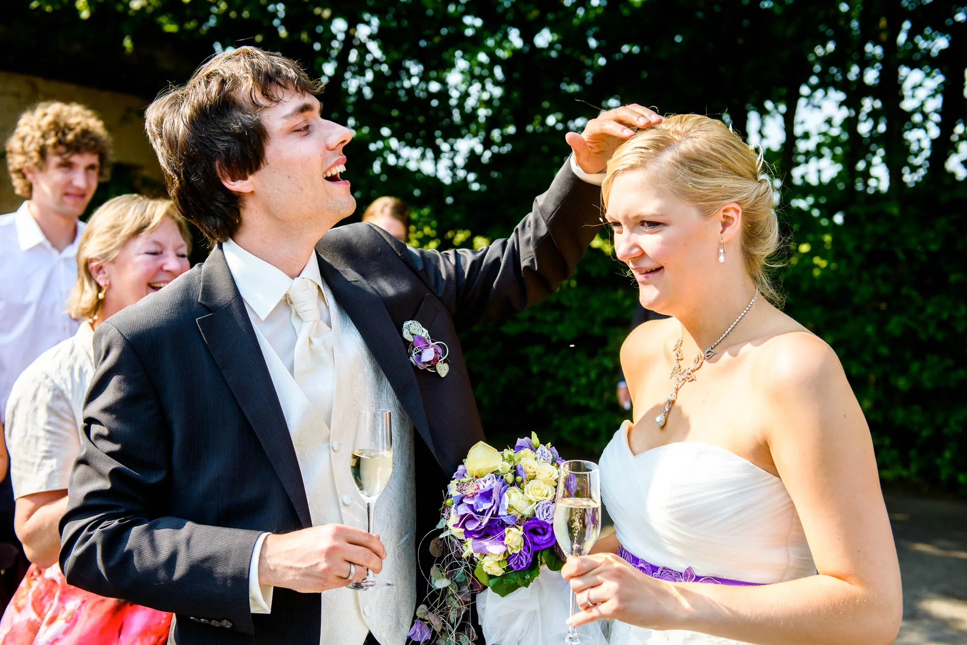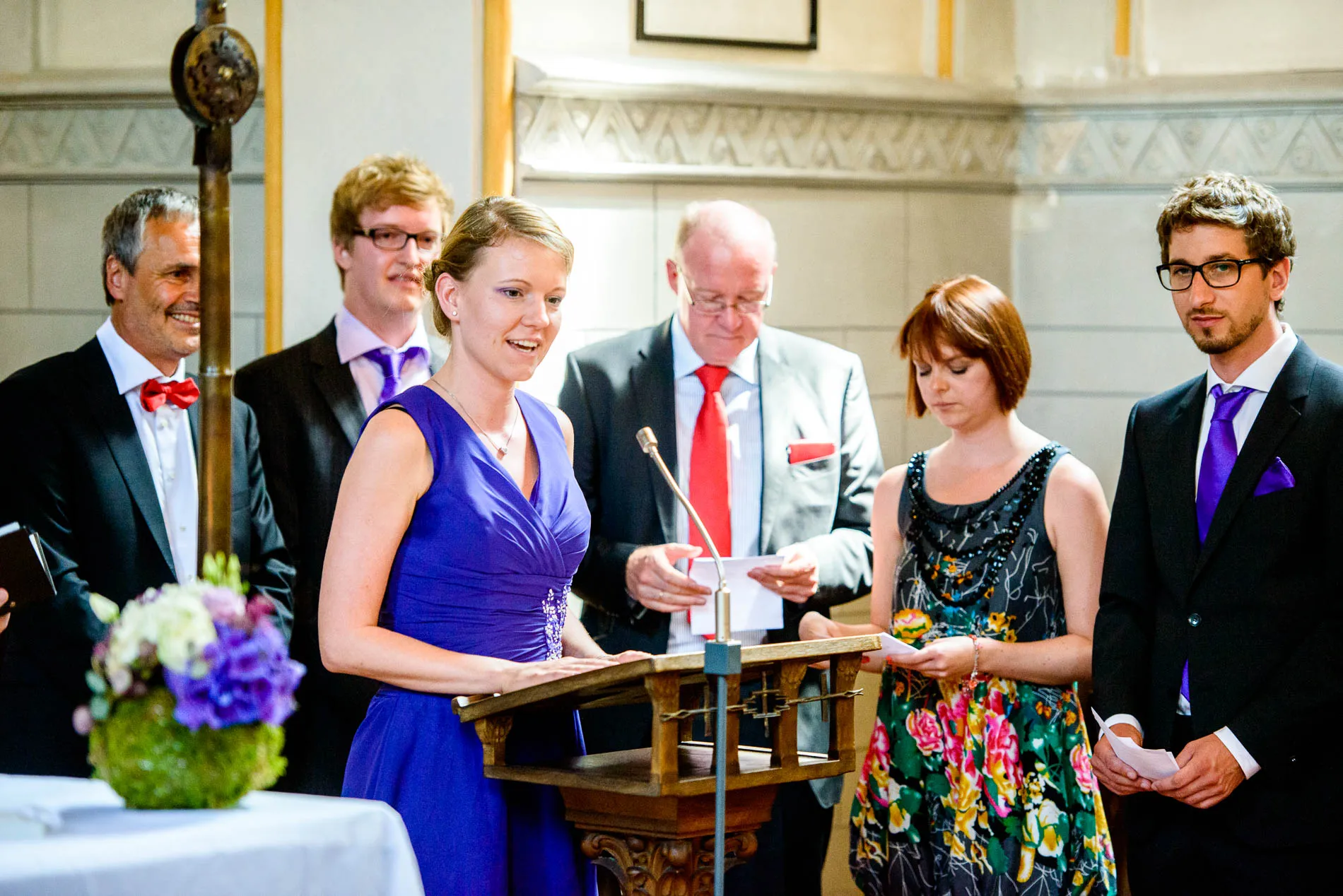 Natürlich gab es auch die klassischen Gruppenfotos: mit Eltern, Brautjungfern, Best Men und schließlich der gesamten Gesellschaft. Besonders schön war die lockere Stimmung – niemand musste lange überredet werden, und die lila‑blauen Farbakzente gaben den Bildern einen fast filmischen Look.