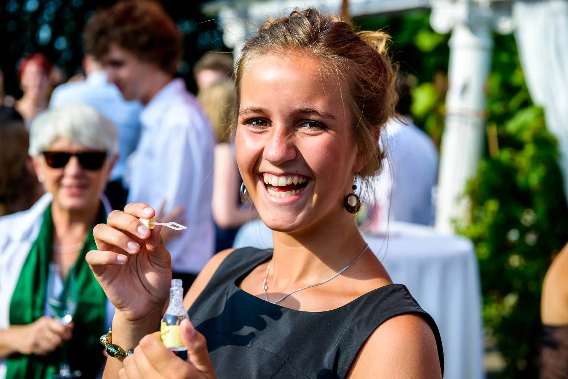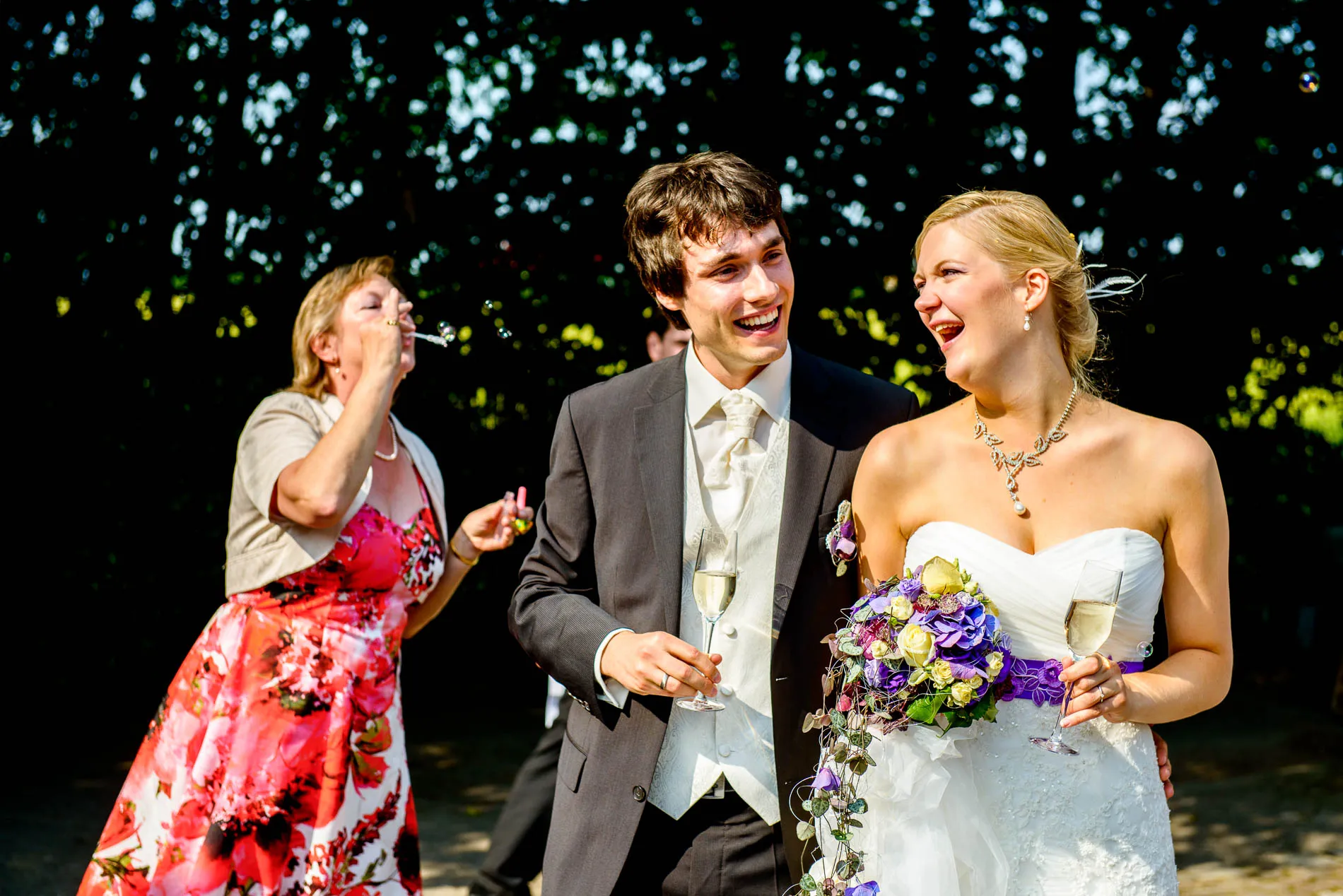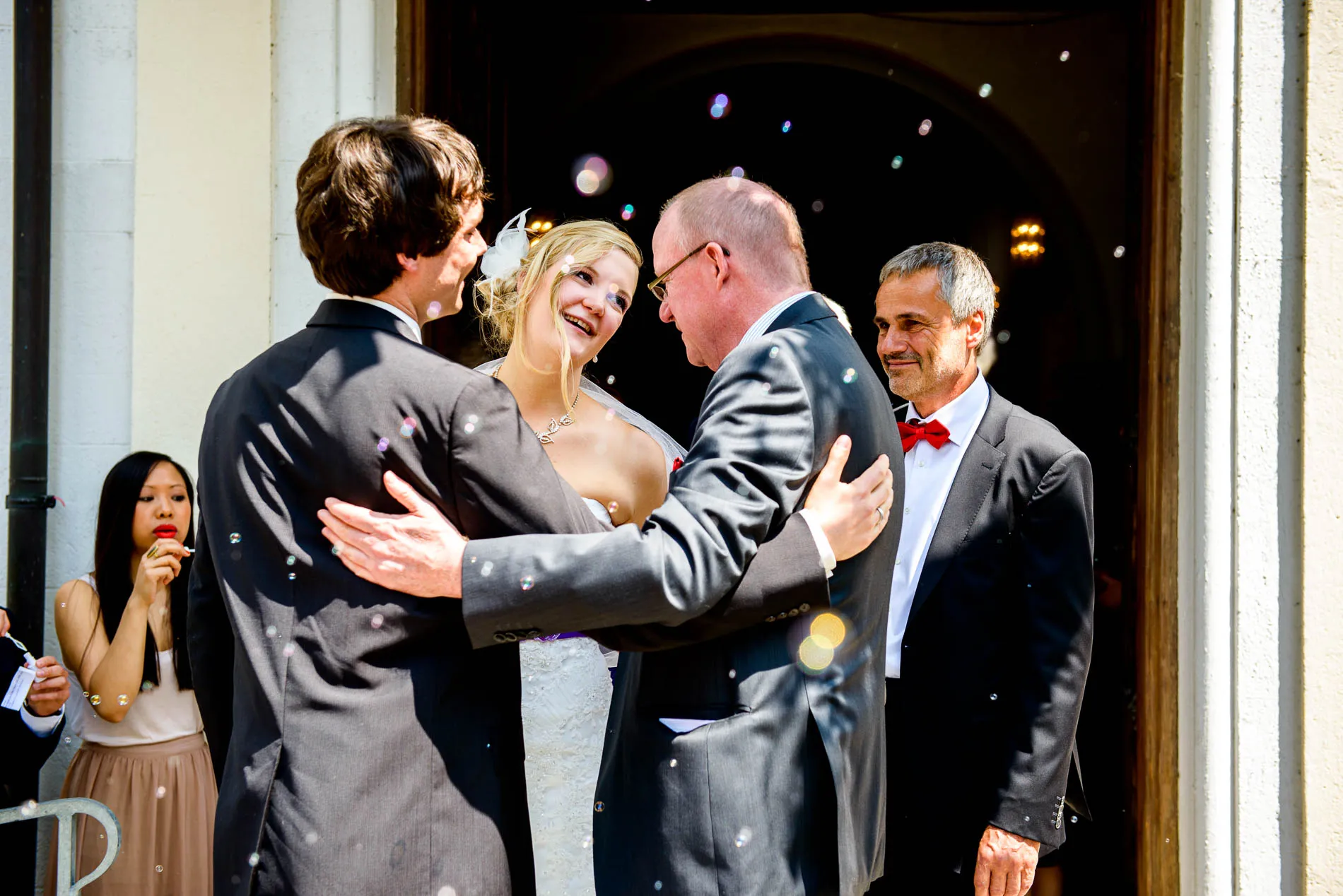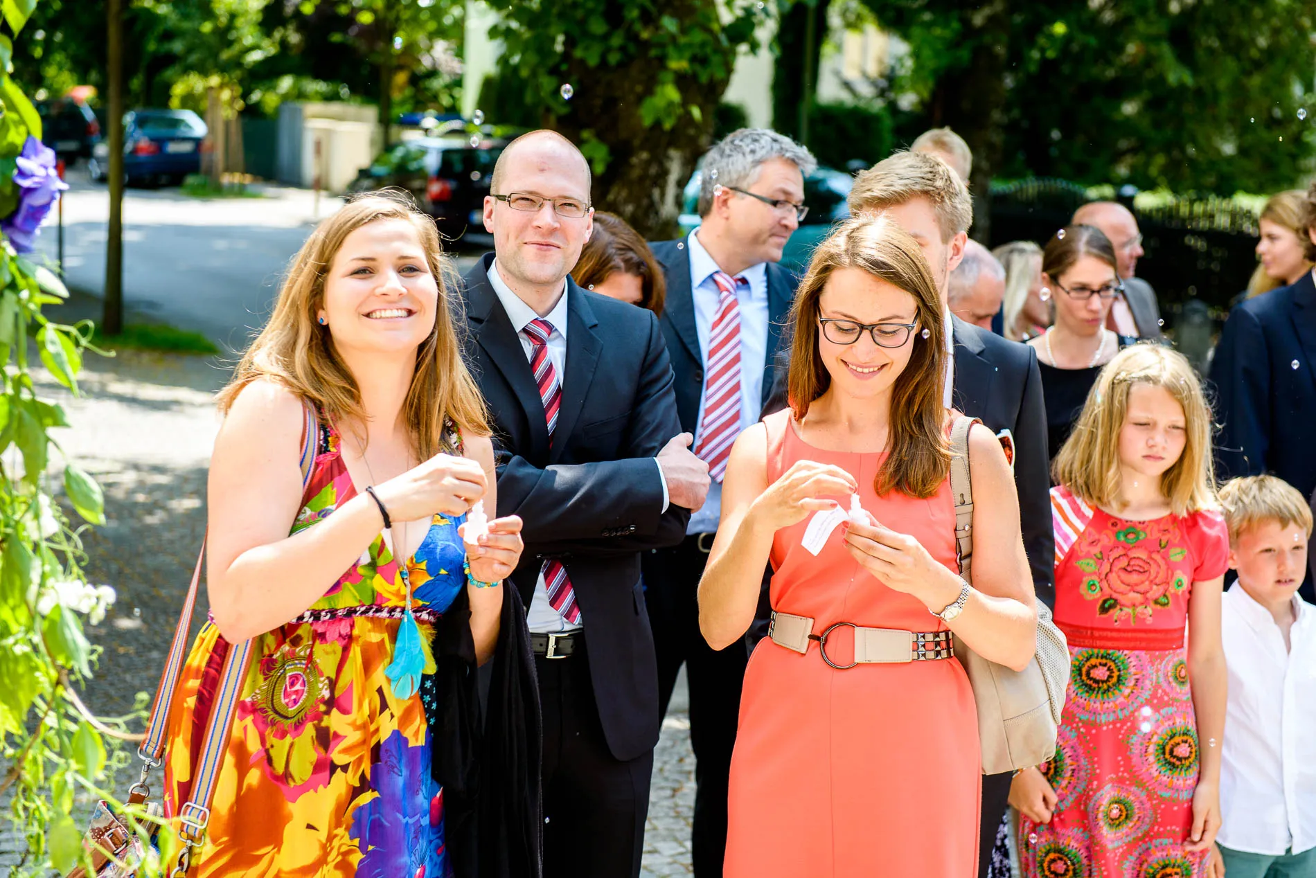 Beim Auszug aus der Kirche gab es Glückwünsche und Seifenblasen. Die meisten Gäste setzten auf klassische Lungenkraft, während ein kleiner Junge seine Seifenblasenpistole mit stolzer Miene präsentierte. Ich habe selten jemanden gesehen, der so überzeugt war, dass Technik die bessere Lösung ist.