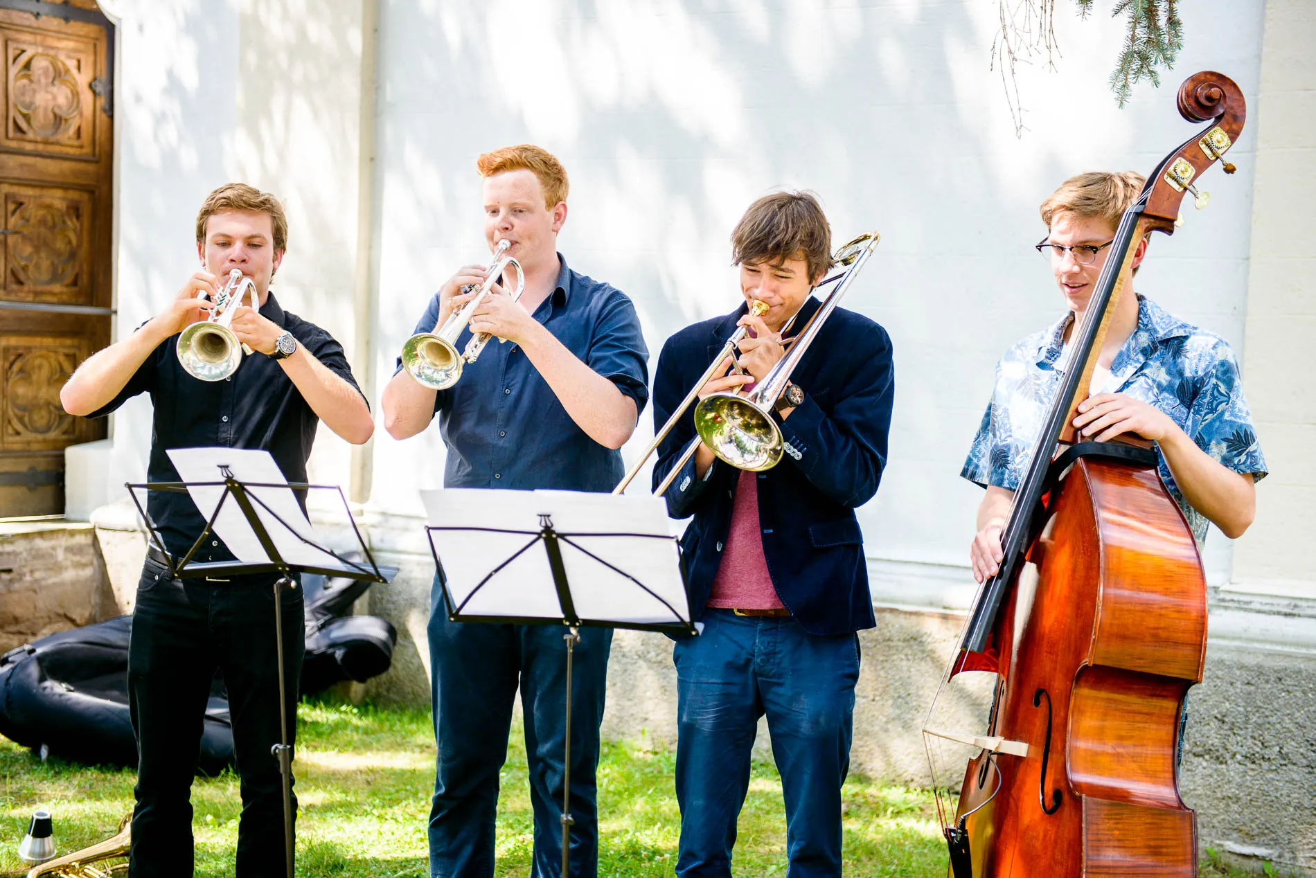 Nach der Trauung gab es einen Empfang hinter der Kirche, musikalisch begleitet von einer kleinen Bläsergruppe. Ich behaupte ja, dass Bläser im Freien eine Art akustisches Champagner sind: prickelnd, festlich und manchmal ein wenig überraschend laut.