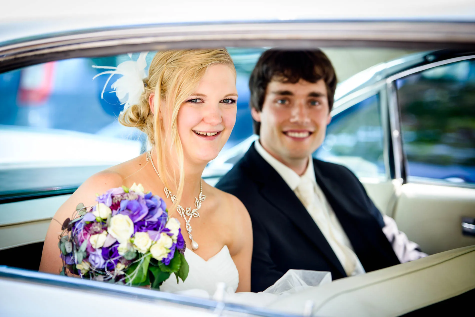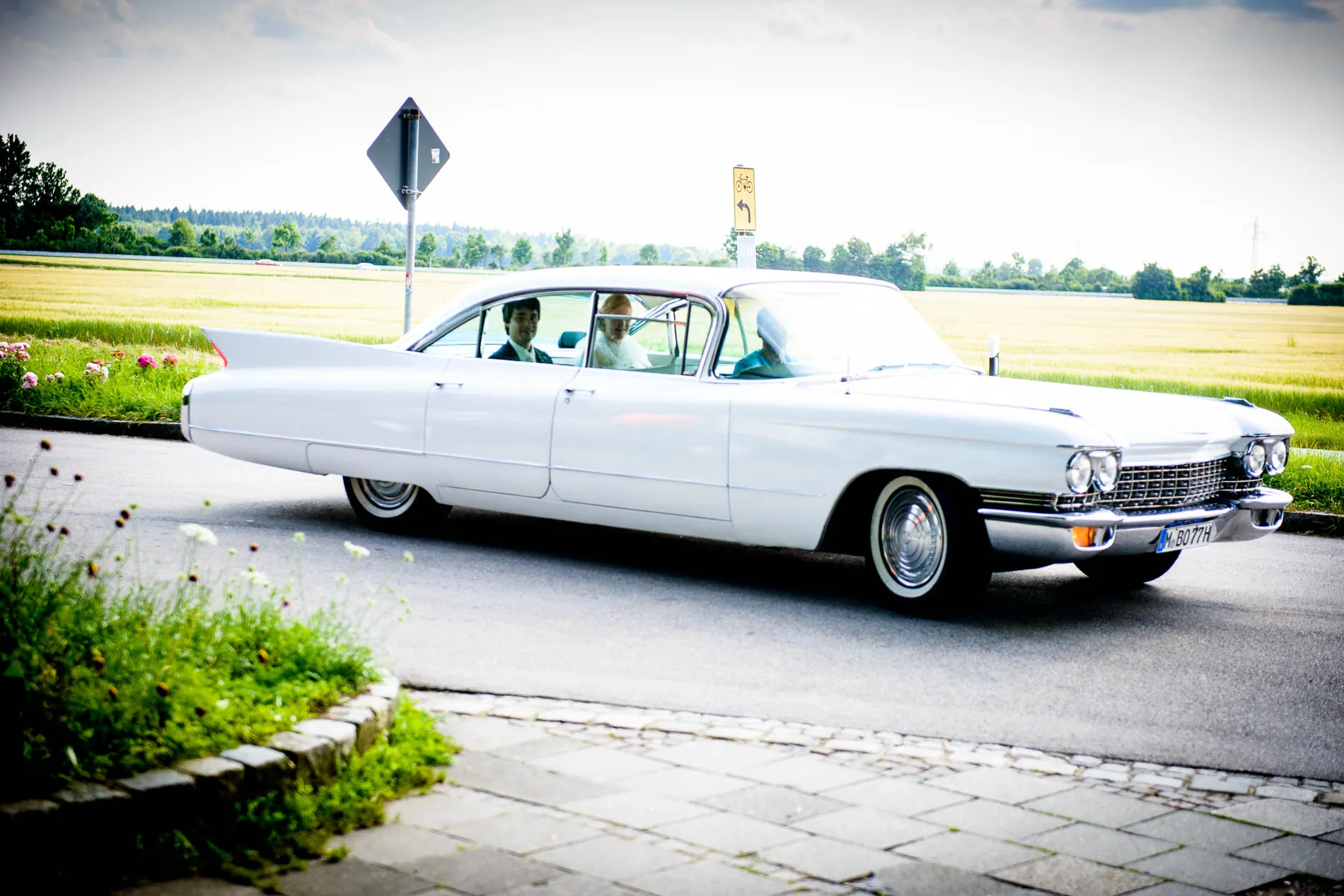 Die Fahrt zur Alten Gärtnerei Taufkirchen erfolgte stilecht in einem alten Straßenkreuzer. Wer sagt, dass Autos keine Hochzeitsgäste sein können, hat noch nie erlebt, wie ein amerikanischer Klassiker mit viel Chrom und noch mehr Charme vorfährt.