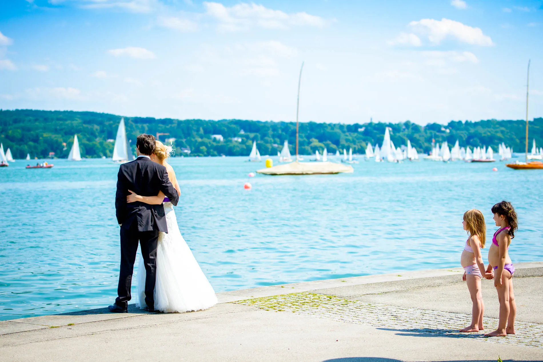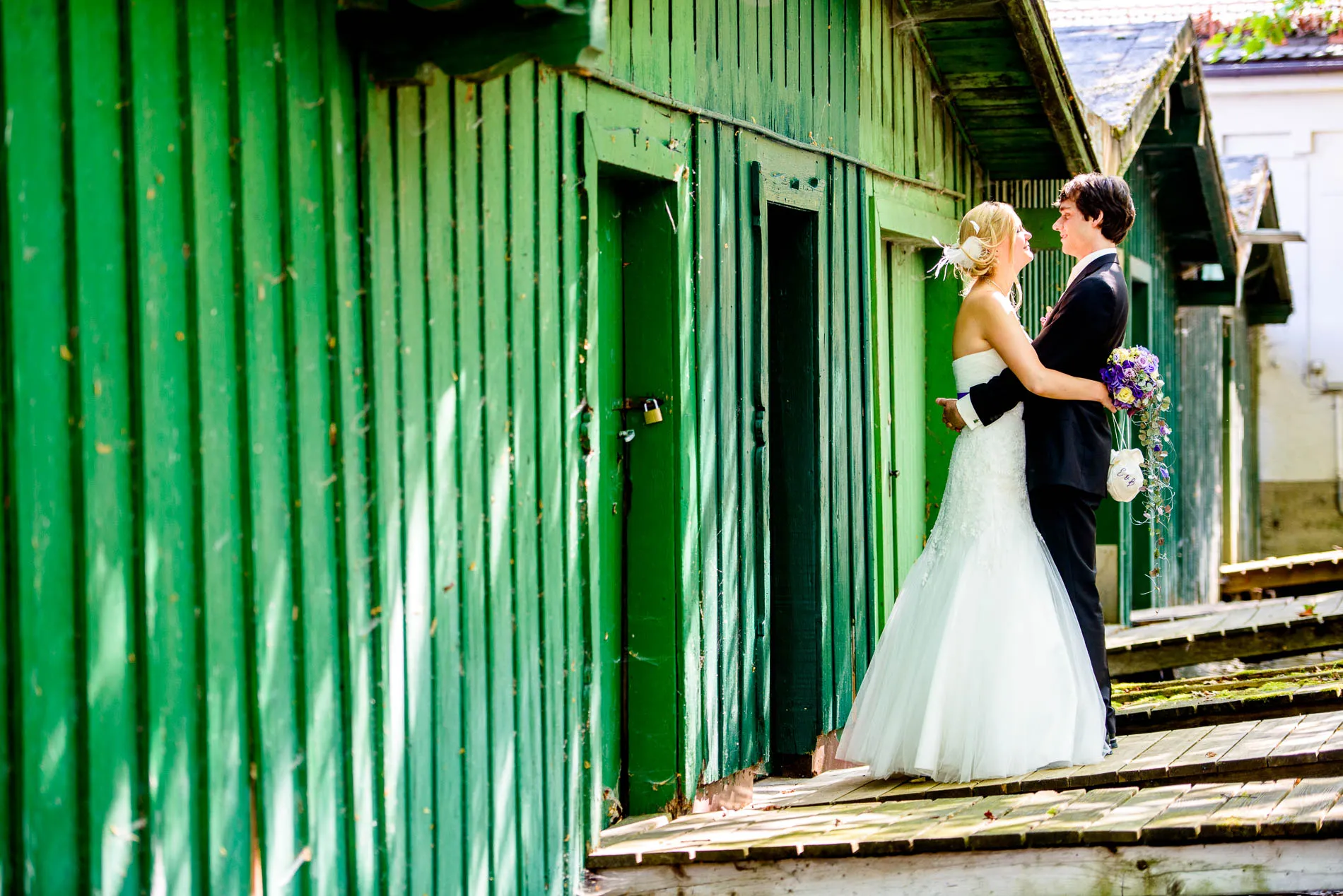 Während die Gäste schon Richtung Feierlocation aufbrachen, nutzte ich die Gelegenheit, mit dem Brautpaar einen Abstecher zum Starnberger See zu machen. Die Uferpromenade bietet eine entspannte Kulisse, die sich hervorragend für natürliche Paarfotos eignet. Ein ruhiger Abschnitt des Tages, fast wie ein kurzer Atemzug zwischen den Programmpunkten.