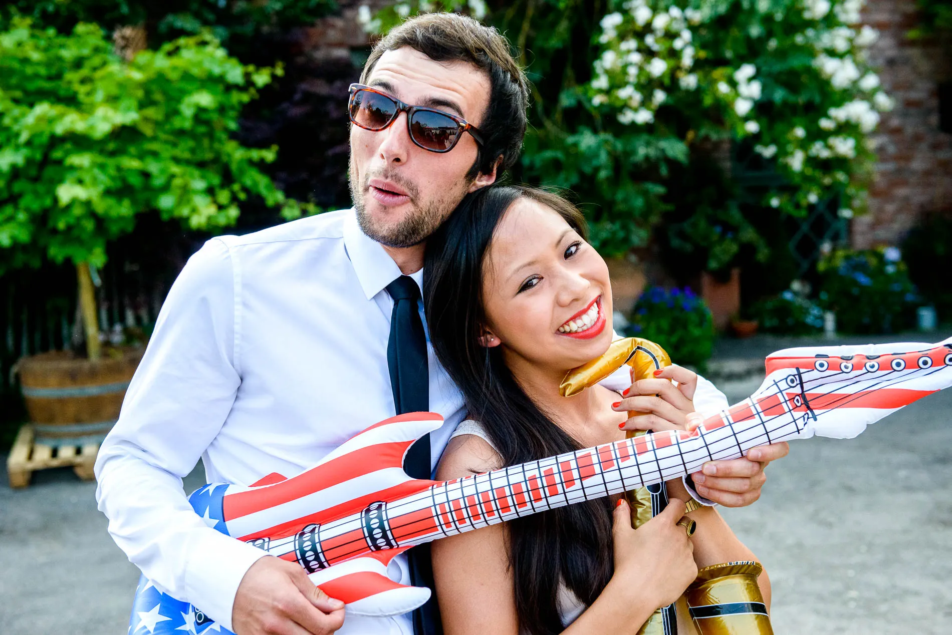 Bei der Ankunft wurde das Brautpaar mit Blüten, Reis und erneut Seifenblasen begrüßt. Dazu gesellten sich Luftrüssel und Rolltröten – eine akustische Mischung, die irgendwo zwischen Kindergeburtstag und Karneval liegt, aber erstaunlich gut funktioniert, wenn alle glücklich sind.