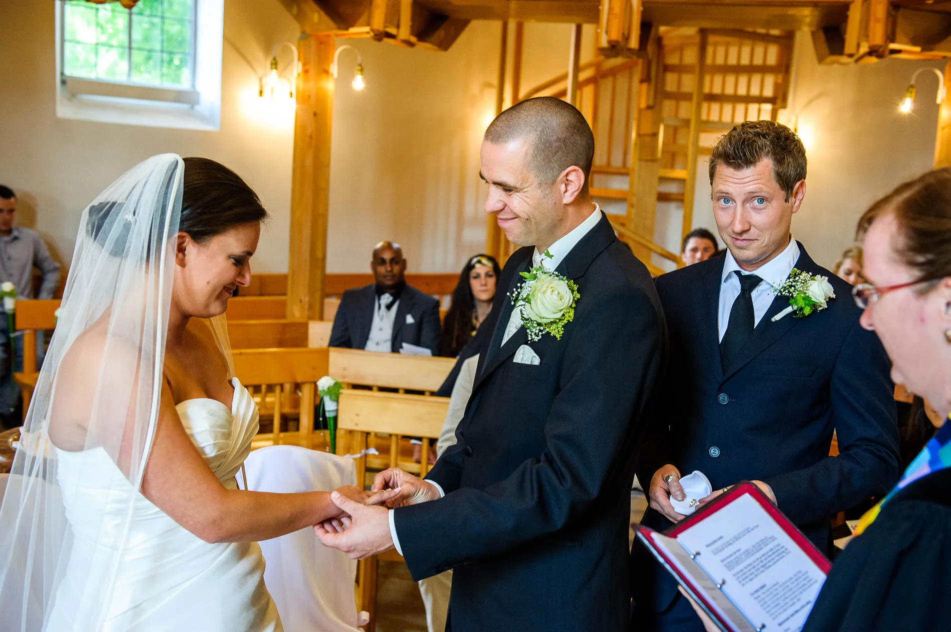 Die Trauung selbst wurde von einer Pastorin geleitet, die angenehm entspannt war. Für mich als Hochzeitsfotograf in Murnau eine Wohltat, denn es gibt Geistliche, die meinen, die halbe Kirche sei Sperrgebiet. Hier war das Gegenteil der Fall: freie Bahn für authentische Momente, ohne dass jemand das Gefühl hatte, ich würde den Altar gleich in ein Fotostudio verwandeln.