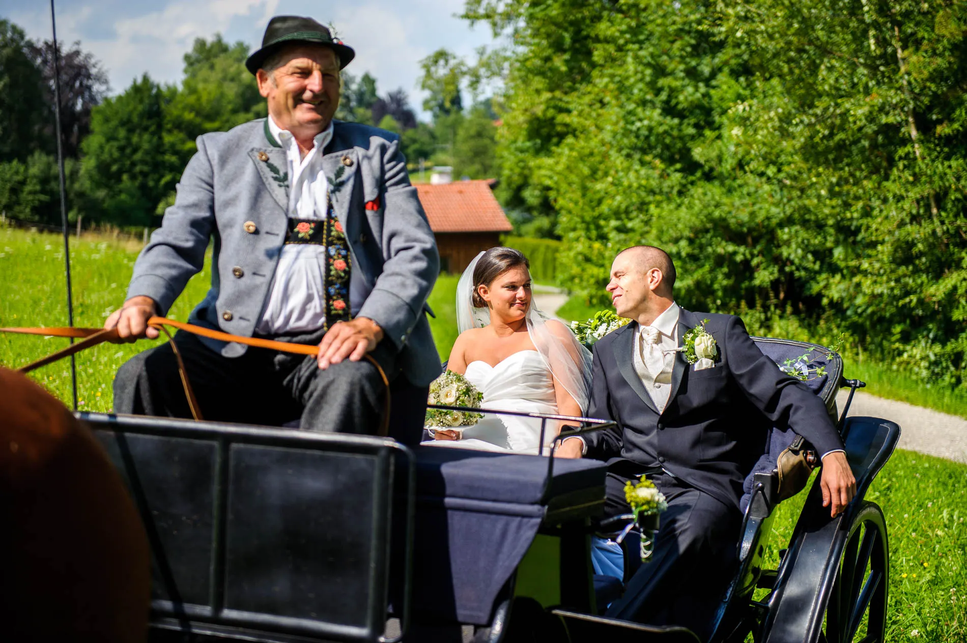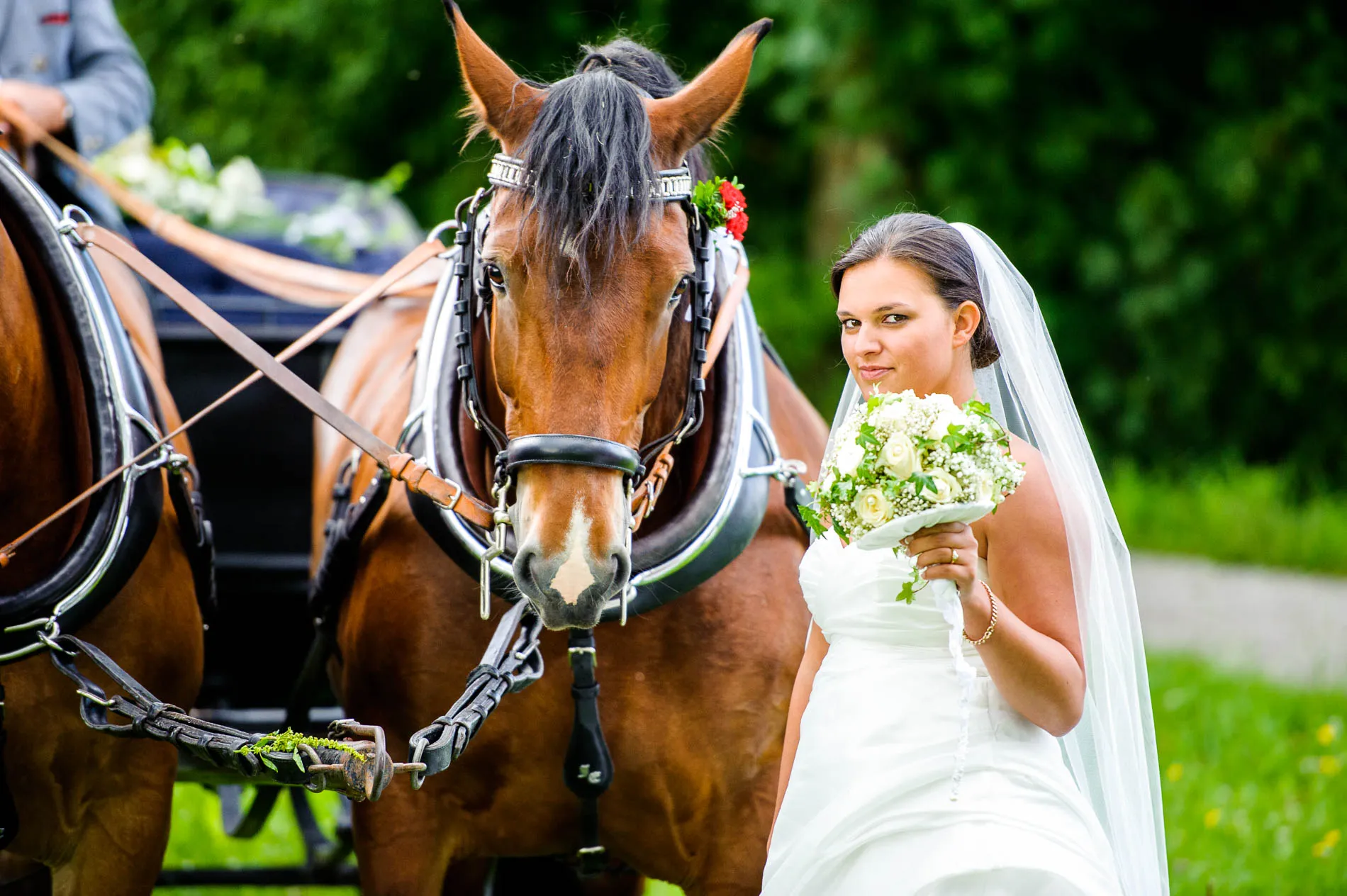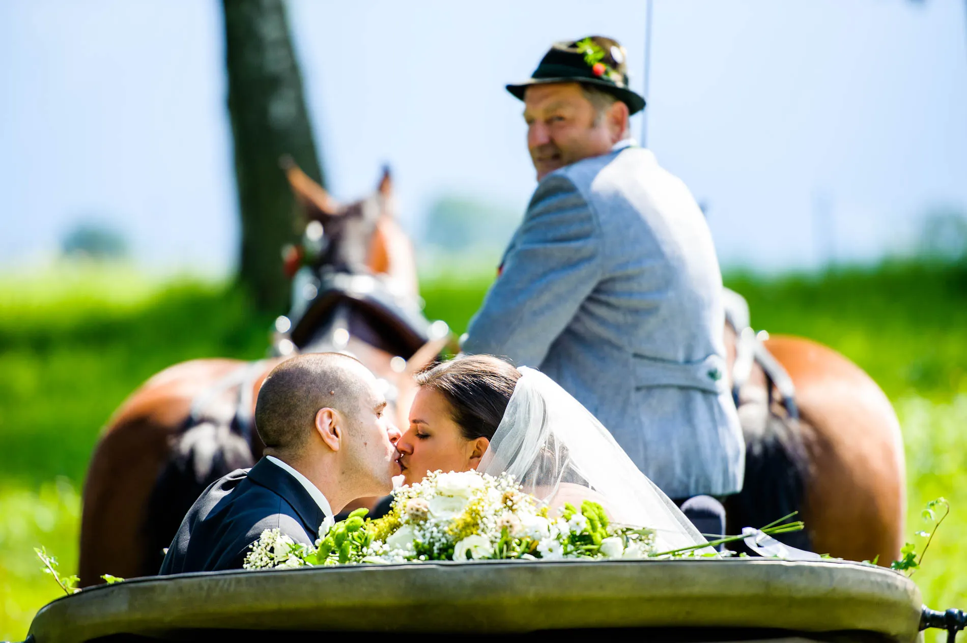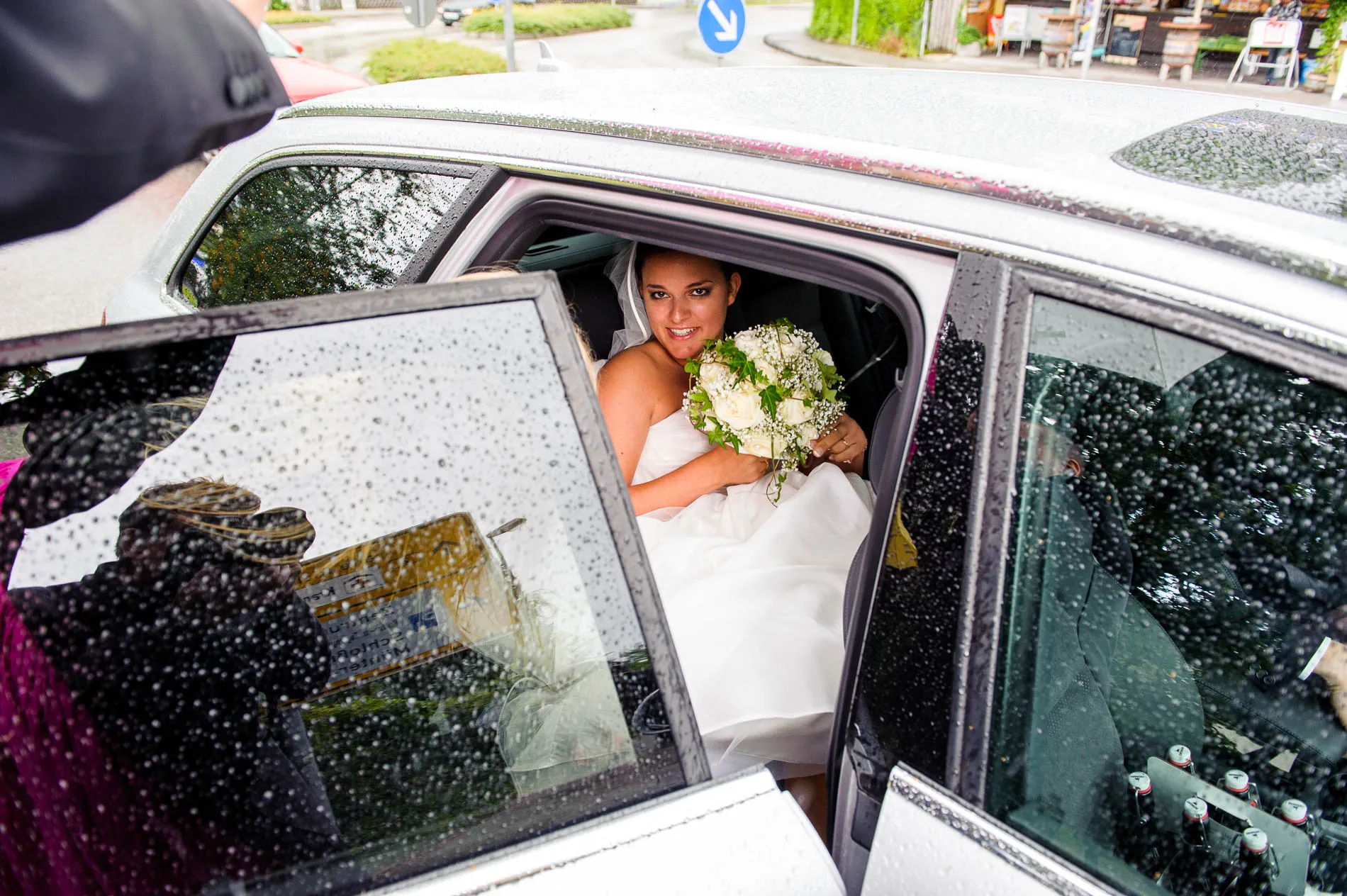 Geplant war eine Fahrt mit der offenen Hochzeitskutsche. Beim Auszug aus der Kirche machte der Regen diesem Plan zunächst einen Strich durch die Rechnung. Doch wie es sich für eine gute Geschichte gehört, gab es eine Wendung: Bei der Ankunft im Restaurant schien wieder die Sonne, und so konnte die Kutsche später doch noch zum Einsatz kommen. Sie holte uns sogar für das Brautpaarshooting ab – ein Hauch von Märchen, nur eben mit Regenschirm statt Zauberstab. Am Ende des Shootings erwischte uns dann doch noch ein Schauer, aber das Brautpaar nahm es mit Humor. Und genau das sind die Momente, die später die schönsten Erinnerungen ergeben.