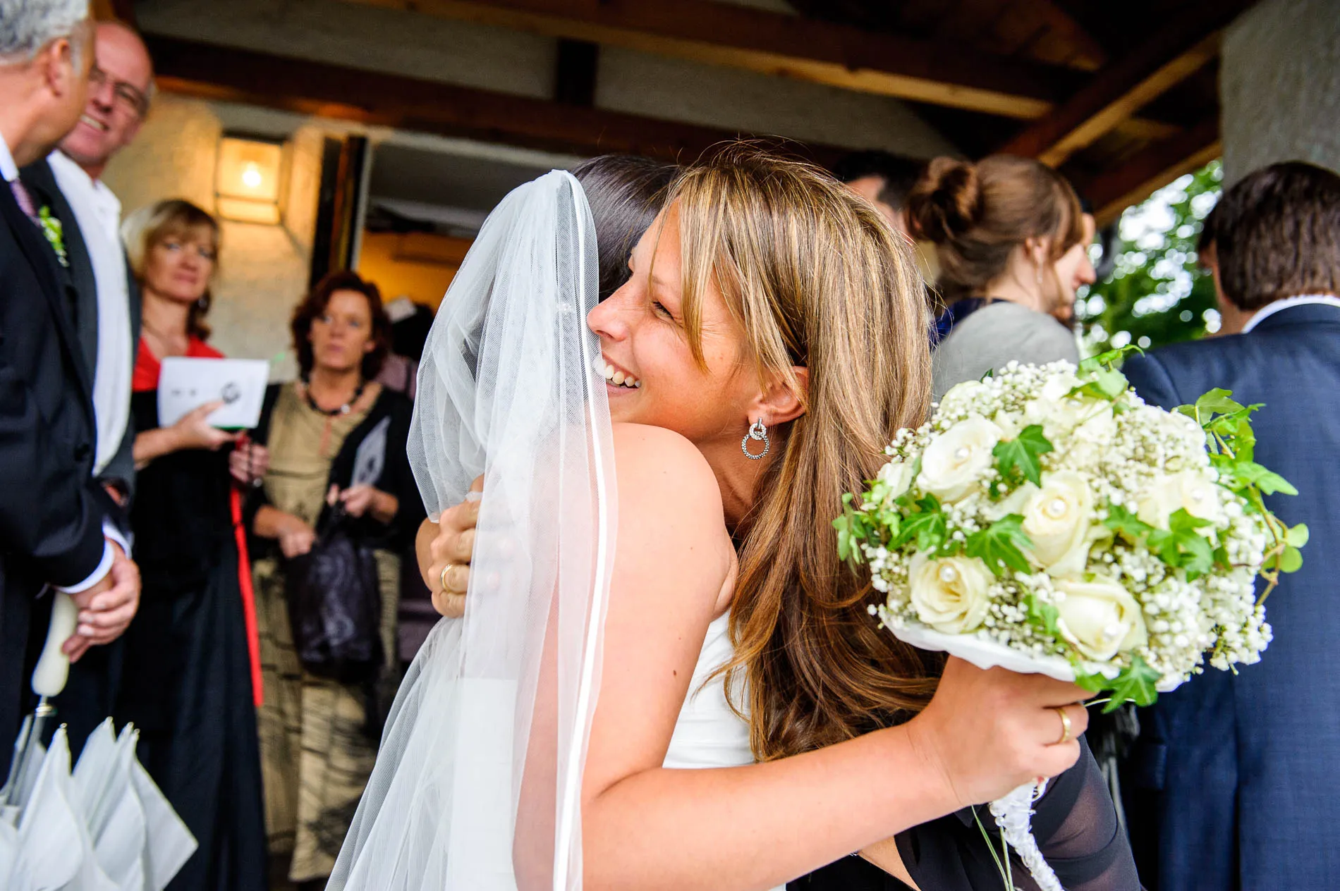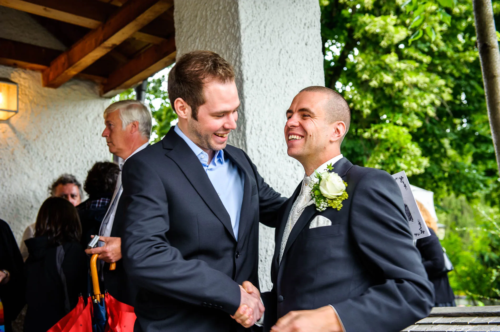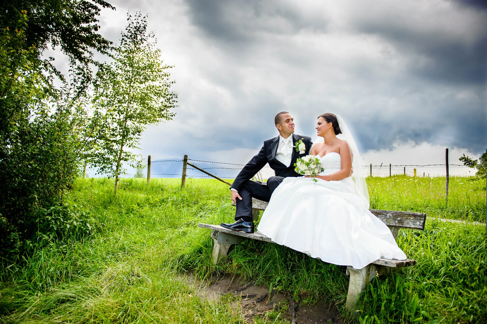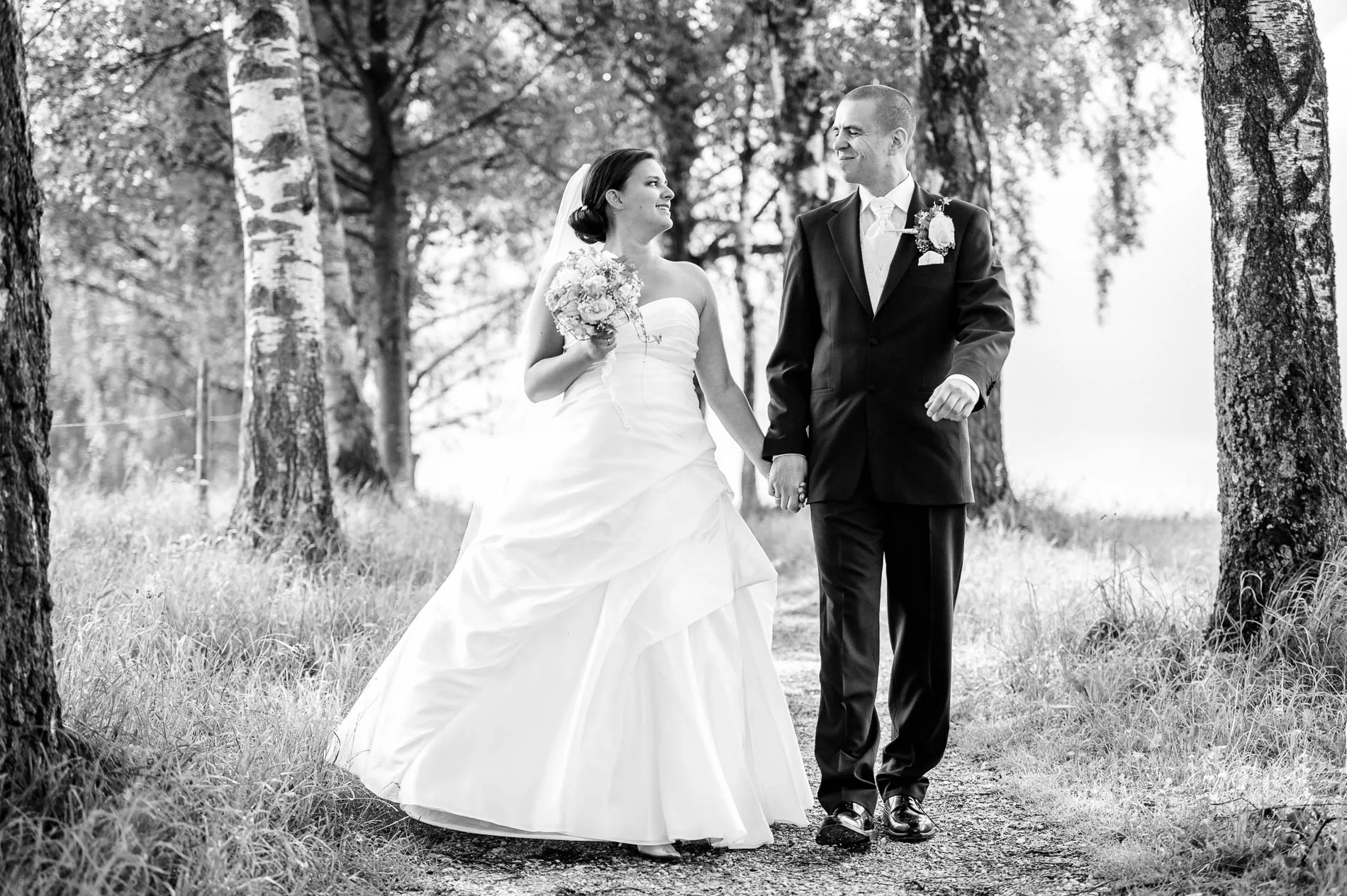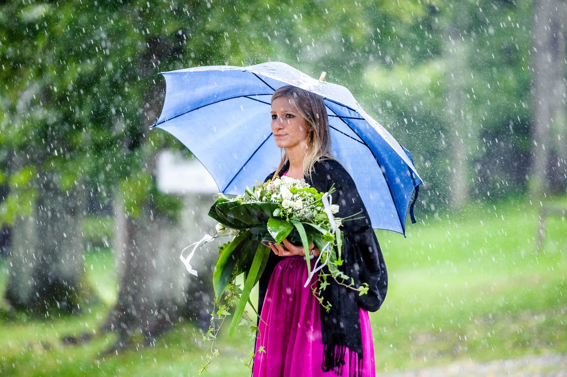 Geplant war eine Fahrt mit der offenen Hochzeitskutsche. Beim Auszug aus der Kirche machte der Regen diesem Plan zunächst einen Strich durch die Rechnung. Doch wie es sich für eine gute Geschichte gehört, gab es eine Wendung: Bei der Ankunft im Restaurant schien wieder die Sonne, und so konnte die Kutsche später doch noch zum Einsatz kommen. Sie holte uns sogar für das Brautpaarshooting ab – ein Hauch von Märchen, nur eben mit Regenschirm statt Zauberstab. Am Ende des Shootings erwischte uns dann doch noch ein Schauer, aber das Brautpaar nahm es mit Humor. Und genau das sind die Momente, die später die schönsten Erinnerungen ergeben.
