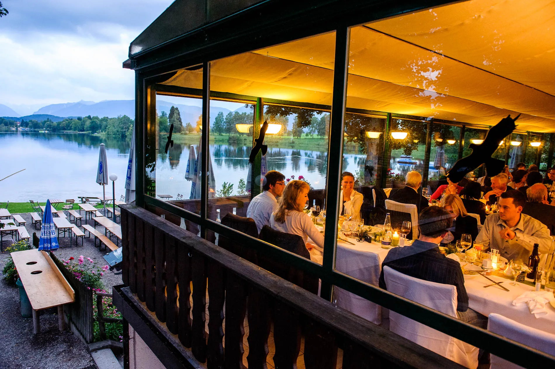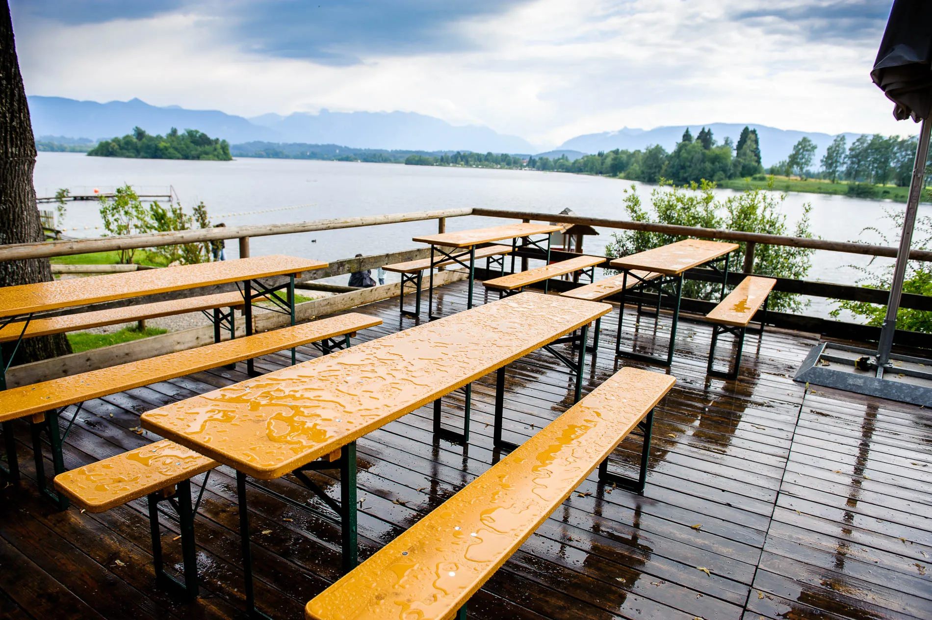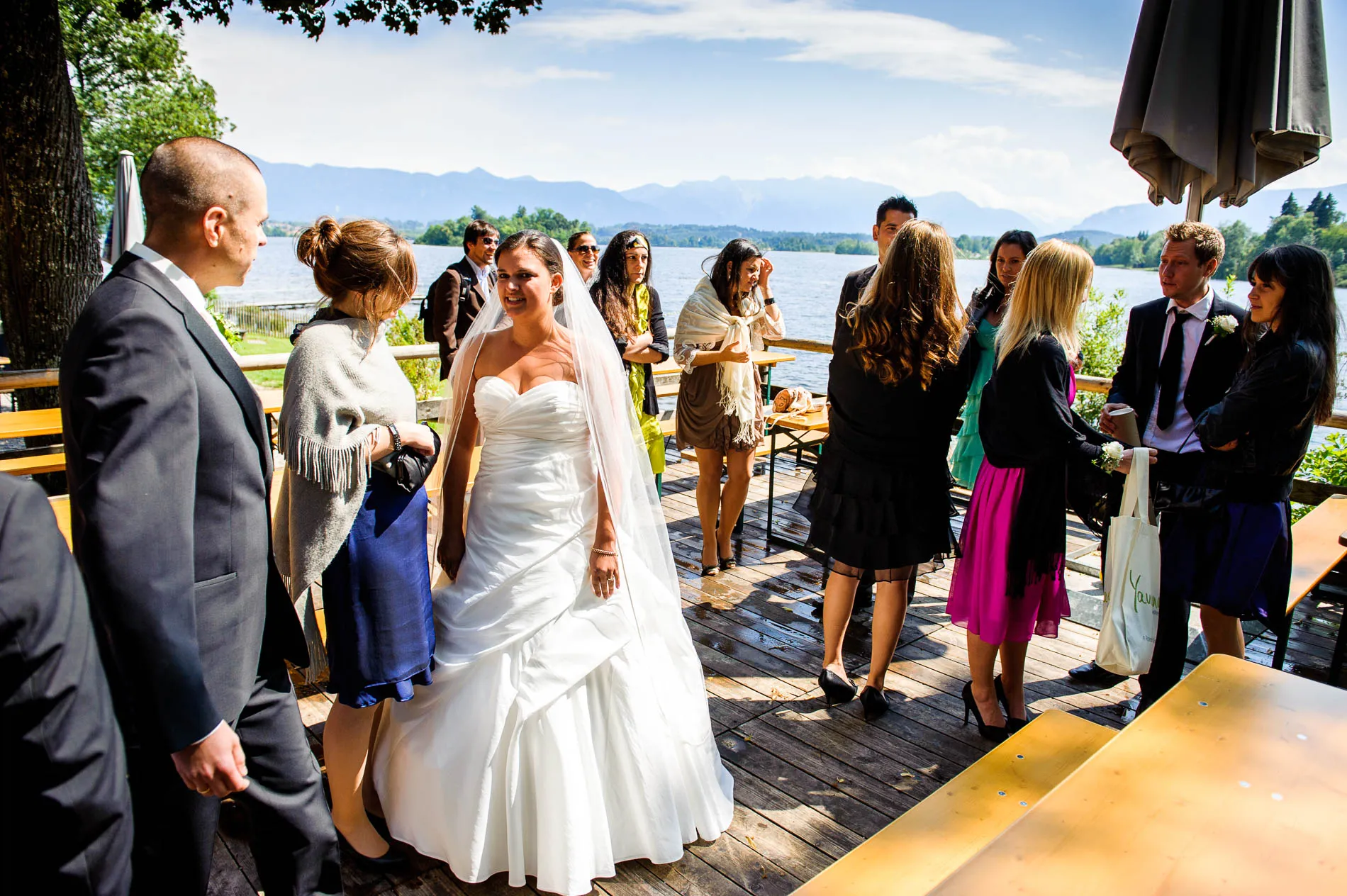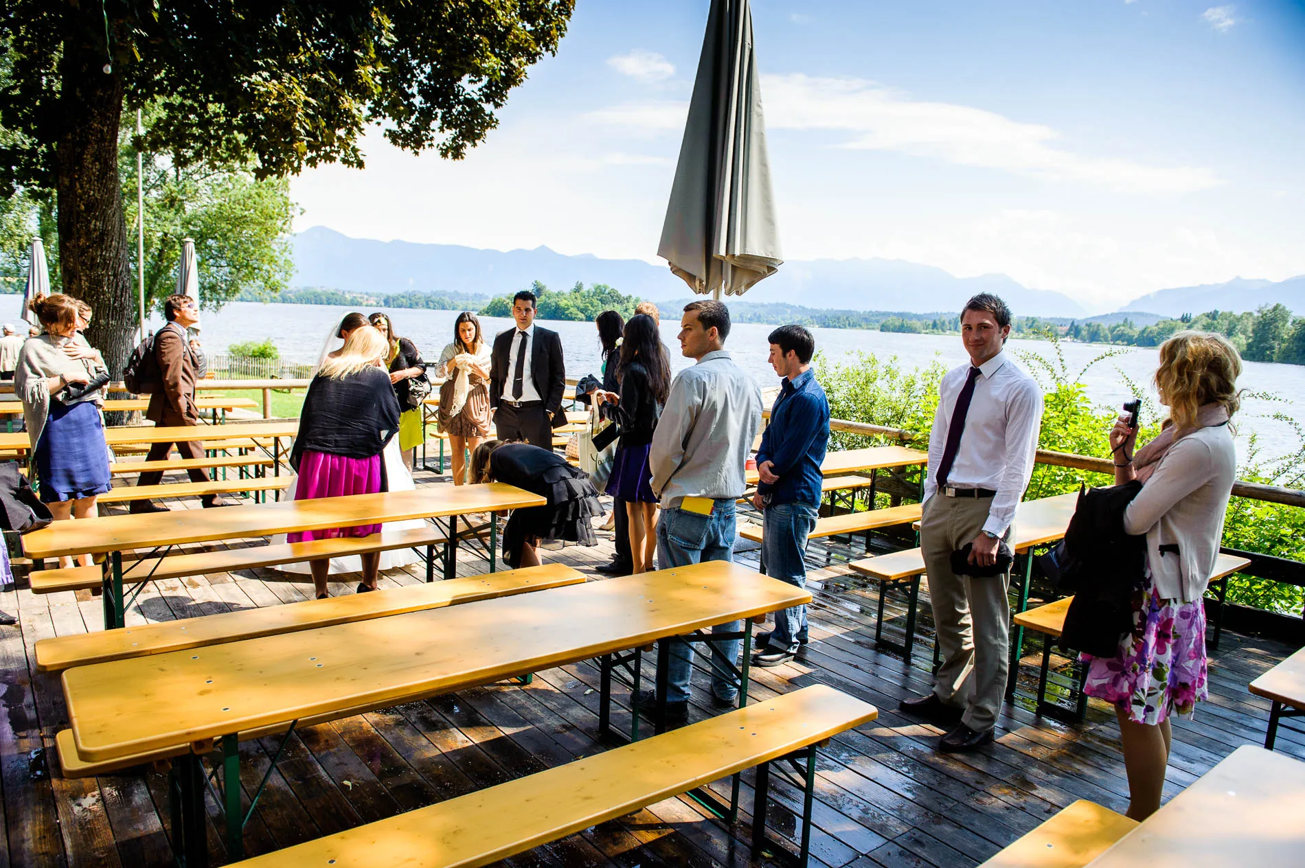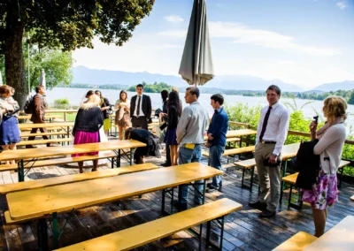 Nach der Zeremonie ging es weiter ins Seerestaurant Alpenblick in Uffing am Staffelsee. Der Name ist hier kein Marketingtrick, sondern Programm: Der Biergarten liegt direkt am Wasser, und so konnten die Gäste beim Sektempfang nicht nur anstoßen, sondern auch den Blick über den See schweifen lassen. Das Wetter spielte dabei sein eigenes kleines Theaterstück – mal Sonne, mal Wolkenbruch. Für die Gäste bedeutete das: Gläser hoch, Schirme auf, und wieder Gläser hoch. Für mich als Hochzeitsfotograf war es ein Geschenk, denn dramatisches Licht sorgt für Bilder, die man nicht inszenieren kann.