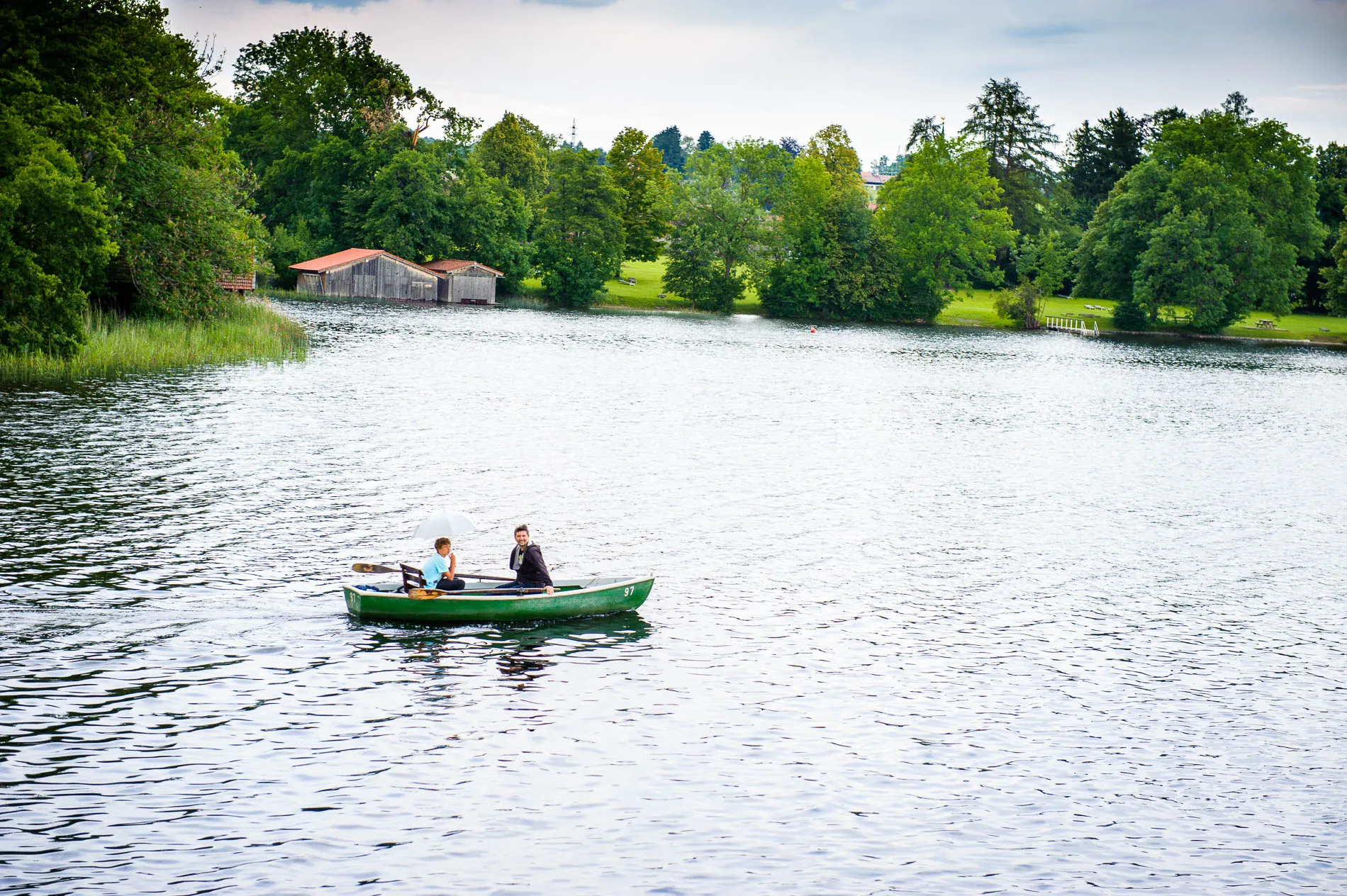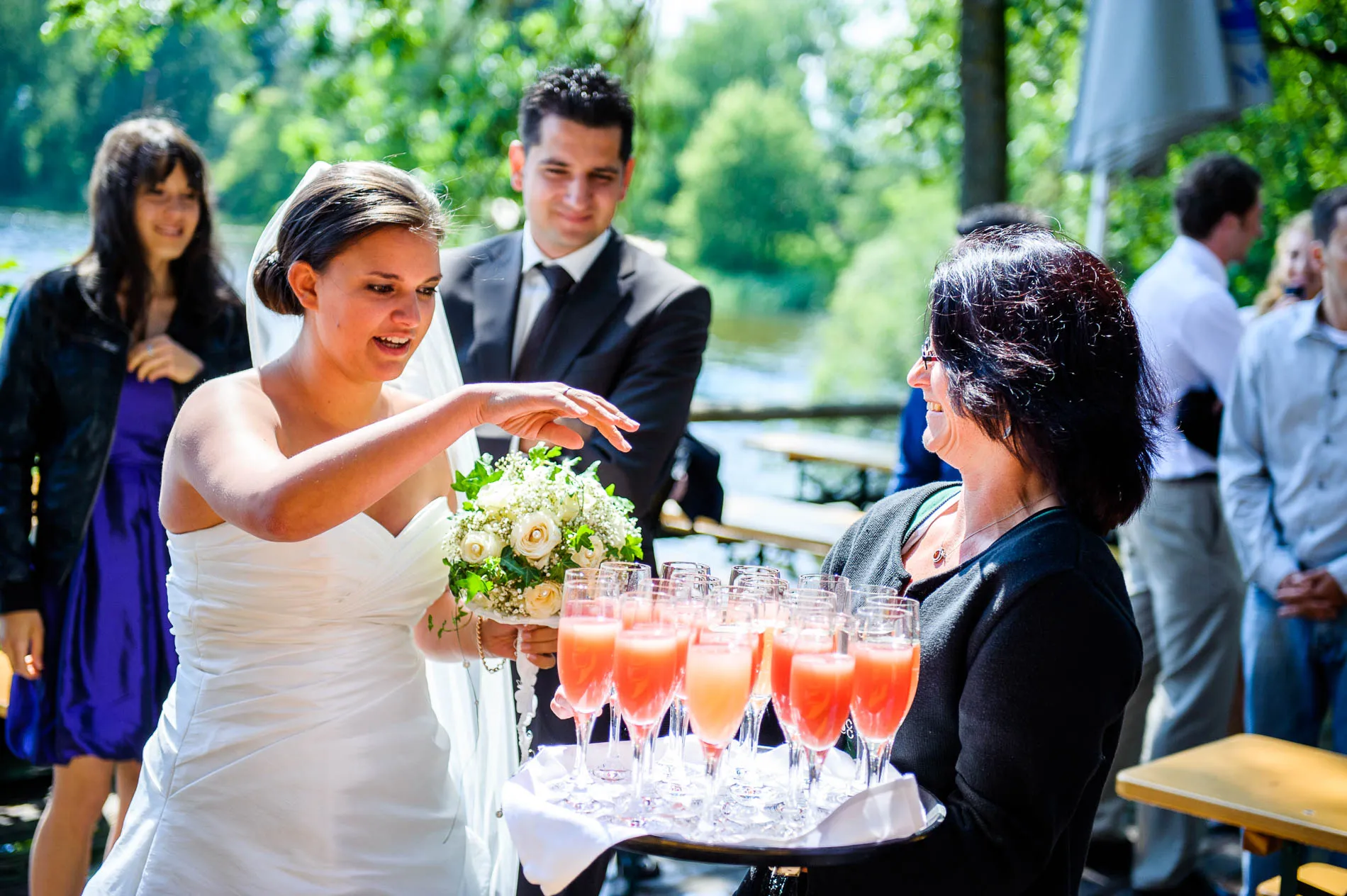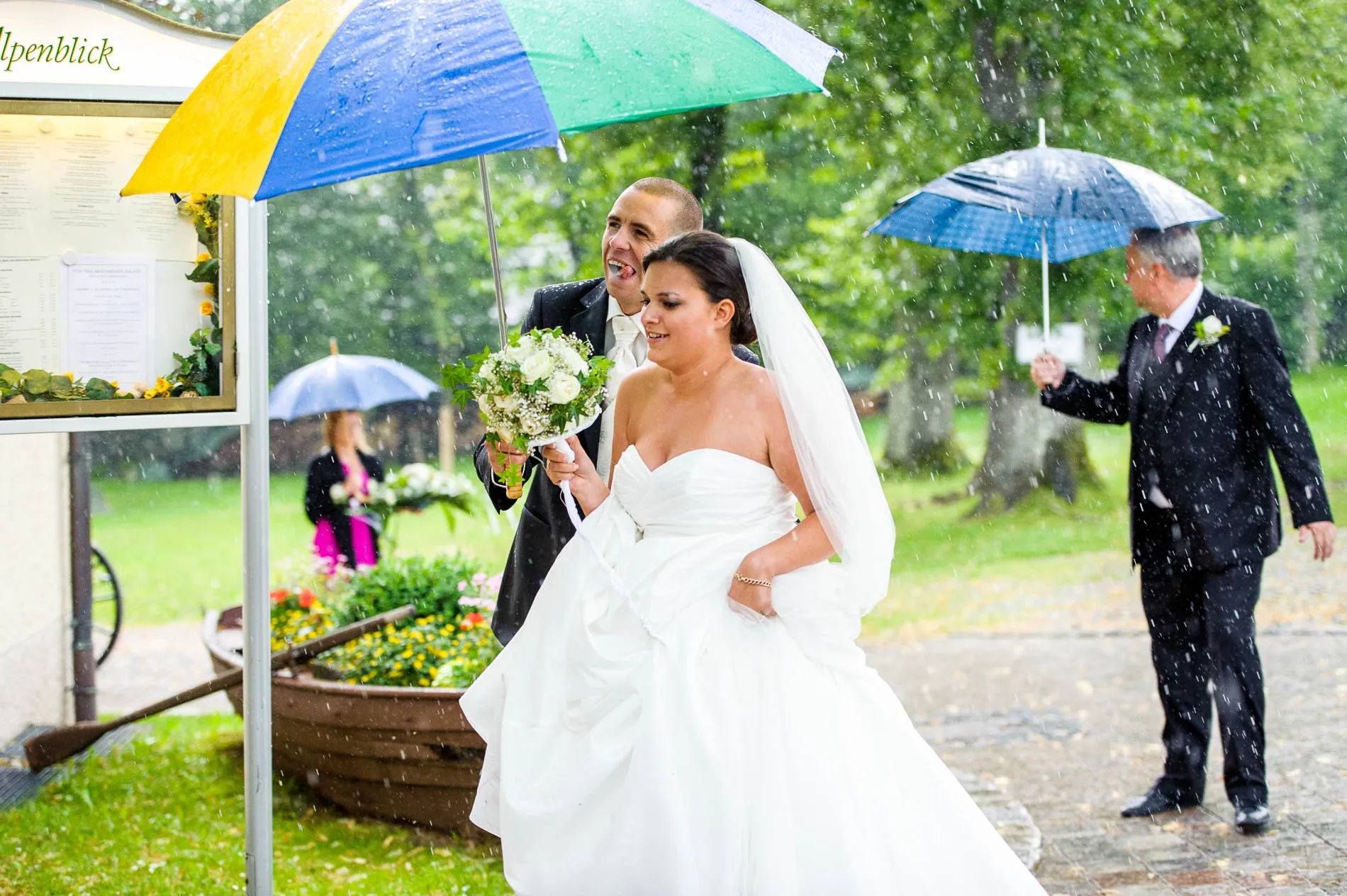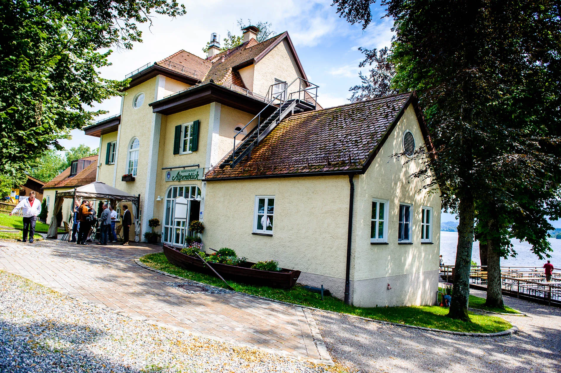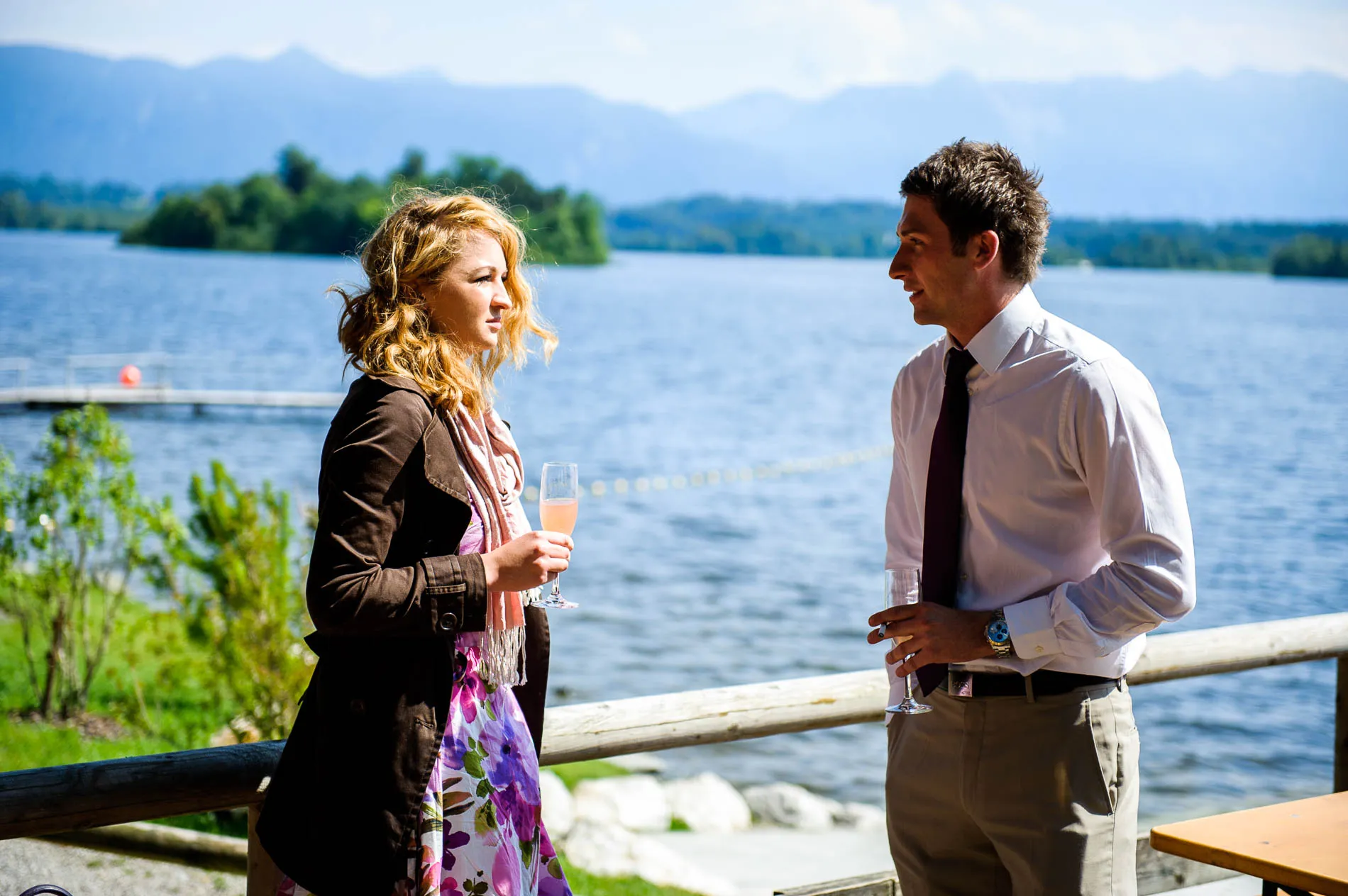 Nach der Zeremonie ging es weiter ins Seerestaurant Alpenblick in Uffing am Staffelsee. Der Name ist hier kein Marketingtrick, sondern Programm: Der Biergarten liegt direkt am Wasser, und so konnten die Gäste beim Sektempfang nicht nur anstoßen, sondern auch den Blick über den See schweifen lassen. Das Wetter spielte dabei sein eigenes kleines Theaterstück – mal Sonne, mal Wolkenbruch. Für die Gäste bedeutete das: Gläser hoch, Schirme auf, und wieder Gläser hoch. Für mich als Hochzeitsfotograf war es ein Geschenk, denn dramatisches Licht sorgt für Bilder, die man nicht inszenieren kann.