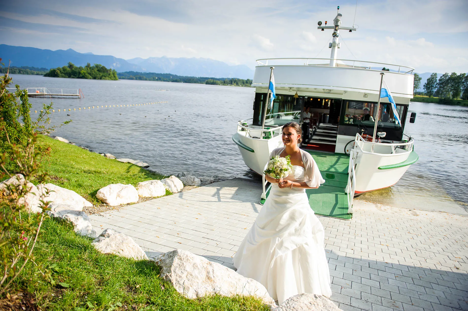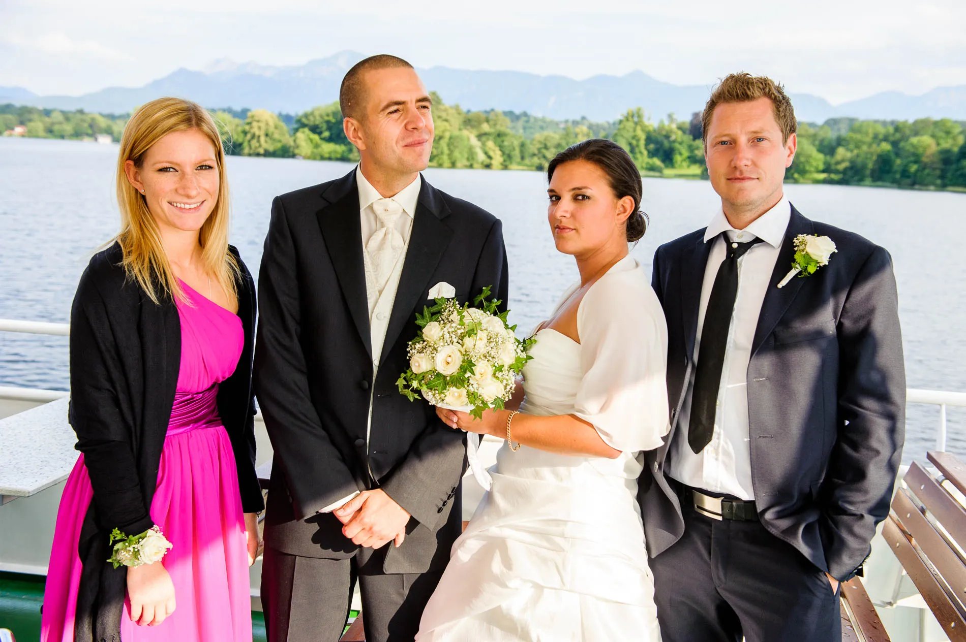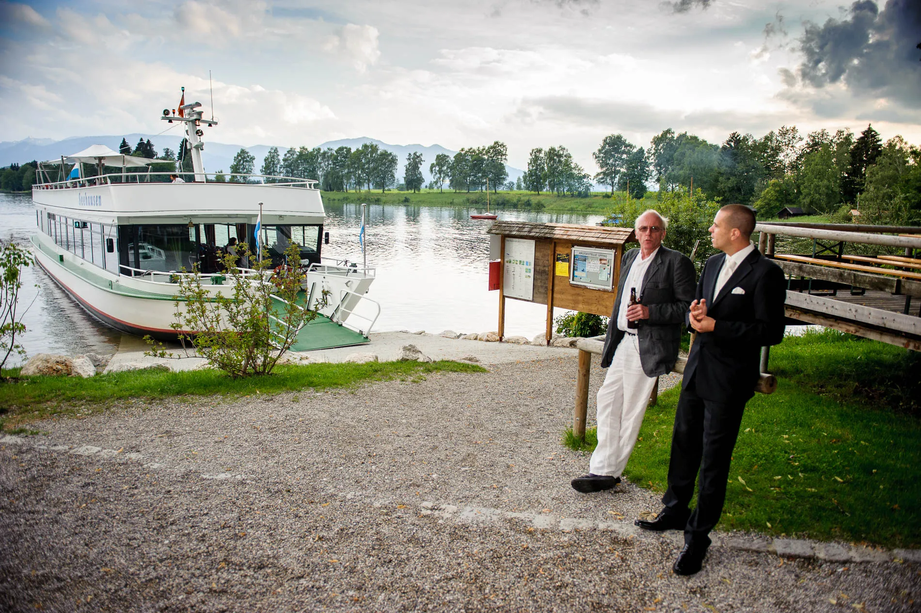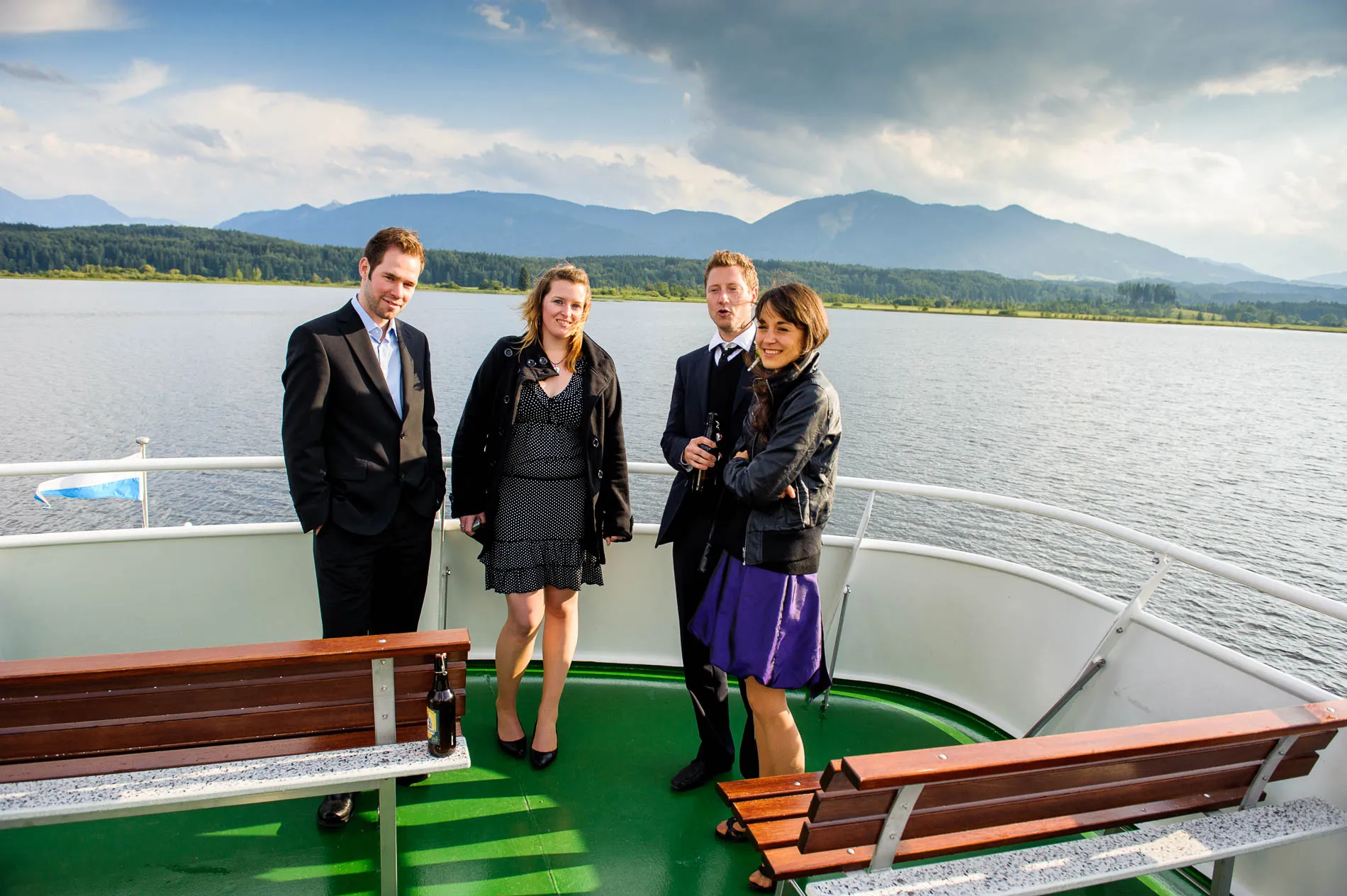 Ein echtes Highlight war die einstündige Rundfahrt mit dem Schiff. Der Staffelsee, mit seinen sieben Inseln und dem Panorama des Wetterstein-Gebirges, gehört zu den schönsten Seen Bayerns – und das sage ich nicht nur, weil ich als Hochzeitsfotograf am Staffelsee schon viele Male dort gearbeitet habe. Direkt vor dem Restaurant legte das Schiff an, und eine Ein-Mann-Band sorgte an Bord für musikalische Begleitung. Später am Abend spielte er auch im Restaurant weiter – ein Musiker, der offensichtlich keine Angst vor Überstunden hatte.