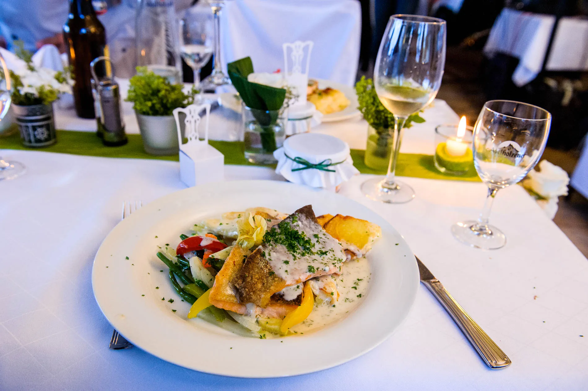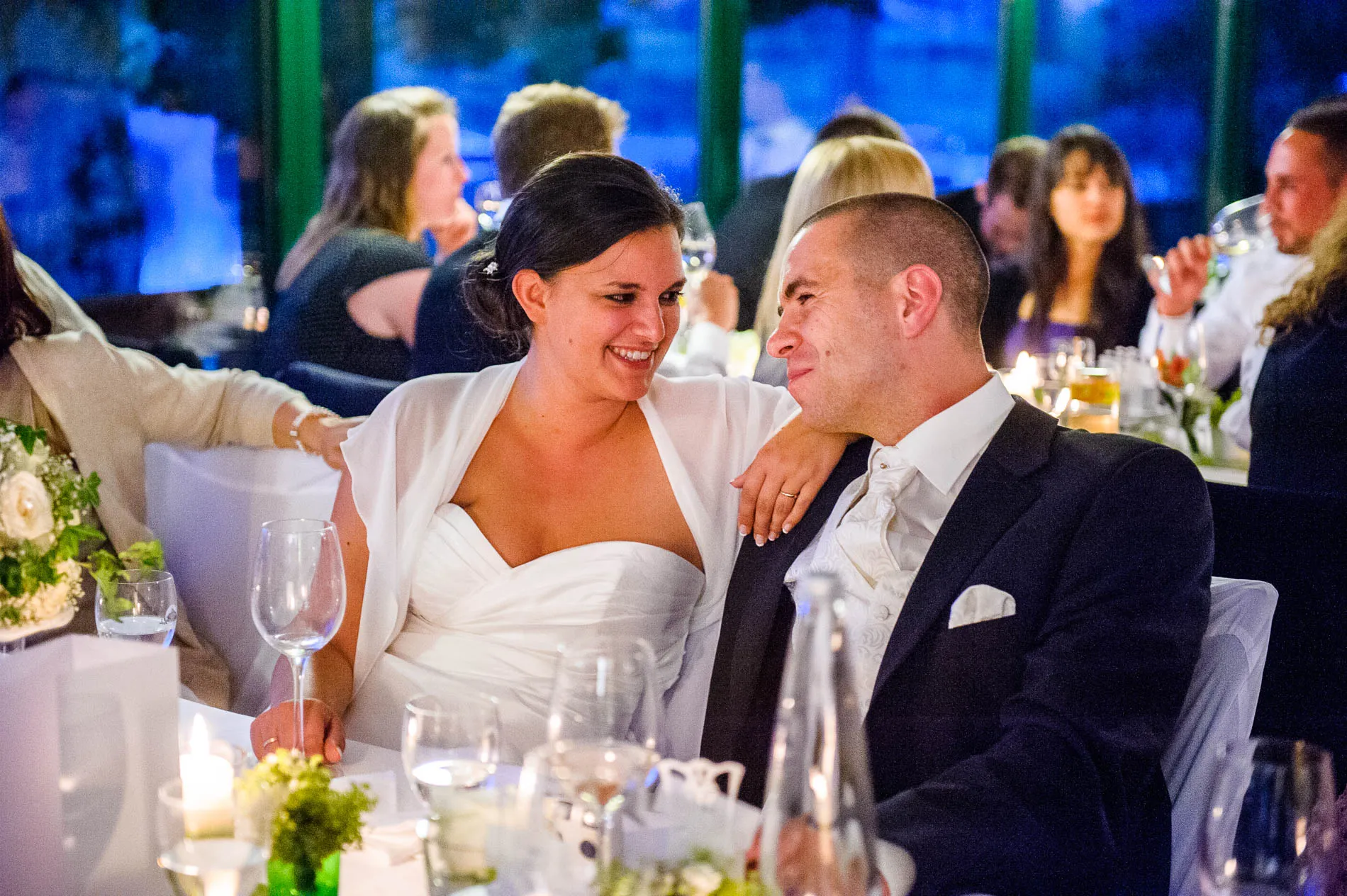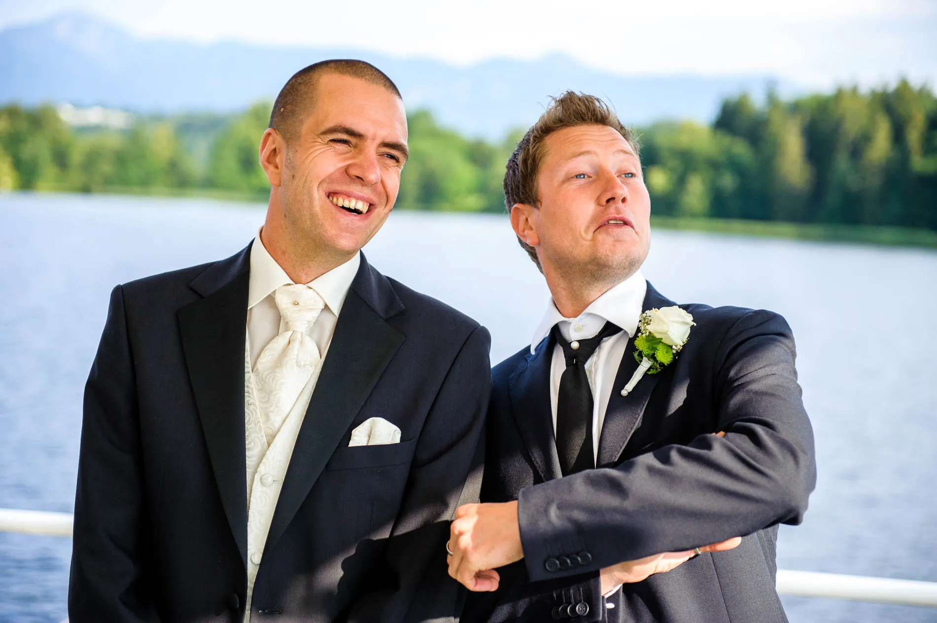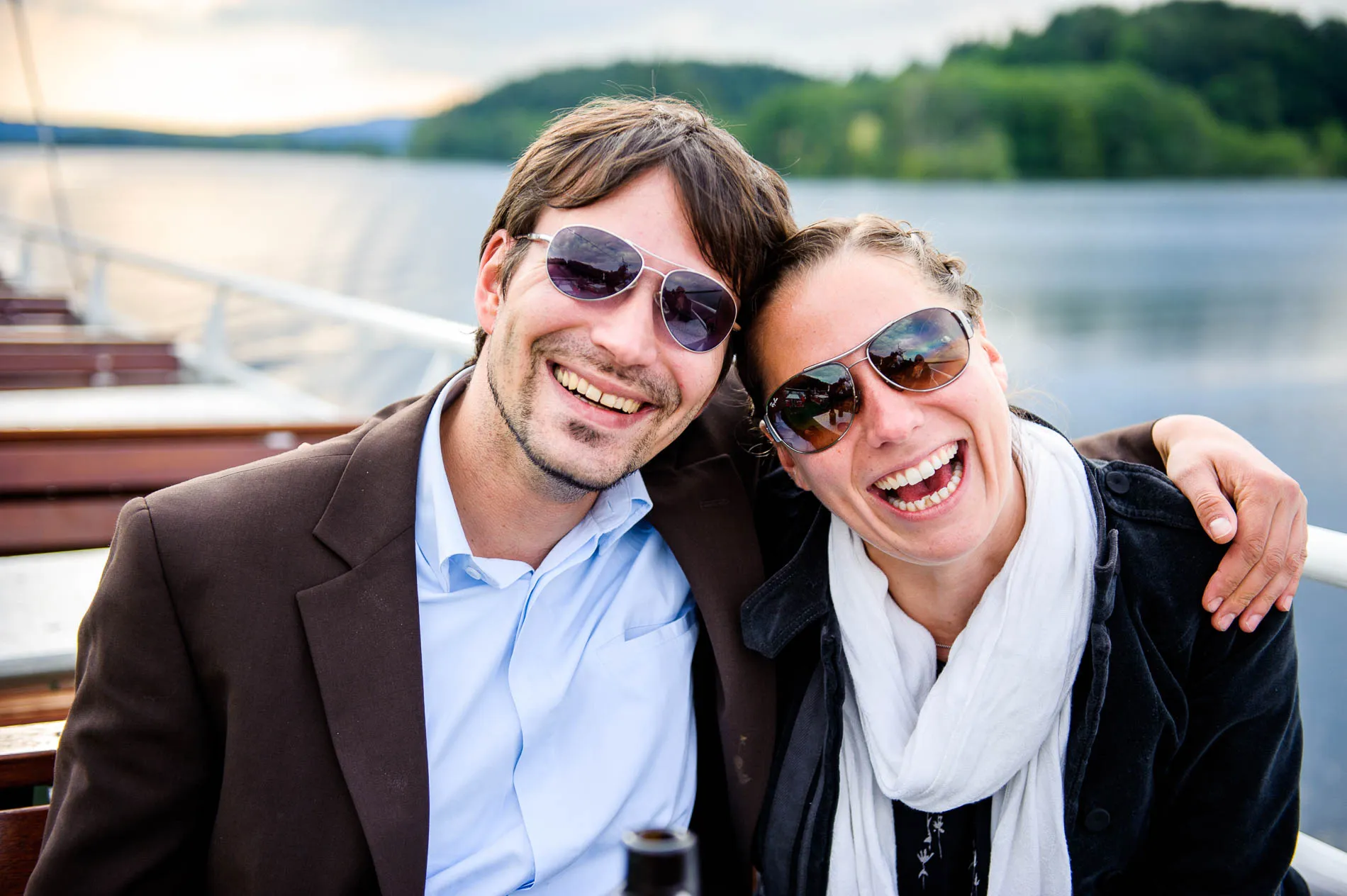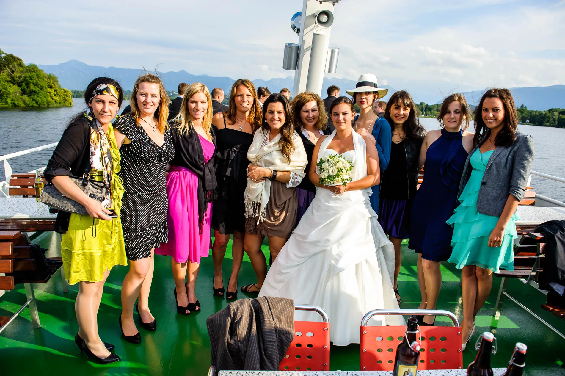 Ein echtes Highlight war die einstündige Rundfahrt mit dem Schiff. Der Staffelsee, mit seinen sieben Inseln und dem Panorama des Wetterstein-Gebirges, gehört zu den schönsten Seen Bayerns – und das sage ich nicht nur, weil ich als Hochzeitsfotograf am Staffelsee schon viele Male dort gearbeitet habe. Direkt vor dem Restaurant legte das Schiff an, und eine Ein-Mann-Band sorgte an Bord für musikalische Begleitung. Später am Abend spielte er auch im Restaurant weiter – ein Musiker, der offensichtlich keine Angst vor Überstunden hatte.