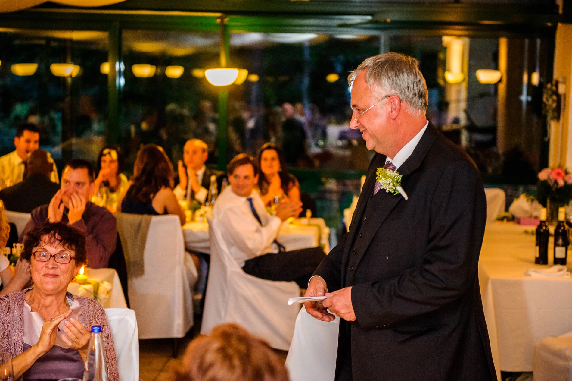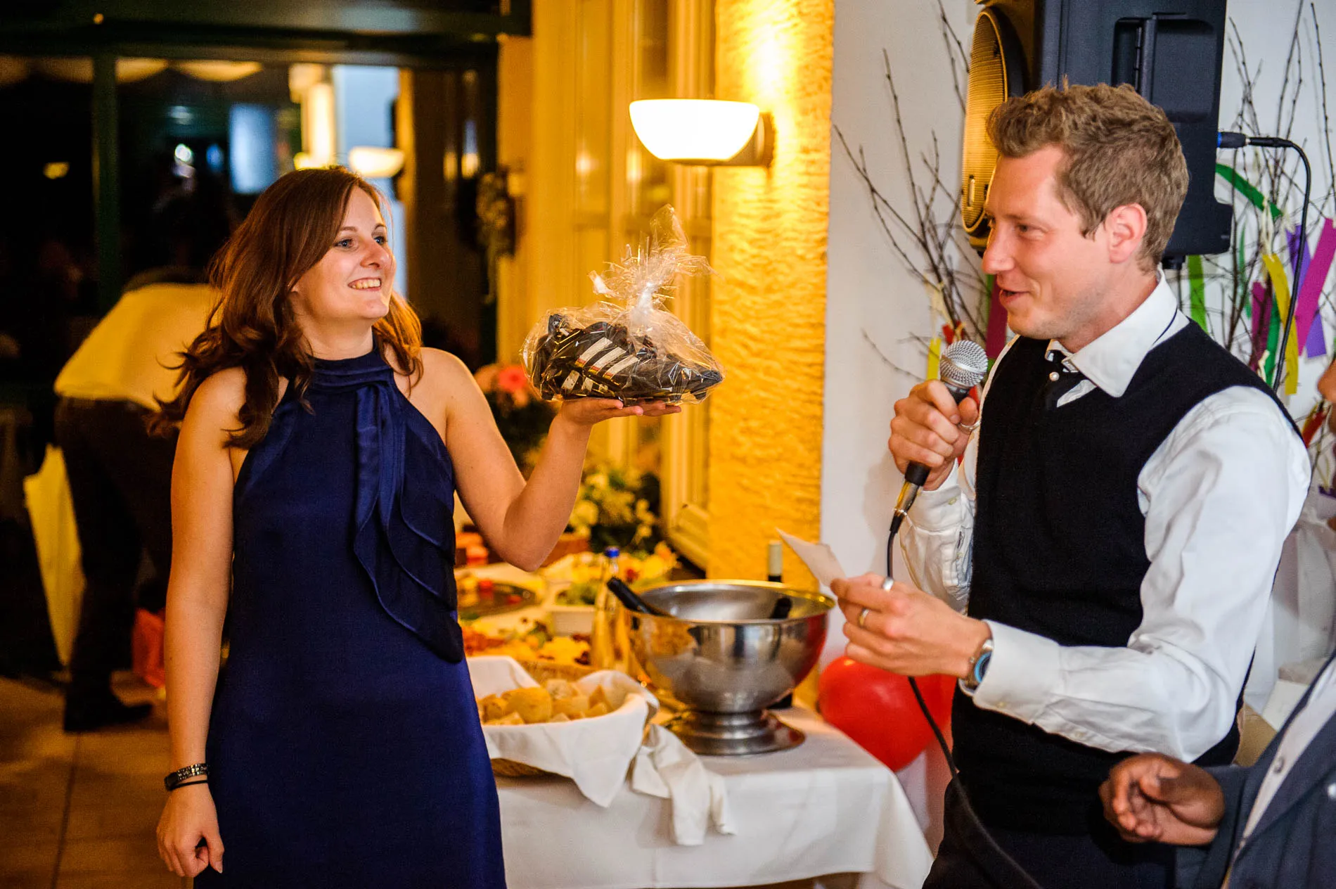 Nach dem Abendessen folgte der traditionelle Brautstraußwurf. Inzwischen war es dunkel geworden, was der Spannung keinen Abbruch tat. Im Gegenteil: Die Kombination aus Abendlicht, Musik und ausgelassener Stimmung machte diesen Moment zu einem würdigen Abschluss eines Tages, der wettertechnisch zwar launisch war, aber fotografisch umso reizvoller.