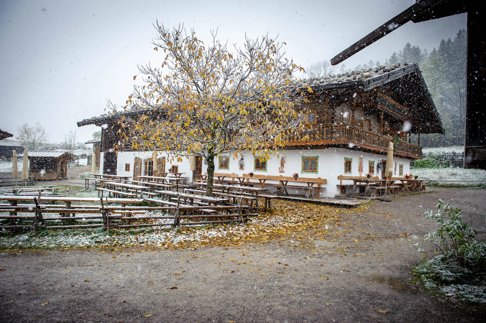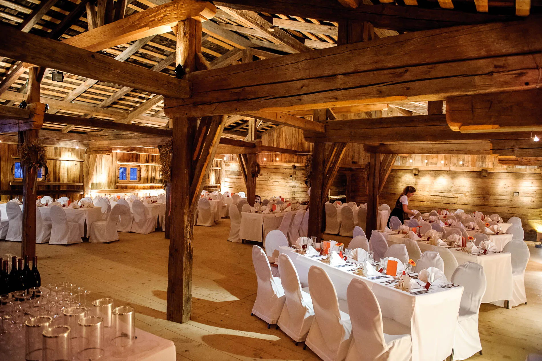 Das Herzstück des Museums ist der größte Hof, der „Wofen“. Hier befindet sich ein uriges Wirtshaus und eine große Holz-Tenne, die Platz für bis zu 150 Gäste bietet. Die Tenne lässt sich individuell dekorieren, ist beheizbar und technisch bestens ausgestattet – ein klarer Vorteil, wenn man in Oberbayern heiratet, wo das Wetter bekanntlich seine eigenen Pläne hat.