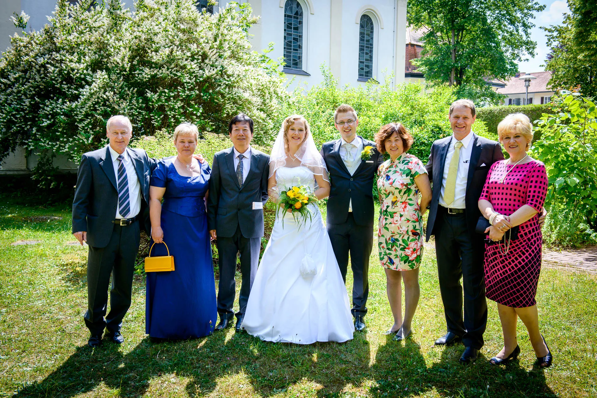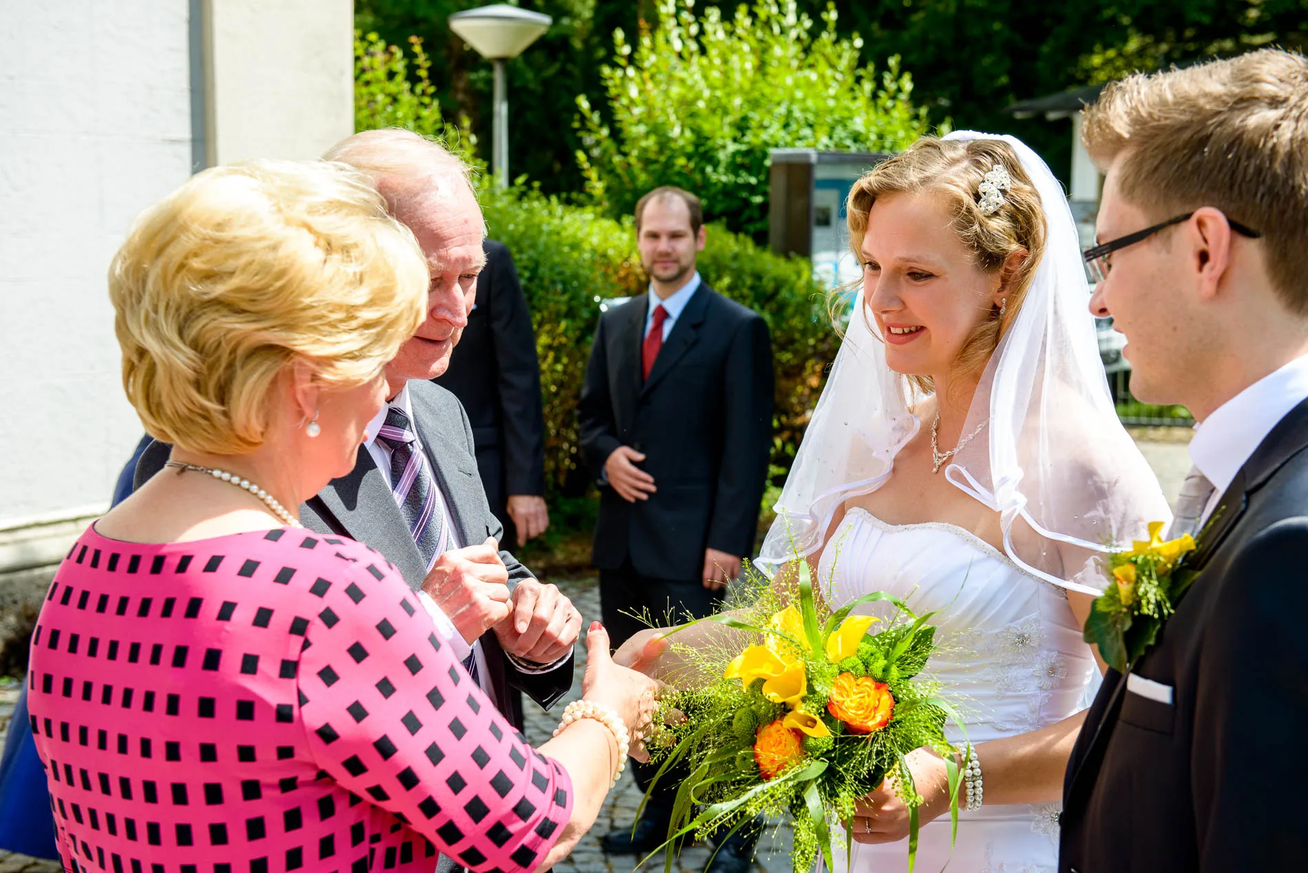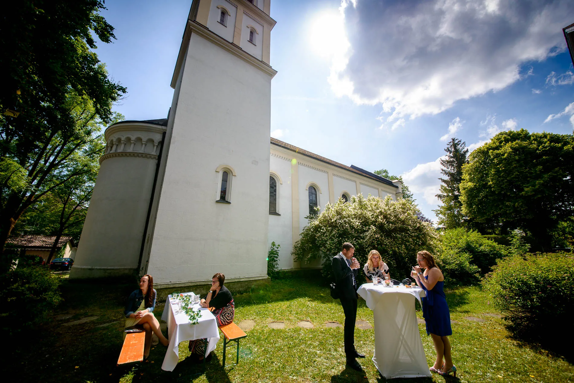 Direkt hinter der Kirche fand ein kleiner Empfang statt. Getränke, Häppchen und die ersten Glückwünsche – dazu ein paar spontane Gruppenfotos, die mehr über die Stimmung verrieten als jede Rede. Manchmal reicht eine kleine Grünfläche, um große Freude festzuhalten.