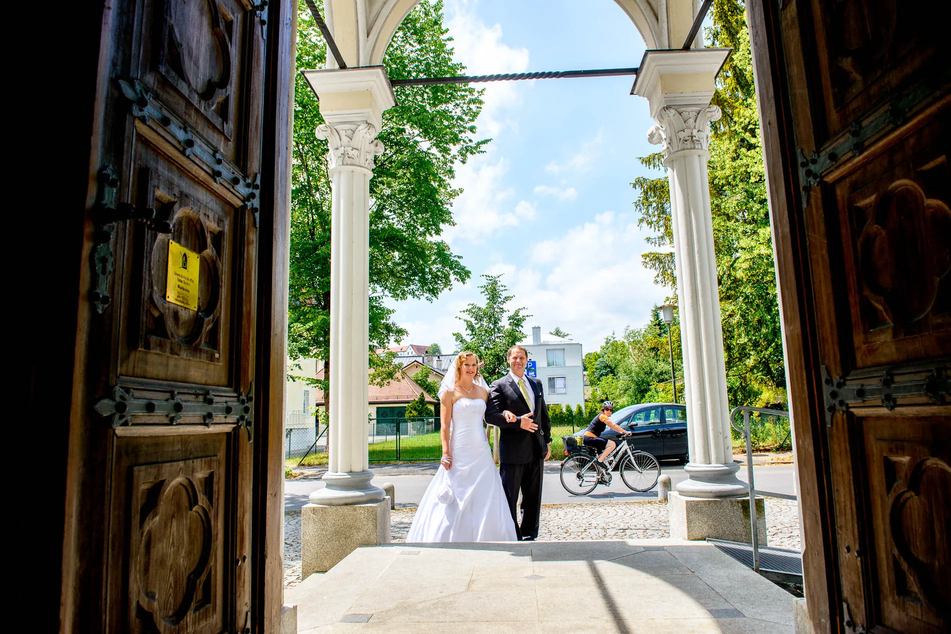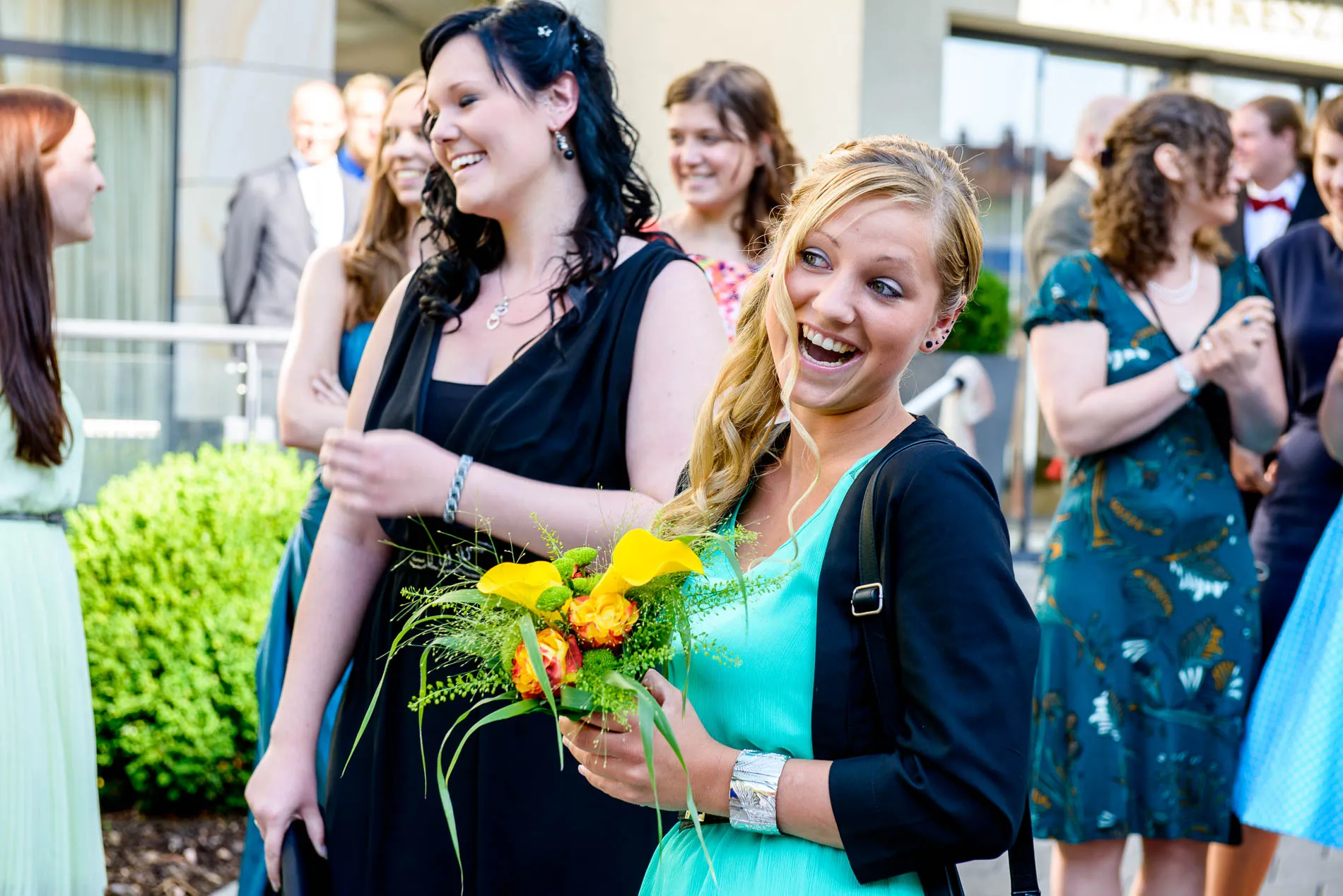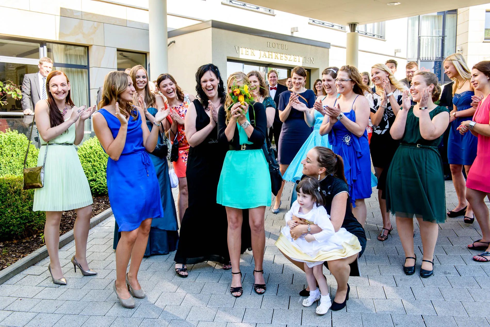 Direkt hinter der Kirche fand ein kleiner Empfang statt. Getränke, Häppchen und die ersten Glückwünsche – dazu ein paar spontane Gruppenfotos, die mehr über die Stimmung verrieten als jede Rede. Manchmal reicht eine kleine Grünfläche, um große Freude festzuhalten.