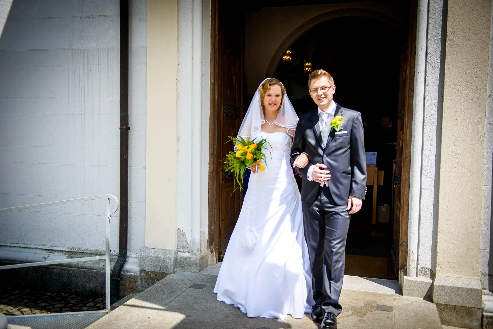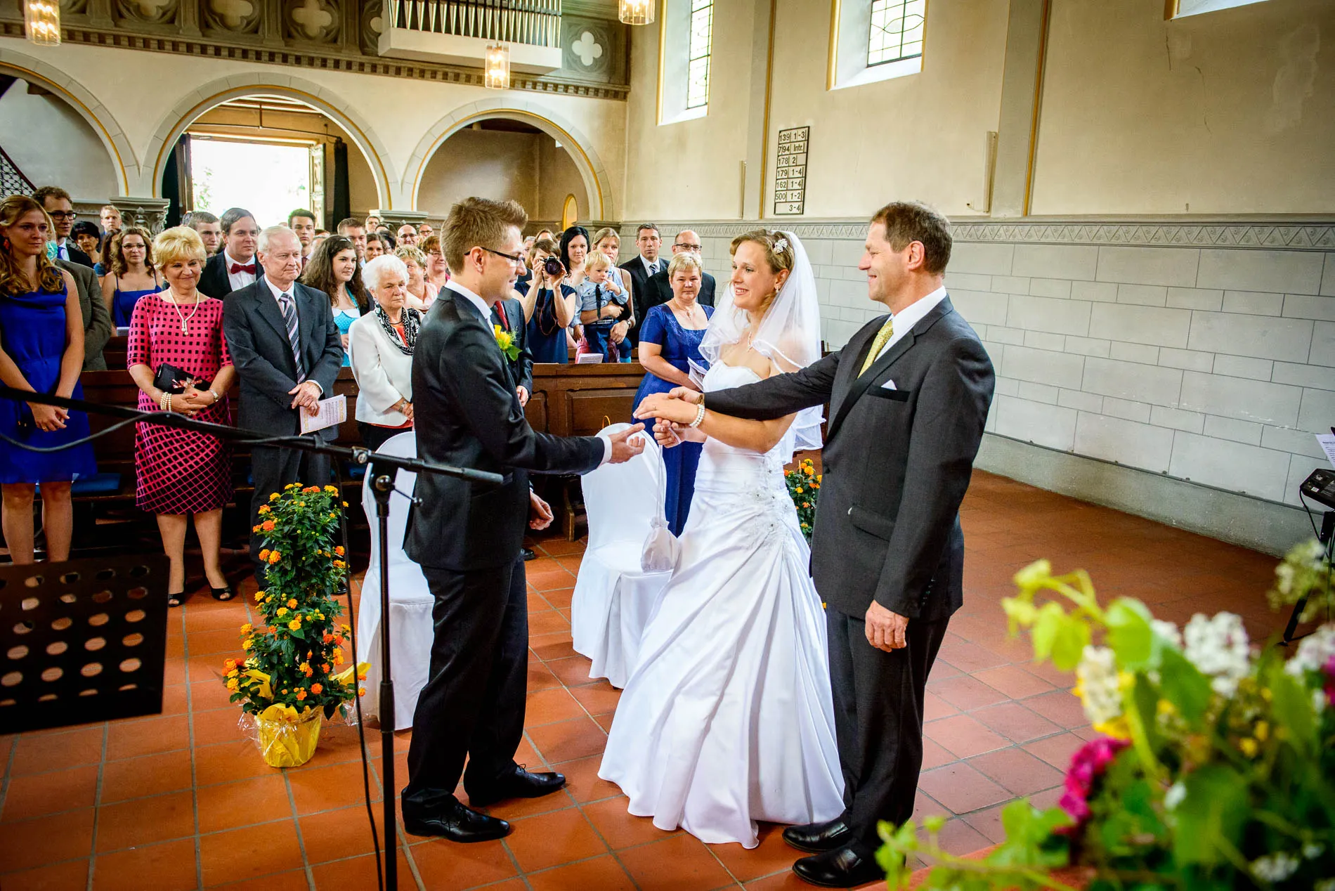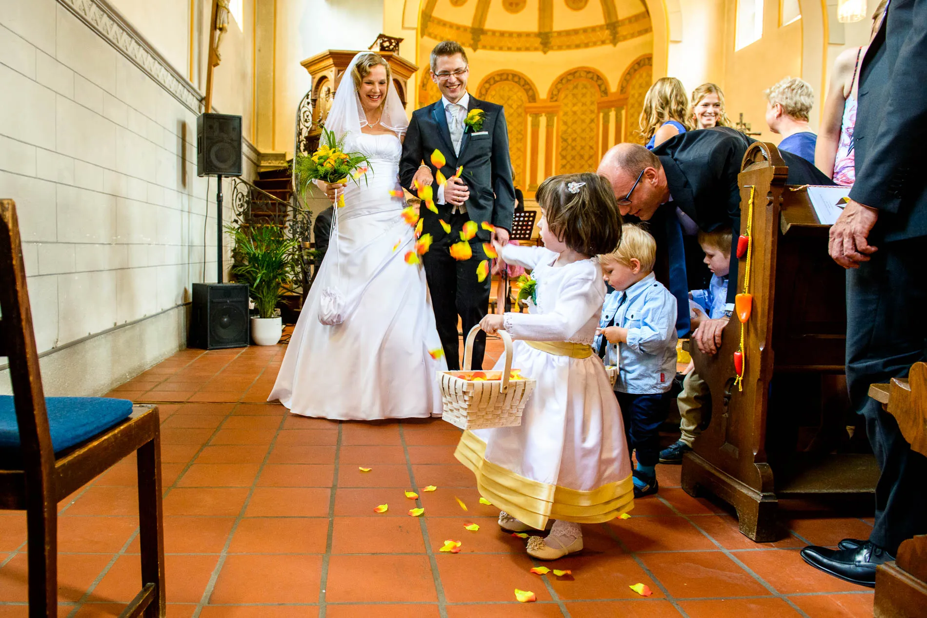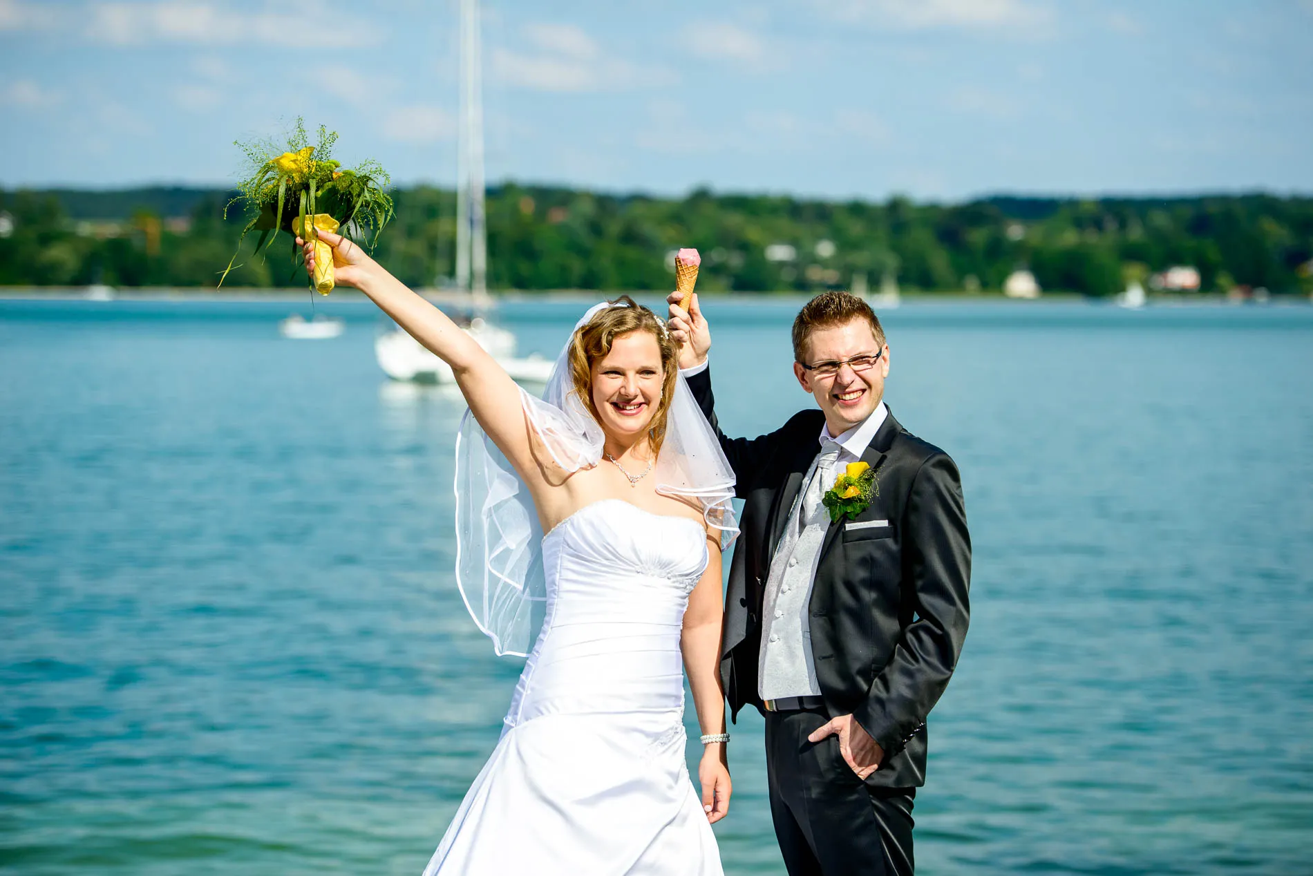 Es war einer dieser Tage, an denen der Starnberger See in der Sonne glitzert, als hätte er sich extra für das Brautpaar in Schale geworfen. Die Hochzeit begann in der evangelischen Friedenskirche – ein klassischer Ort mit viel Charme. Die Braut wurde vom Vater zum Altar geführt, wo der Bräutigam bereits wartete. Brautjungfern in strahlendem Blau sorgten für einen herrlichen Kontrast zum sonnengelben Brautstrauß. Ein kleiner Junge brachte das Ringkissen, und beim Auszug streuten Kinder gelbe Blüten – ein Bild, das fast zu perfekt war, um nicht fotografiert zu werden.