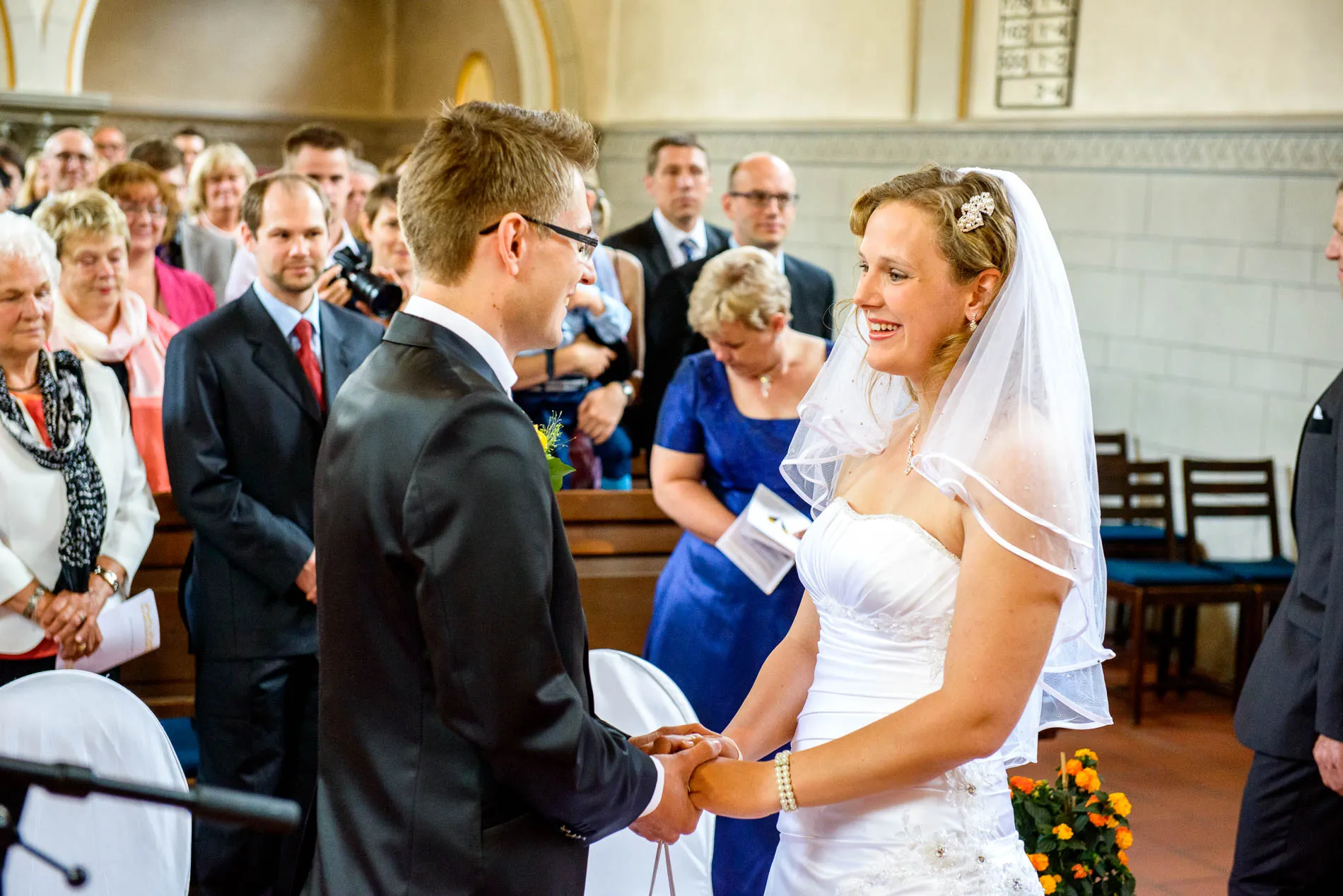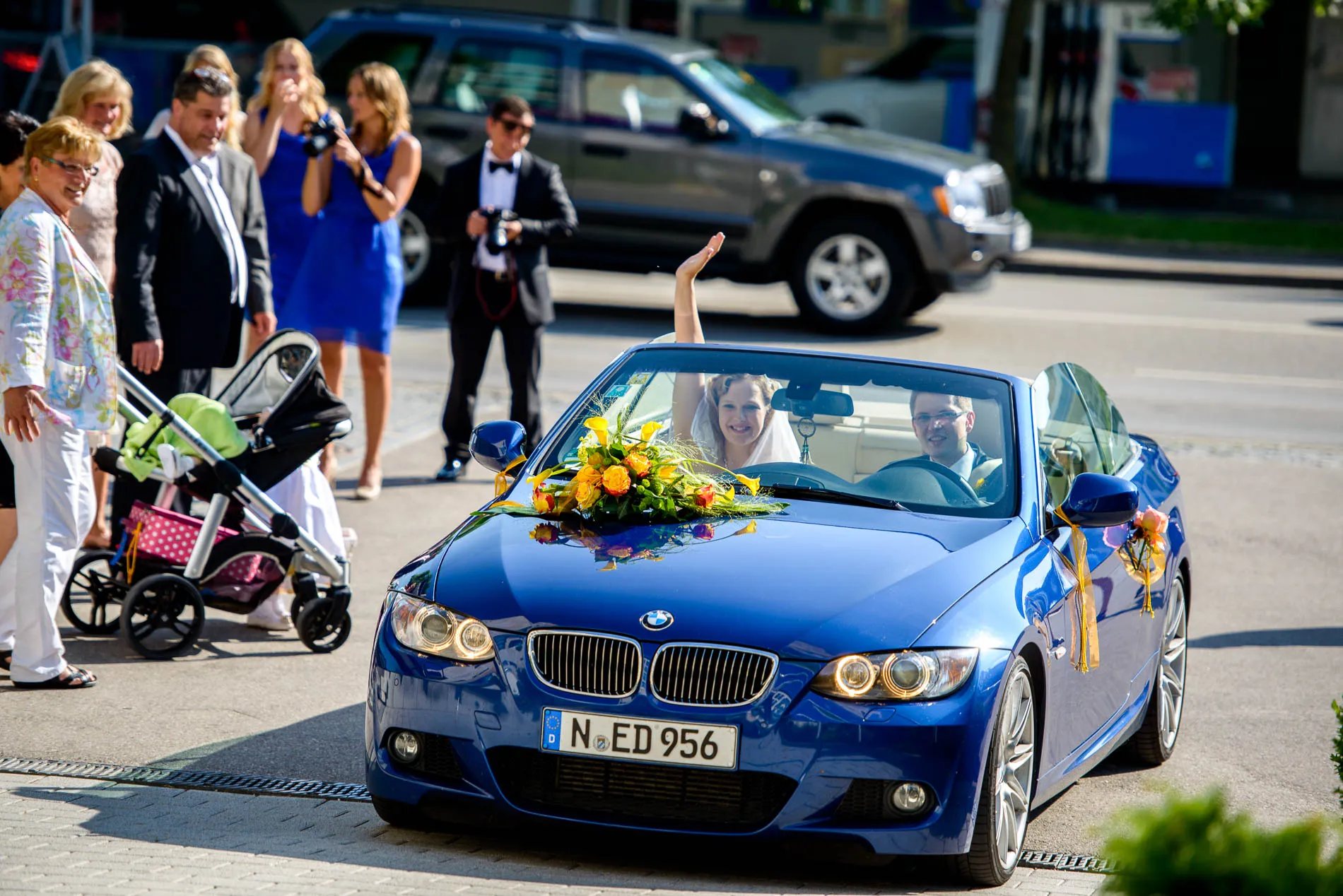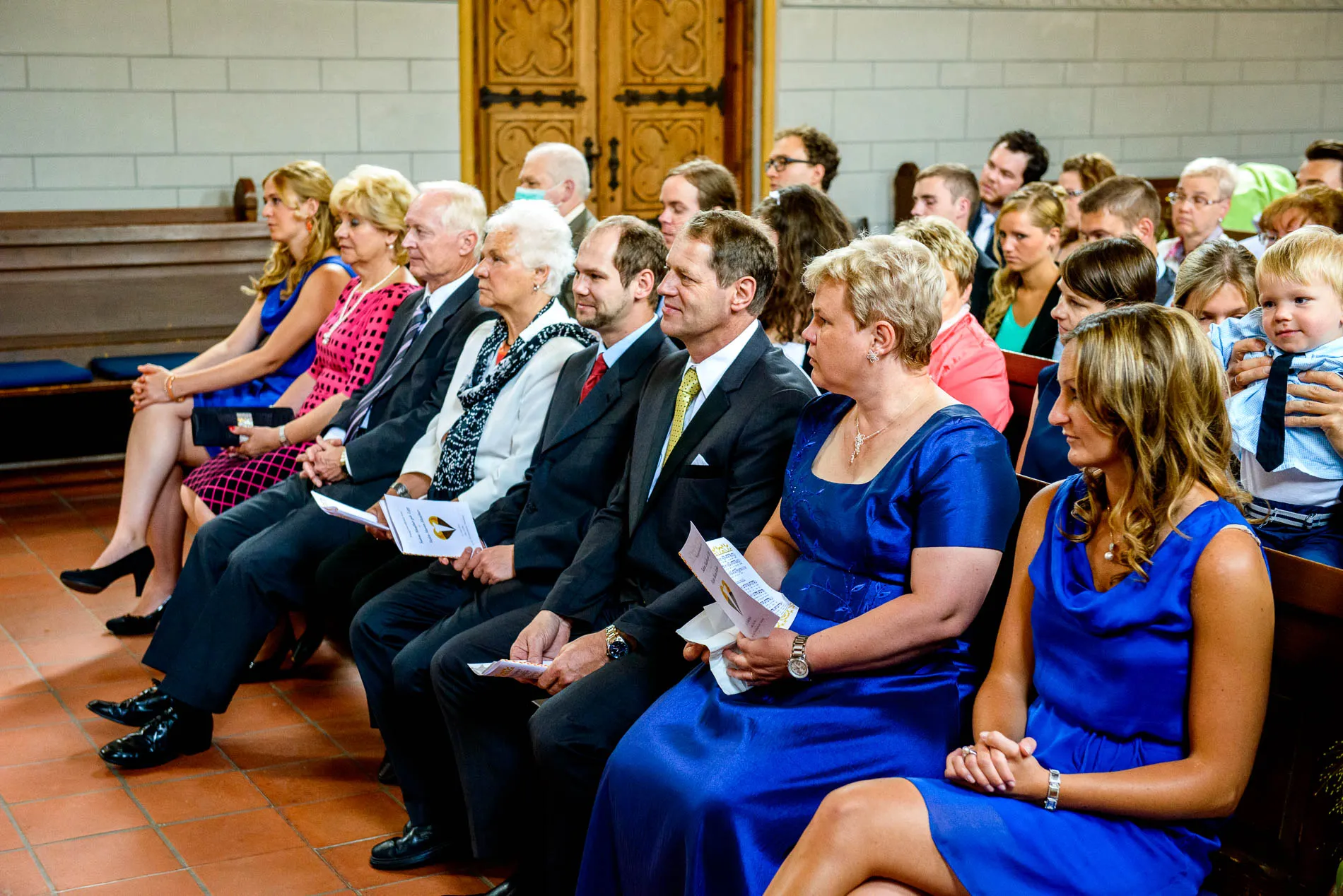 Es war einer dieser Tage, an denen der Starnberger See in der Sonne glitzert, als hätte er sich extra für das Brautpaar in Schale geworfen. Die Hochzeit begann in der evangelischen Friedenskirche – ein klassischer Ort mit viel Charme. Die Braut wurde vom Vater zum Altar geführt, wo der Bräutigam bereits wartete. Brautjungfern in strahlendem Blau sorgten für einen herrlichen Kontrast zum sonnengelben Brautstrauß. Ein kleiner Junge brachte das Ringkissen, und beim Auszug streuten Kinder gelbe Blüten – ein Bild, das fast zu perfekt war, um nicht fotografiert zu werden.