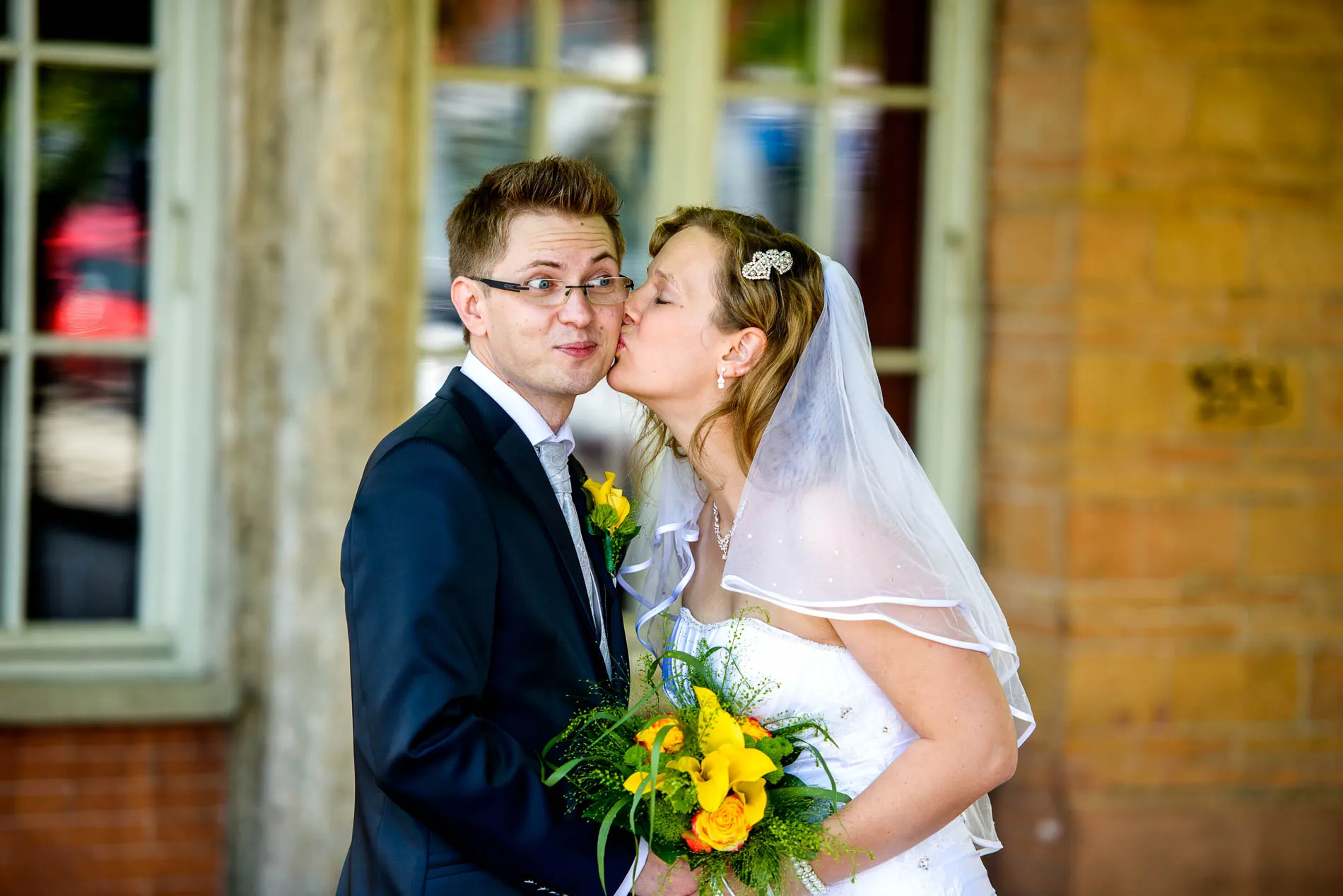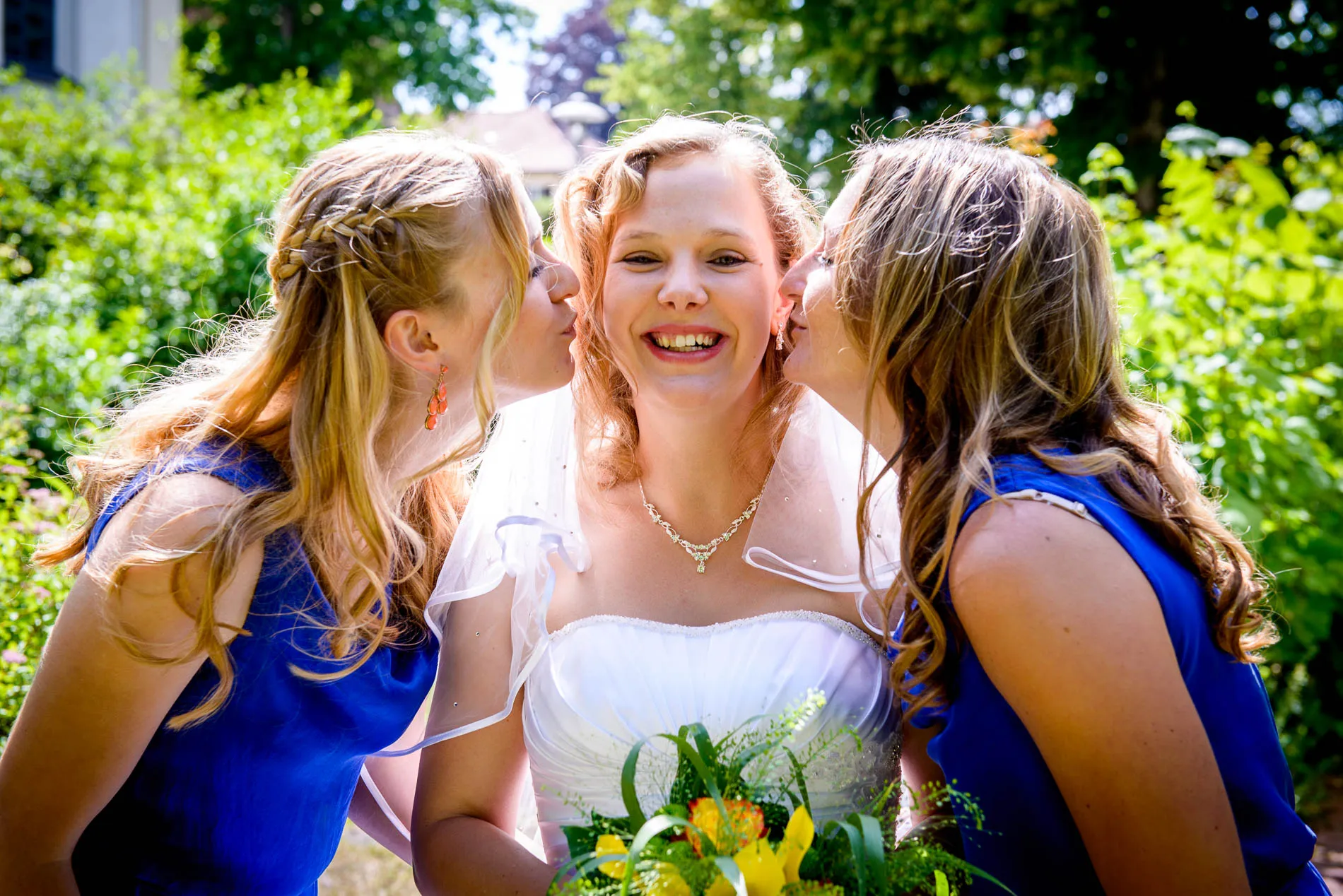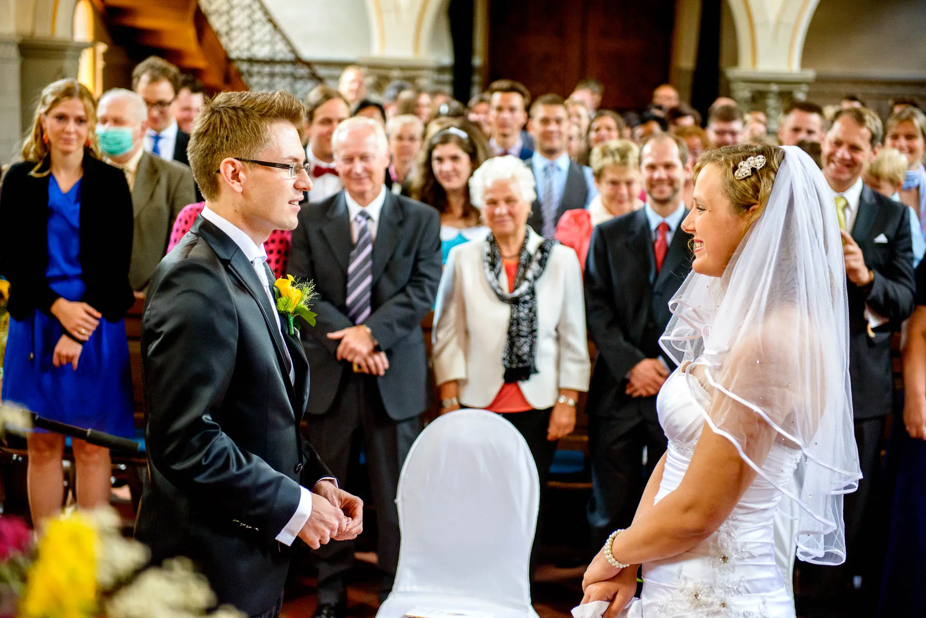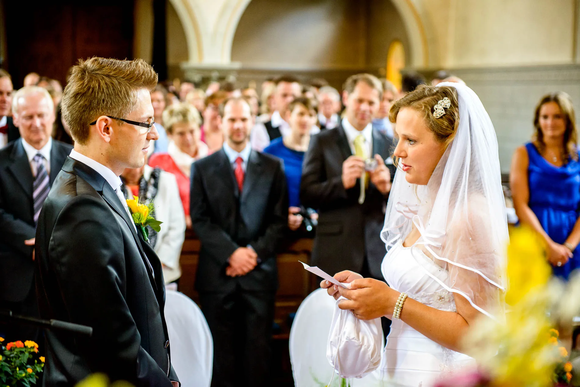 Es war einer dieser Tage, an denen der Starnberger See in der Sonne glitzert, als hätte er sich extra für das Brautpaar in Schale geworfen. Die Hochzeit begann in der evangelischen Friedenskirche – ein klassischer Ort mit viel Charme. Die Braut wurde vom Vater zum Altar geführt, wo der Bräutigam bereits wartete. Brautjungfern in strahlendem Blau sorgten für einen herrlichen Kontrast zum sonnengelben Brautstrauß. Ein kleiner Junge brachte das Ringkissen, und beim Auszug streuten Kinder gelbe Blüten – ein Bild, das fast zu perfekt war, um nicht fotografiert zu werden.