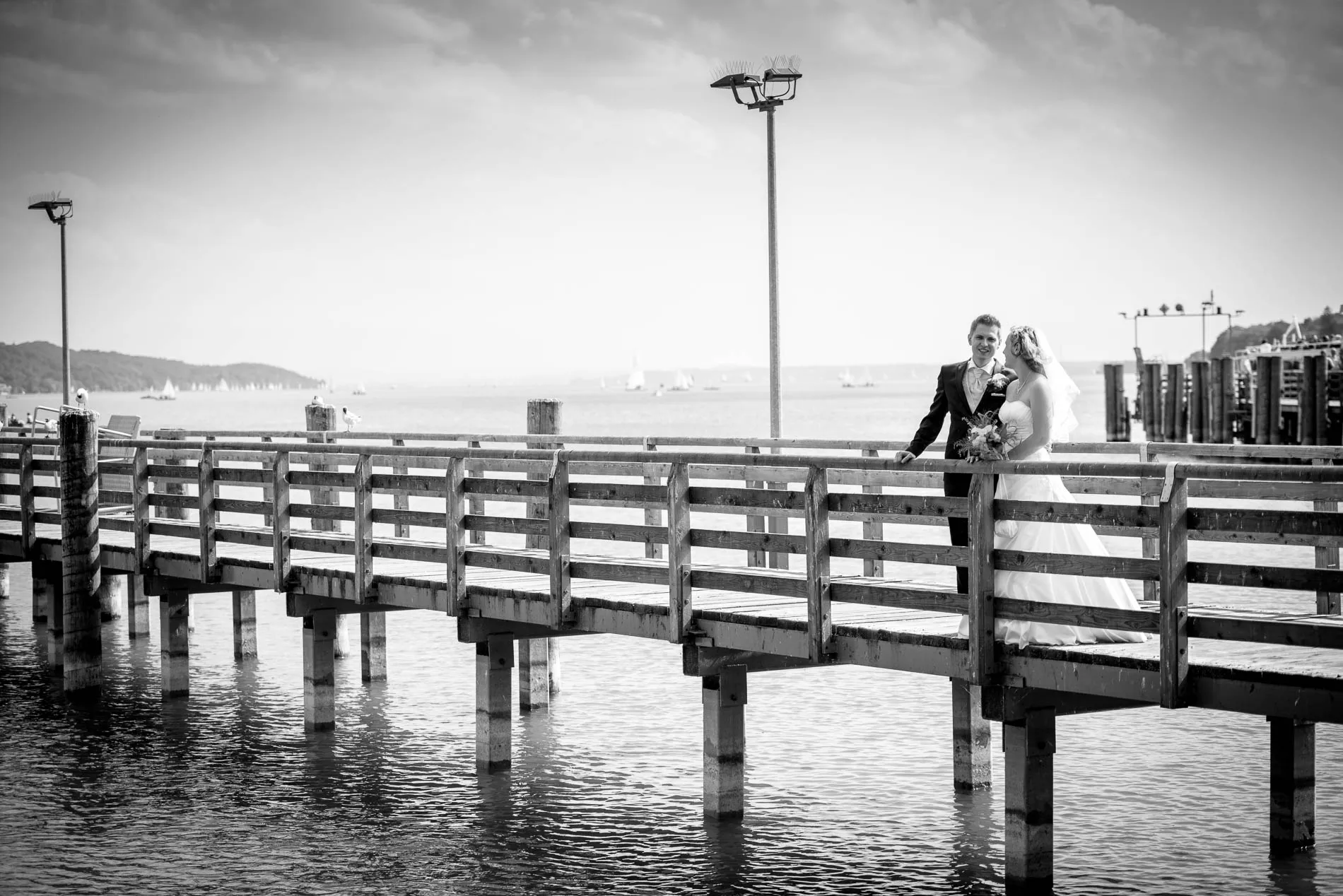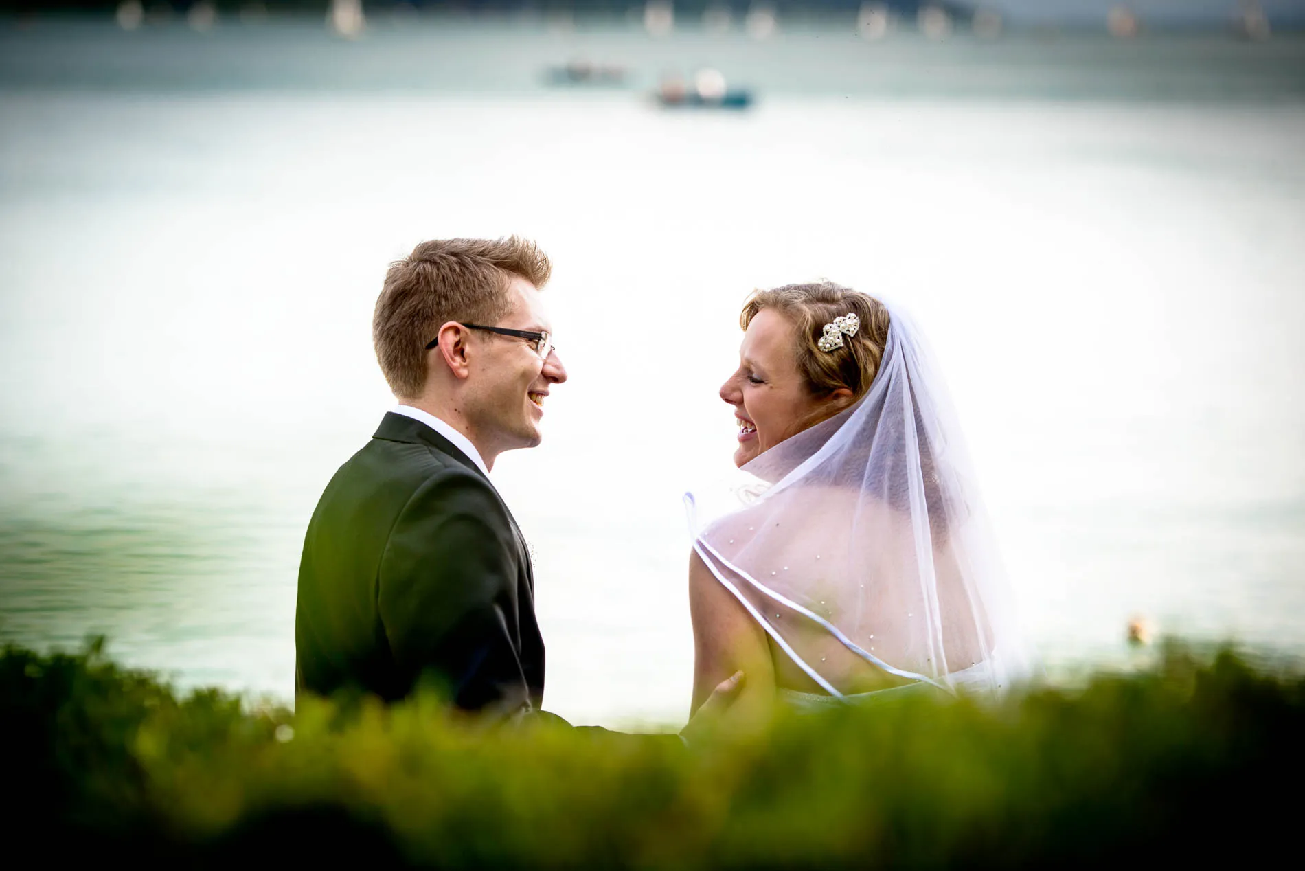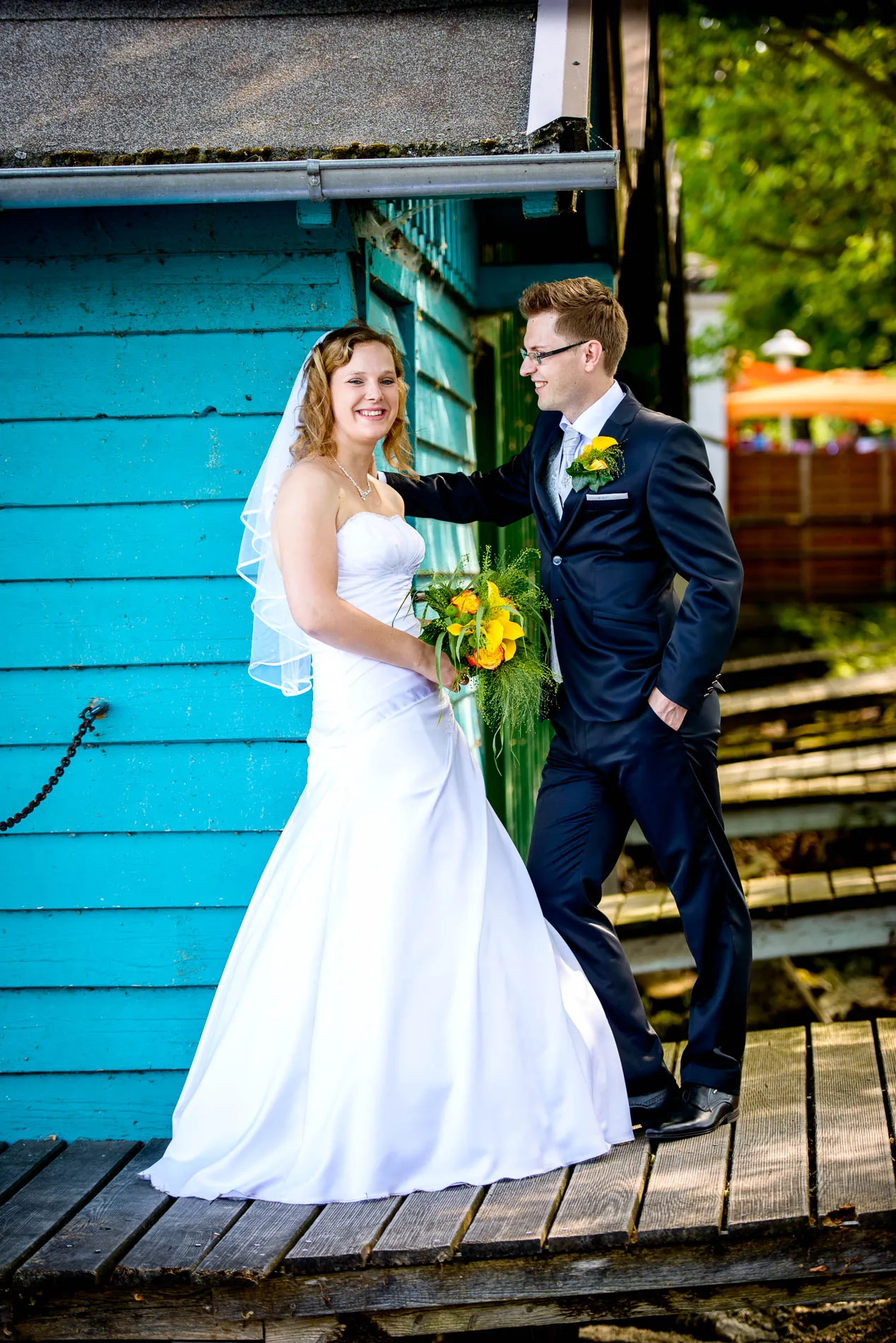 Während die Gäste schon einmal zum Hotel Vier Jahreszeiten aufbrachen, nahm ich das Brautpaar mit auf einen kurzen Abstecher in die andere Richtung – zum See. Die Seepromenade mit ihren farbenfrohen Bootshäuschen und der kleine Park am Ende boten die perfekte Kulisse für entspannte Hochzeitsfotos. Es war kein steifes Shooting, sondern ein Spaziergang mit viel Lachen, Bewegung und kleinen Momenten, die später auf den Bildern lebendig bleiben.