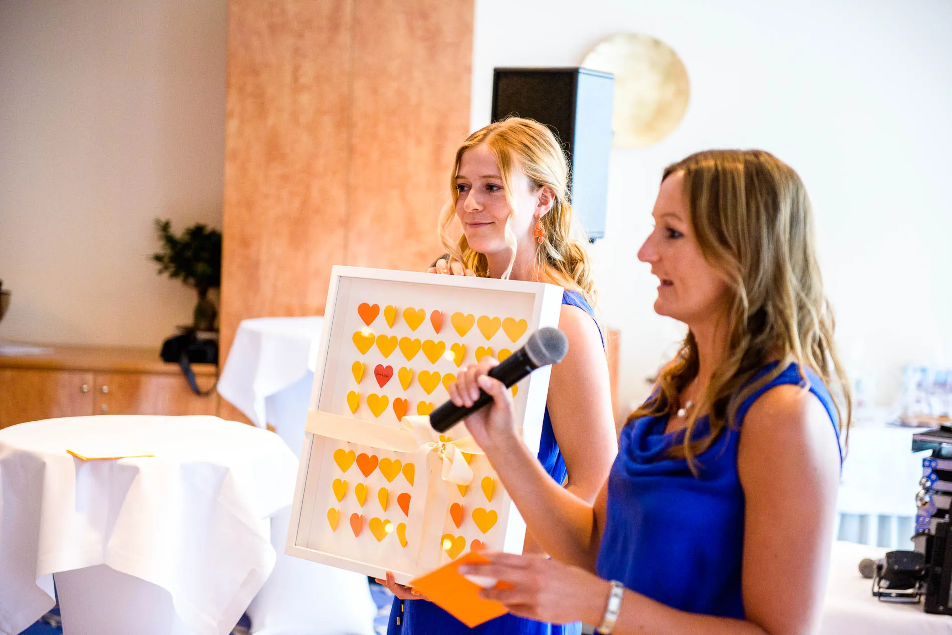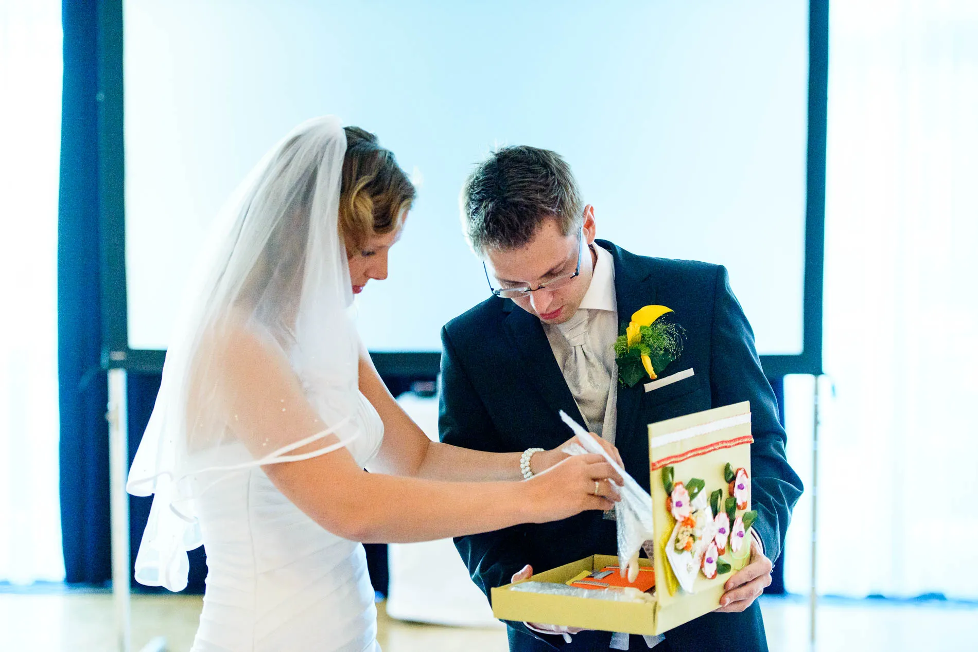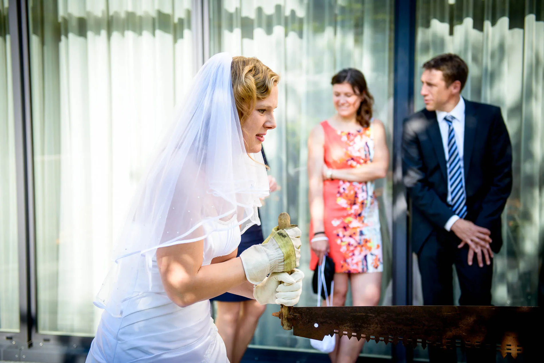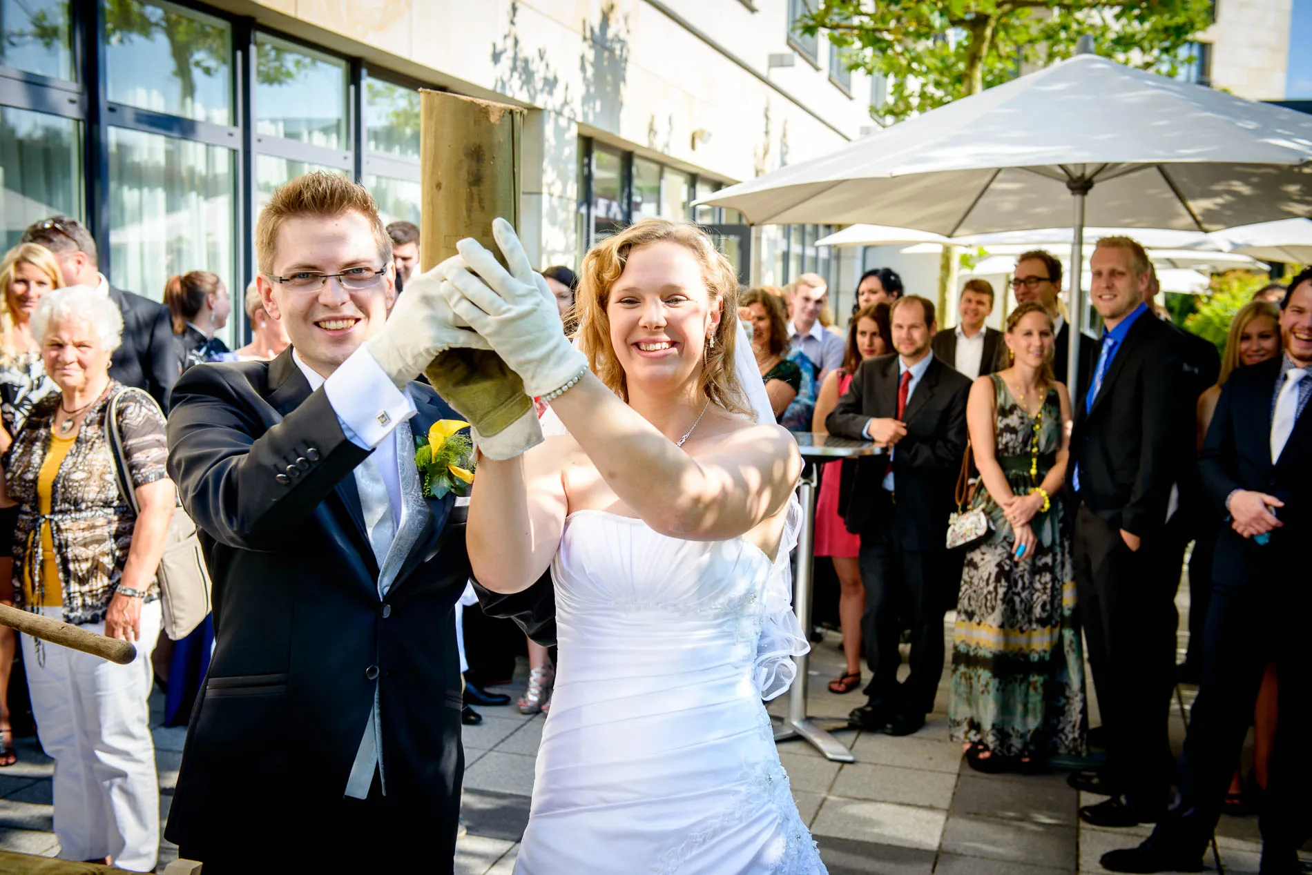 Zurück im Hotel warteten die ersten „sportlichen Herausforderungen“: der Brautstrauß wurde ungewöhnlich früh geworfen – vielleicht, um das traditionelle „Brautstrauß-Stehlen“ gleich im Keim zu ersticken. Danach folgte das Baumstammsägen. Immerhin hatte man dem Brautpaar Handschuhe spendiert, was die Sache zwar nicht leichter, aber immerhin stilvoller machte.