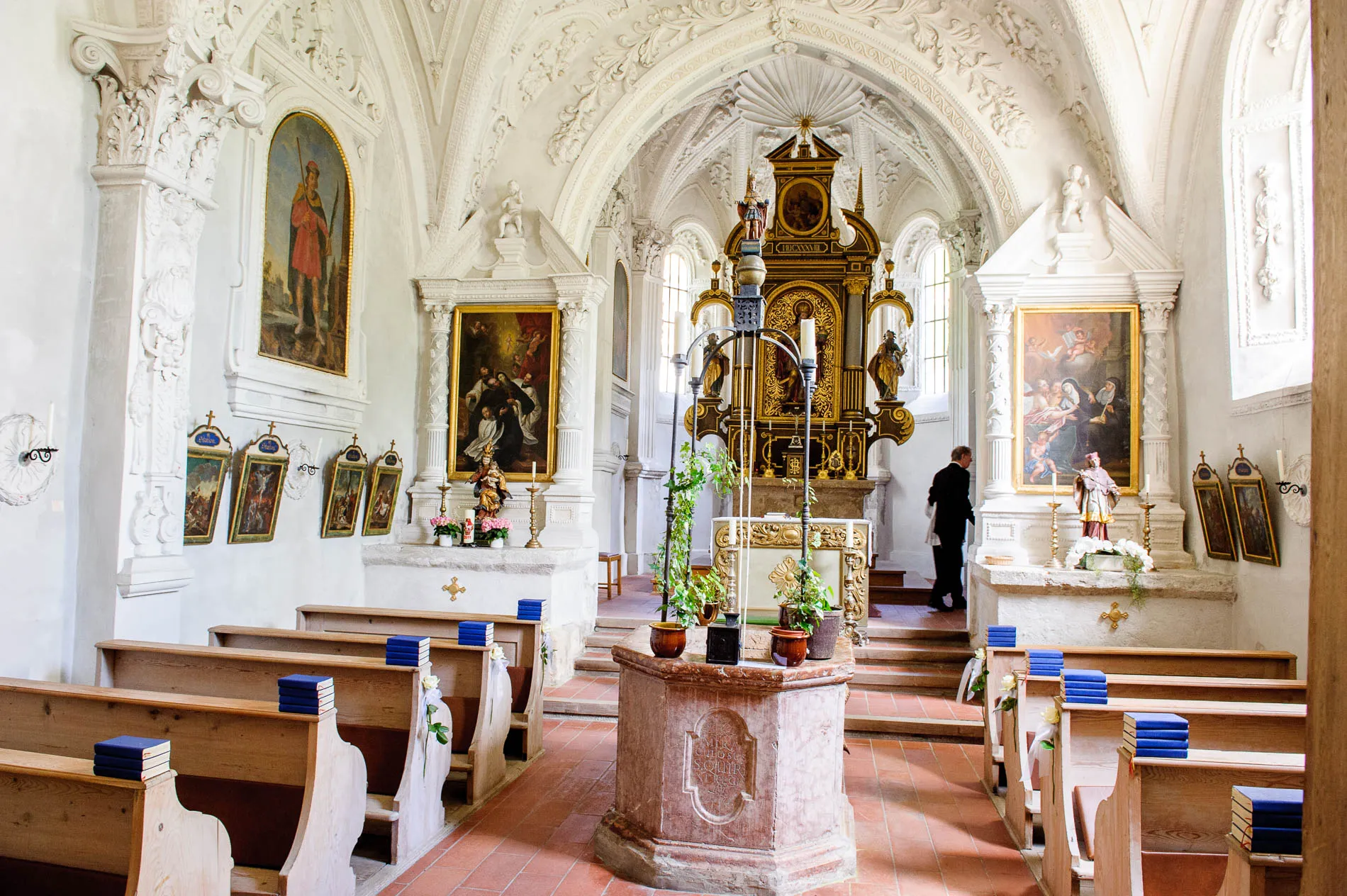 Wieder einmal durfte ich als Hochzeitsfotograf von München an den Tegernsee reisen – und ganz ehrlich: allein die Fahrt ist schon fast ein kleiner Kurzurlaub. Diesmal führte mich mein Weg nach Gmund, genauer gesagt zur kleinen Filialkirche St. Quirin. Ein Kirchlein, das so unscheinbar wirkt, dass man es beim Vorbeifahren fast übersehen könnte – wäre da nicht die Tatsache, dass es eines der bedeutendsten Denkmäler des Tegernseer Tals ist.