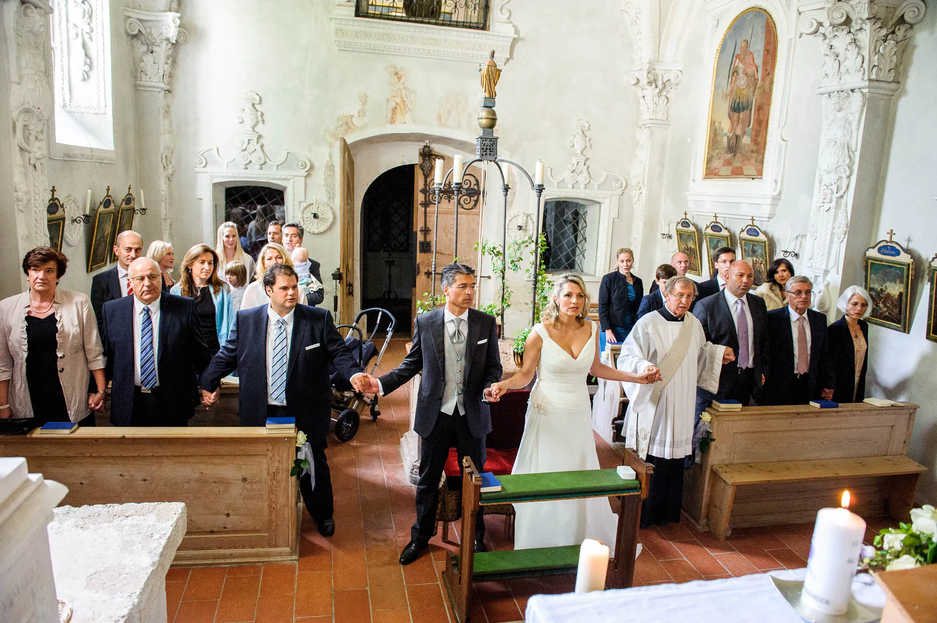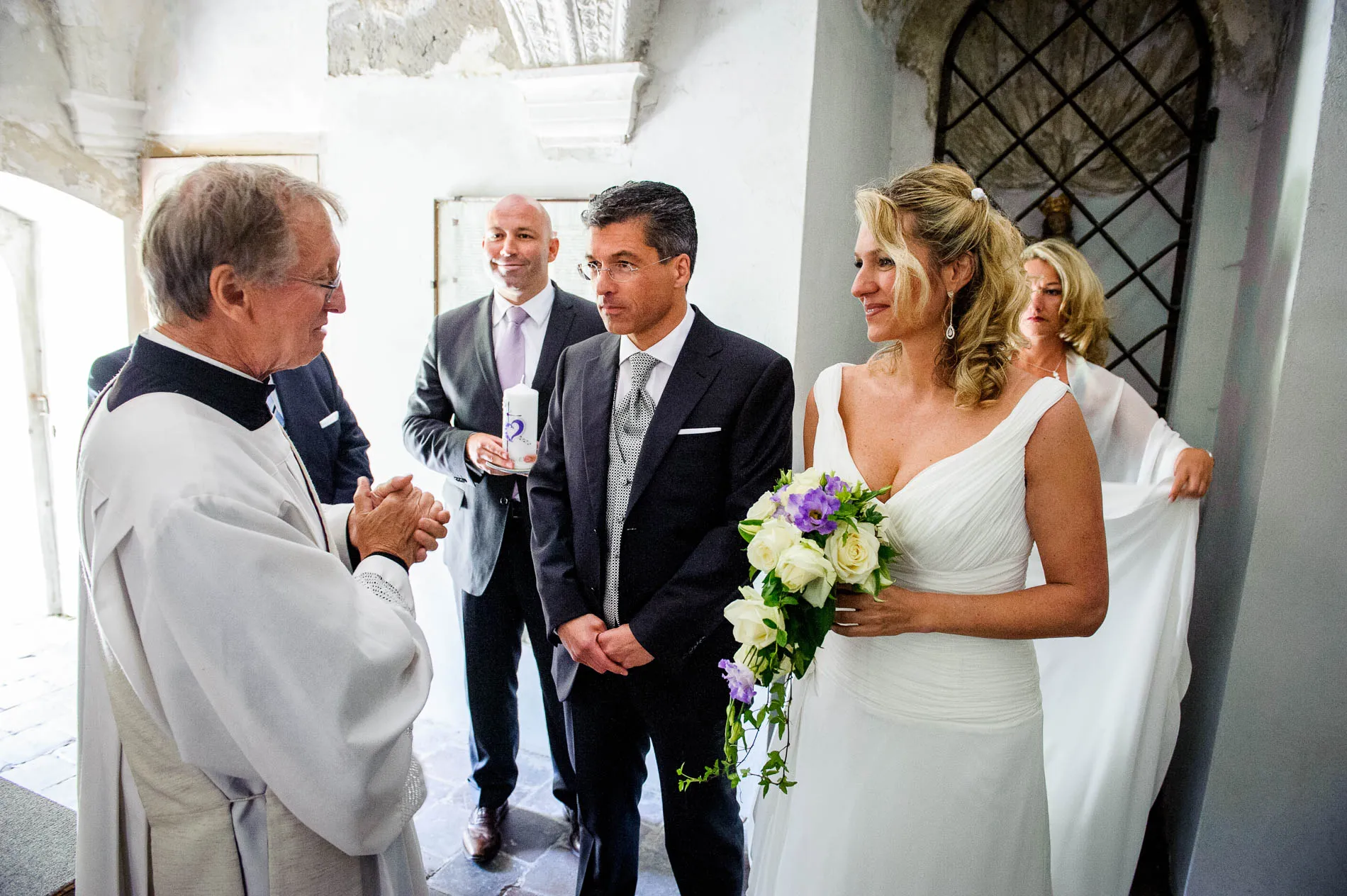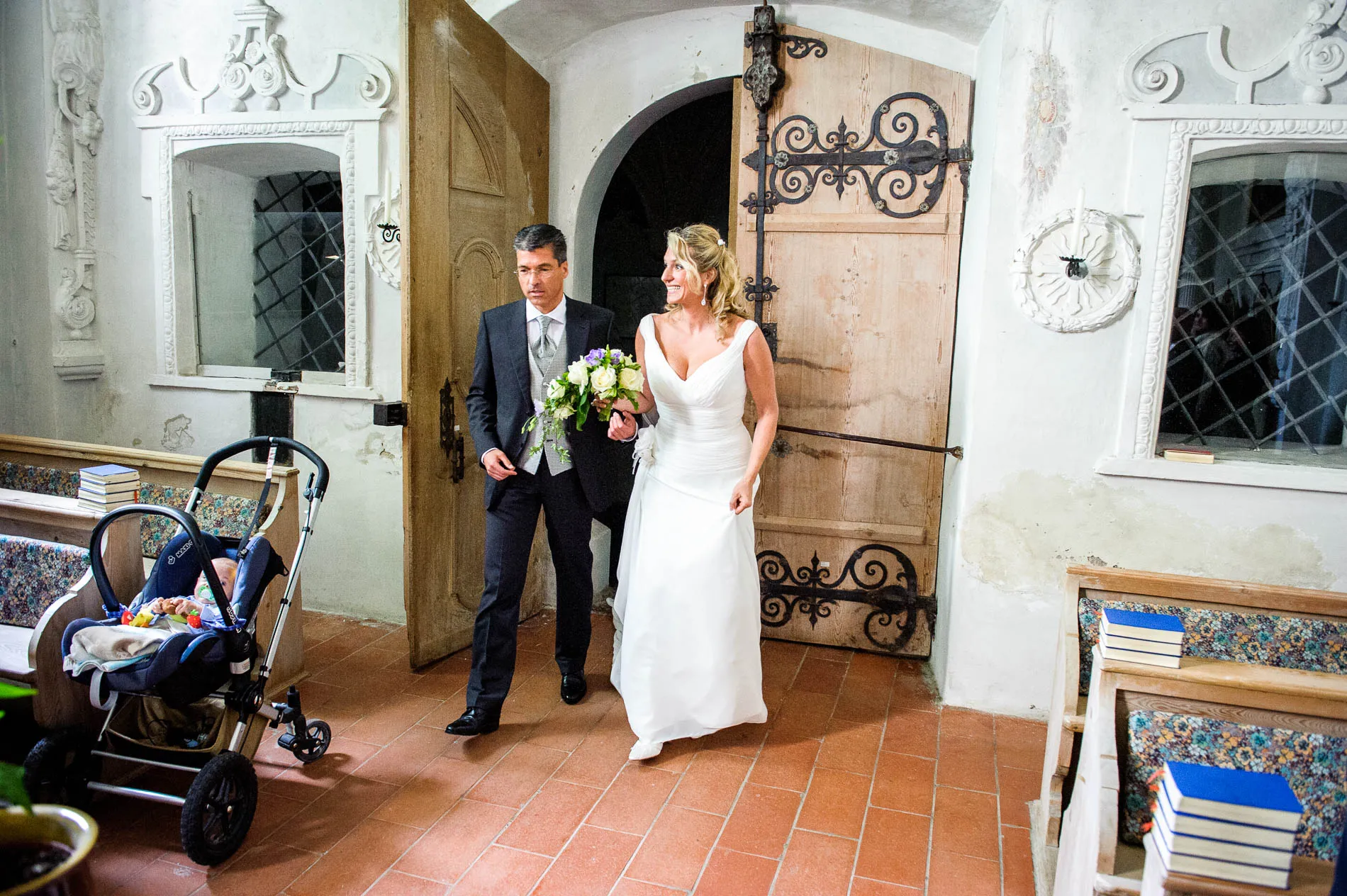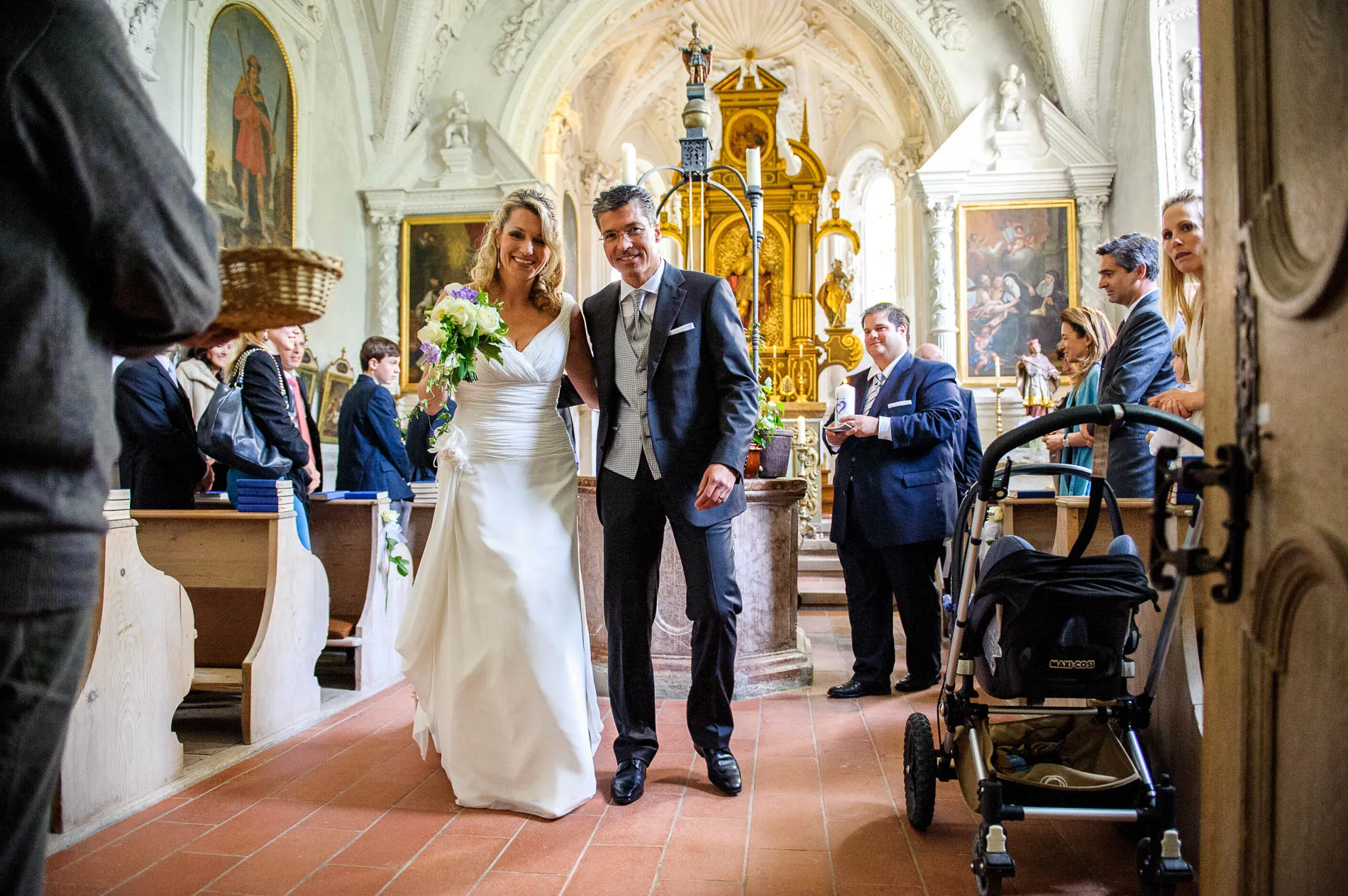 Das Brautpaar entschied sich für einen gemeinsamen Einzug in die Kirche. Eine schöne Geste, die zeigt: Hier geht es nicht um Tradition um der Tradition willen, sondern um das, was für die beiden passt. Praktisch war es auch, denn vor St. Quirin gibt es keinen einzigen Parkplatz. Wer also hier heiratet, sollte seine Gäste auf einen kleinen Fußmarsch vorbereiten. Aber seien wir ehrlich: ein bisschen Bewegung vor dem Sektempfang schadet niemandem.