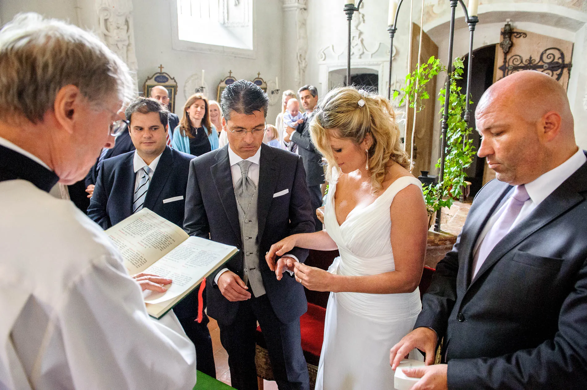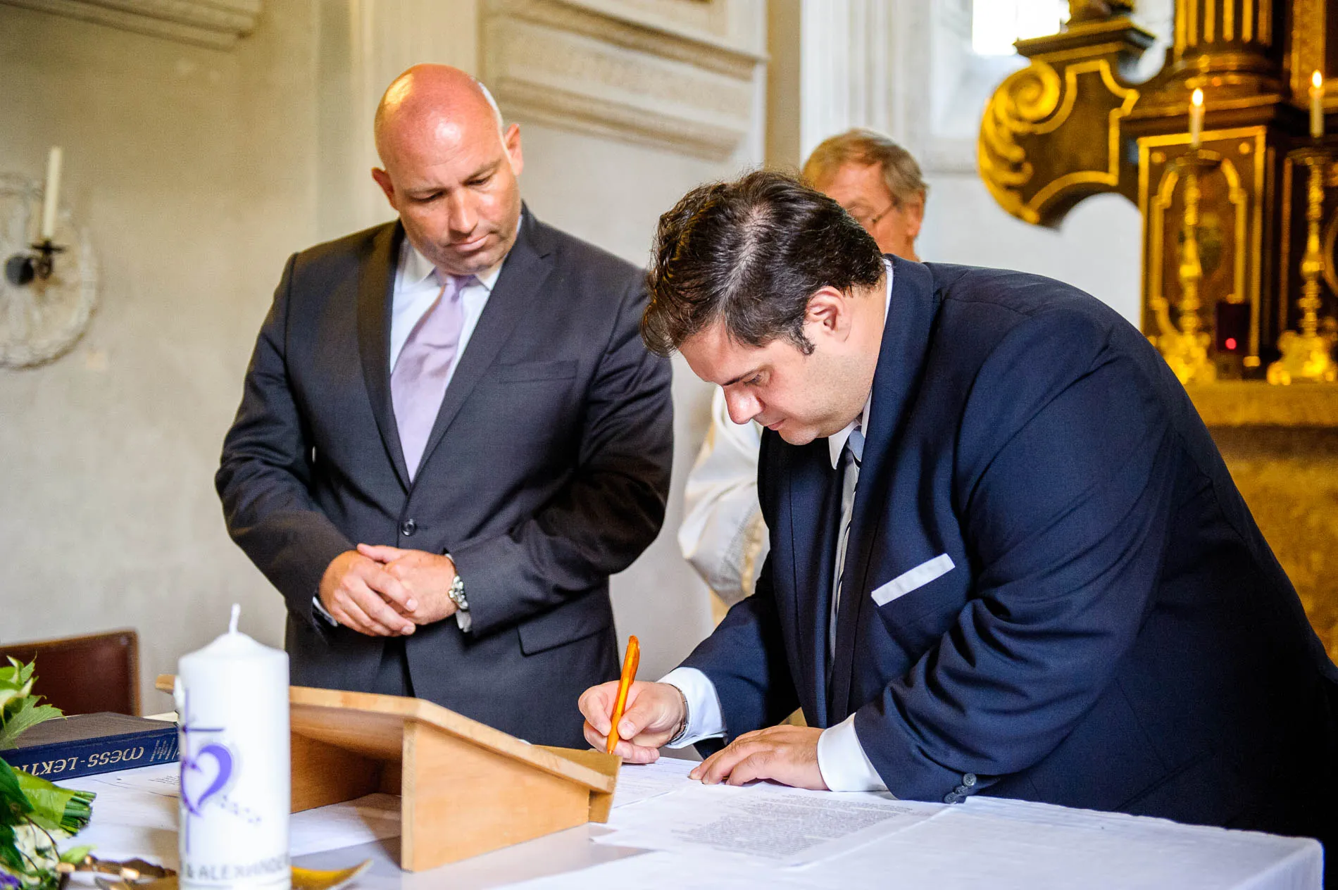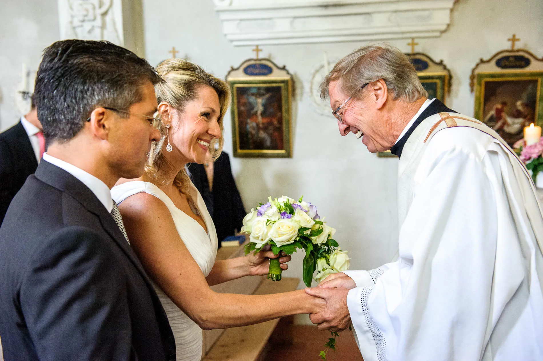 Das Brautpaar entschied sich für einen gemeinsamen Einzug in die Kirche. Eine schöne Geste, die zeigt: Hier geht es nicht um Tradition um der Tradition willen, sondern um das, was für die beiden passt. Praktisch war es auch, denn vor St. Quirin gibt es keinen einzigen Parkplatz. Wer also hier heiratet, sollte seine Gäste auf einen kleinen Fußmarsch vorbereiten. Aber seien wir ehrlich: ein bisschen Bewegung vor dem Sektempfang schadet niemandem.