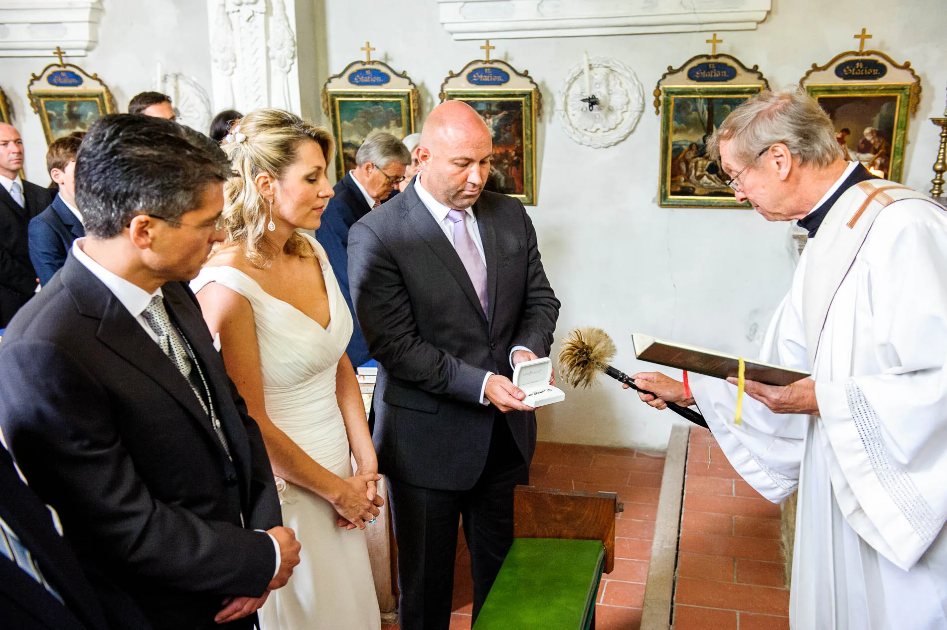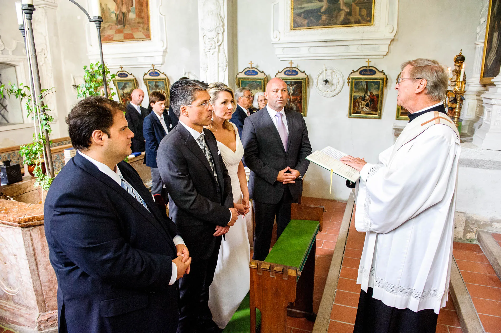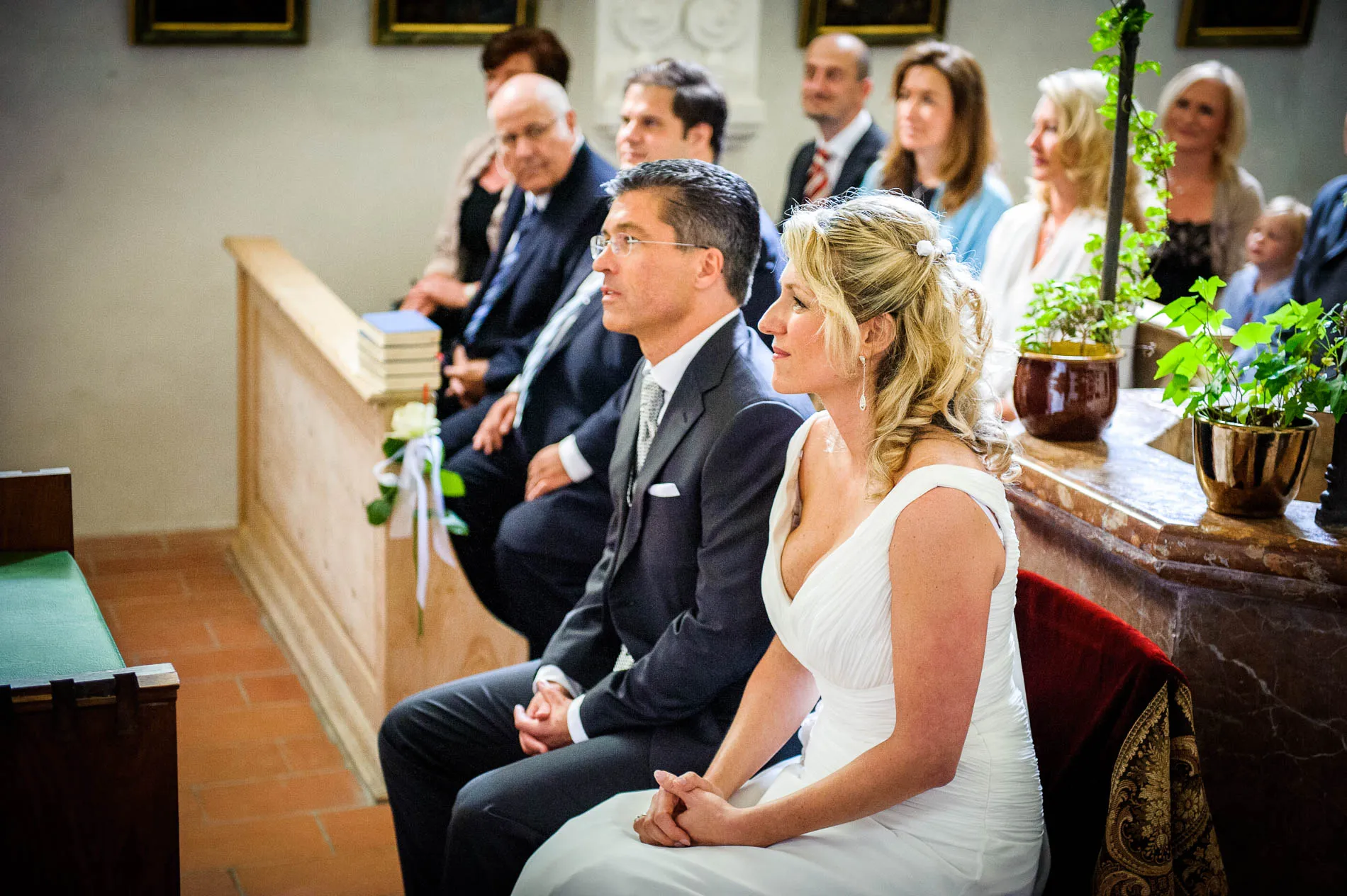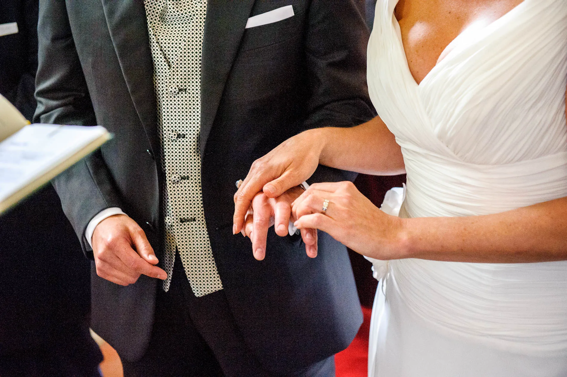 Das Brautpaar entschied sich für einen gemeinsamen Einzug in die Kirche. Eine schöne Geste, die zeigt: Hier geht es nicht um Tradition um der Tradition willen, sondern um das, was für die beiden passt. Praktisch war es auch, denn vor St. Quirin gibt es keinen einzigen Parkplatz. Wer also hier heiratet, sollte seine Gäste auf einen kleinen Fußmarsch vorbereiten. Aber seien wir ehrlich: ein bisschen Bewegung vor dem Sektempfang schadet niemandem.