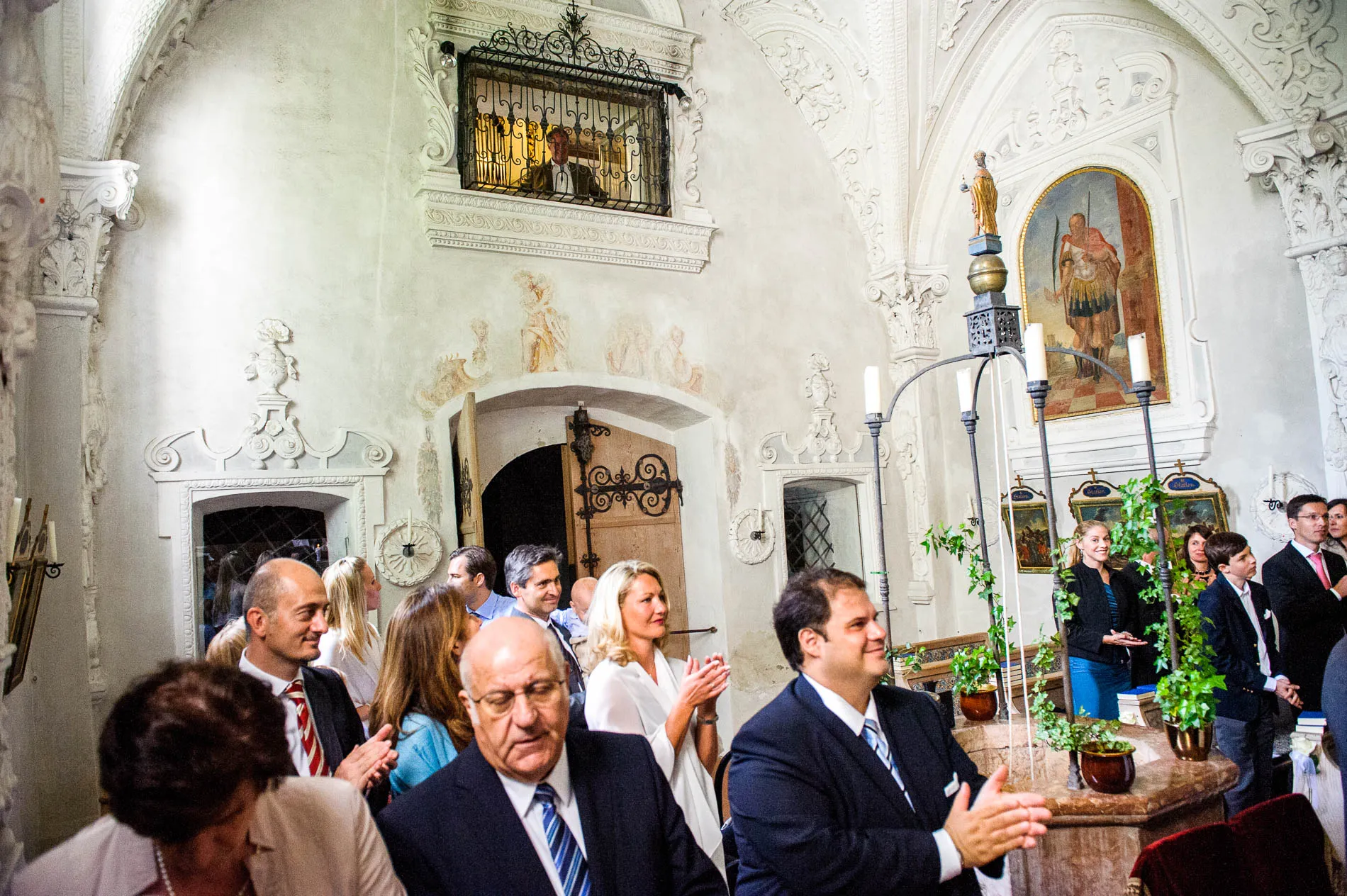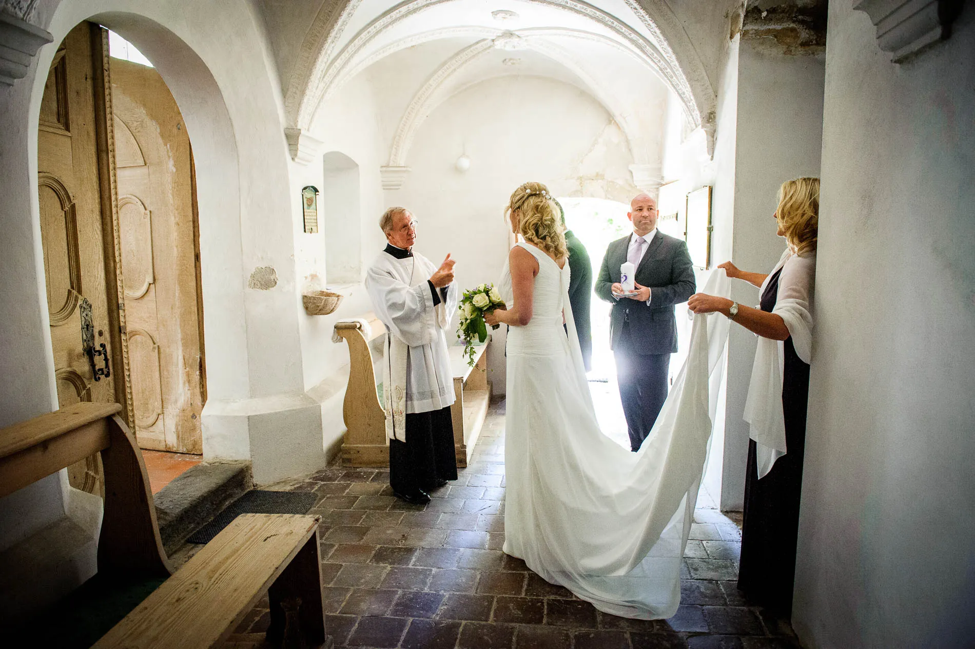 Nach der Trauung sammelte sich die Hochzeitsgesellschaft vor der Kirche, um dem frisch verheirateten Paar zu gratulieren. Platz ist dort nicht gerade im Überfluss – direkt nebenan rauscht die Straße vorbei. Aber genau das macht den Charme aus: ein Stück bayerische Realität, eingerahmt von jahrhundertealter Geschichte. Und für mich als Hochzeitsfotograf sind es oft gerade diese unperfekten Momente, die später die schönsten Erinnerungen ergeben.