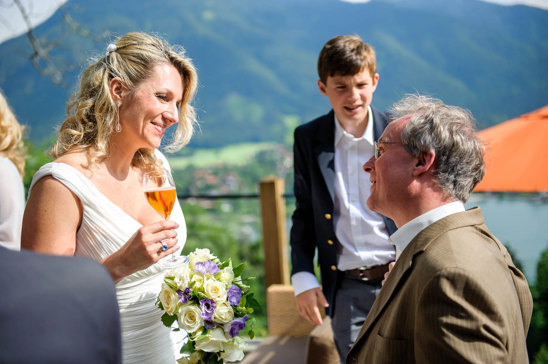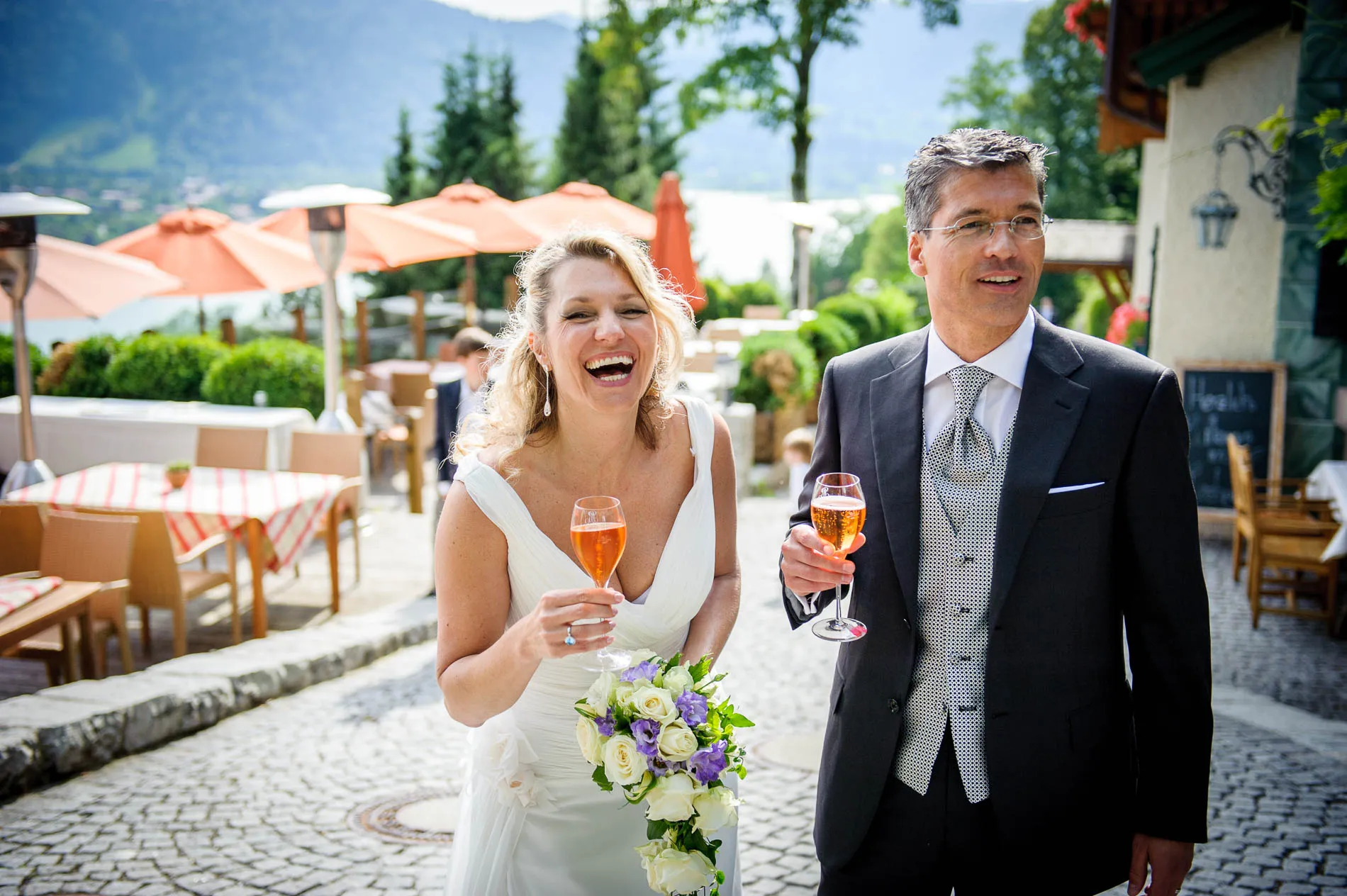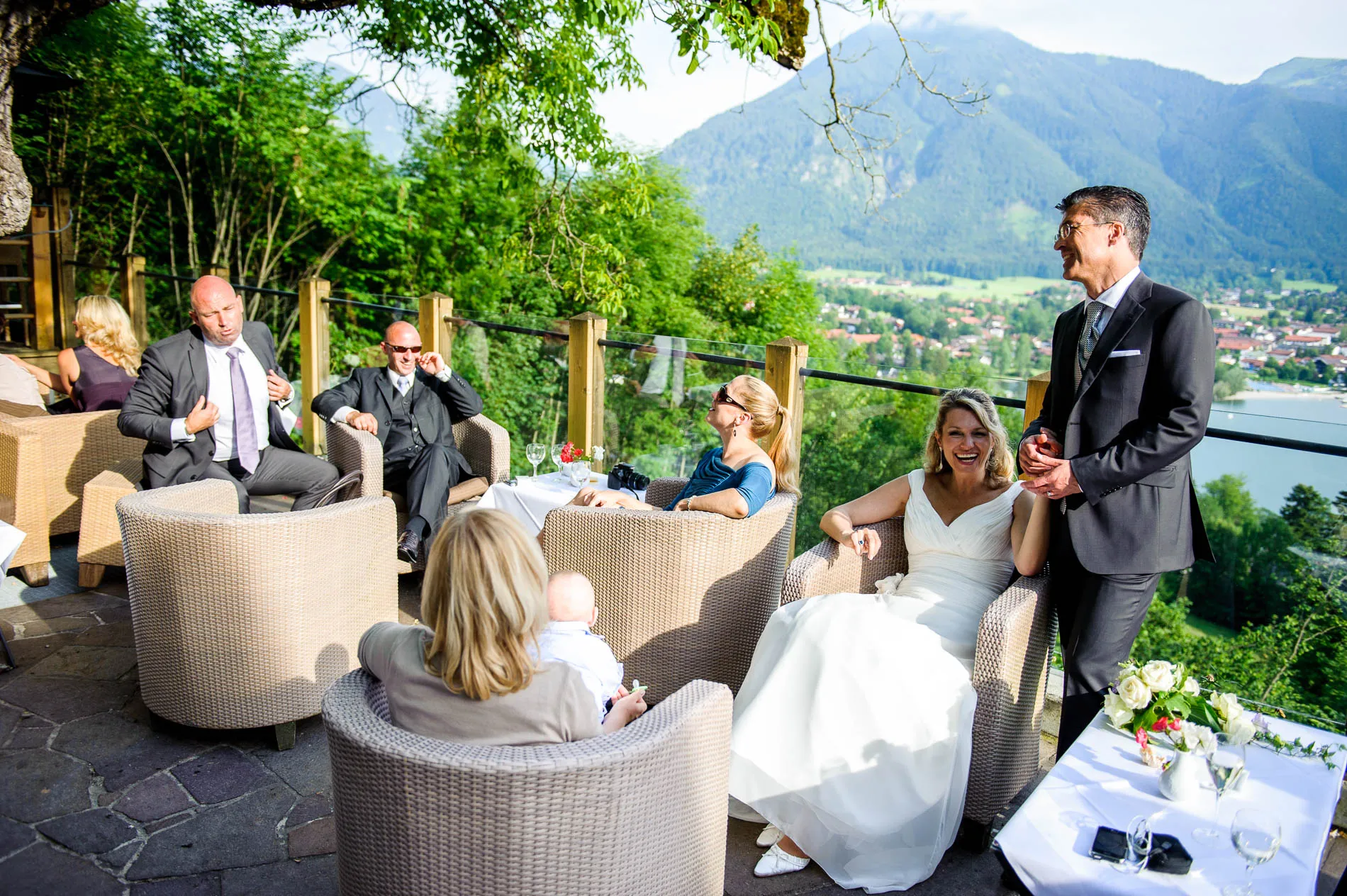 Nach der Trauung ging es weiter zum Leeberghof in Tegernsee. Wer schon einmal dort war, weiß: die Terrasse ist ein Postkartenmotiv, das sich selbst fotografiert. Der Blick über den See ist so spektakulär, dass man fast vergisst, dass man eigentlich zum Arbeiten hier ist. Fast. Beim Sektempfang gab es – neben klassischen Getränken – auch ein sehr beliebtes orangenes Getränk, das in den letzten Jahren zum inoffiziellen Hochzeitsklassiker geworden ist. Ich sage nur: Aperol hat vermutlich mehr Hochzeiten gesehen als so mancher Standesbeamte.