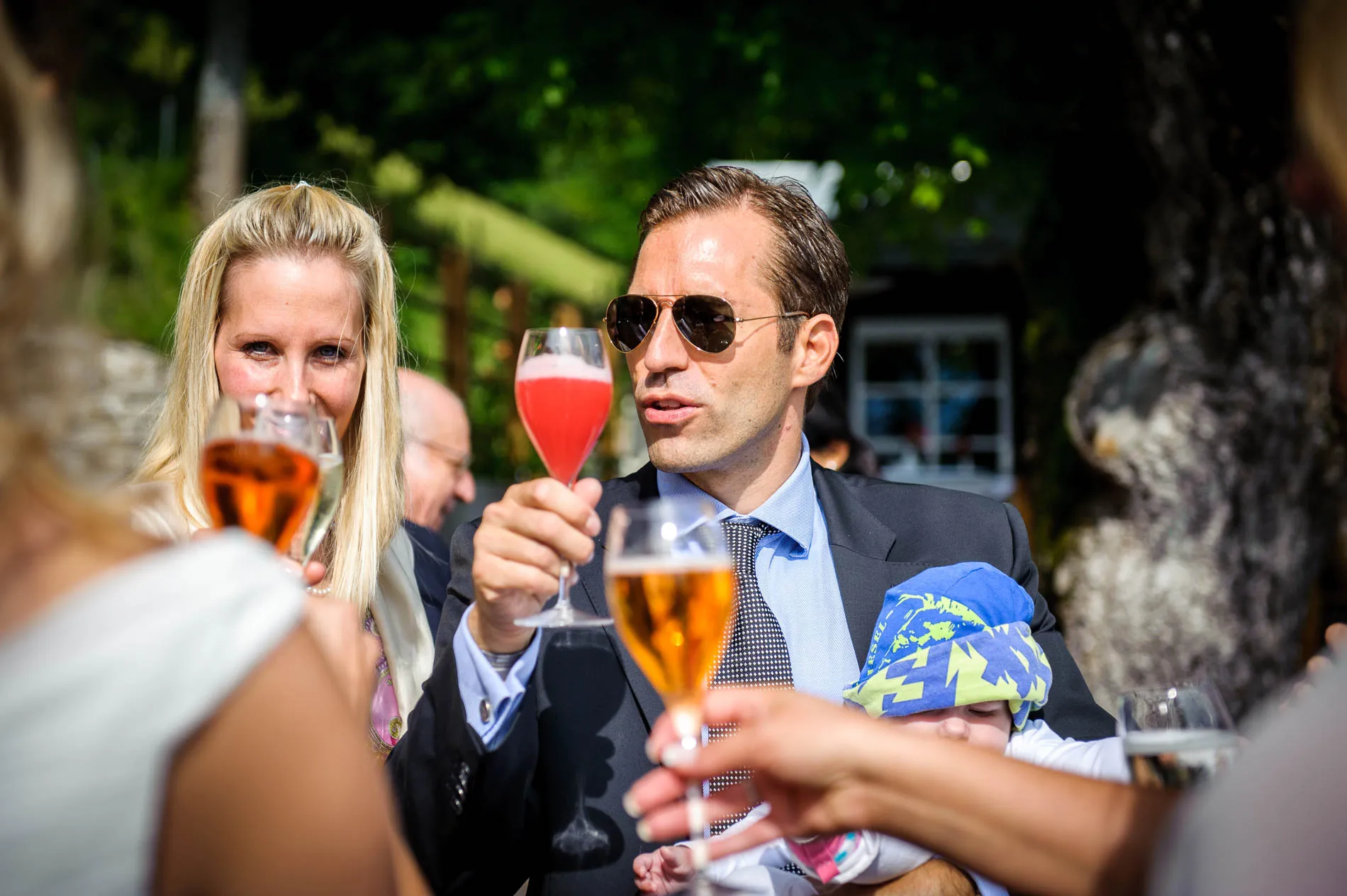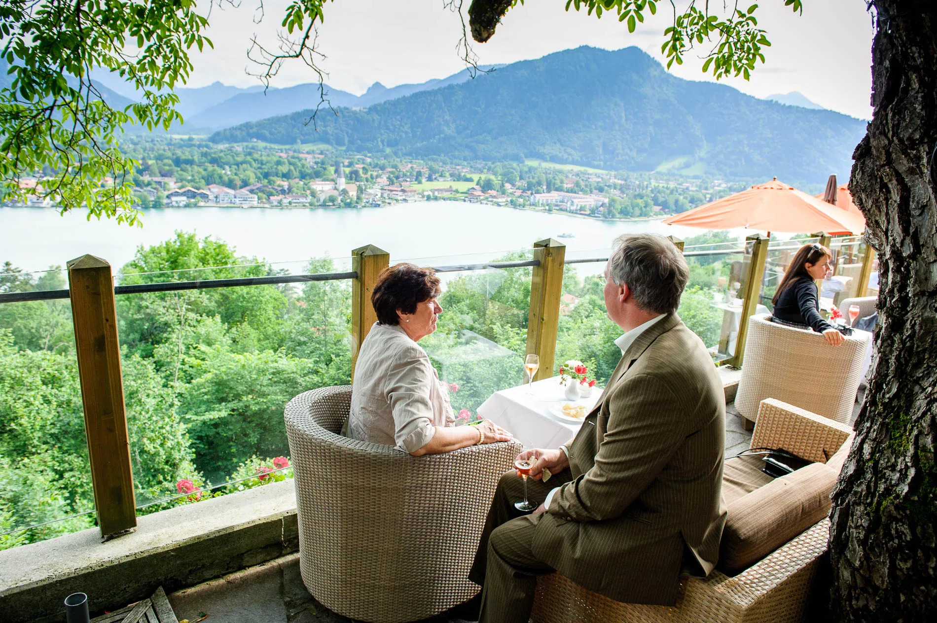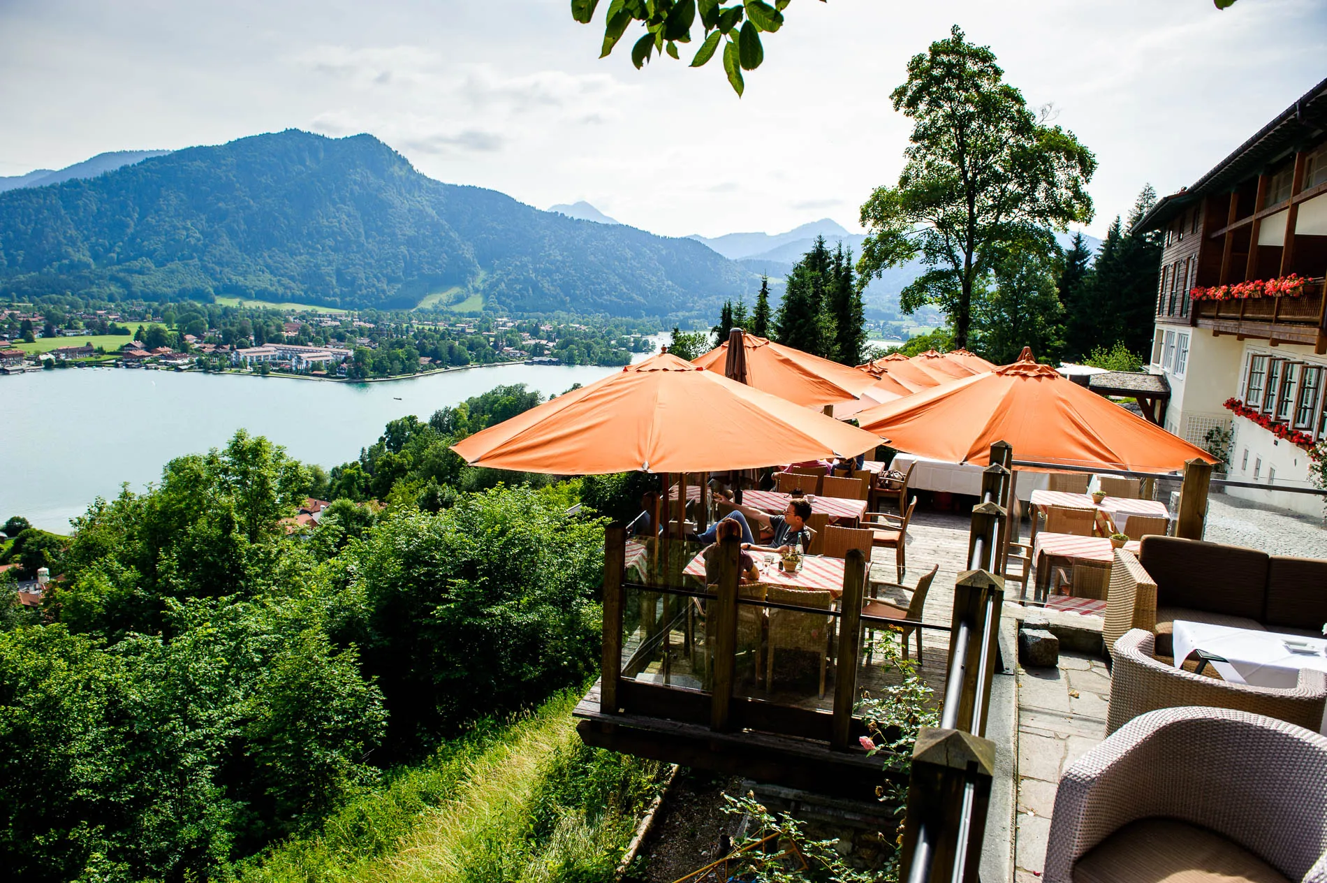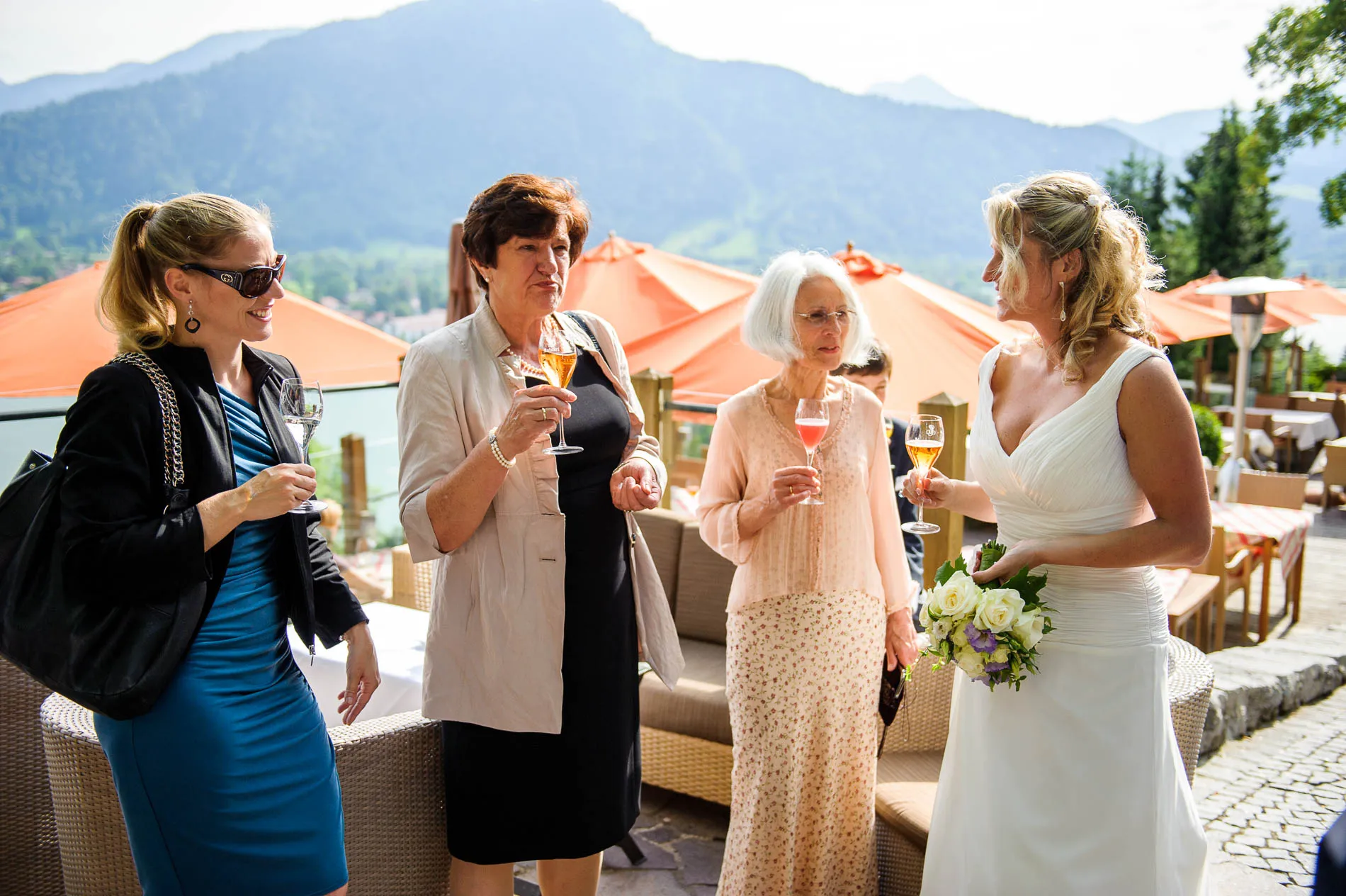 Nach der Trauung ging es weiter zum Leeberghof in Tegernsee. Wer schon einmal dort war, weiß: die Terrasse ist ein Postkartenmotiv, das sich selbst fotografiert. Der Blick über den See ist so spektakulär, dass man fast vergisst, dass man eigentlich zum Arbeiten hier ist. Fast. Beim Sektempfang gab es – neben klassischen Getränken – auch ein sehr beliebtes orangenes Getränk, das in den letzten Jahren zum inoffiziellen Hochzeitsklassiker geworden ist. Ich sage nur: Aperol hat vermutlich mehr Hochzeiten gesehen als so mancher Standesbeamte.