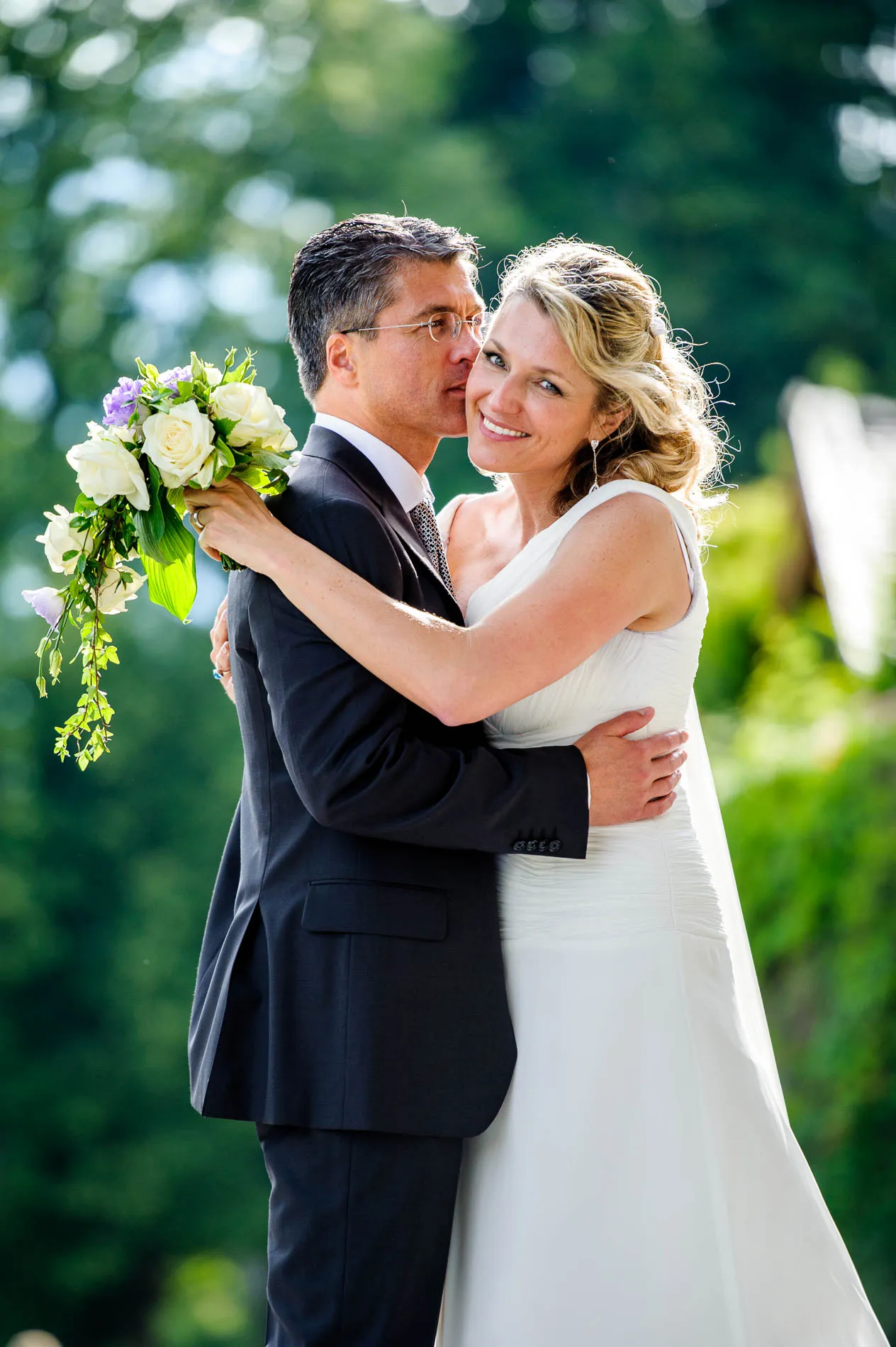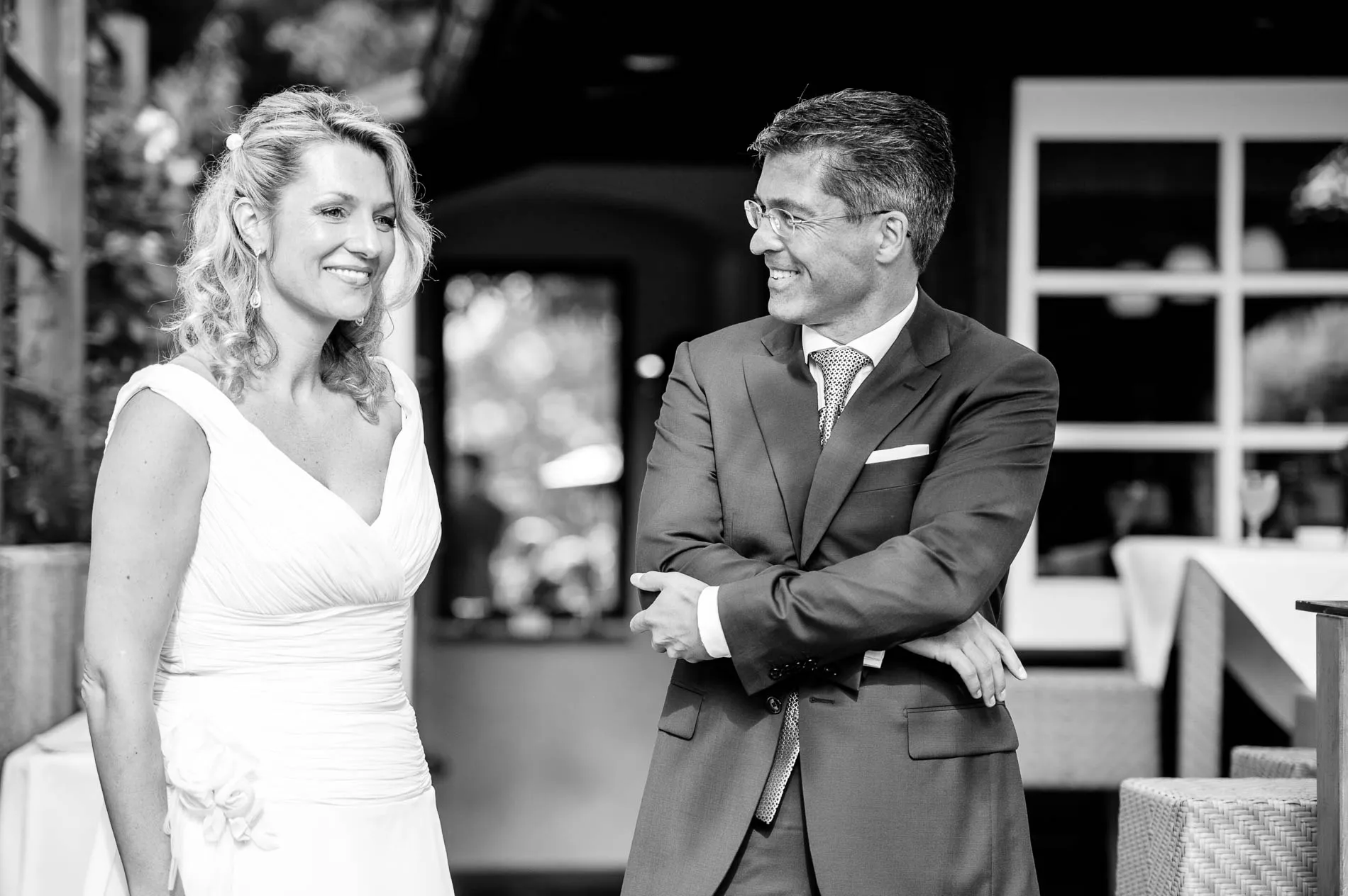 Die kleine Hochzeitsgesellschaft verbrachte einen entspannten Nachmittag auf der Terrasse. Es wurde gelacht, geplaudert und angestoßen – und ich konnte im Hintergrund die vielen kleinen Momente einfangen, die später die Geschichte dieses Tages erzählen. Mein Stil ist dabei dezent und respektvoll: Ich greife nicht ins Geschehen ein, sondern lasse es passieren. Nur beim Brautpaarshooting übernehme ich ein wenig Regie – und genau das stand nun auf dem Programm.