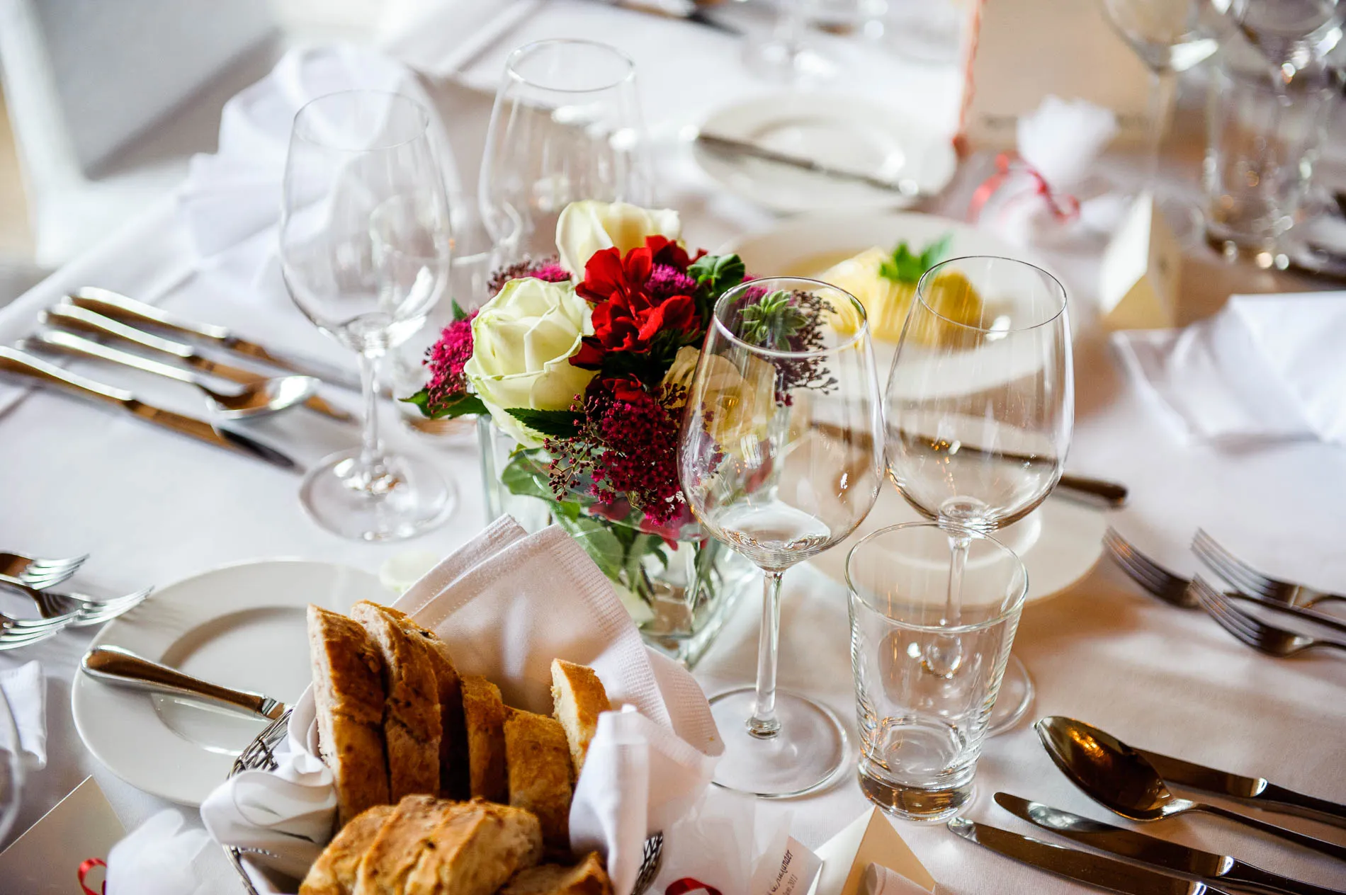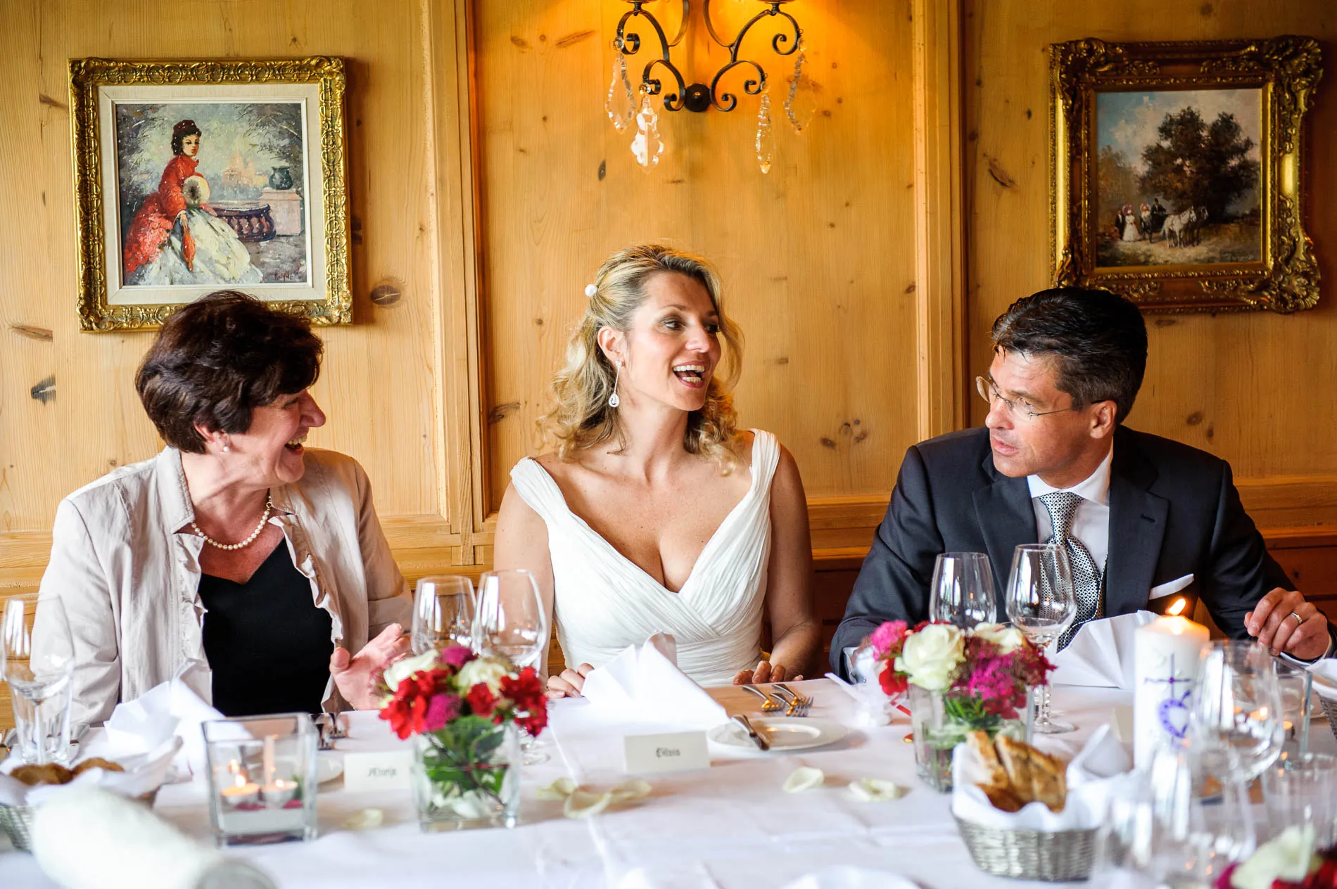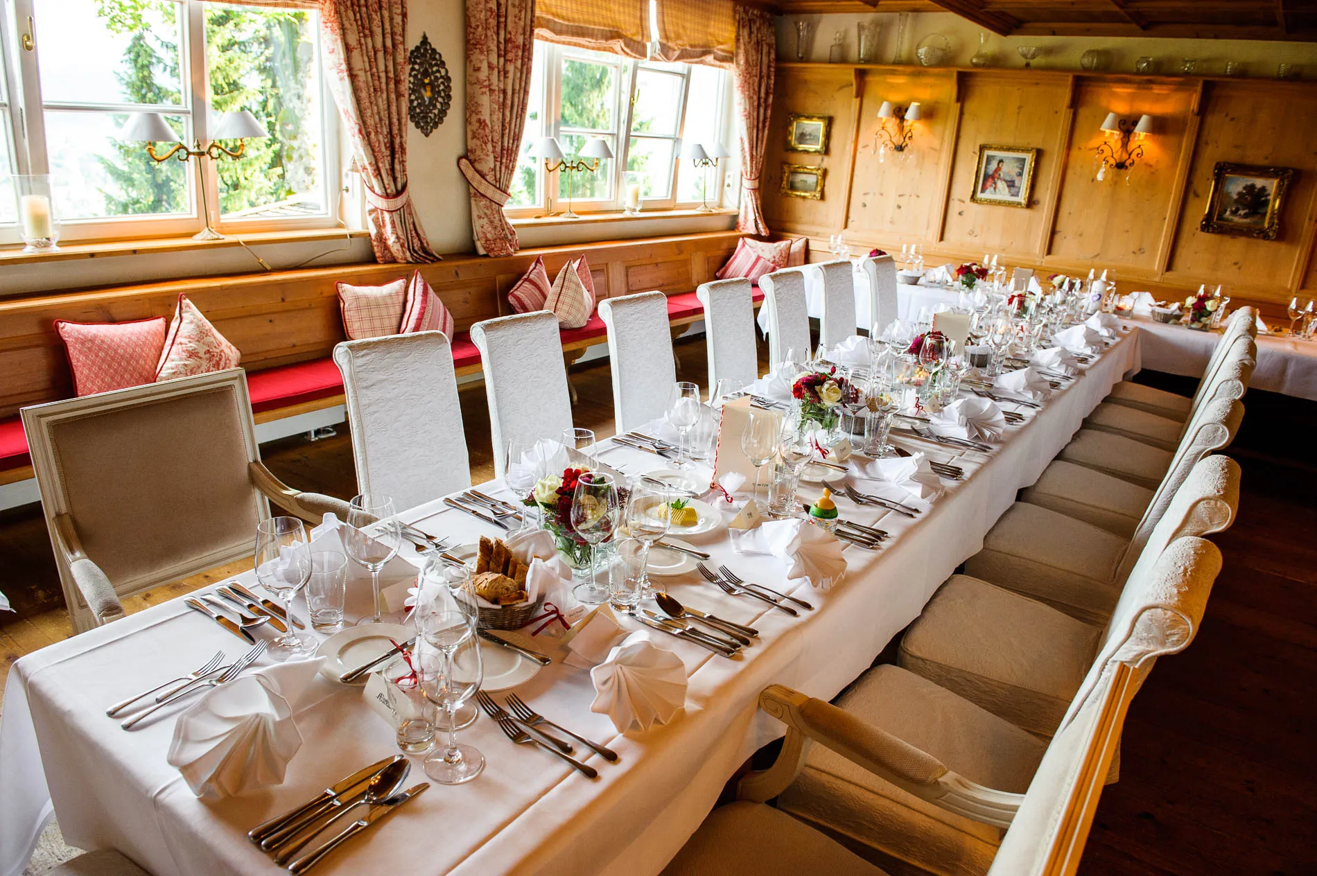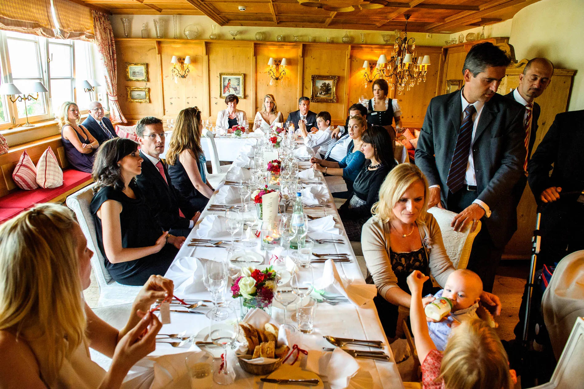 Als die Sonne langsam tiefer stand, bat das Brautpaar seine Gäste in den Saal des Leeberghofs. Dort wartete ein festliches Abendessen, das den Tag perfekt abrundete. Für mich war es der Moment, die Kamera noch einmal zu zücken, um die Stimmung einzufangen: das Klirren der Gläser, das Lächeln der Gäste, die entspannte Atmosphäre.