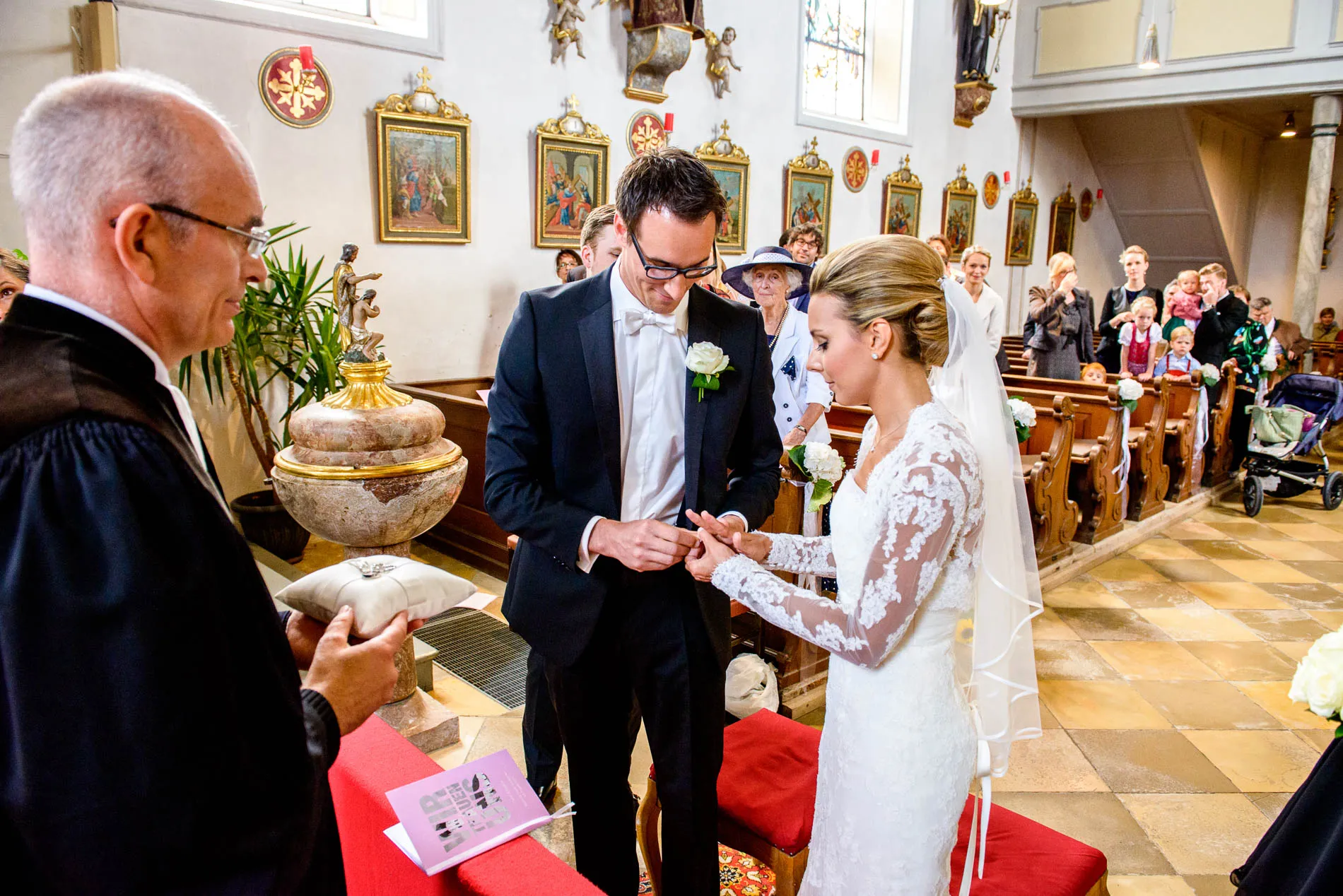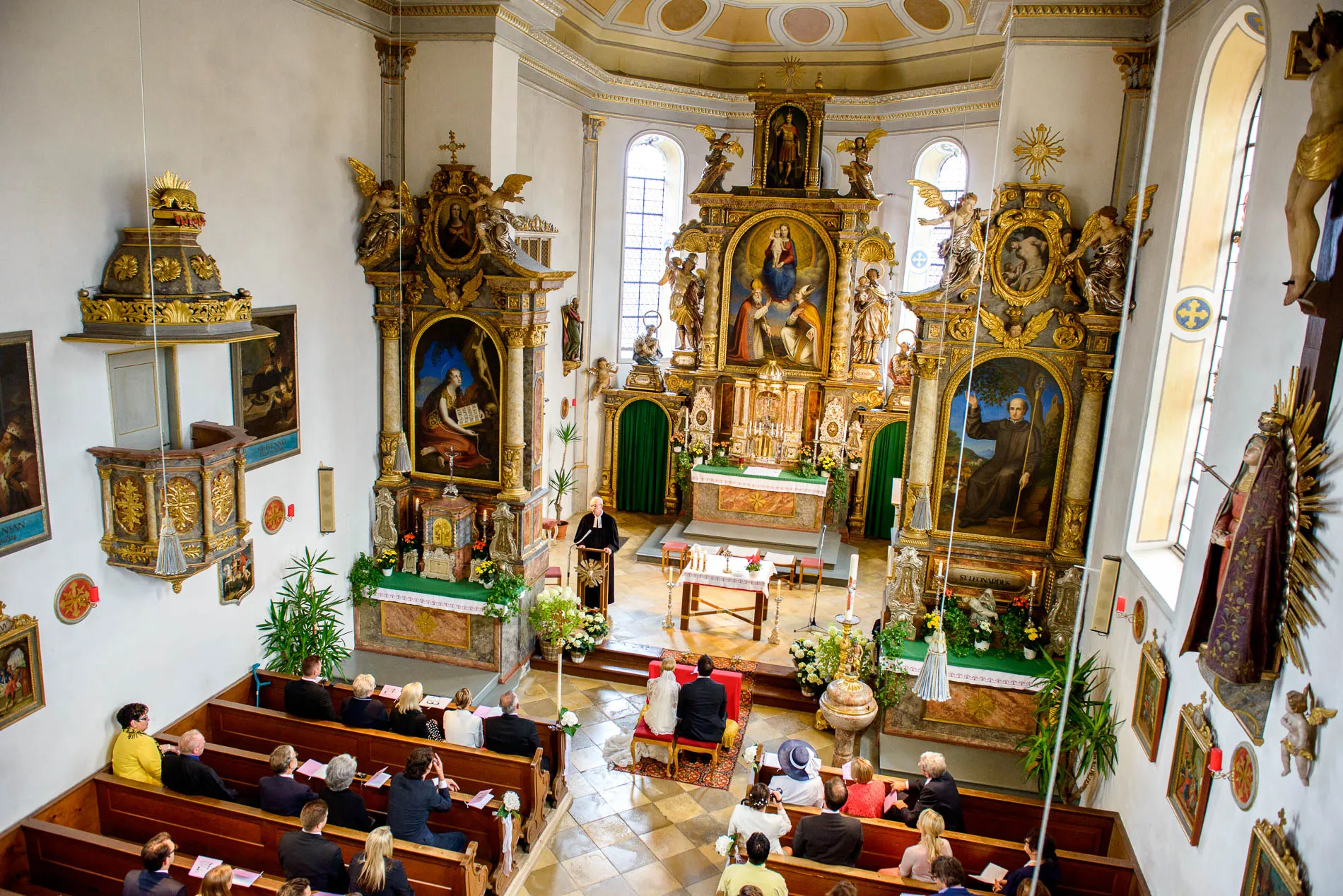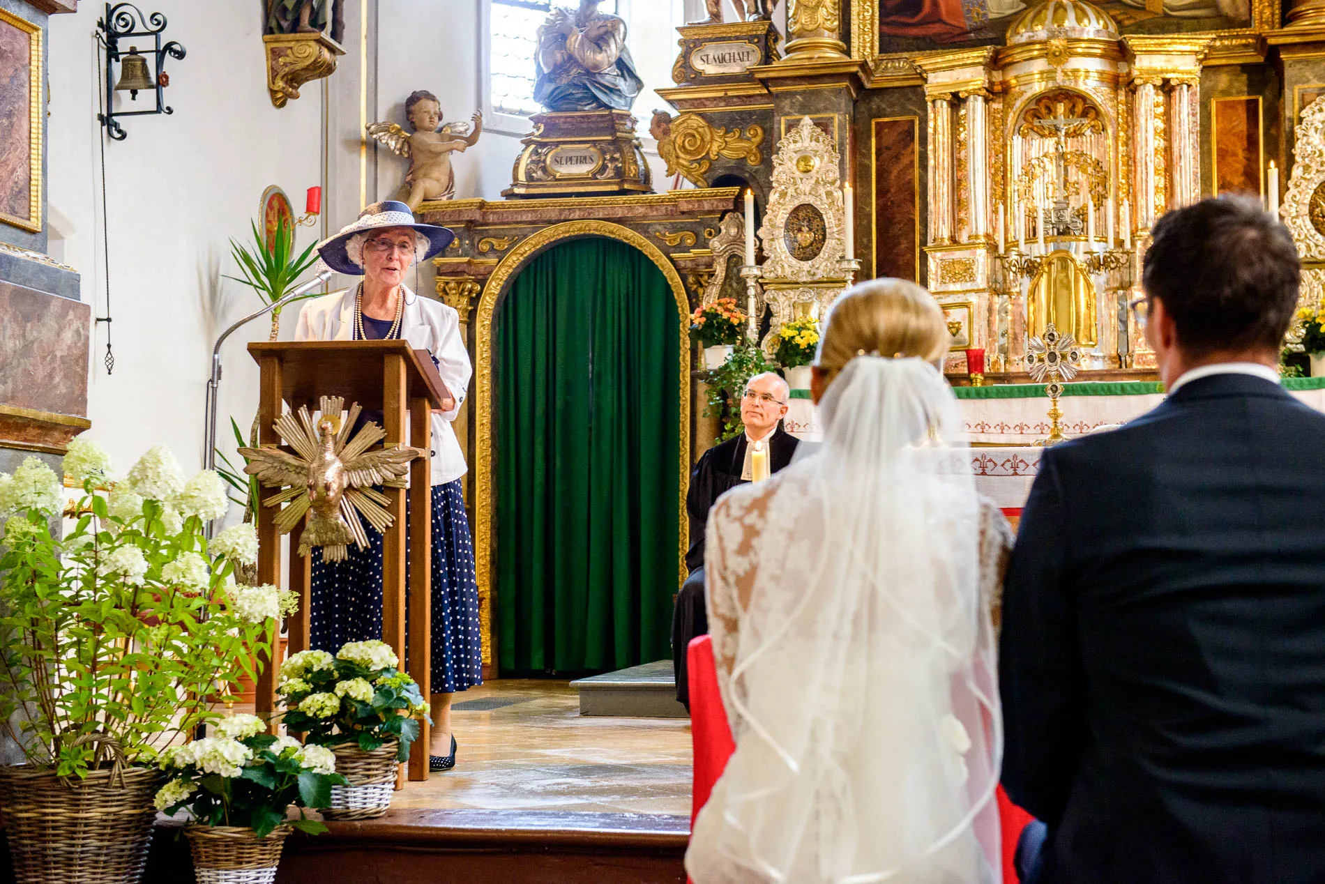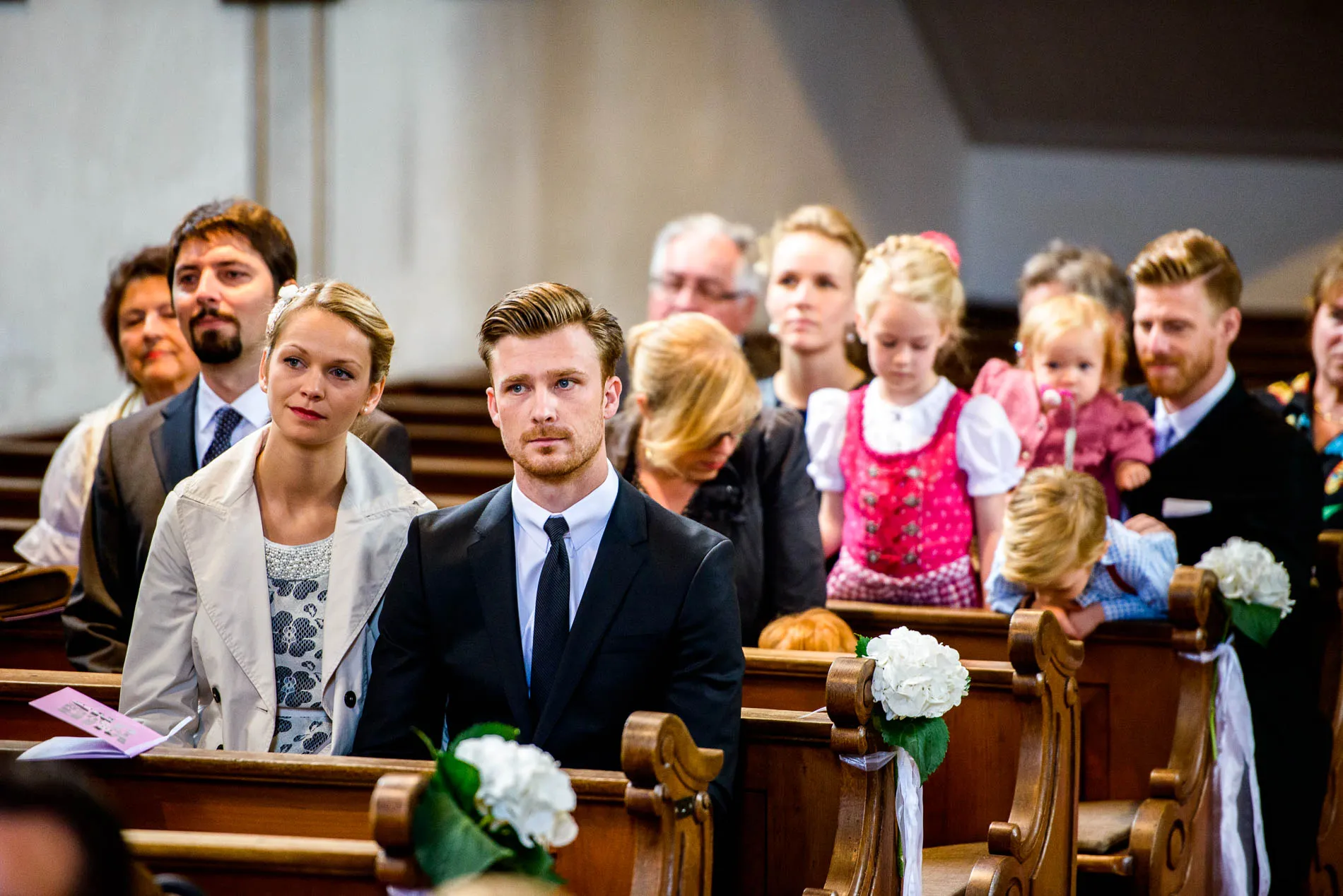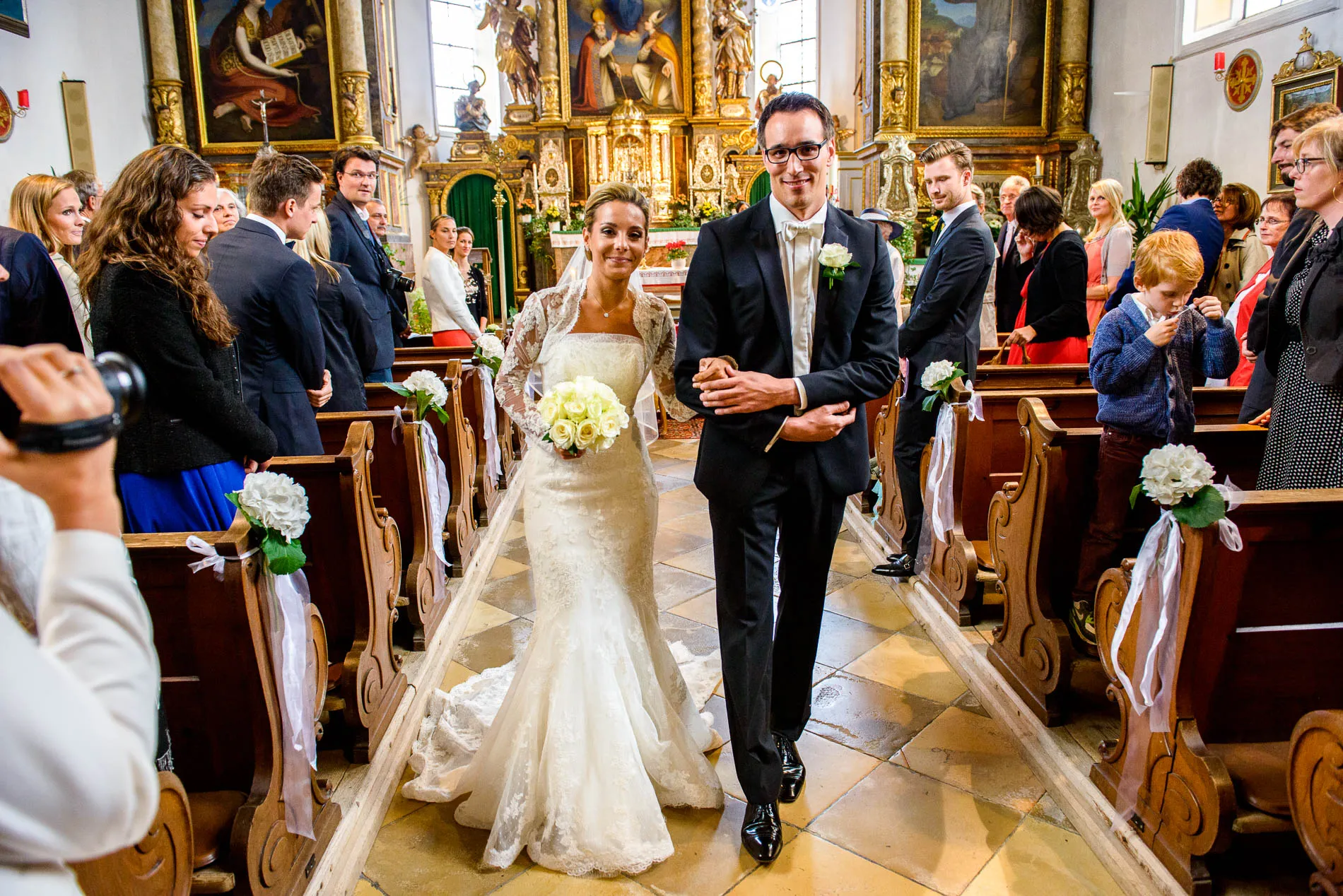 Die Hochzeit begann klassisch und zugleich sehr persönlich: In der Kirche St. Martin in Waakirchen wurde die Braut von ihrem Vater zum Altar geführt. Ein Moment, der nie an Wirkung verliert – egal, wie viele Hochzeiten ich als Hochzeitsfotograf schon begleiten durfte. Das Brautpaar entschied sich, die Glückwünsche nicht direkt vor der Kirche entgegenzunehmen, sondern erst später im Margarethenhof. Eine kluge Entscheidung, denn mit einem Glas Sekt oder Aperol Spritz in der Hand lässt es sich bekanntlich entspannter warten, bis man an der Reihe ist.