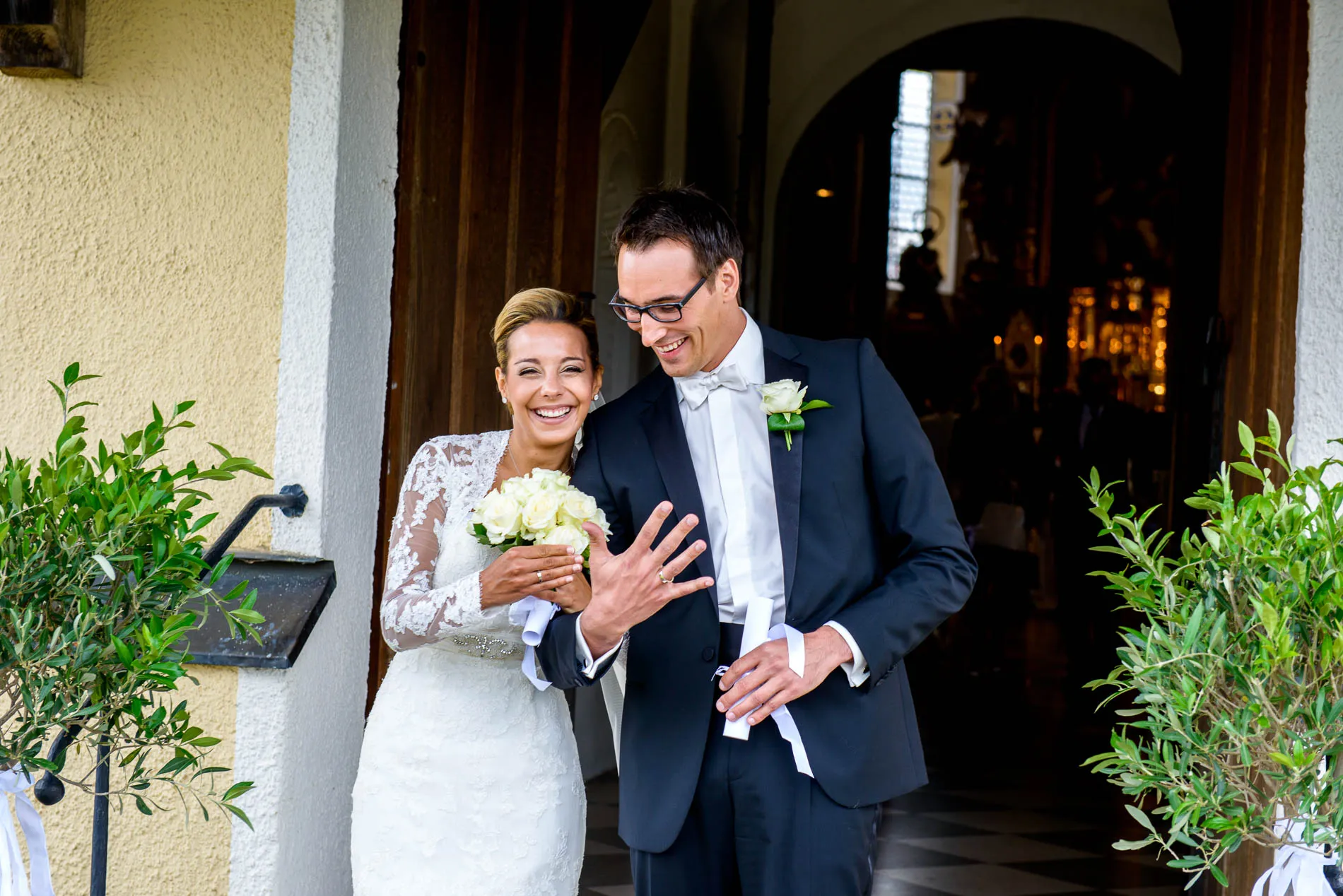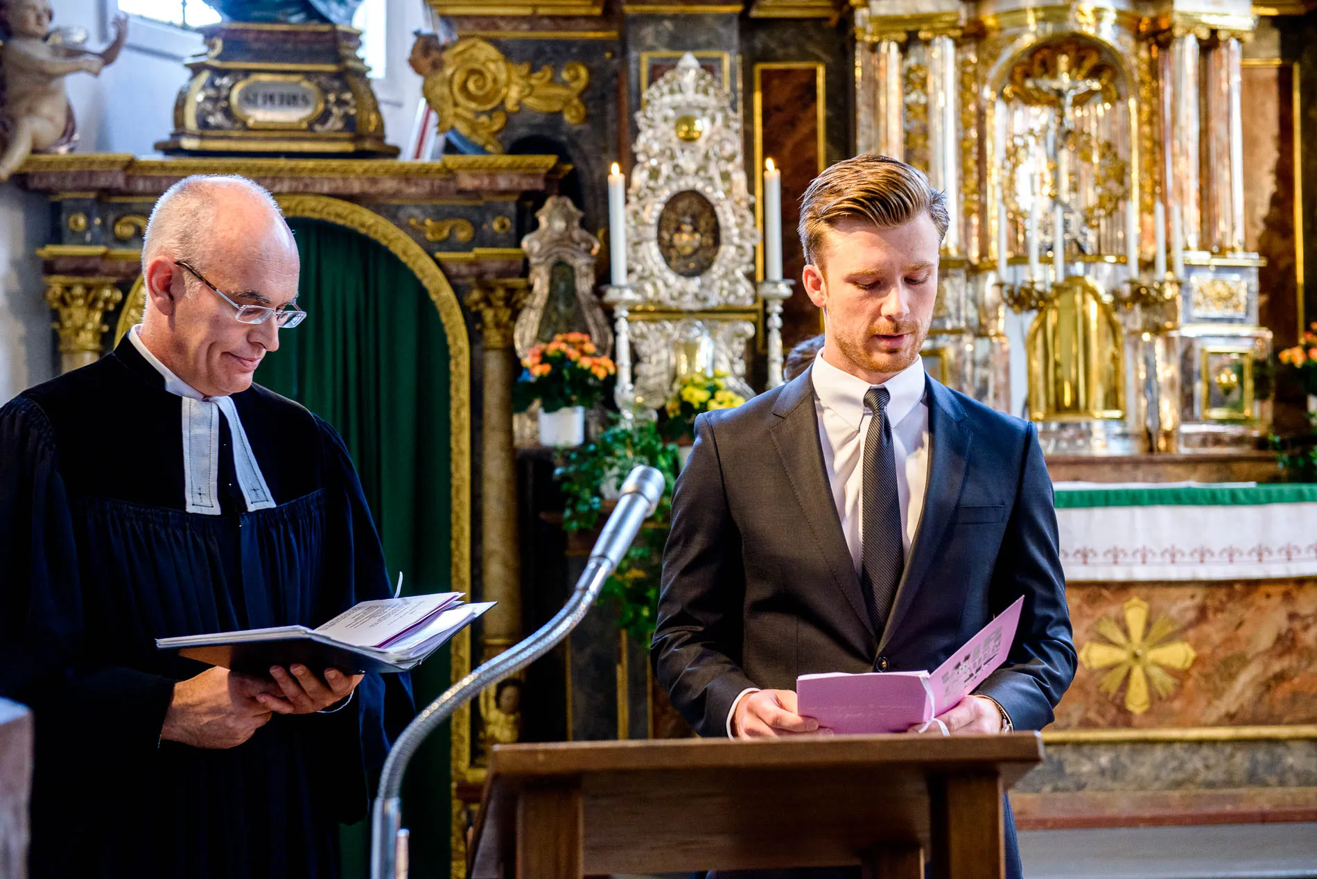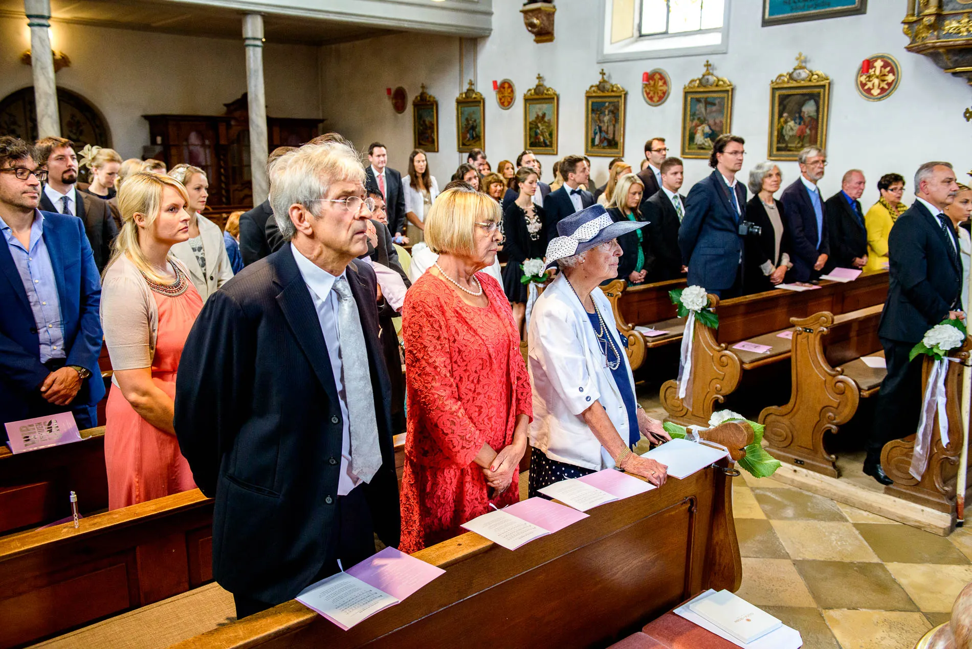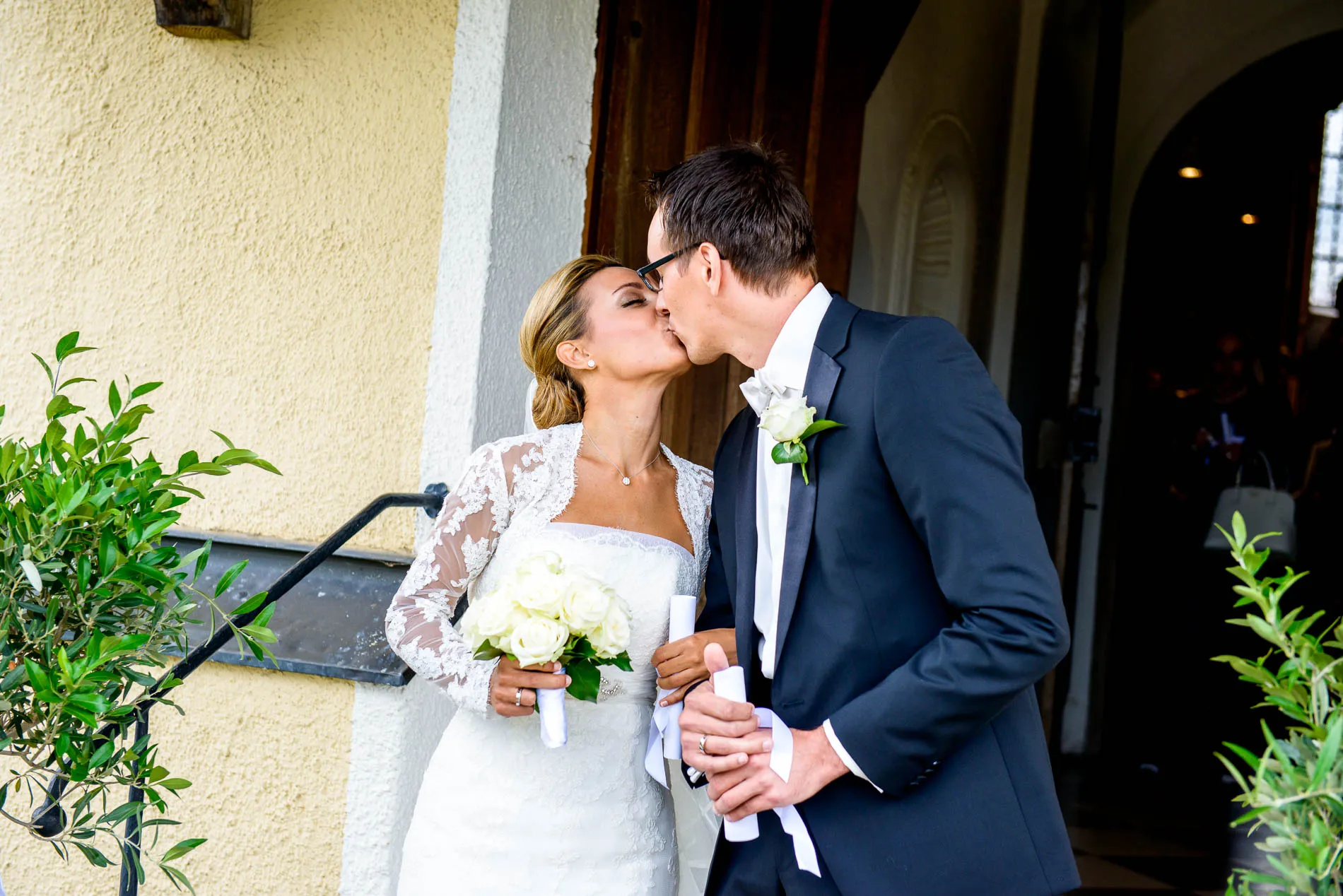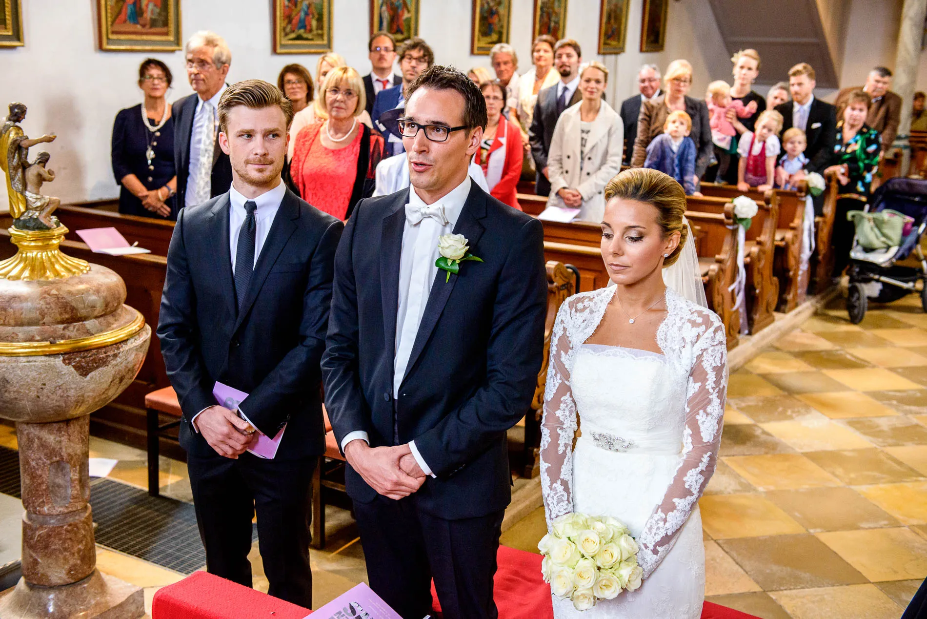 Die Hochzeit begann klassisch und zugleich sehr persönlich: In der Kirche St. Martin in Waakirchen wurde die Braut von ihrem Vater zum Altar geführt. Ein Moment, der nie an Wirkung verliert – egal, wie viele Hochzeiten ich als Hochzeitsfotograf schon begleiten durfte. Das Brautpaar entschied sich, die Glückwünsche nicht direkt vor der Kirche entgegenzunehmen, sondern erst später im Margarethenhof. Eine kluge Entscheidung, denn mit einem Glas Sekt oder Aperol Spritz in der Hand lässt es sich bekanntlich entspannter warten, bis man an der Reihe ist.