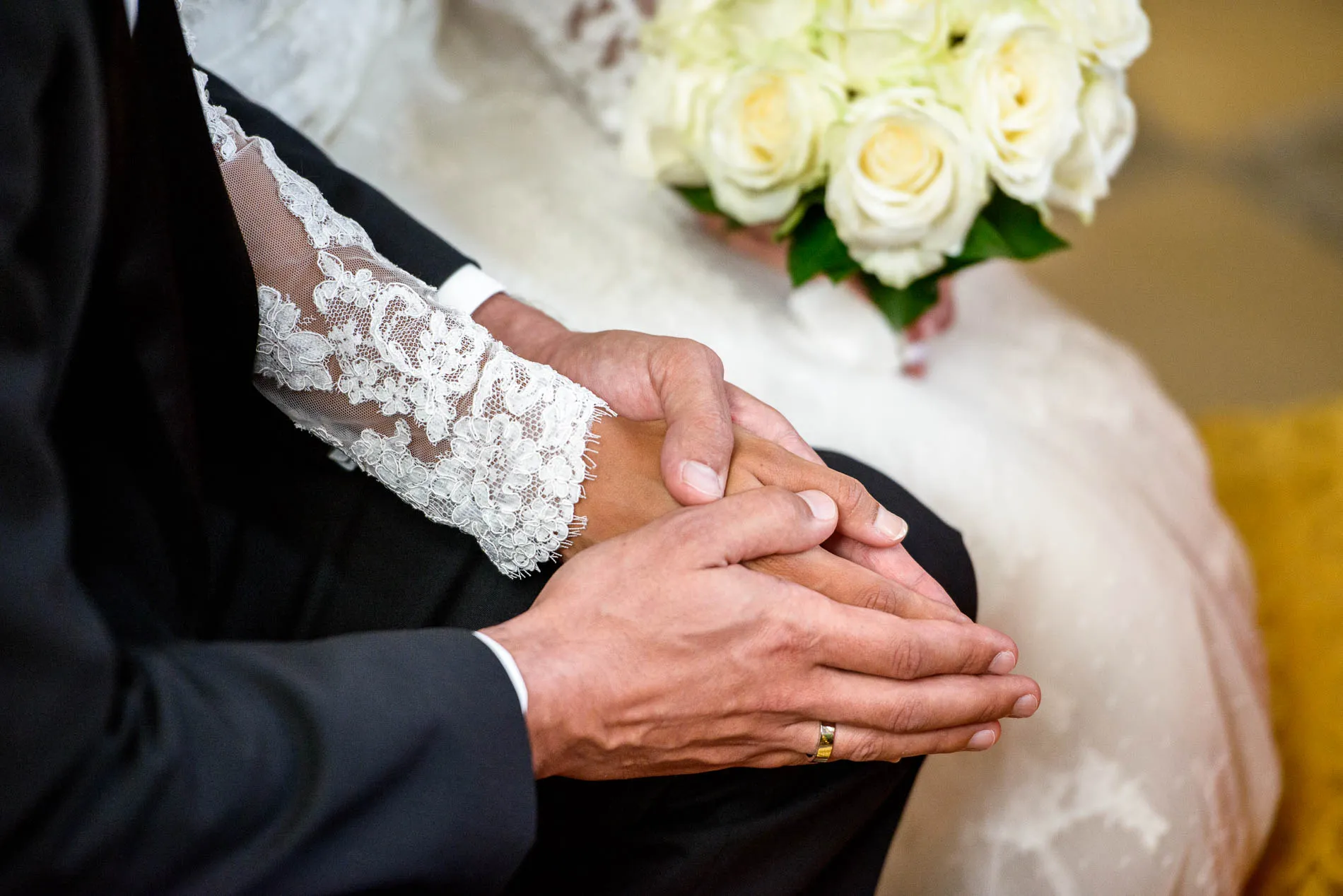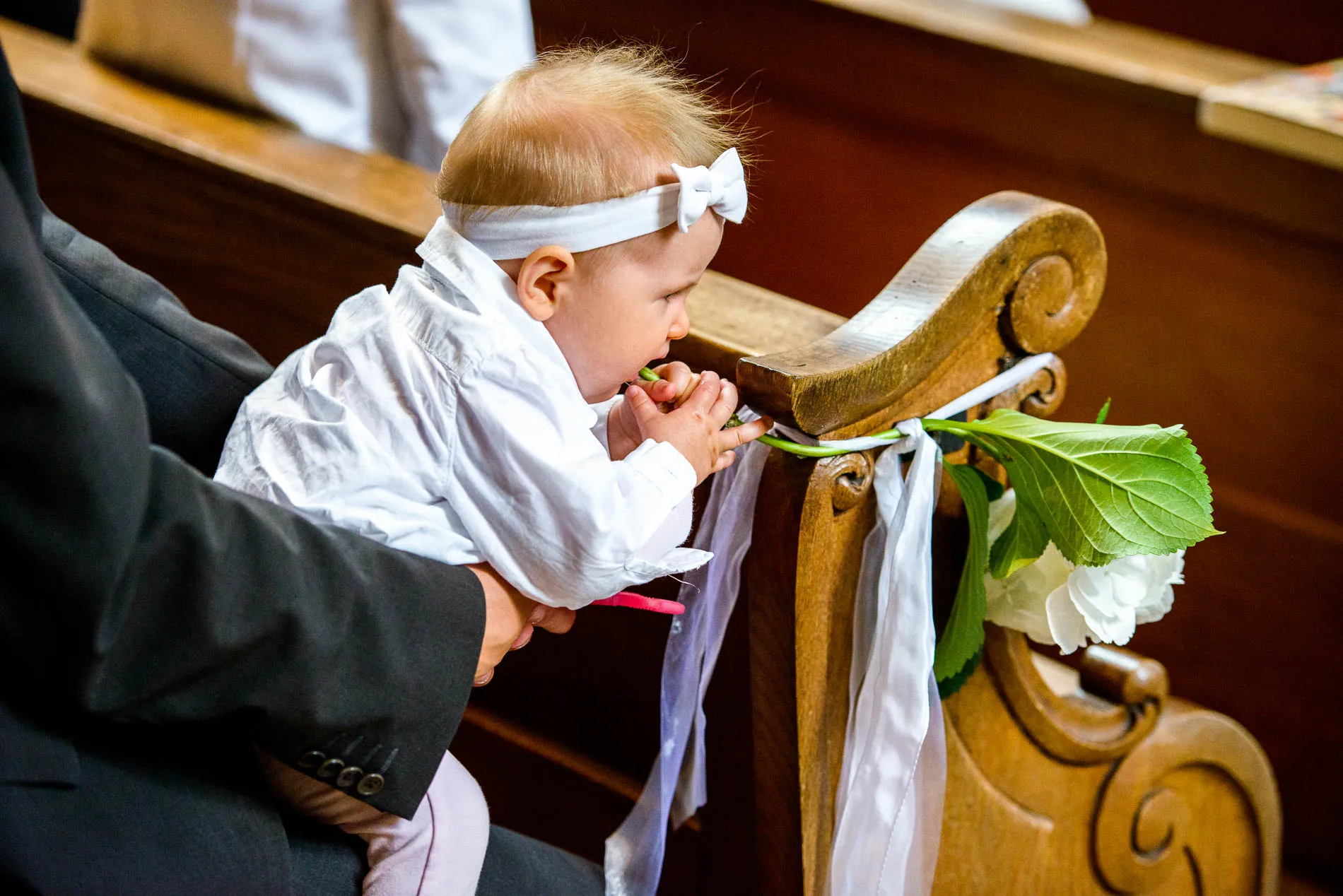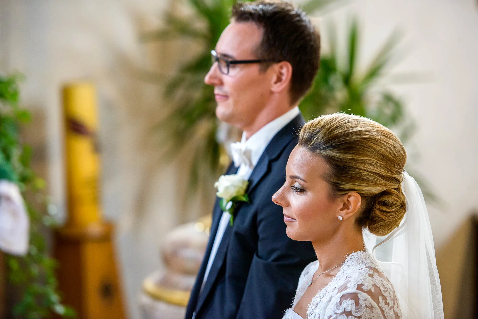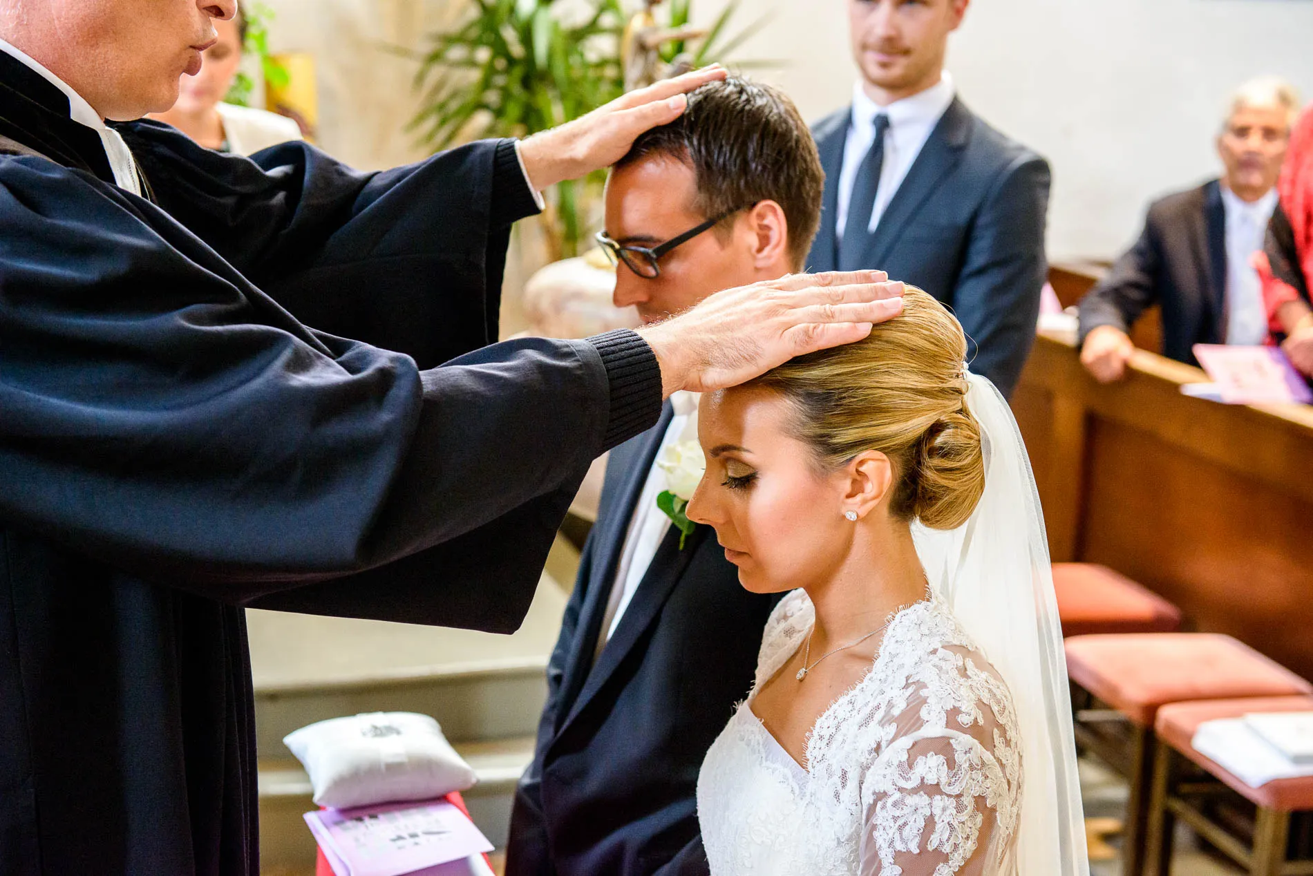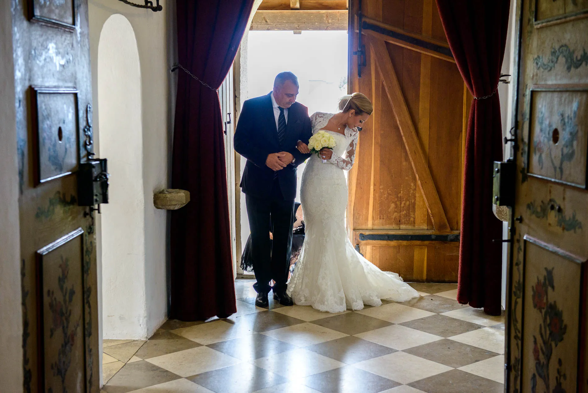 Die Hochzeit begann klassisch und zugleich sehr persönlich: In der Kirche St. Martin in Waakirchen wurde die Braut von ihrem Vater zum Altar geführt. Ein Moment, der nie an Wirkung verliert – egal, wie viele Hochzeiten ich als Hochzeitsfotograf schon begleiten durfte. Das Brautpaar entschied sich, die Glückwünsche nicht direkt vor der Kirche entgegenzunehmen, sondern erst später im Margarethenhof. Eine kluge Entscheidung, denn mit einem Glas Sekt oder Aperol Spritz in der Hand lässt es sich bekanntlich entspannter warten, bis man an der Reihe ist.