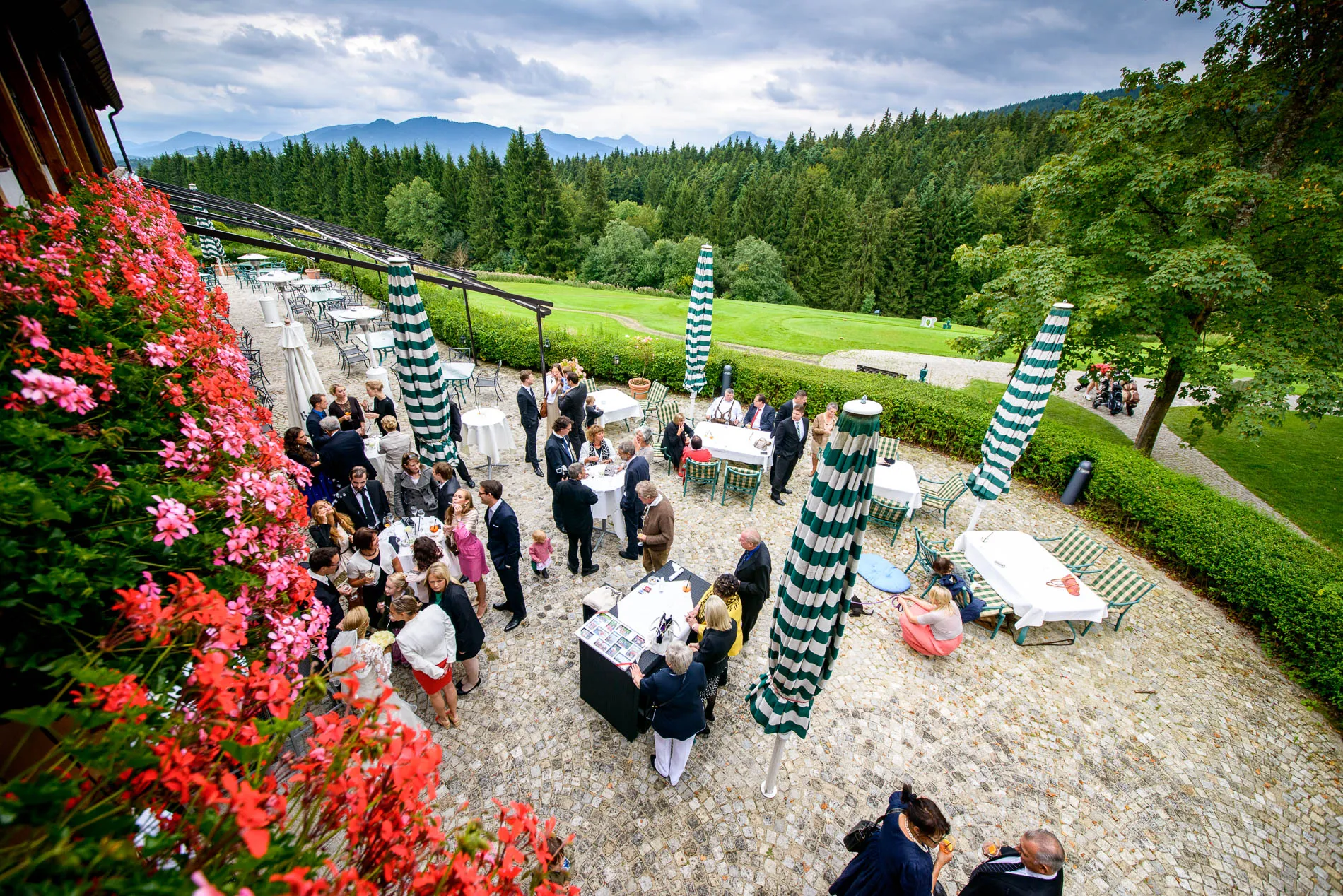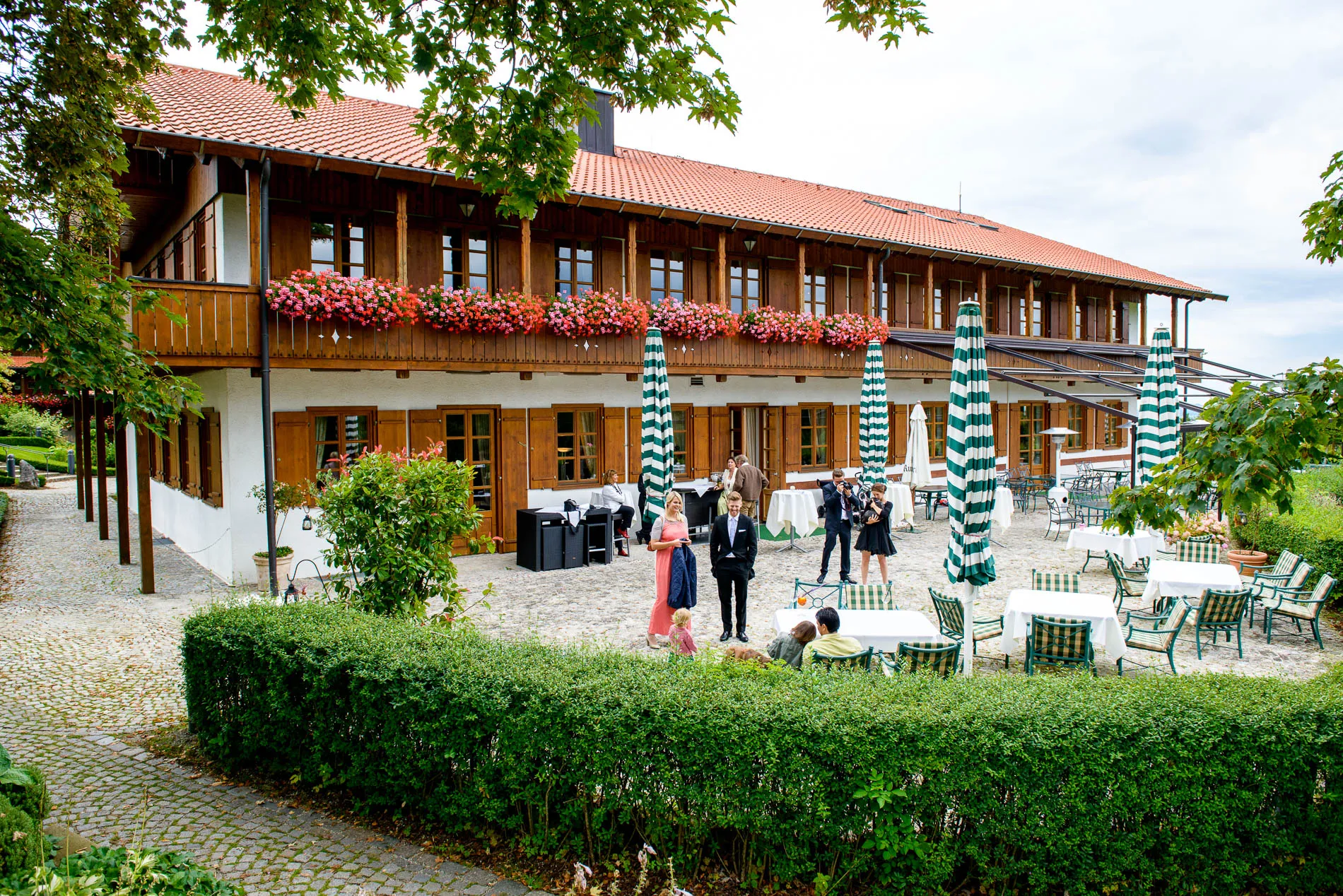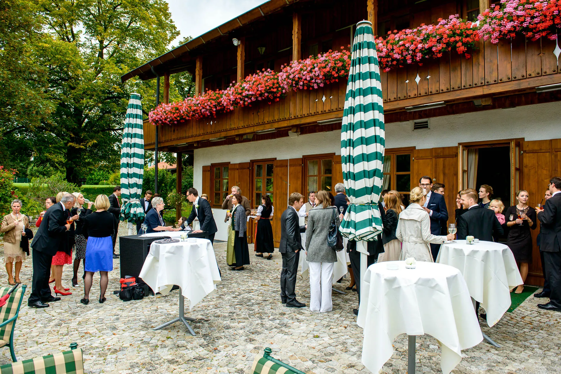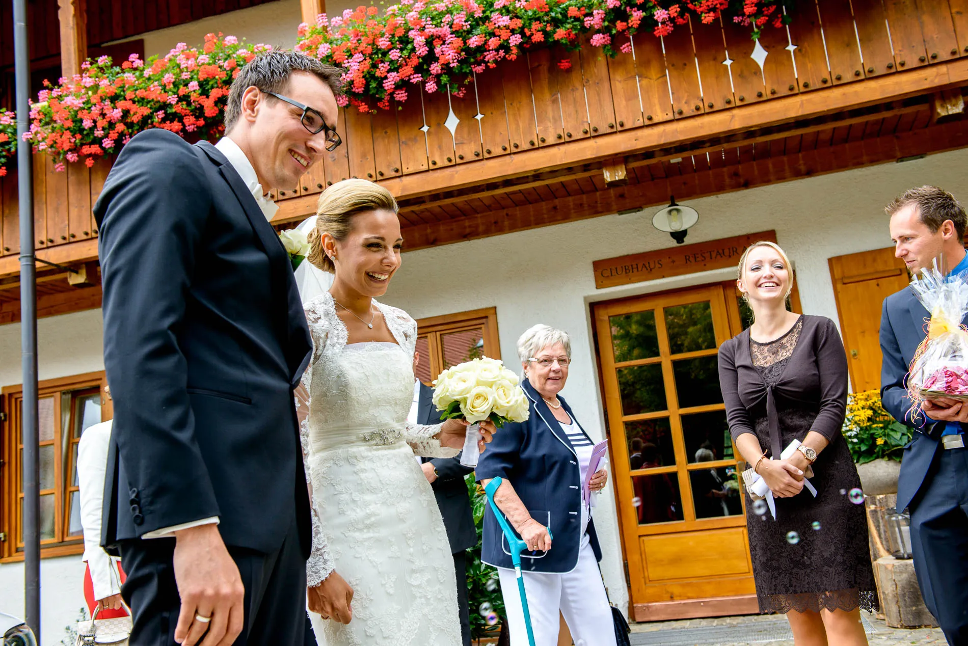 Nur wenige Kilometer entfernt erwartete die Gäste der Margarethenhof in Marienstein. Das Golfresort liegt idyllisch eingebettet in eine hügelige Landschaft, die an diesem Tag zwar nicht von der Sonne verwöhnt wurde, aber dennoch ihren Charme versprühte. Auf der Terrasse wurde angestoßen, gratuliert und gelacht. Die Kinder übernahmen zunächst den „Seifenblasenjob“ – mit großem Eifer und wenig Koordination. Später mischten sich auch die Erwachsenen ein, was zu einigen amüsanten Szenen führte.