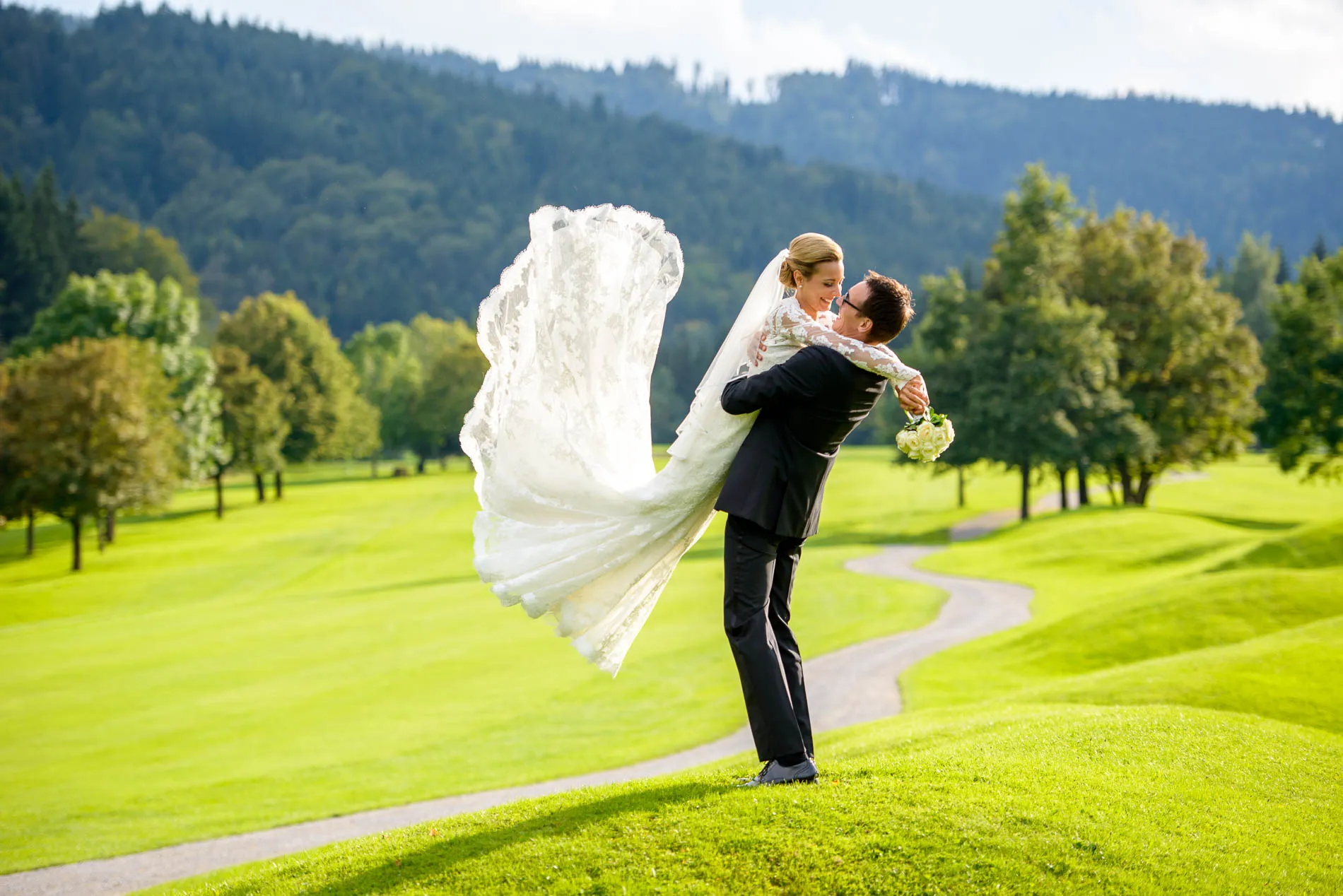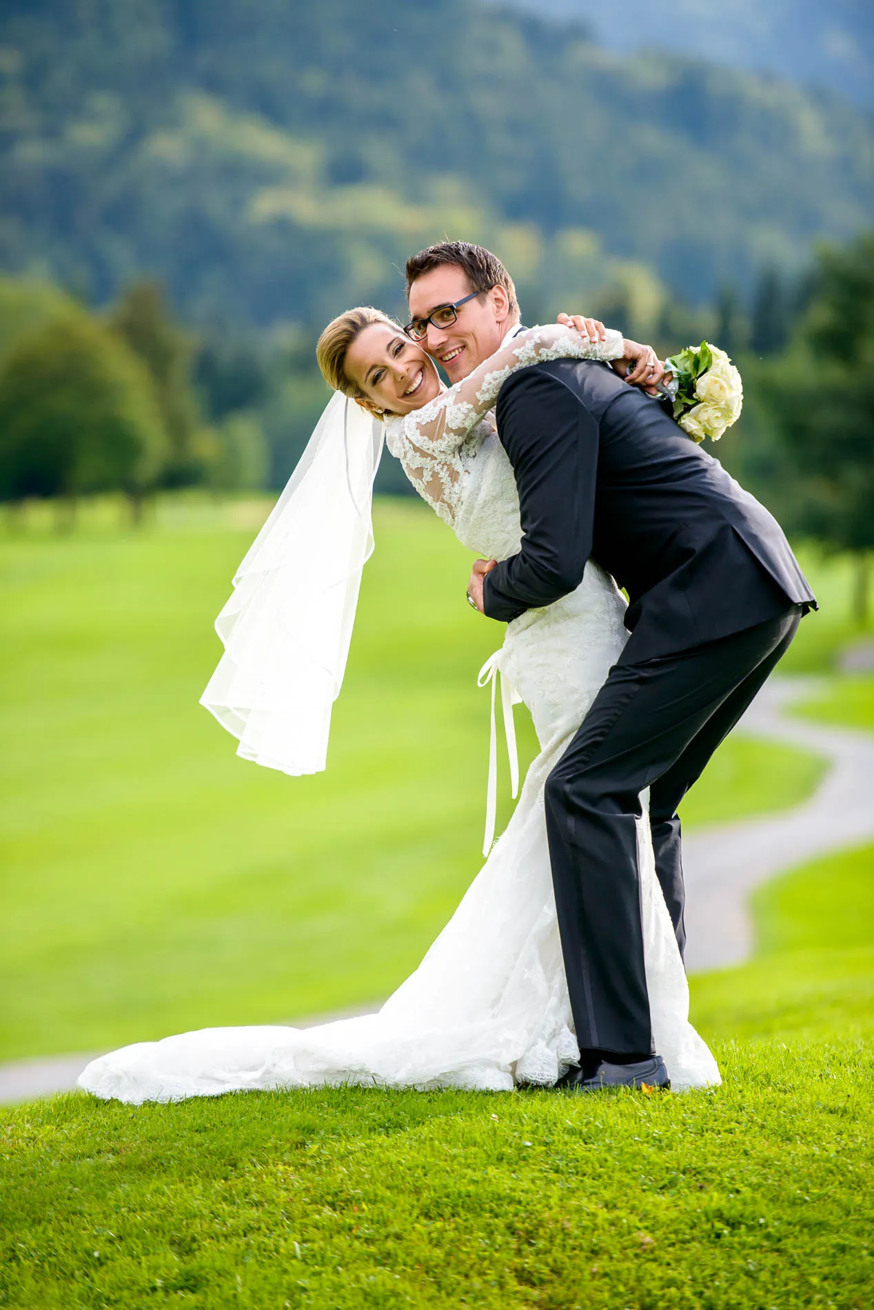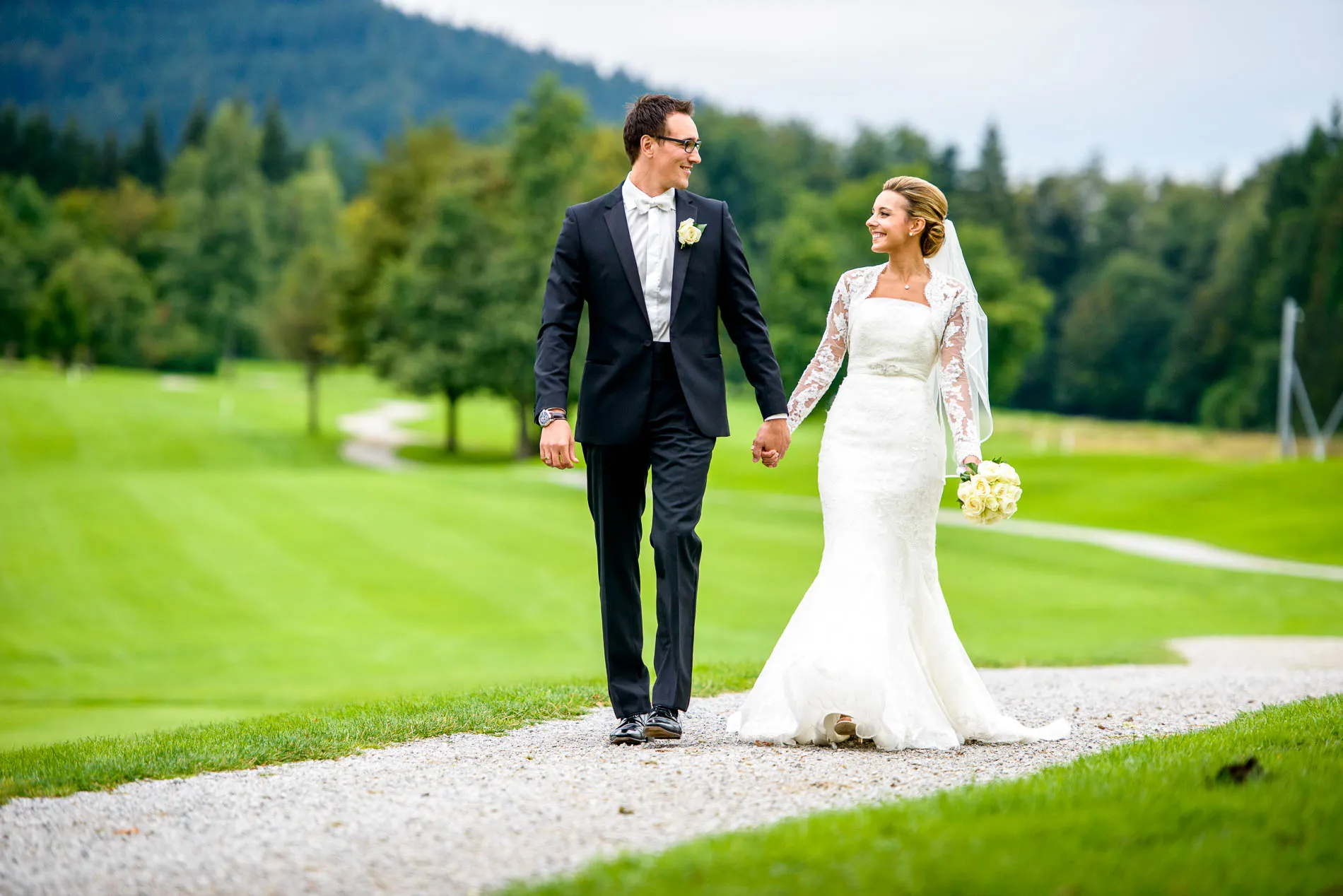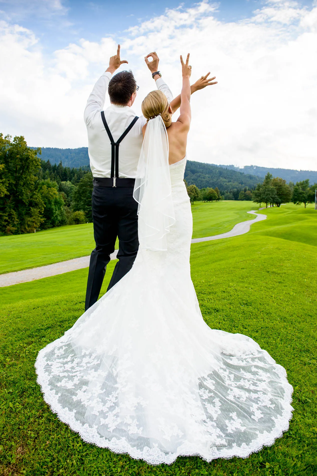 Der Margarethenhof bietet mit seiner weitläufigen Anlage eine Kulisse, die fast schon surreal wirkt – manche würden sagen, ein wenig wie die Landschaft aus einer bekannten Kinderserie mit bunten Hügeln. Golf gespielt wurde zwar nicht, aber dafür hatten wir umso mehr Spaß beim Fotografieren. Das Brautpaar brachte eigene Ideen ein, die ich gerne aufgriff. Schließlich entstehen die Bilder nicht für mich, sondern für die beiden – und genau das macht jede Hochzeit einzigartig.