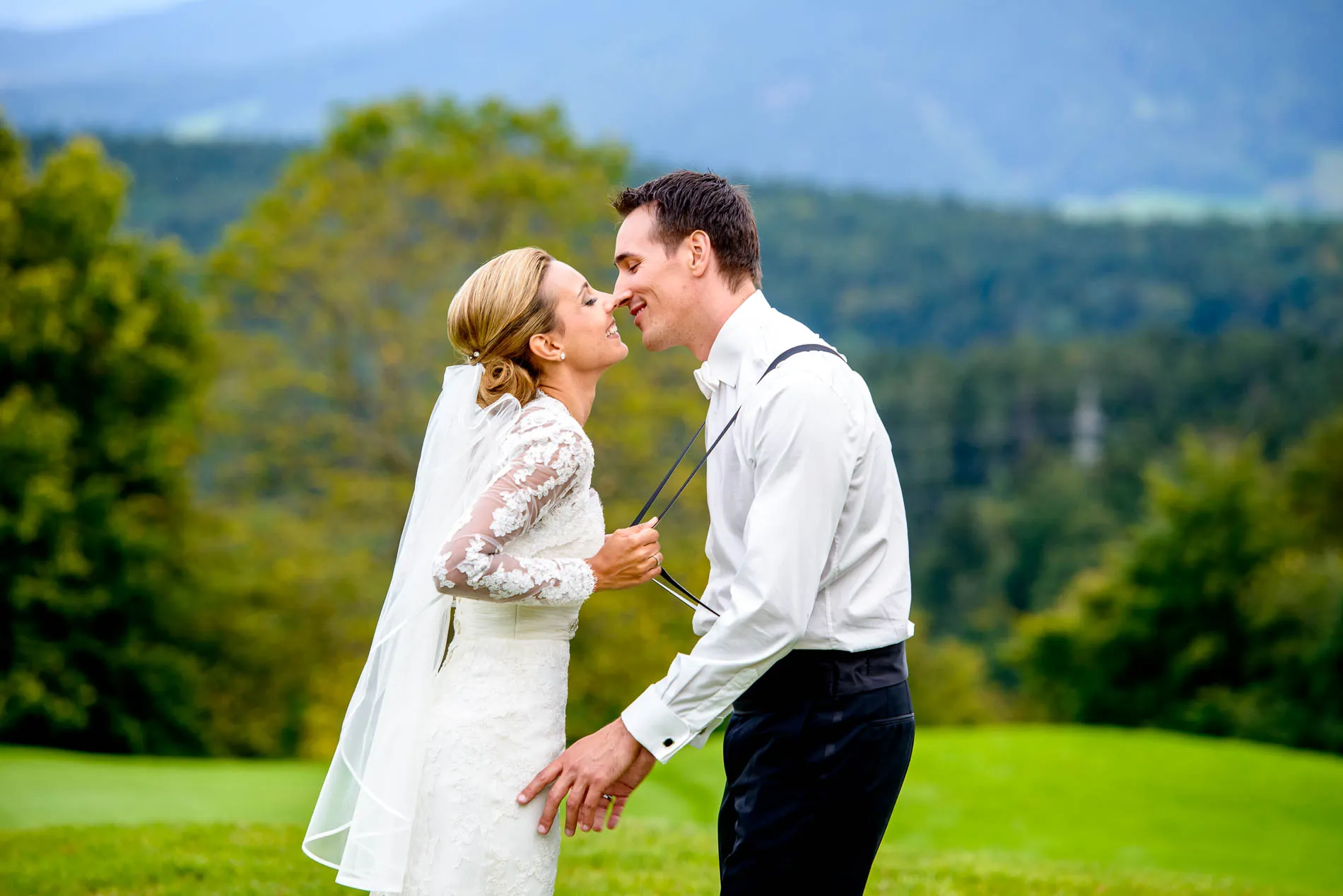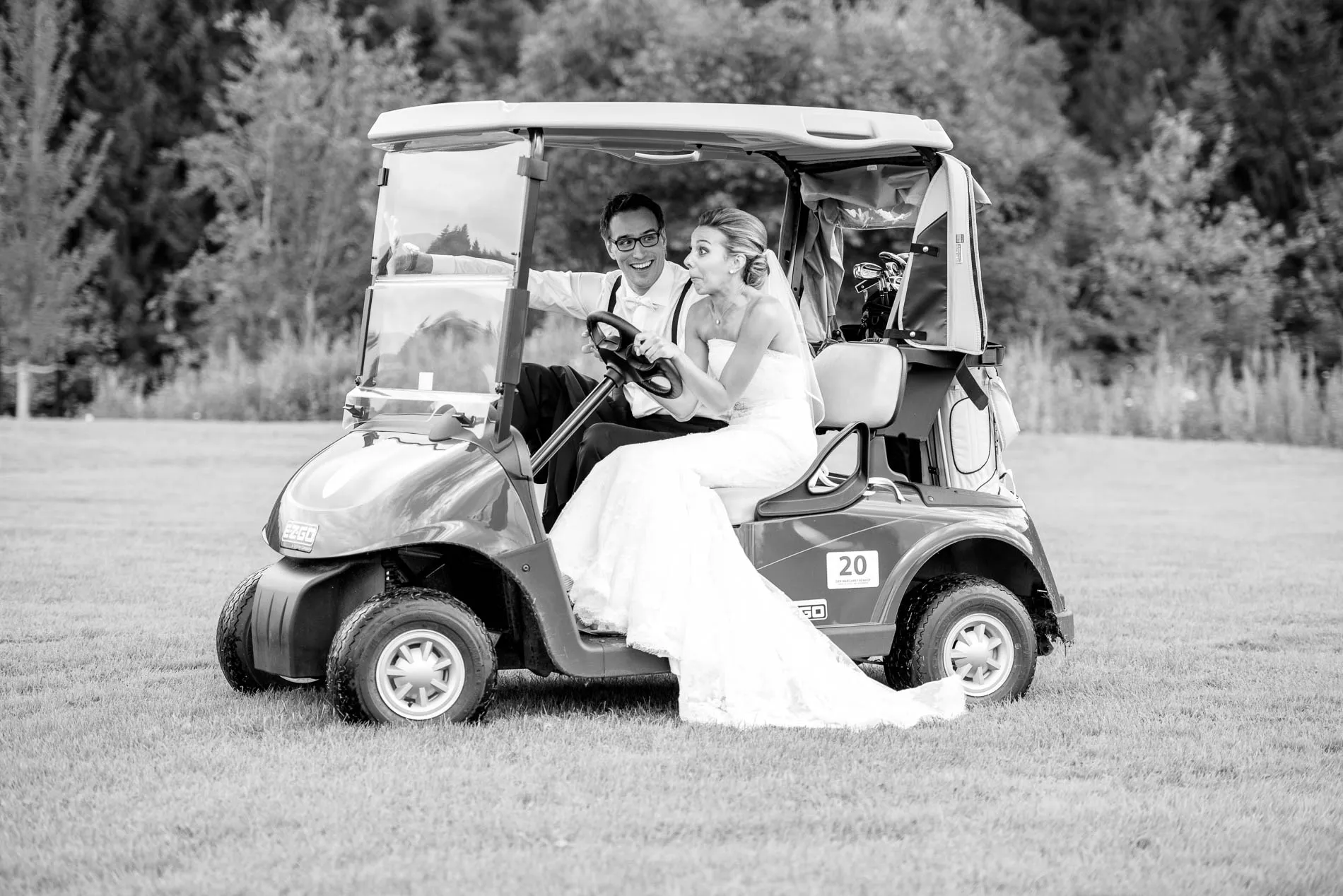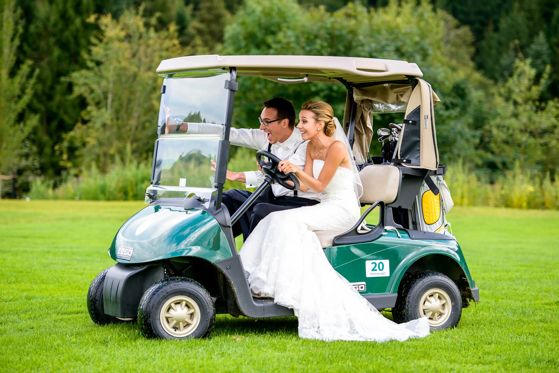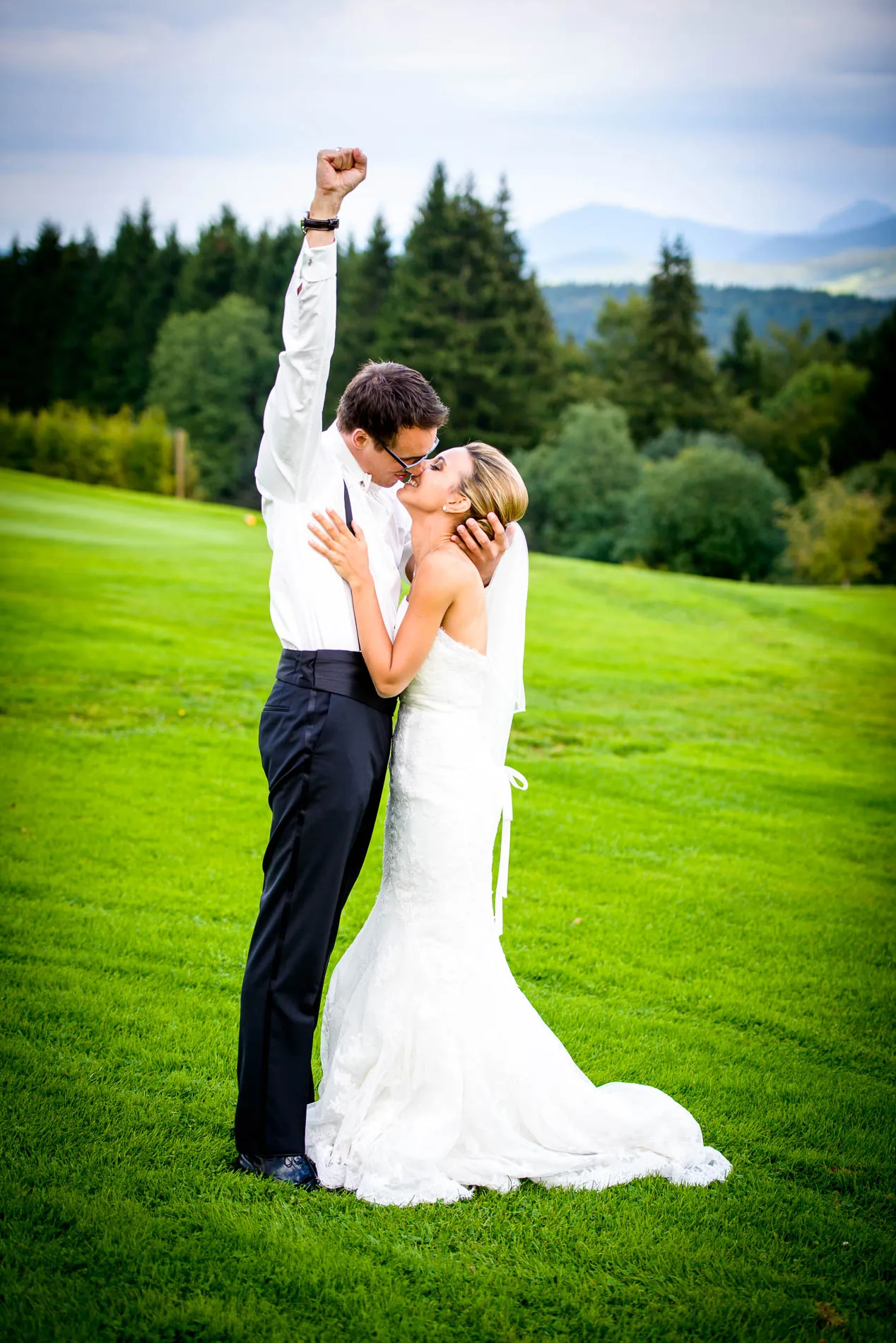 Der Margarethenhof bietet mit seiner weitläufigen Anlage eine Kulisse, die fast schon surreal wirkt – manche würden sagen, ein wenig wie die Landschaft aus einer bekannten Kinderserie mit bunten Hügeln. Golf gespielt wurde zwar nicht, aber dafür hatten wir umso mehr Spaß beim Fotografieren. Das Brautpaar brachte eigene Ideen ein, die ich gerne aufgriff. Schließlich entstehen die Bilder nicht für mich, sondern für die beiden – und genau das macht jede Hochzeit einzigartig.