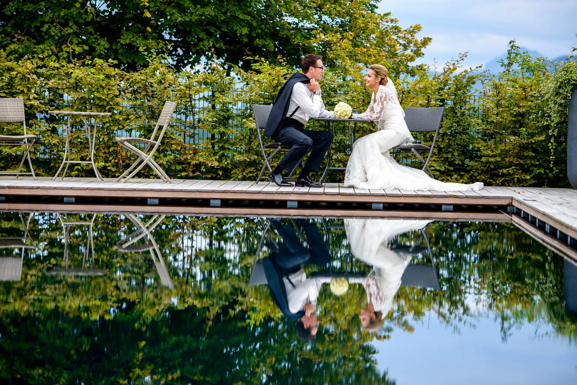 Während die Gäste mit Bussen zum Tegernsee gebracht wurden, um dort eine Rundfahrt auf dem See zu genießen, nutzte ich die Gelegenheit für ein ausgiebiges Brautpaarshooting. Eine perfekte Lösung: Die Gäste waren bestens unterhalten, und wir hatten die nötige Ruhe für kreative Aufnahmen.