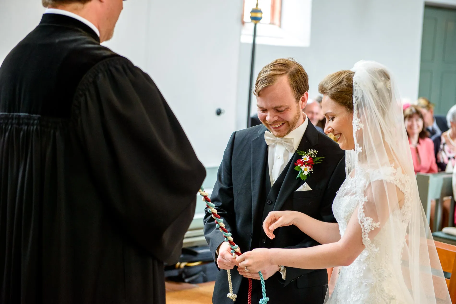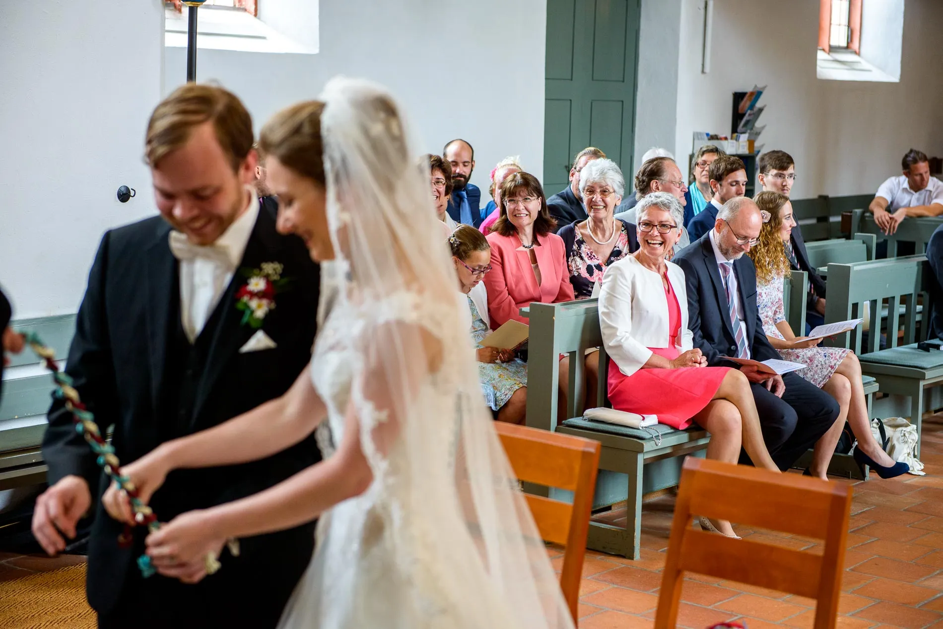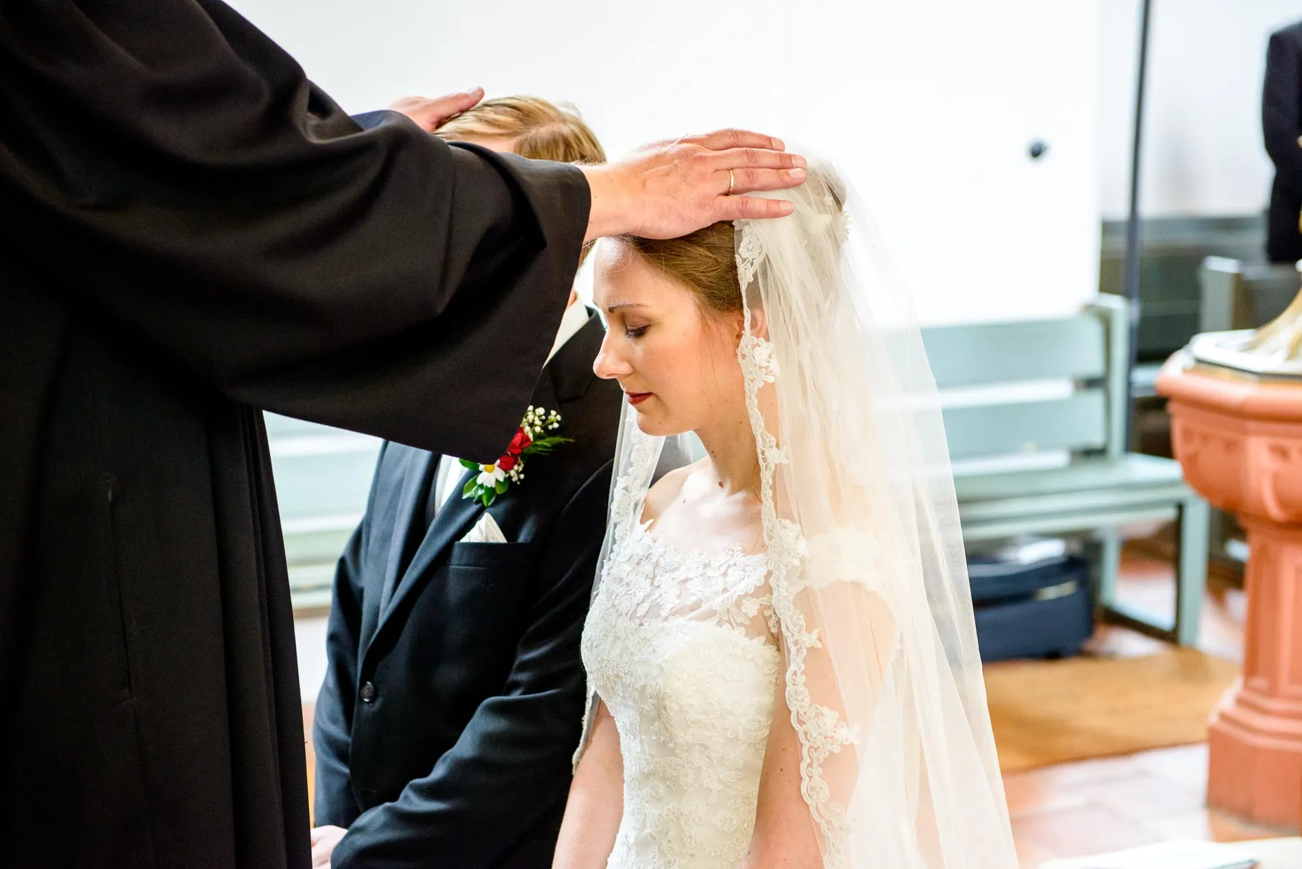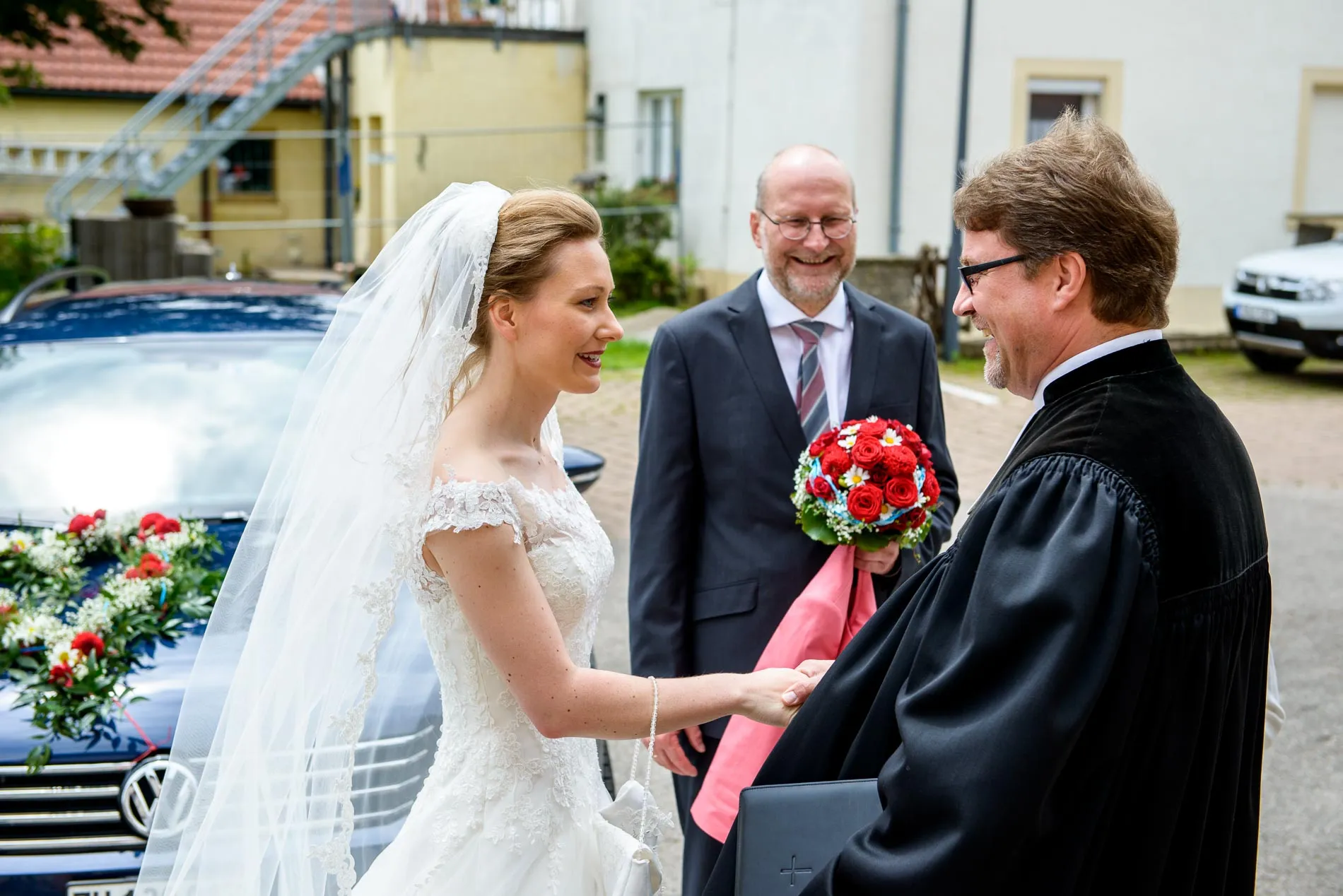 Gestartet hat der Tag im Stadtteil Schalkhausen, genauer gesagt in der evangelischen Kirche St. Nikolaus. Ein charmantes Gotteshaus mit langer Geschichte, das sich trotz seiner bescheidenen Größe als würdiger Rahmen für eine internationale Eheschließung erwies. Die Braut wurde traditionell vom Vater zum Altar geführt, während der Bräutigam vorne wartete – ein Bild, das selbst nach Hunderten Hochzeiten immer wieder berührt.