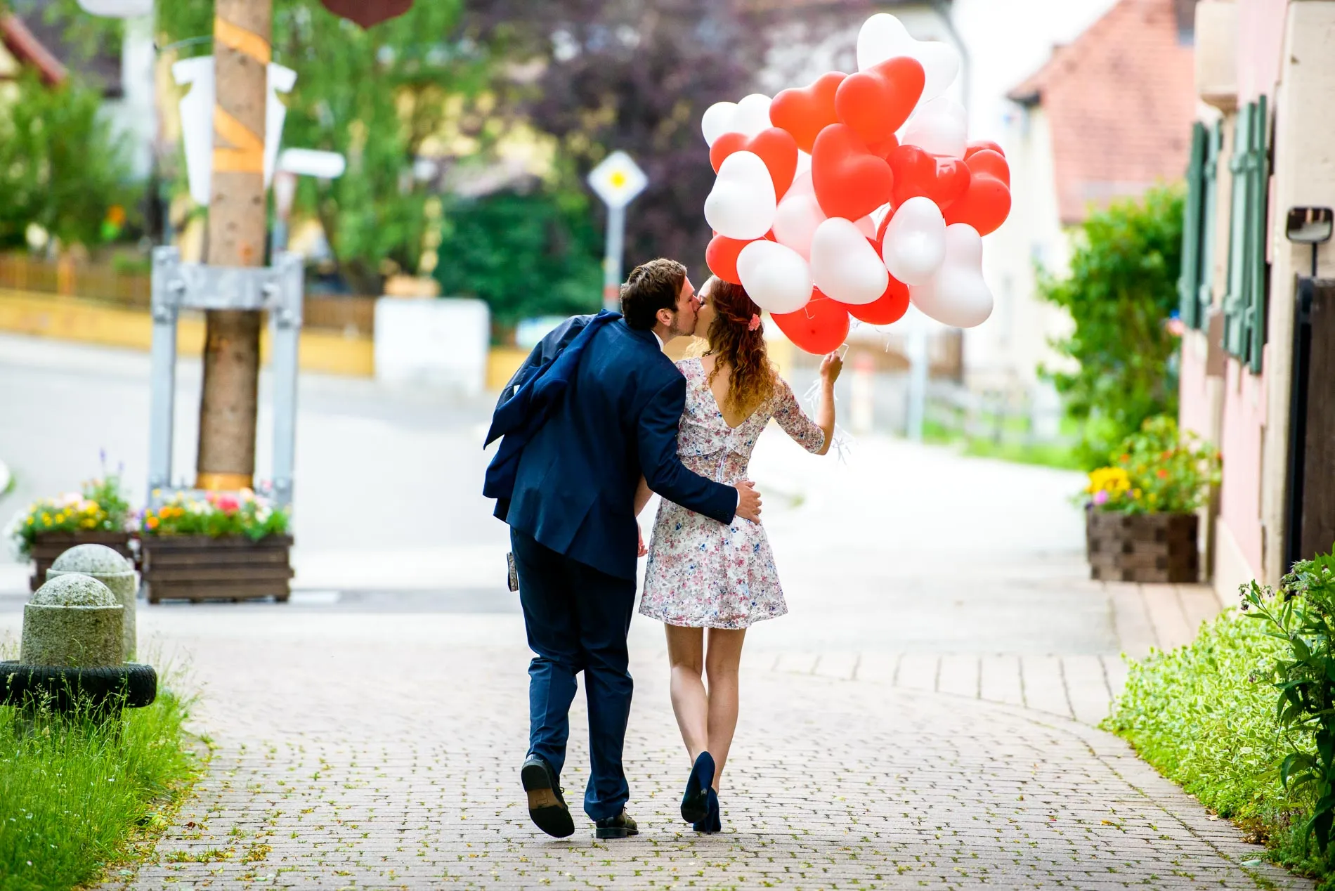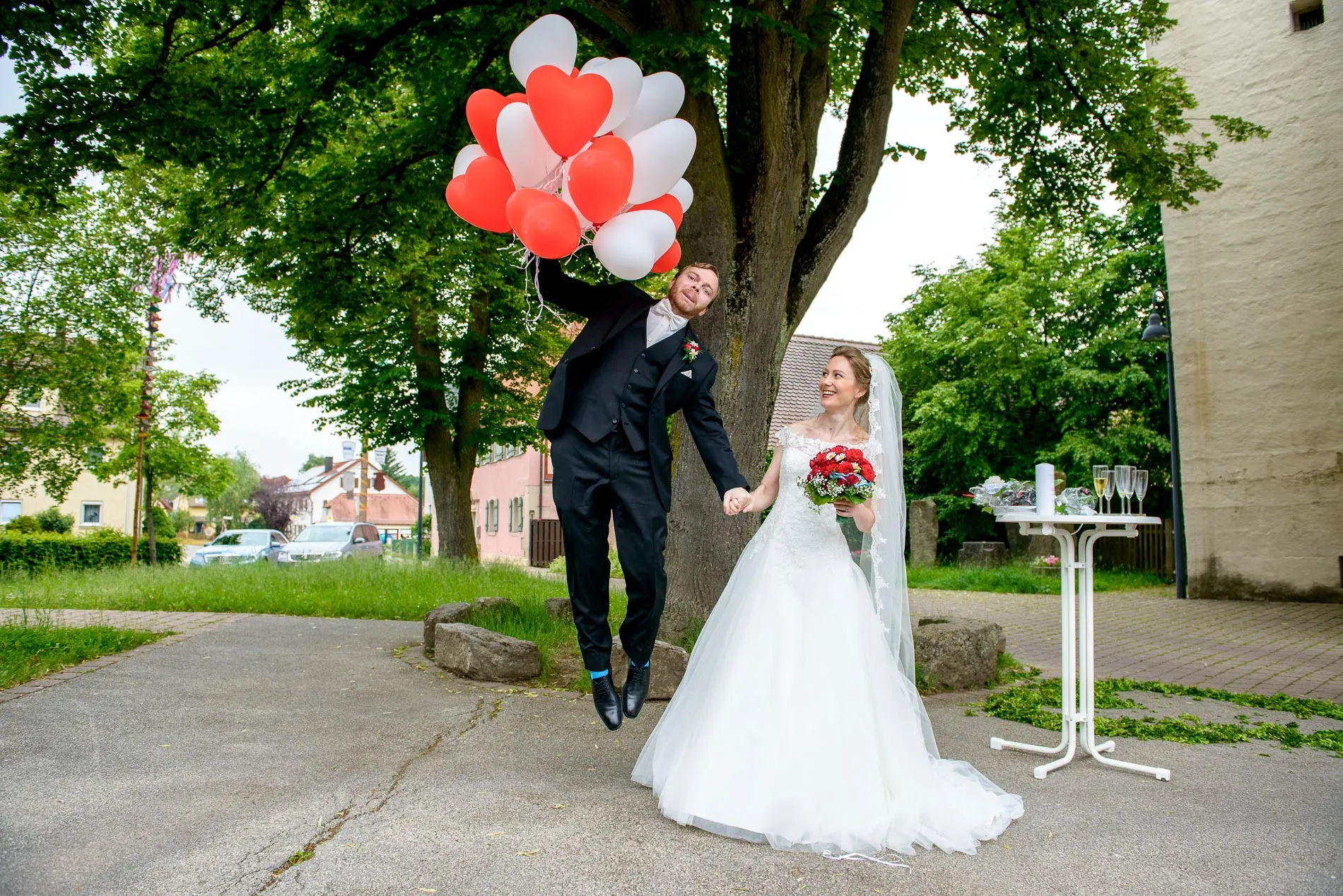 Nach den Glückwünschen gab es einen improvisierten Sektempfang direkt vor Ort. Und weil britischer Humor bekanntlich keine Grenzen kennt, bestand der Bräutigam auf einem Foto, bei dem er scheinbar von zwanzig Herzchenballons in die Lüfte gezogen wird. Die Braut war erleichtert, dass er nicht wirklich davonflog – ich übrigens auch, denn Ballonrettung gehört nicht zu meinem fotografischen Servicepaket.