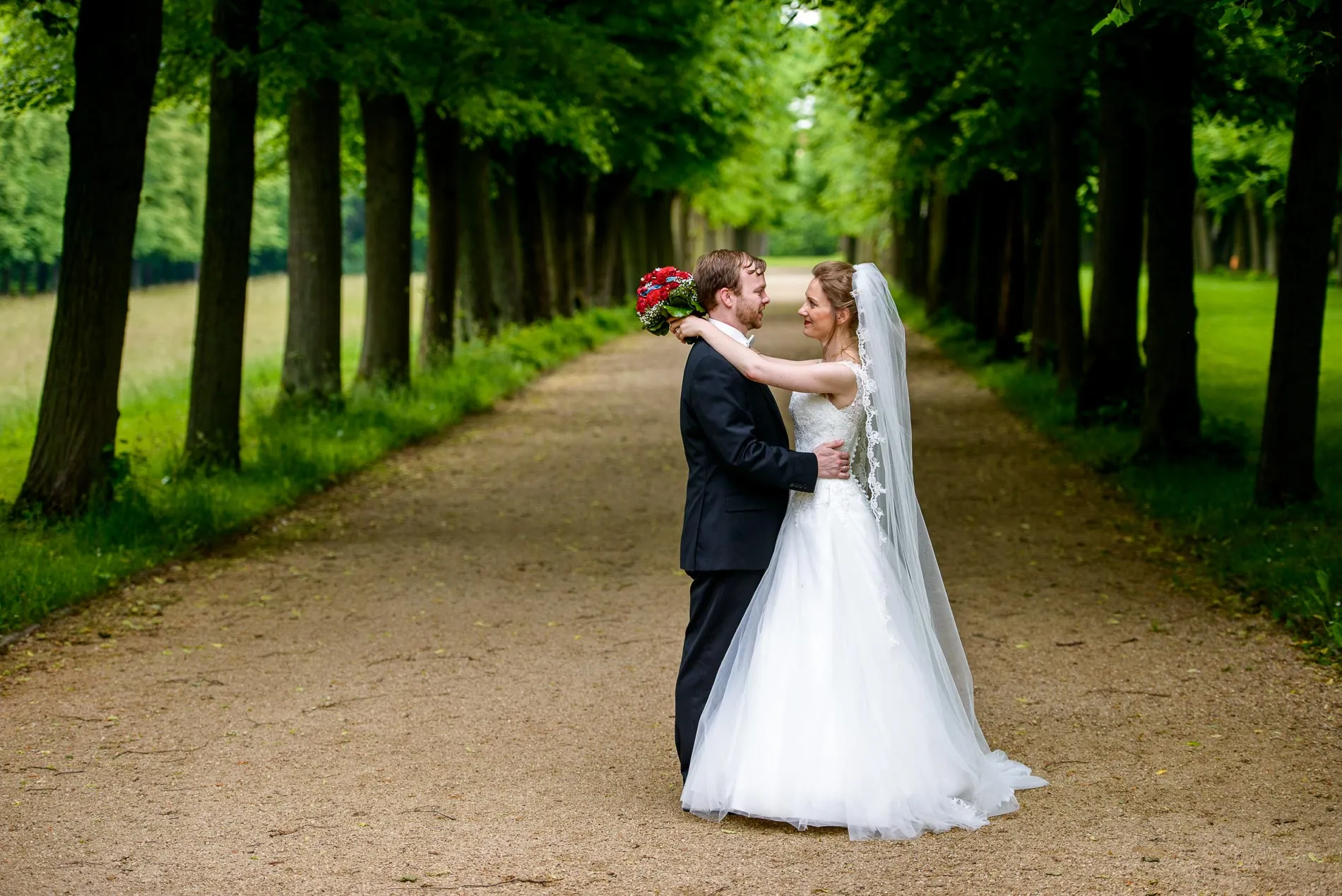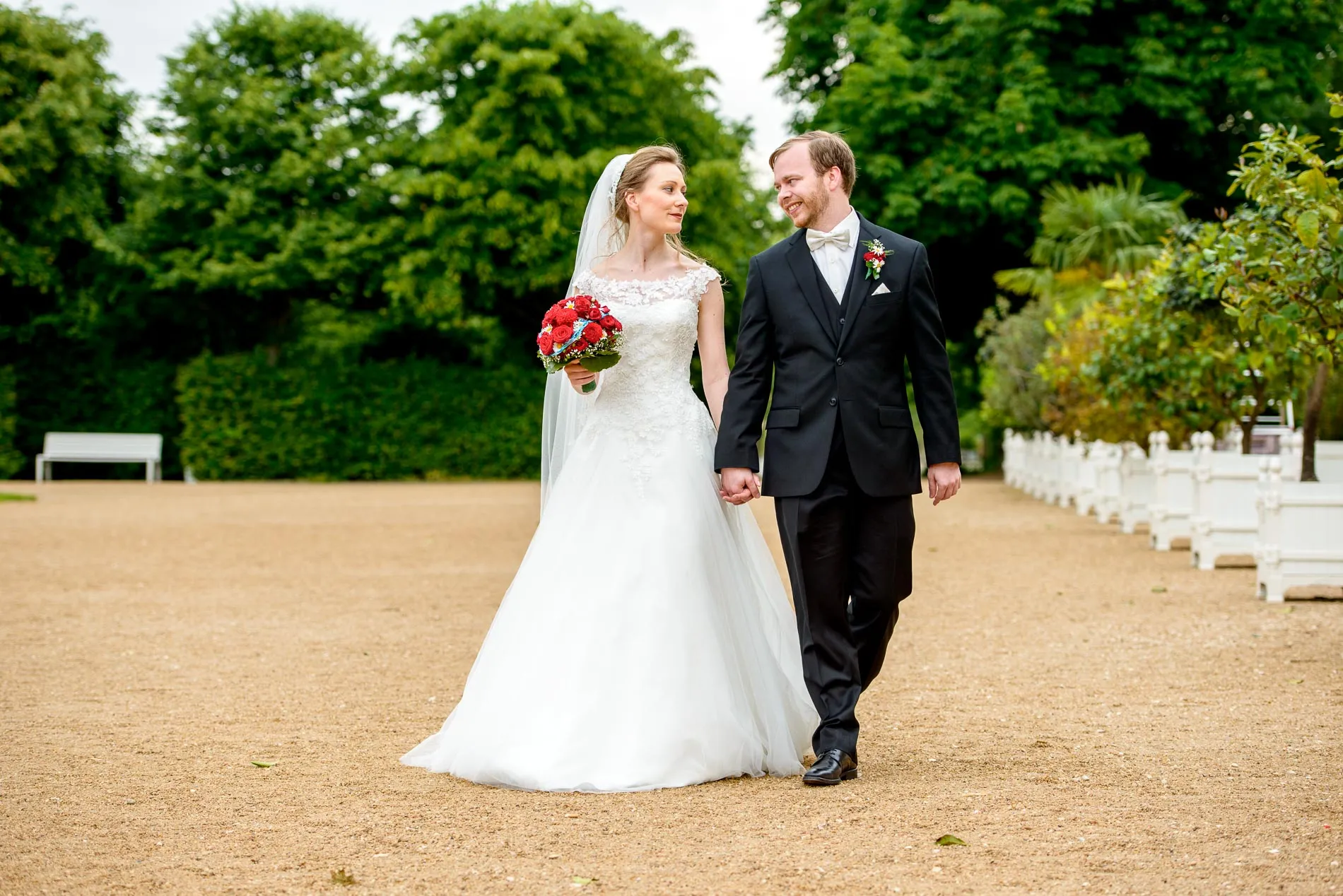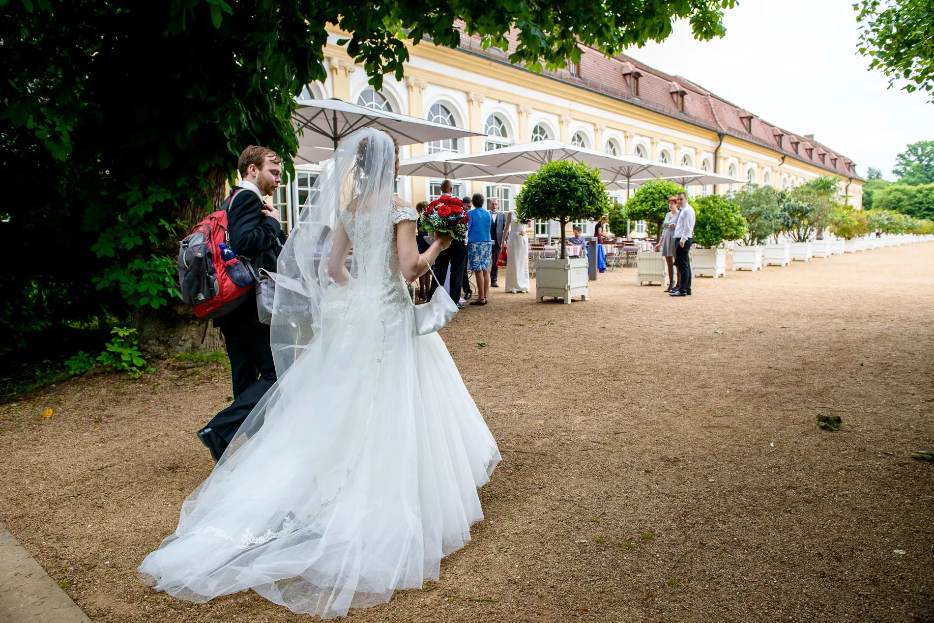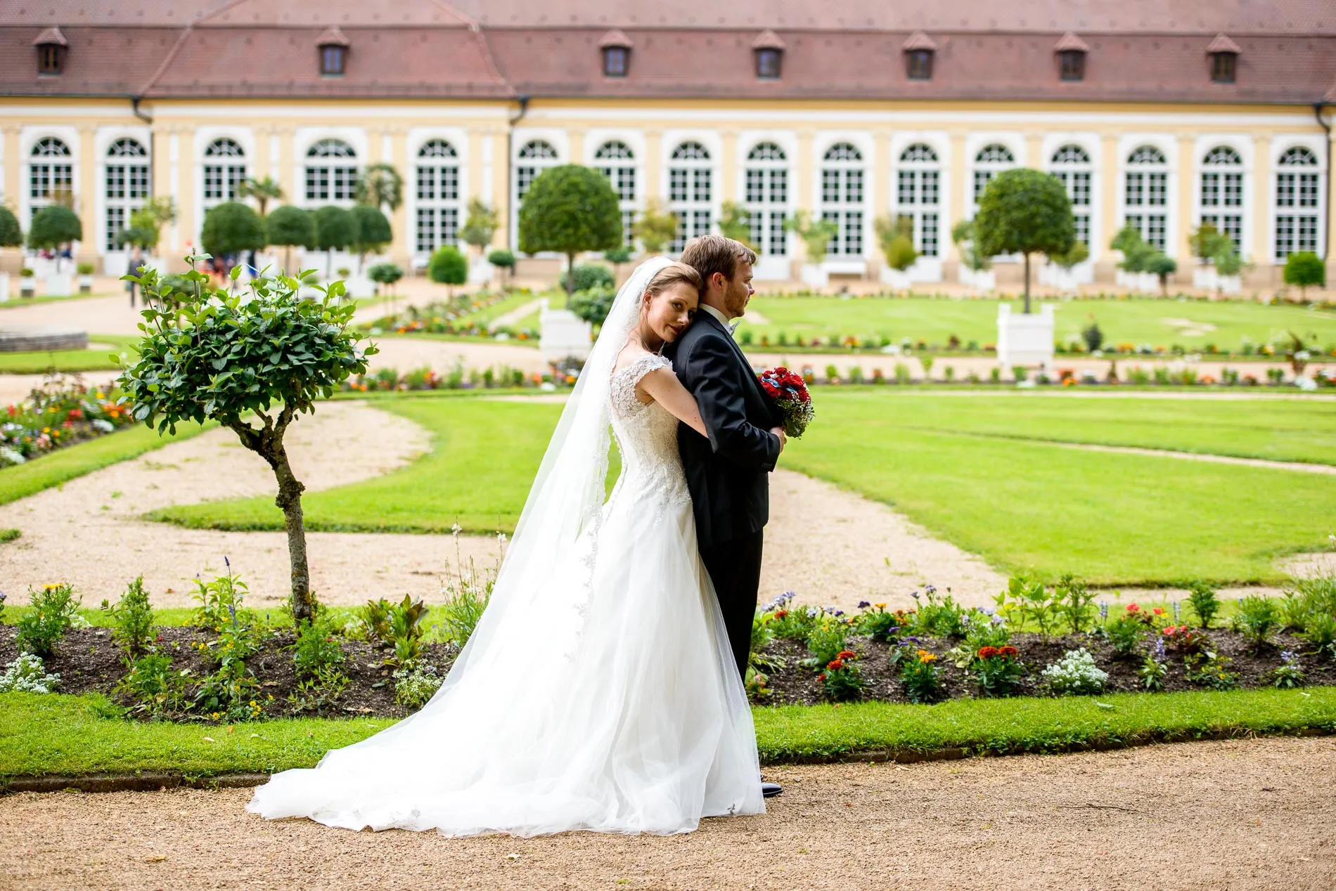 Zwischendurch nutzten wir den Hofgarten für die Brautpaarfotos. Die barocke Anlage mit ihren Kolonnaden, Kübelpflanzen und verschlungenen Wegen ist wie geschaffen für romantische Bilder. Während wir fotografierten, konnten die Gäste die Beine vertreten – eine Win‑Win‑Situation: das Brautpaar bekam schöne Fotos, die Gäste frische Luft.