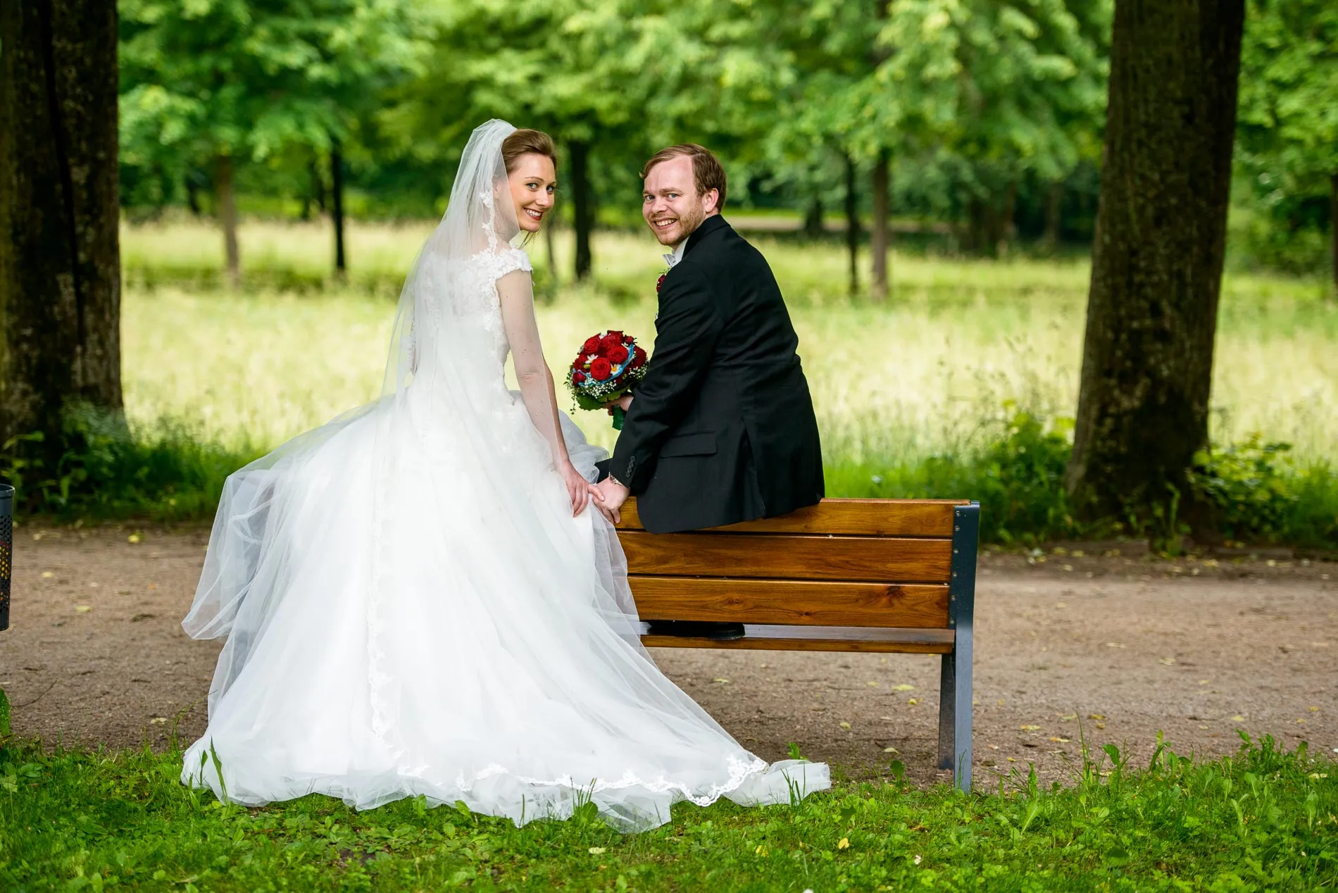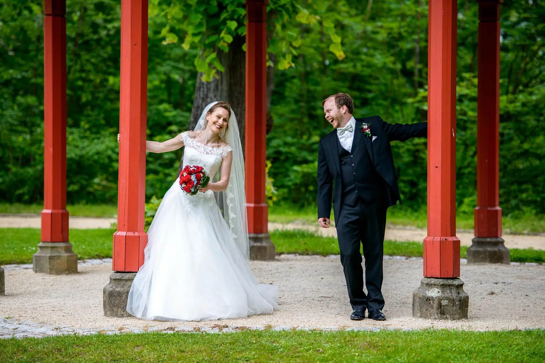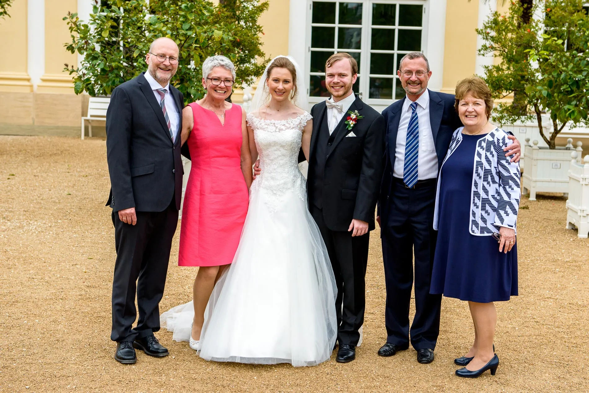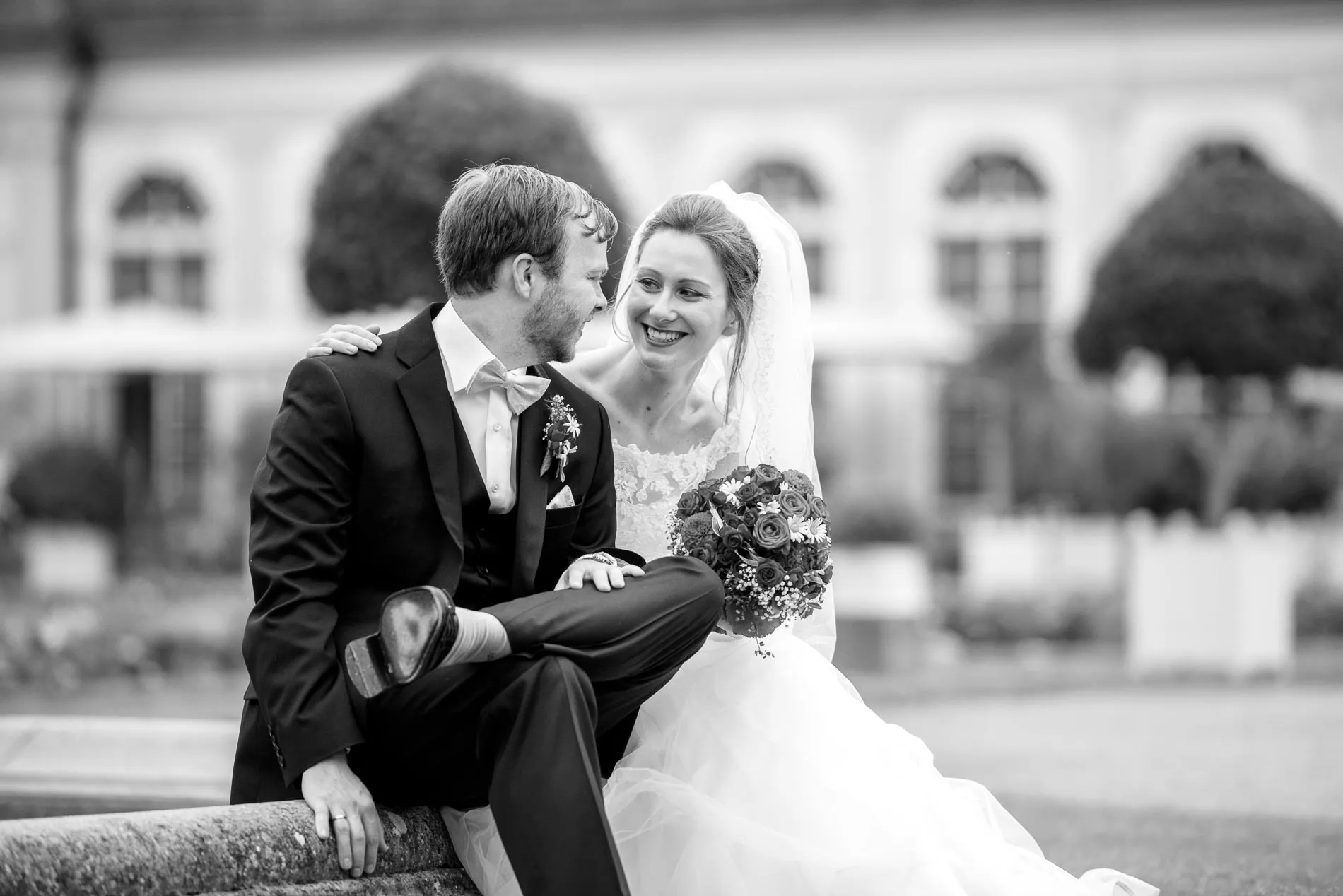 Zwischendurch nutzten wir den Hofgarten für die Brautpaarfotos. Die barocke Anlage mit ihren Kolonnaden, Kübelpflanzen und verschlungenen Wegen ist wie geschaffen für romantische Bilder. Während wir fotografierten, konnten die Gäste die Beine vertreten – eine Win‑Win‑Situation: das Brautpaar bekam schöne Fotos, die Gäste frische Luft.