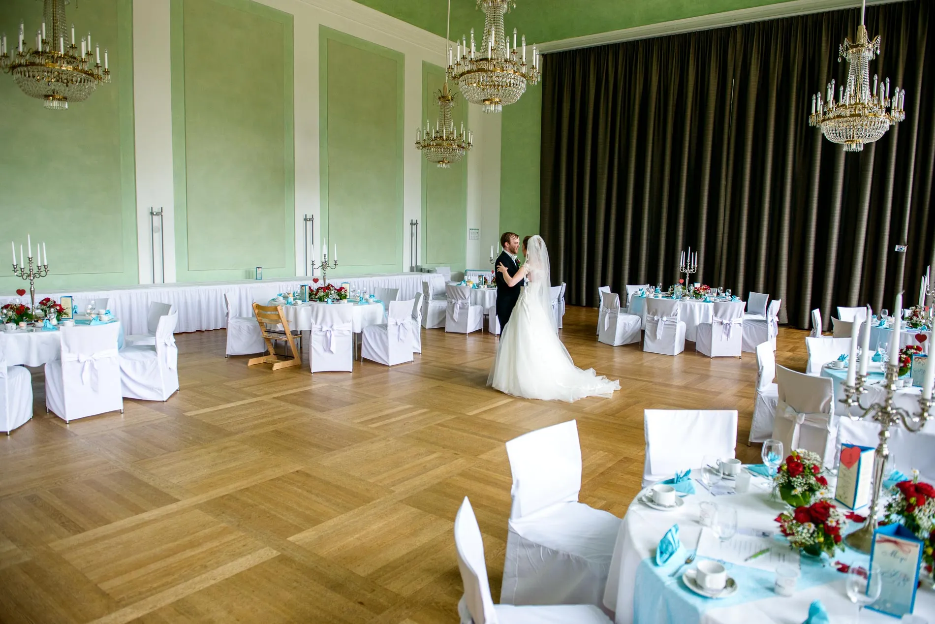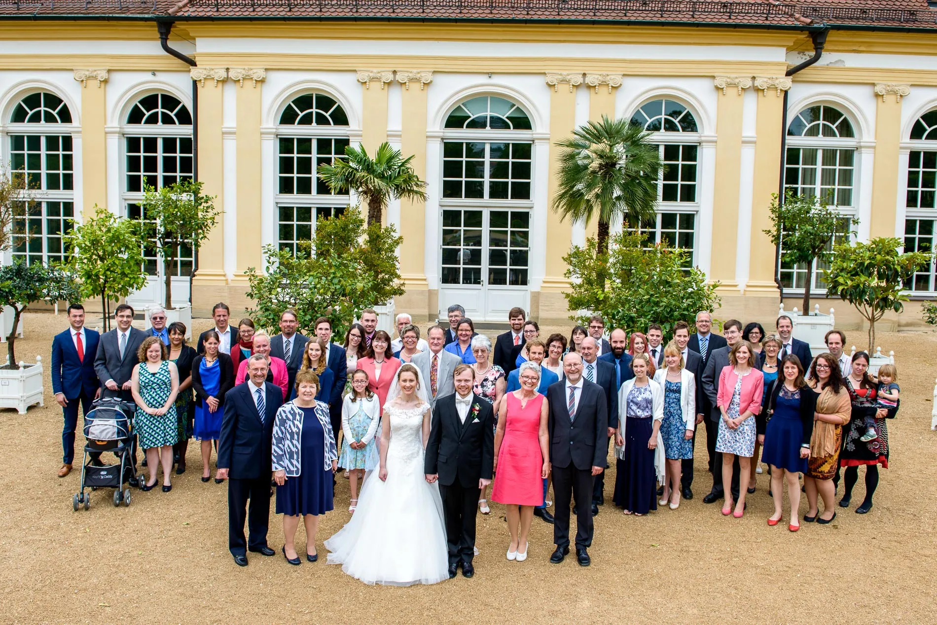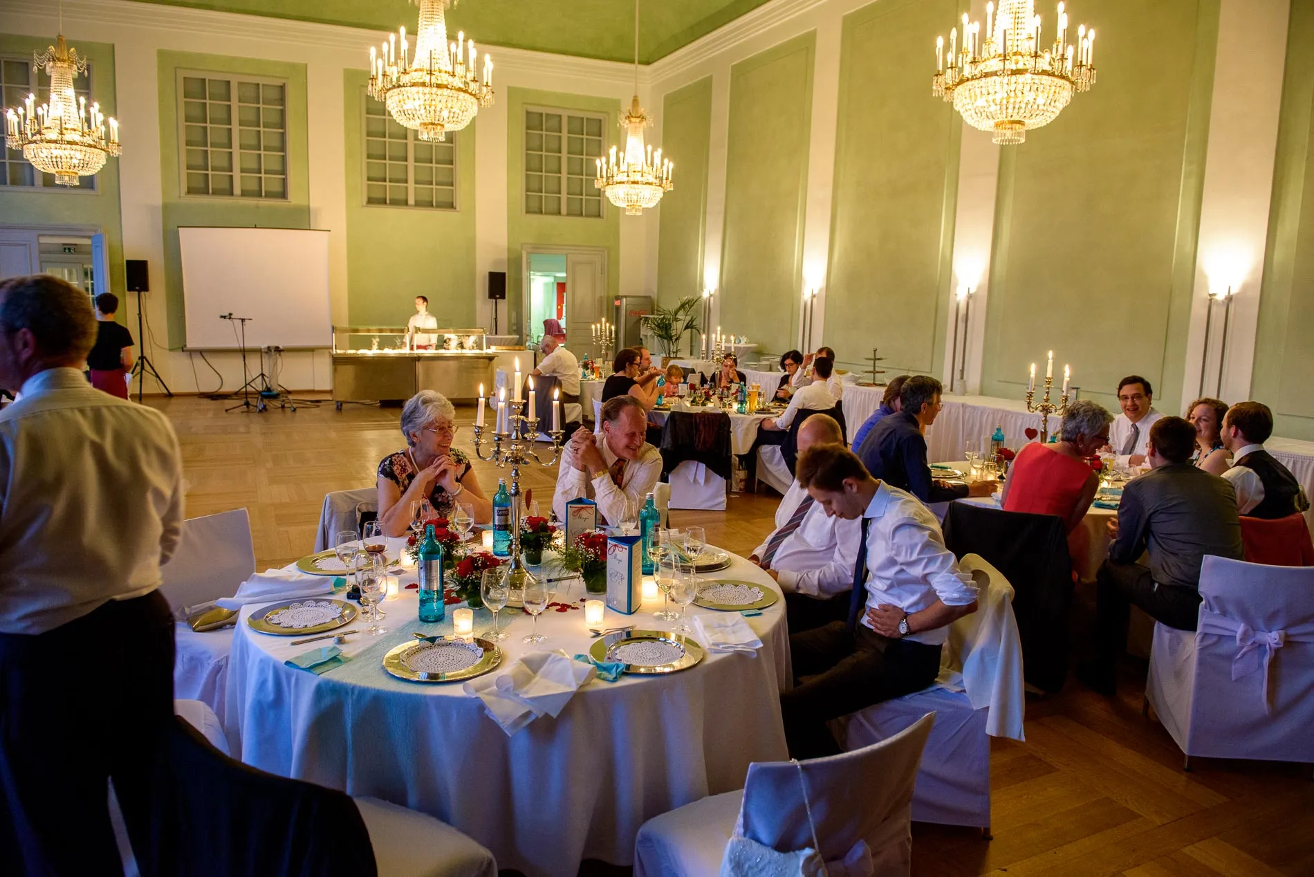 Die Feier fand im Grünen Saal der Orangerie statt, einem der prachtvollen Räume dieser historischen Anlage. Die Orangerie wurde im 18. Jahrhundert nach französischen Vorbildern erbaut – Louvre und Versailles lassen grüßen – und ist heute eine der Perlen Frankens. Eingebettet in den Hofgarten, bietet sie nicht nur Platz für Hochzeiten, sondern auch für Konzerte, Tagungen und die berühmte Ansbacher Bachwoche.