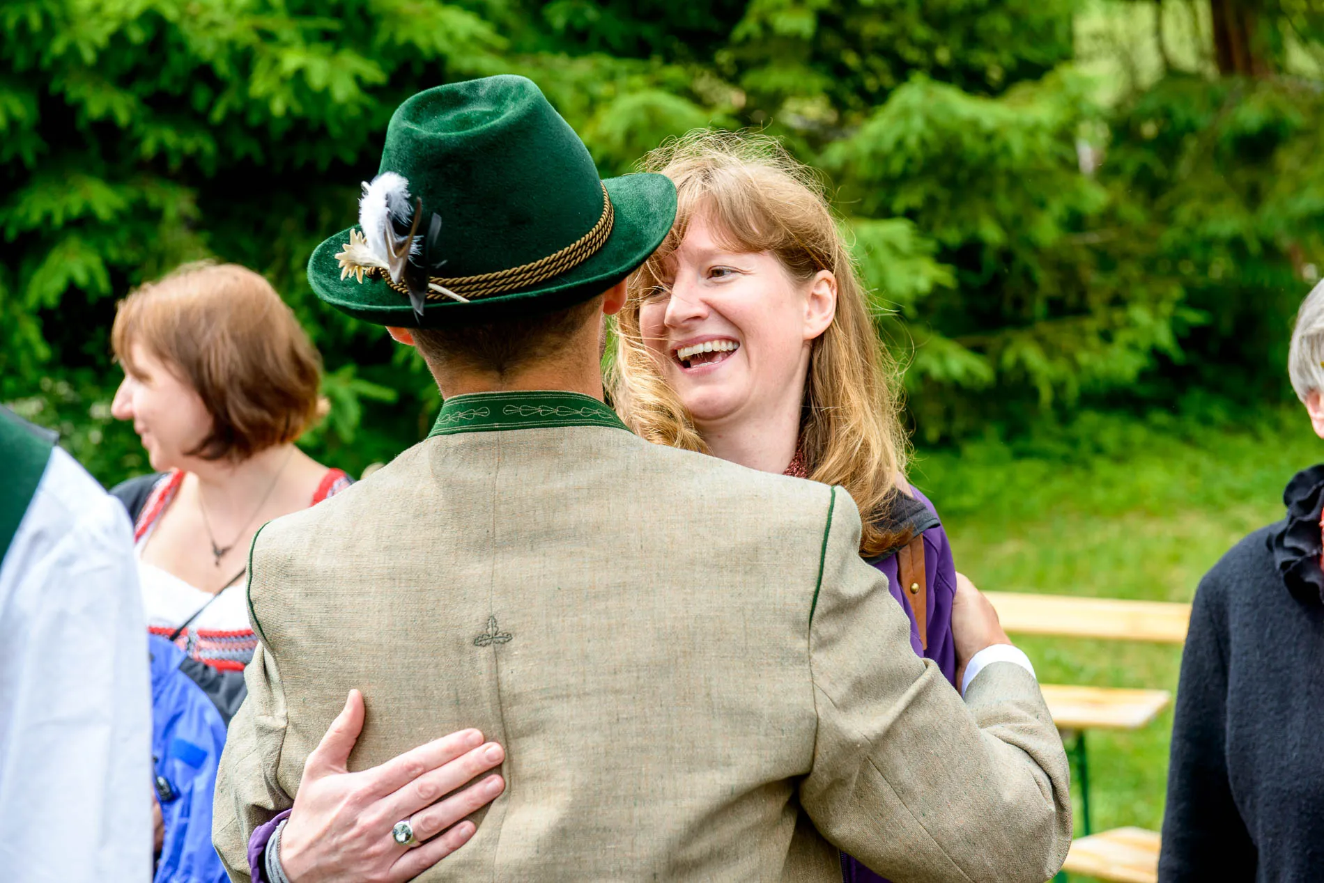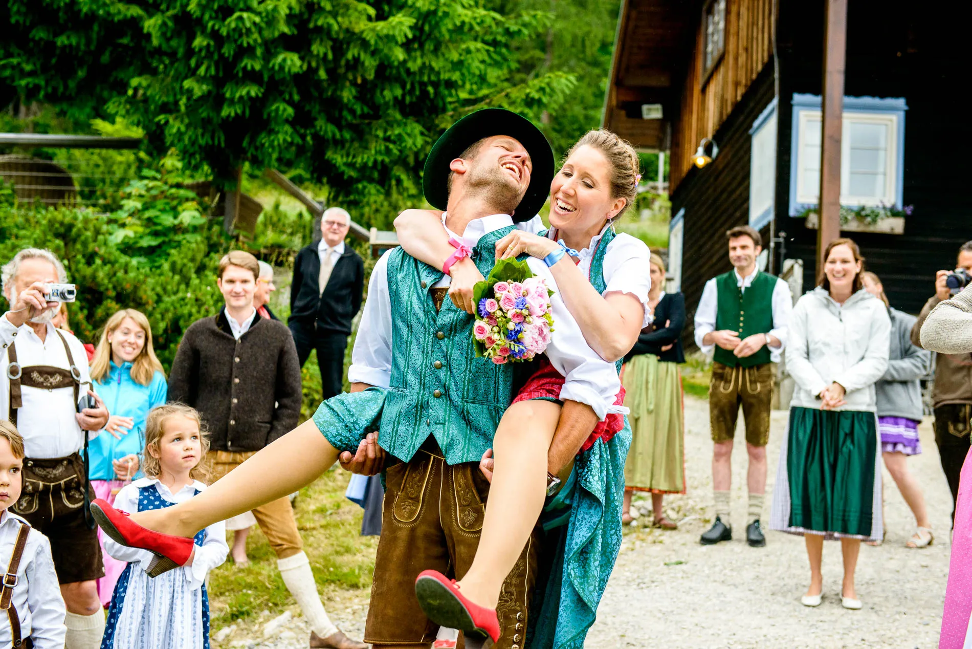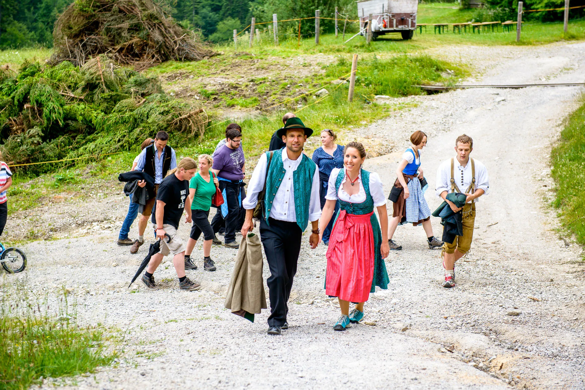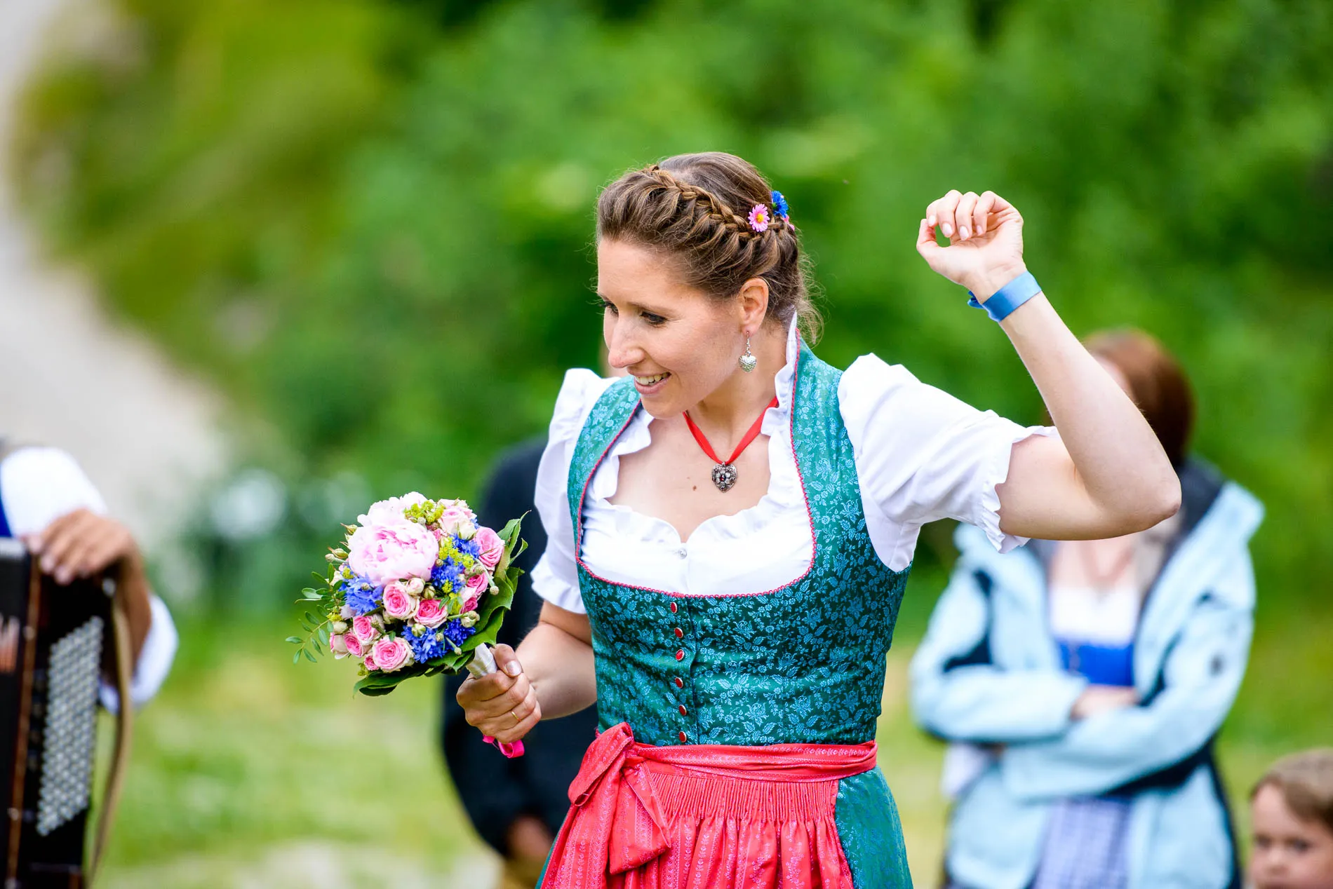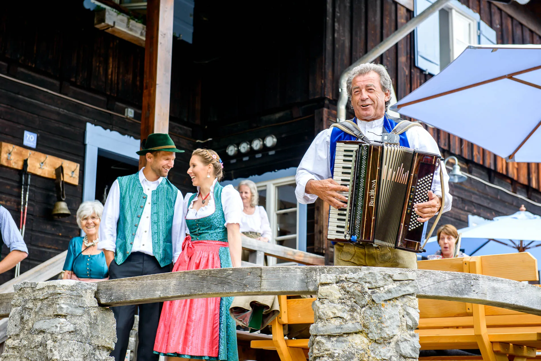 Schon beim ersten Blick auf das Brautpaar war klar: Hier wird nicht nur geheiratet, hier wird Tradition gelebt. Der Bräutigam im Trachtenanzug, die Braut im Dirndl – eine Kombination, die so zeitlos ist wie die Berge selbst. Einige Gäste ließen es sich nicht nehmen, stilecht in Lederhosen den Aufstieg zum Sillberghaus zu meistern. Wer behauptet, dass man für eine Hochzeit unbedingt Lackschuhe braucht, hat vermutlich noch nie gesehen, wie elegant man in Haferlschuhen eine Alm erklimmen kann.