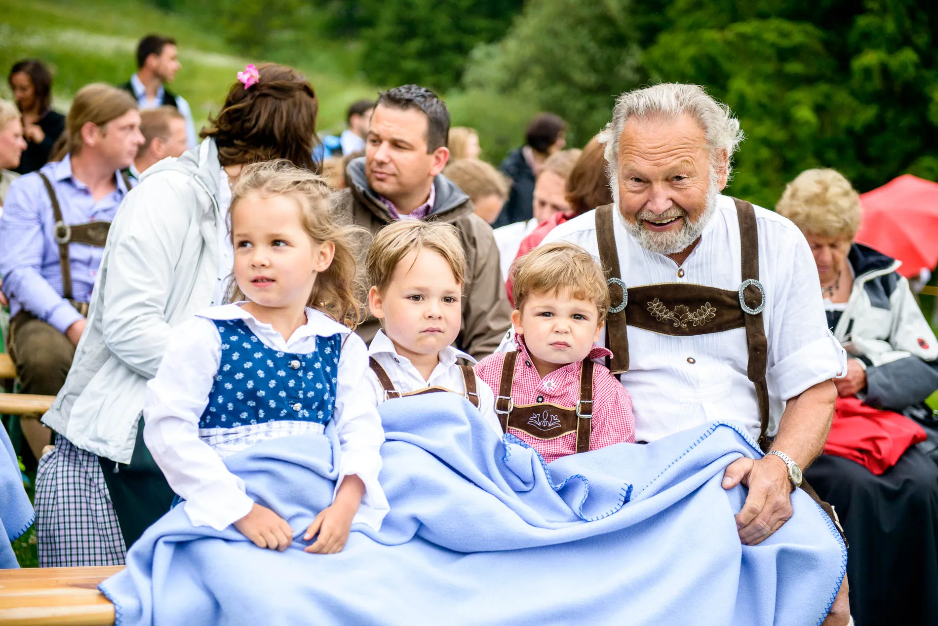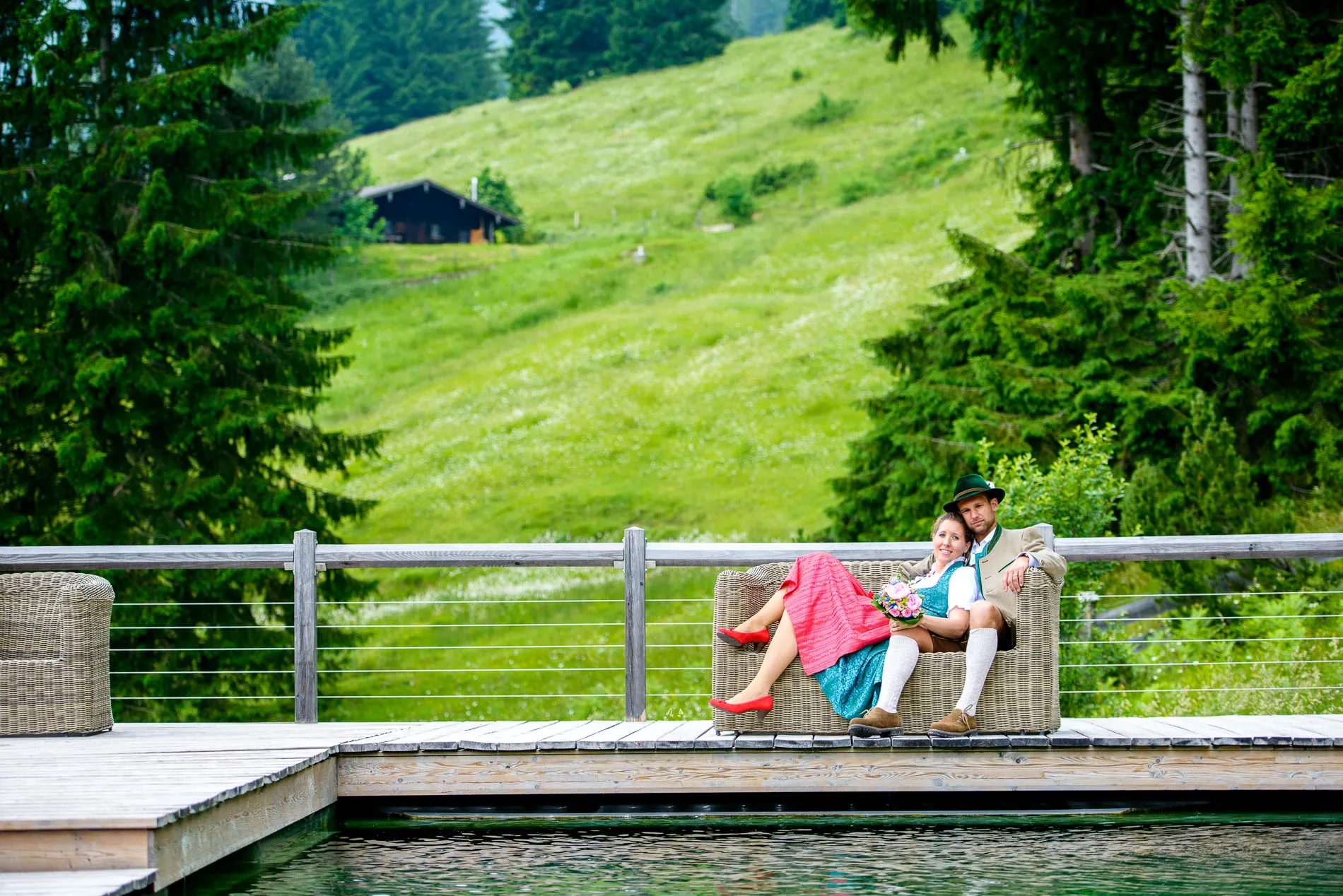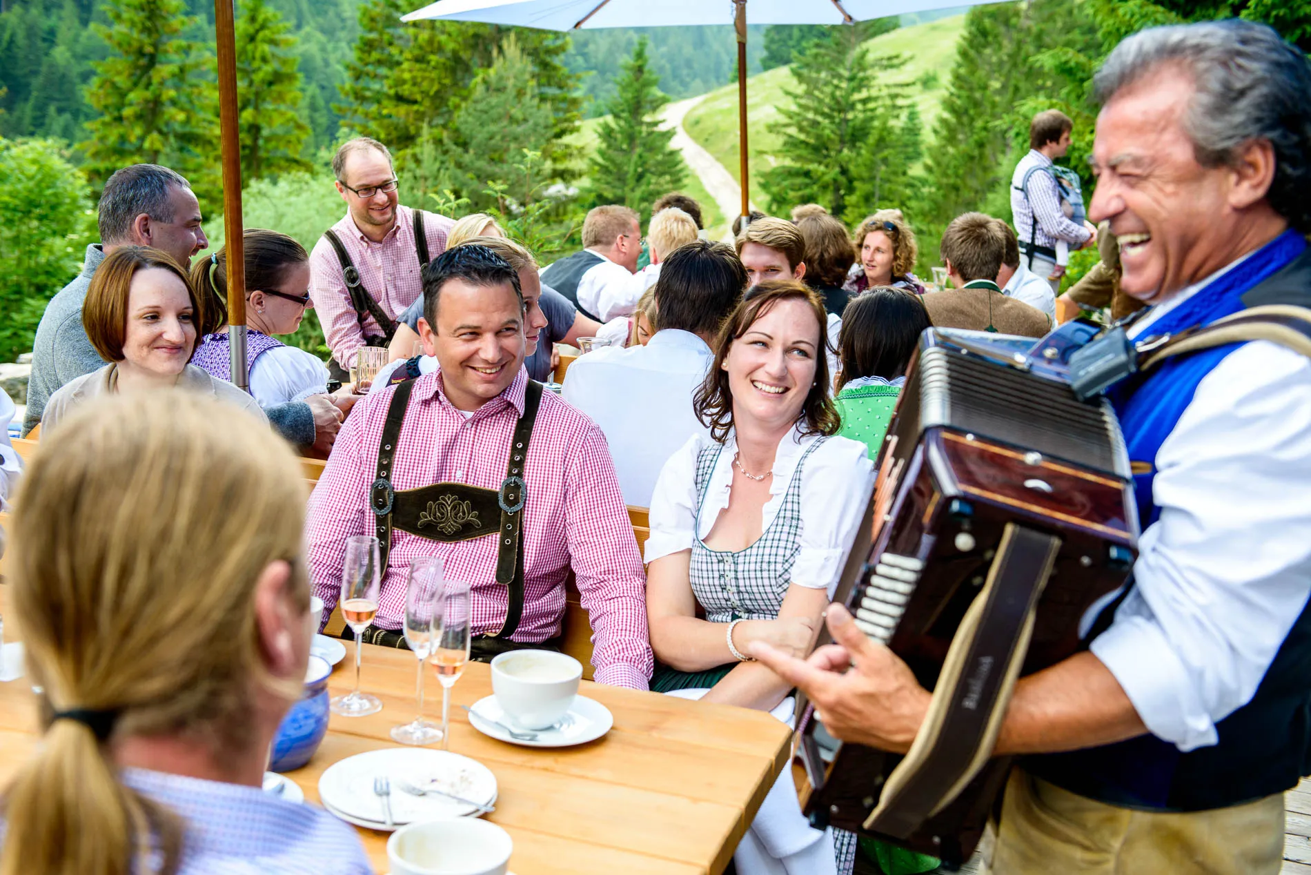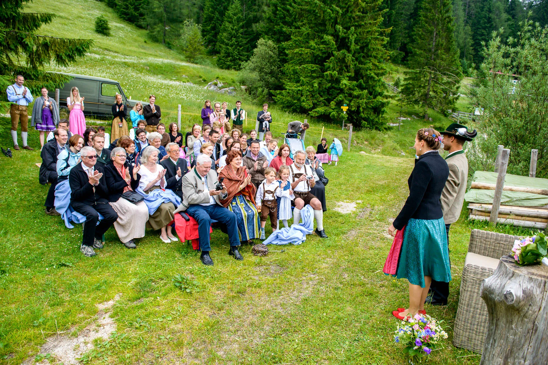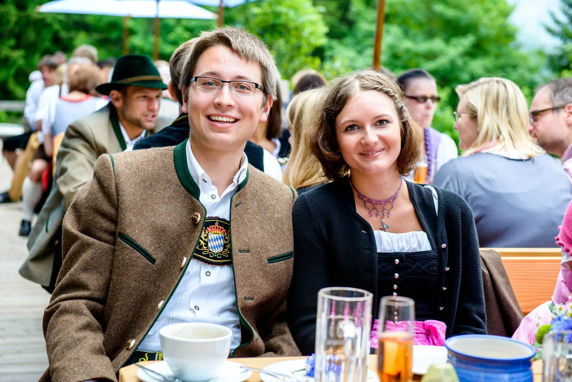 Schon beim ersten Blick auf das Brautpaar war klar: Hier wird nicht nur geheiratet, hier wird Tradition gelebt. Der Bräutigam im Trachtenanzug, die Braut im Dirndl – eine Kombination, die so zeitlos ist wie die Berge selbst. Einige Gäste ließen es sich nicht nehmen, stilecht in Lederhosen den Aufstieg zum Sillberghaus zu meistern. Wer behauptet, dass man für eine Hochzeit unbedingt Lackschuhe braucht, hat vermutlich noch nie gesehen, wie elegant man in Haferlschuhen eine Alm erklimmen kann.